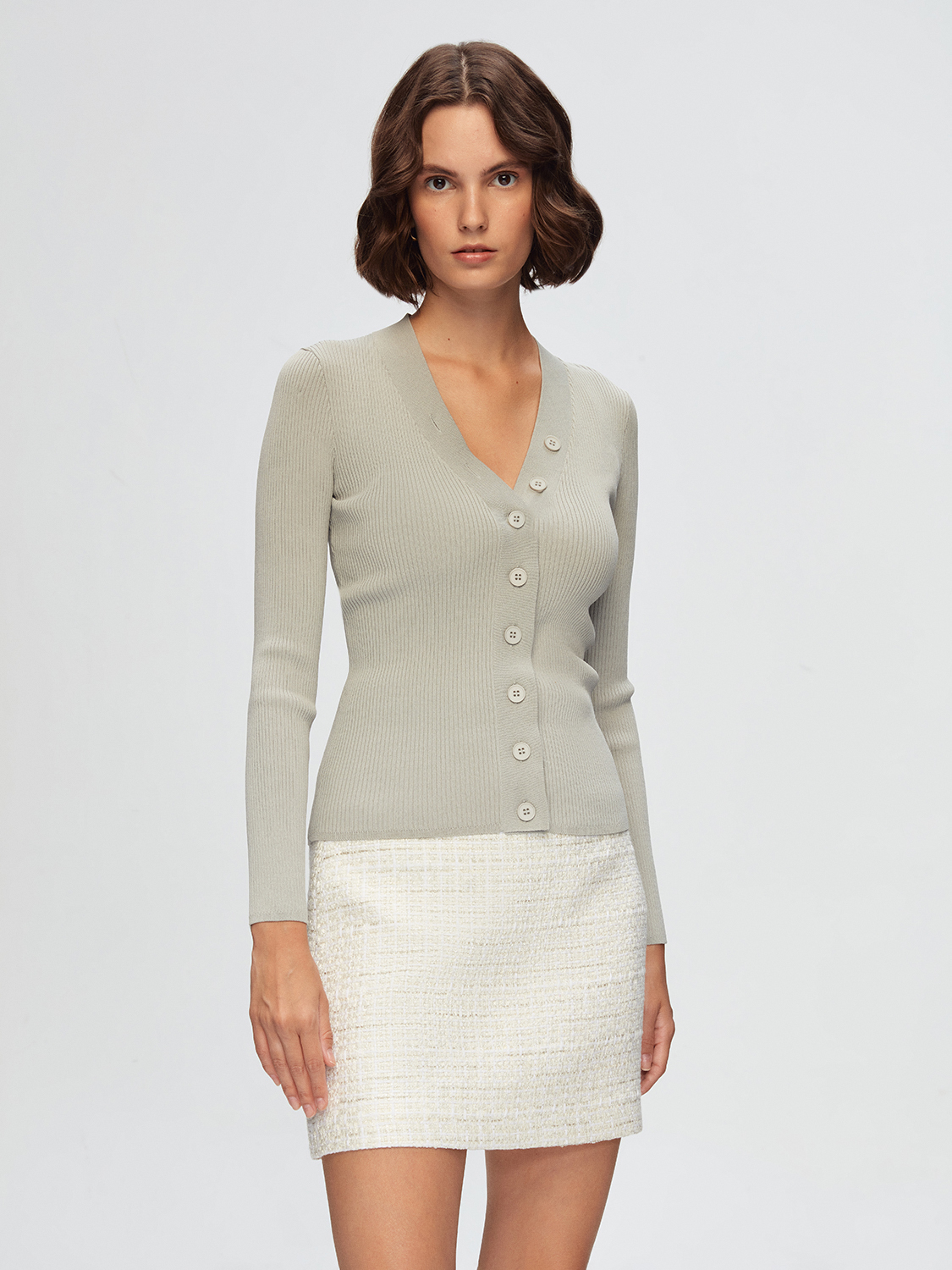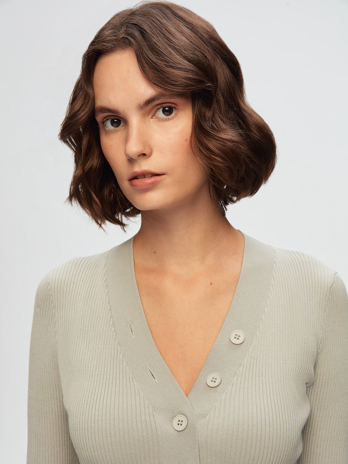 Облегающий кардиган из вискозы в рубчик. Застежка на пуговицах, изящный V-образный вырез, подчеркивающий декольте. Ткань не просвечивает, не колется и не растягивается со временем при должном уходе. Кардиган универсален для повседневной жизни, подходит как под кэжуал образы с джинсами, лоферами или кедами, так и под классические с брюками, юбками и блузами. На модели размер S. Параметры модели: рост 180, 82-60-90