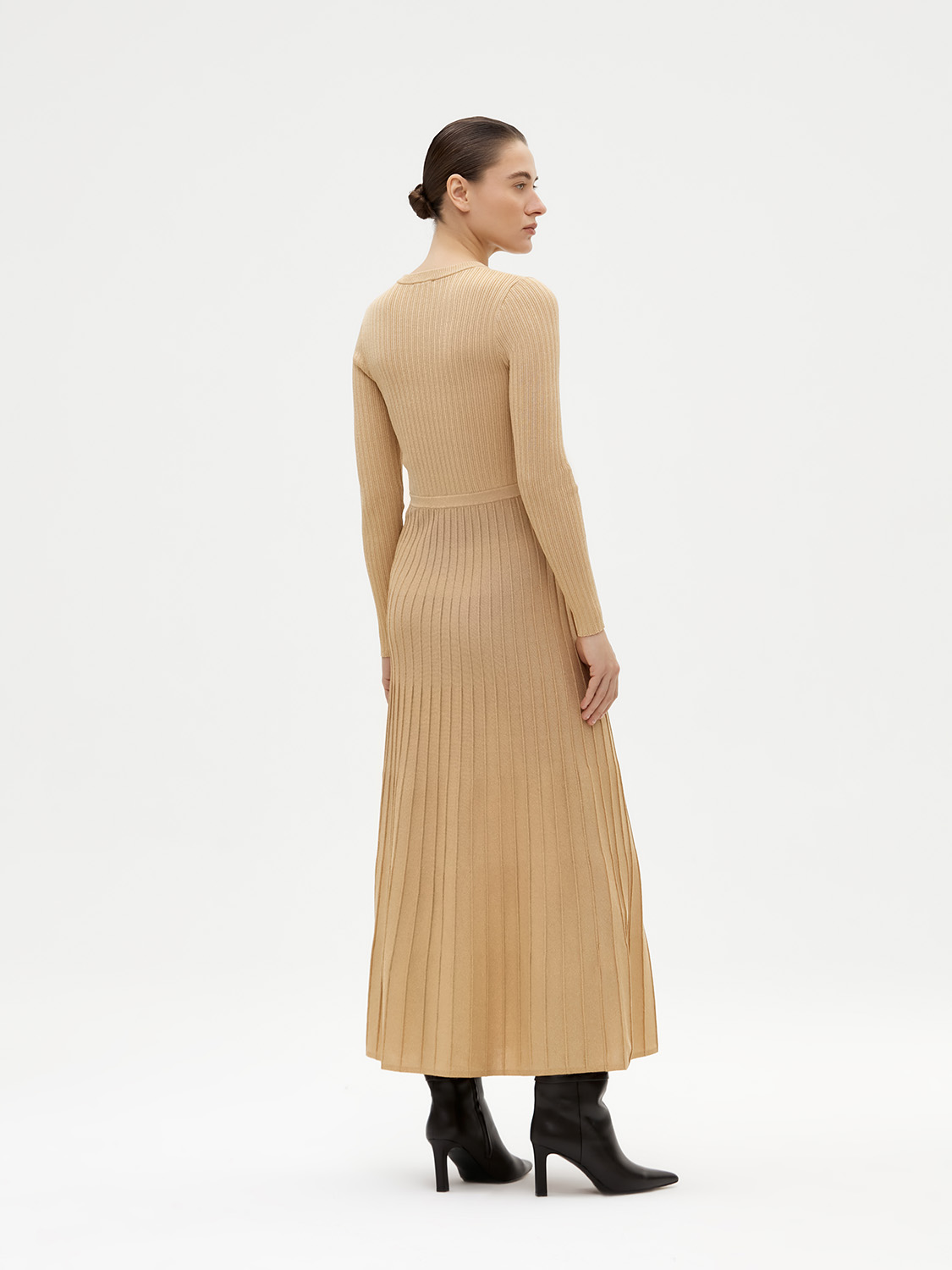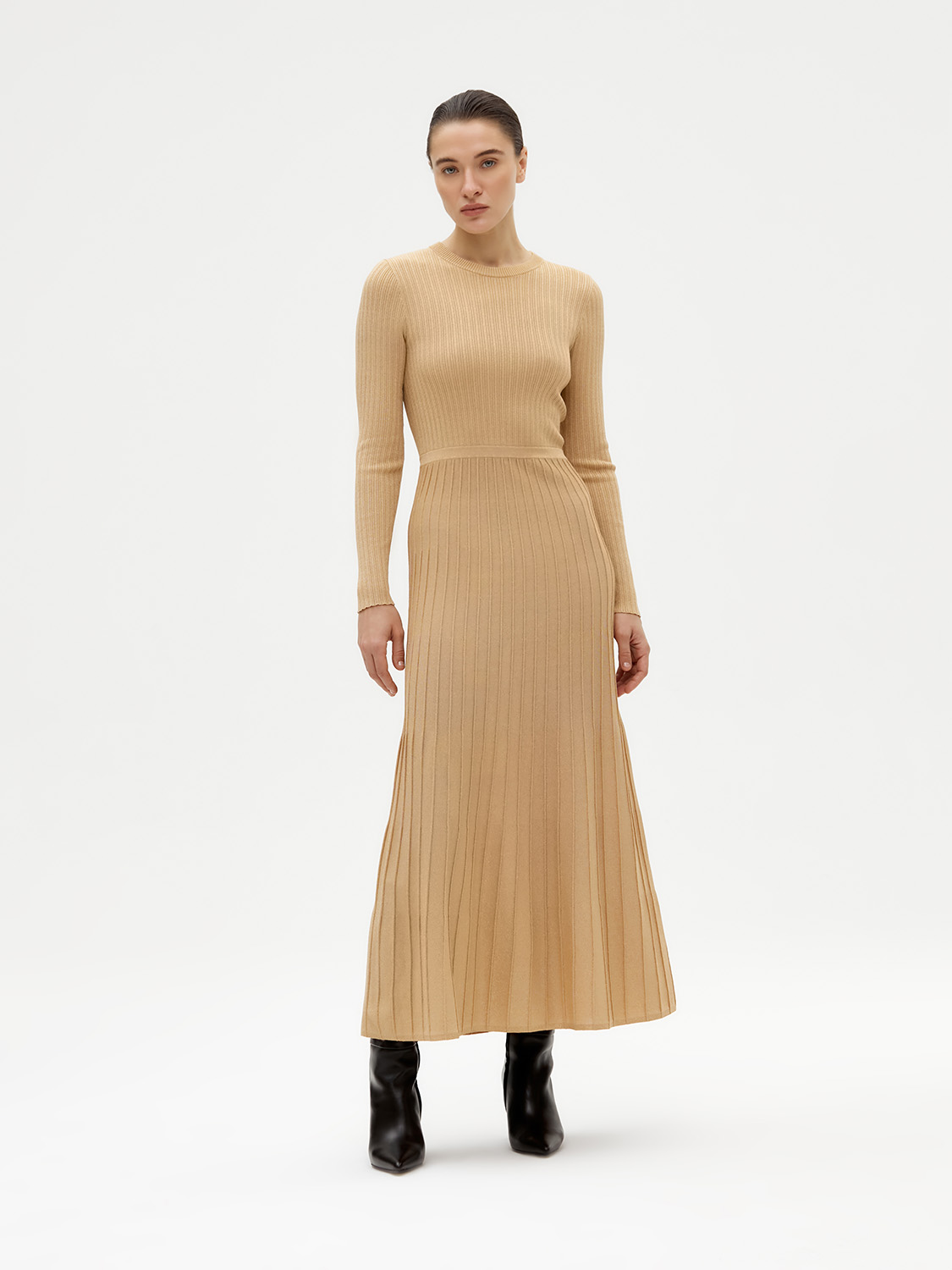 Элегантное трикотажное платье миди из мягкого смесового материала. Нейлон в составе придает эластичность, люрекс деликатно сияет, округлый вырез и длинные рукава подчеркивают женственность и утонченность, а плиссированная юбка придает платью легкость и воздушность. Платье подойдет как для работы, так и для вечерних выходов. Сочетайте с туфлями на каблуках или сапогами, а также образ можно дополнить жакетом или кожаной курткой. На модели размер S. Параметры модели: рост: 177, 80-59-89.