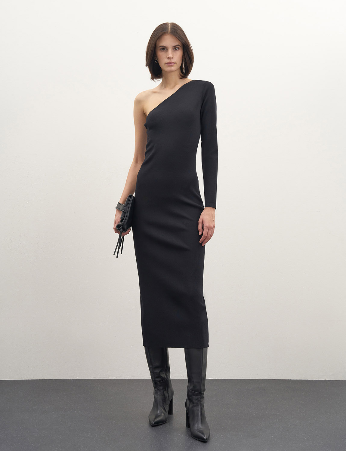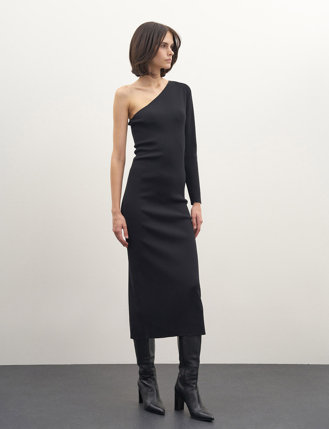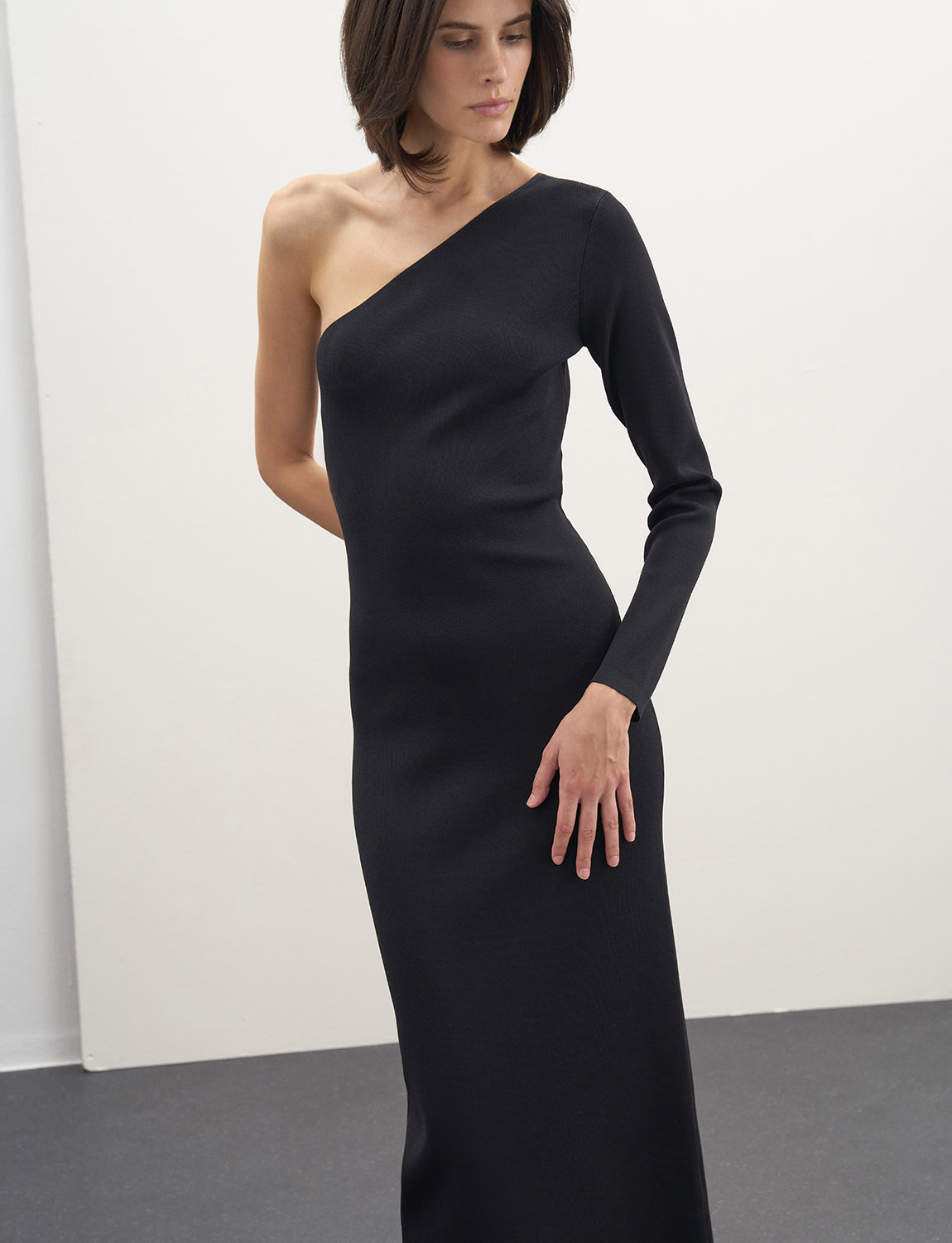 Облегающее трикотажное платье миди с вырезом на одно плечо. Вискозная ткань платья эластична и приятна на ощупь. Сзади платья деликатный разрез, который добавляет изысканности образу и облегчает ходьбу. Платье сочетается с туфлями-лодочками и босоножками на каблуке, а в качестве аксессуаров подойдут изящные серьги, тонкий браслет и небольшая сумочка. Платье подойдет для особых случаев - например, для романтического ужина или торжественного мероприятия. Оно подчеркнет фигуру и придаст образу женственности и элегантности. На модели размер S. Параметры модели: рост 179, 75-59-87.