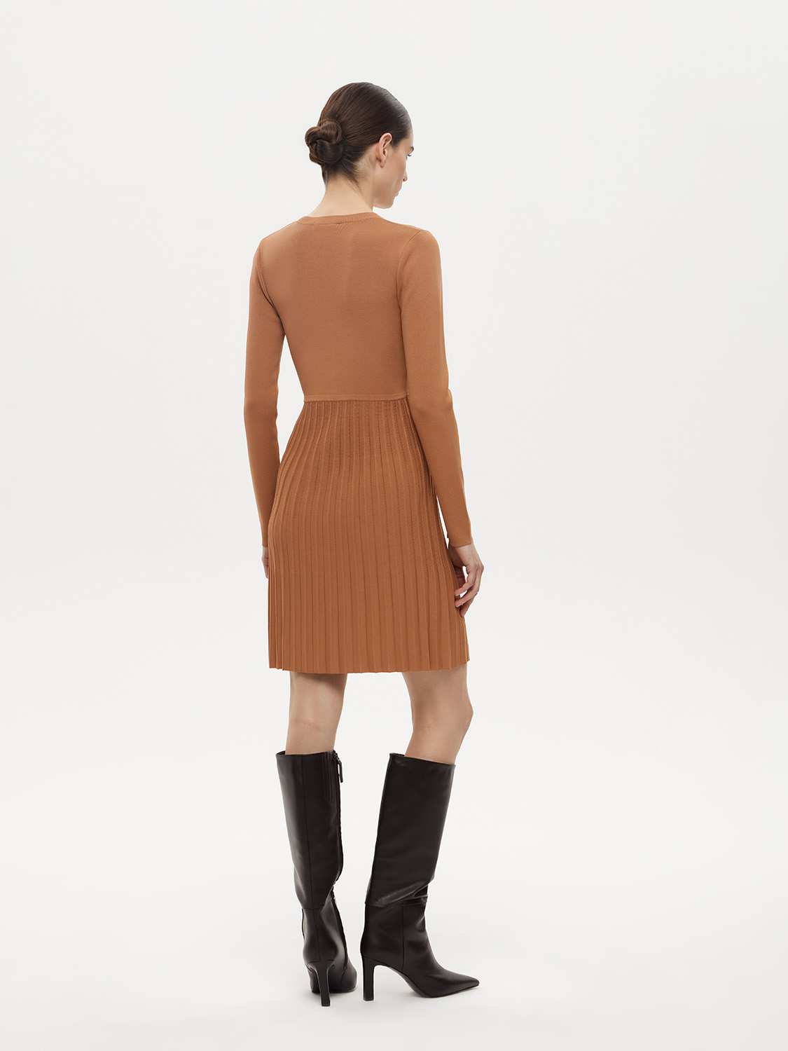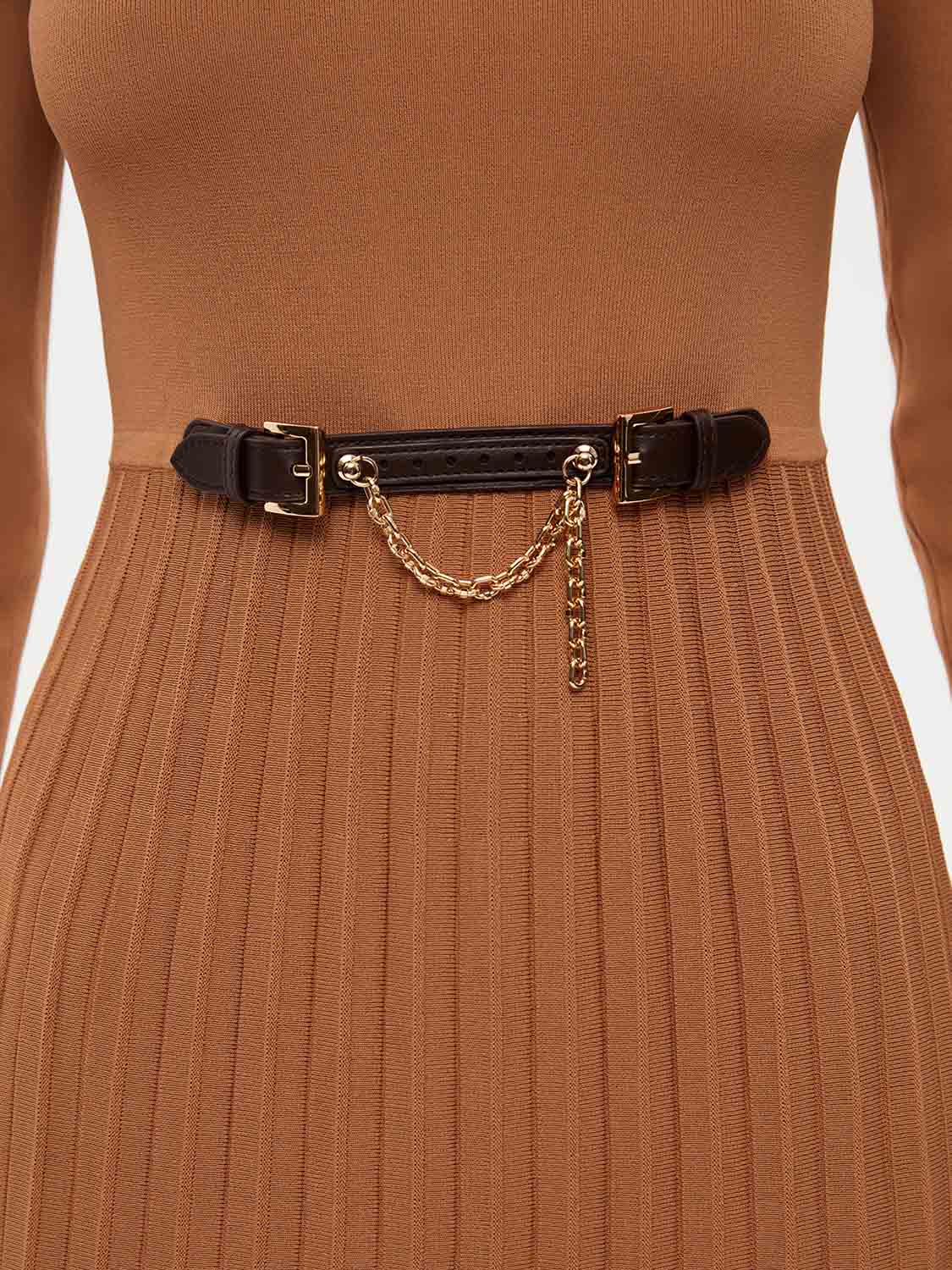 Кокетливое силуэтное платье из мягкого трикотажа. Тактильно приятная пряжа из вискозы дарит комфорт в носке и дополнительную расслабленность. У платья округлый вырез и длинный втачной рукав. Игривости добавляет плиссированная юбка и длина мини. Подчеркивает талию и расставляет дополнительный акцент декоративная деталь на поясе, совмещающая кожаные вставки с металлической цепочкой. На модели размер S. Параметры модели: рост 176, 84-60-89.