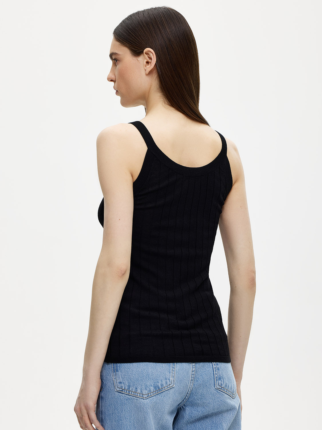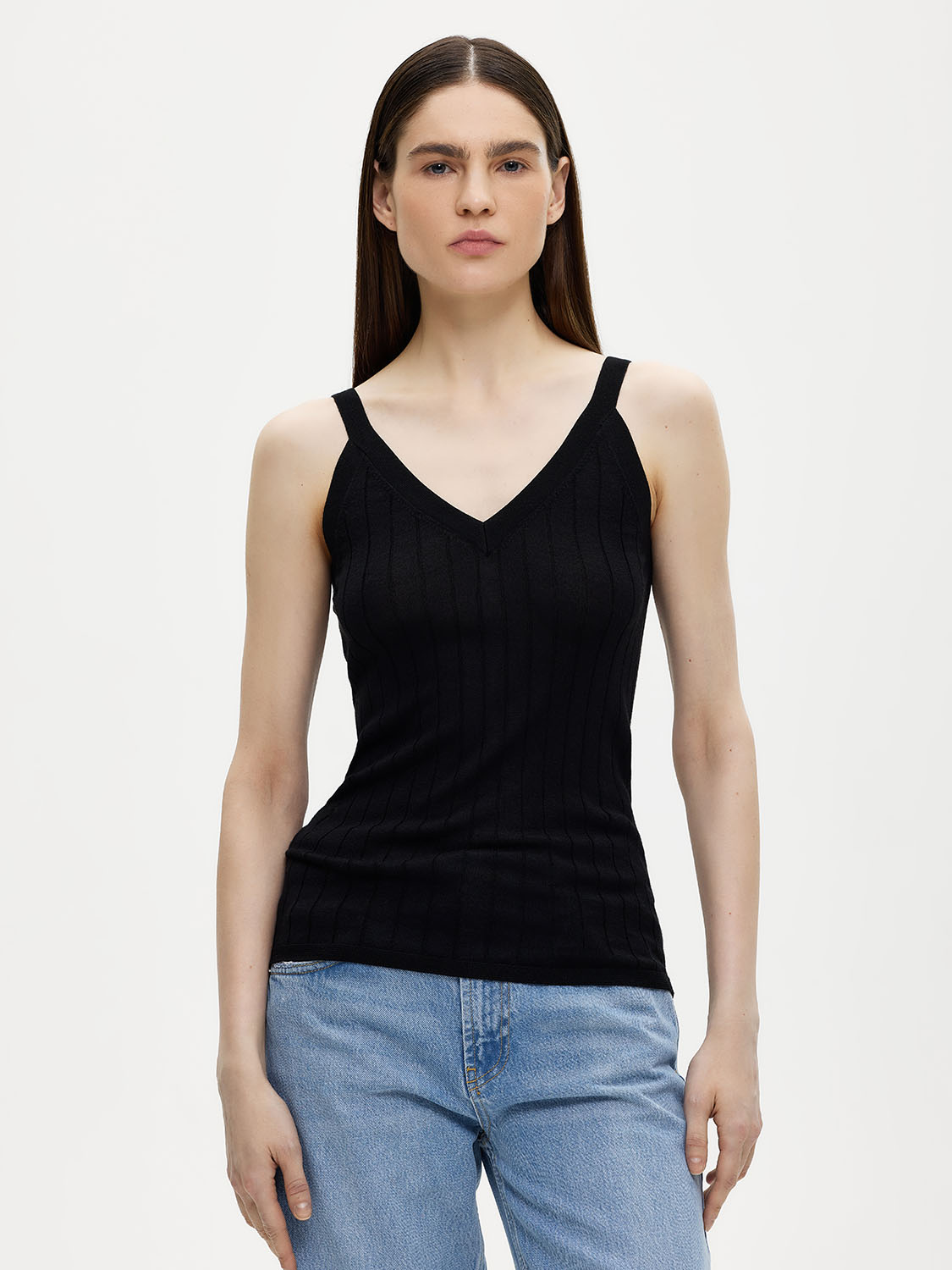 Изящный трикотажный топ-лапша. Широкие бретели, V-образный вырез, подчеркивающий зону декольте, мягкая и приятная телу ткань из натуральной шерсти мериноса и шелка. Топ эластичен, подойдет первым слоем как под классические костюмные образы с брюками и пиджаками, так и под повседневные с джинсами и рубашками. На модели размер S. Параметры модели: рост 179, 75-59-87.