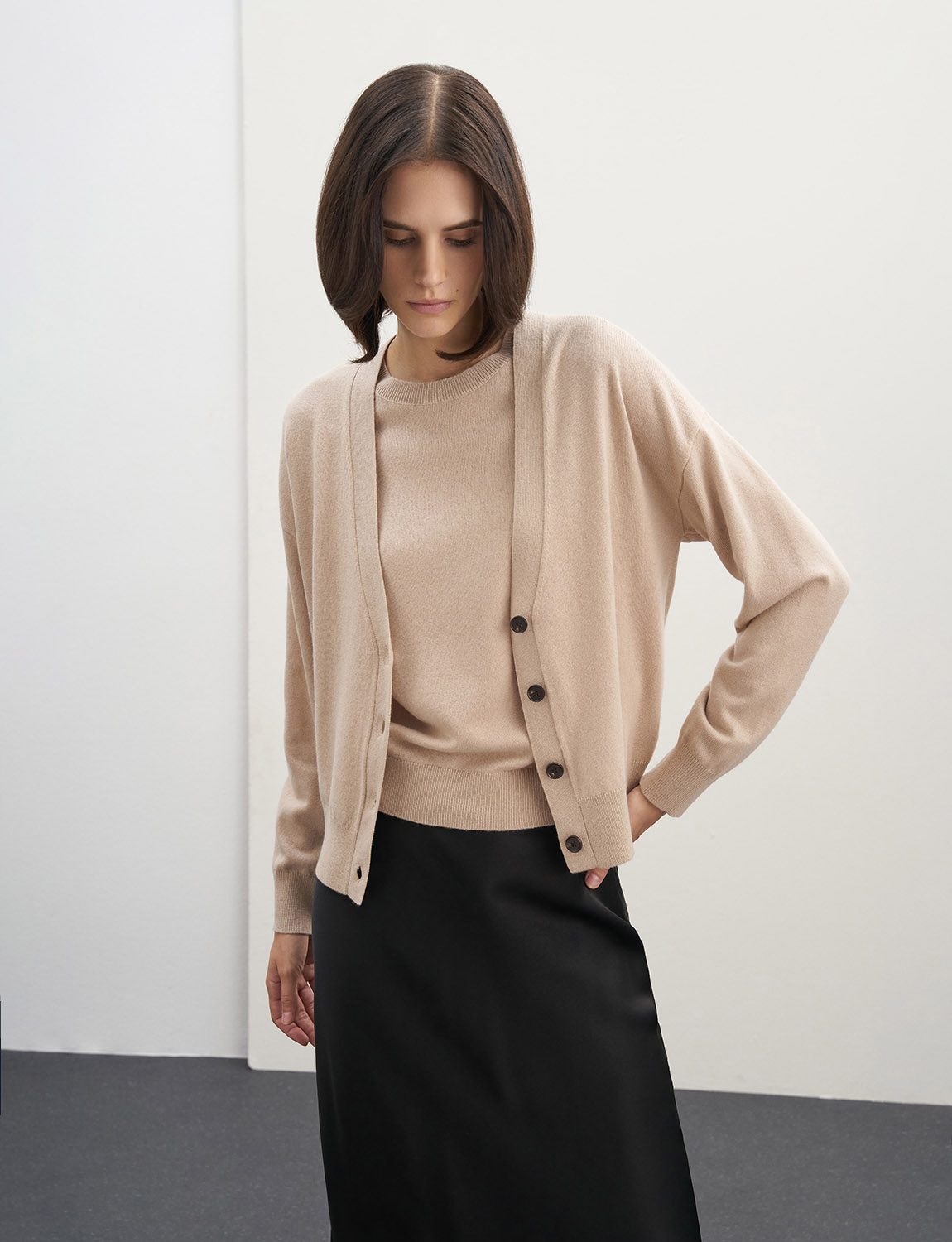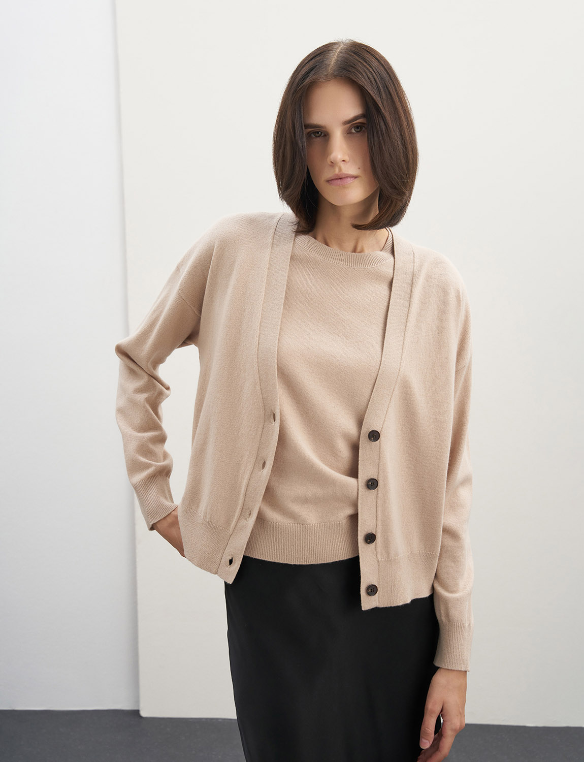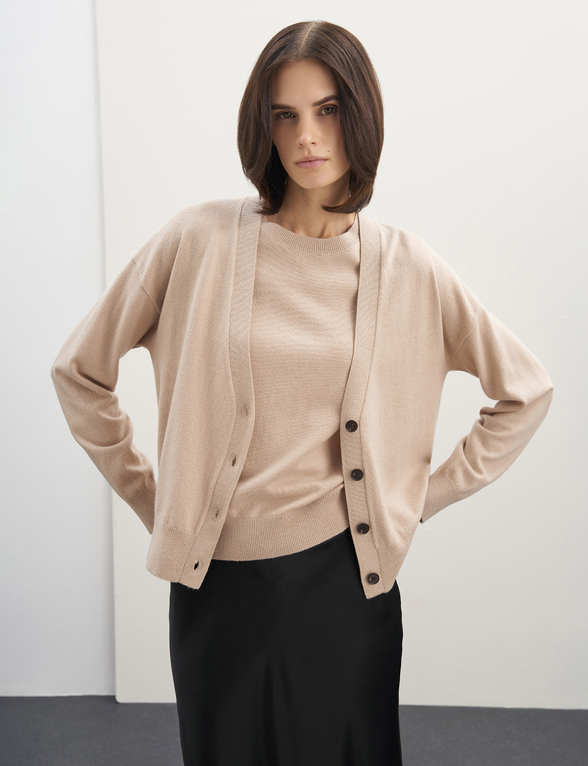 Кардиган свободного кроя из натуральной шерсти мериноса. V-образный вырез, застежка на пуговицы, спущенная линия рукава, мягкая и приятная телу ткань. Шерсть мериноса согревает и дарит чувство комфорта, сочетайте кардиган вторым слоем с трикотажными топами, с джинсами, классическими брюками, юбками или трикотажными платьями. На модели размер S. Параметры модели: рост 179, 75-59-87.