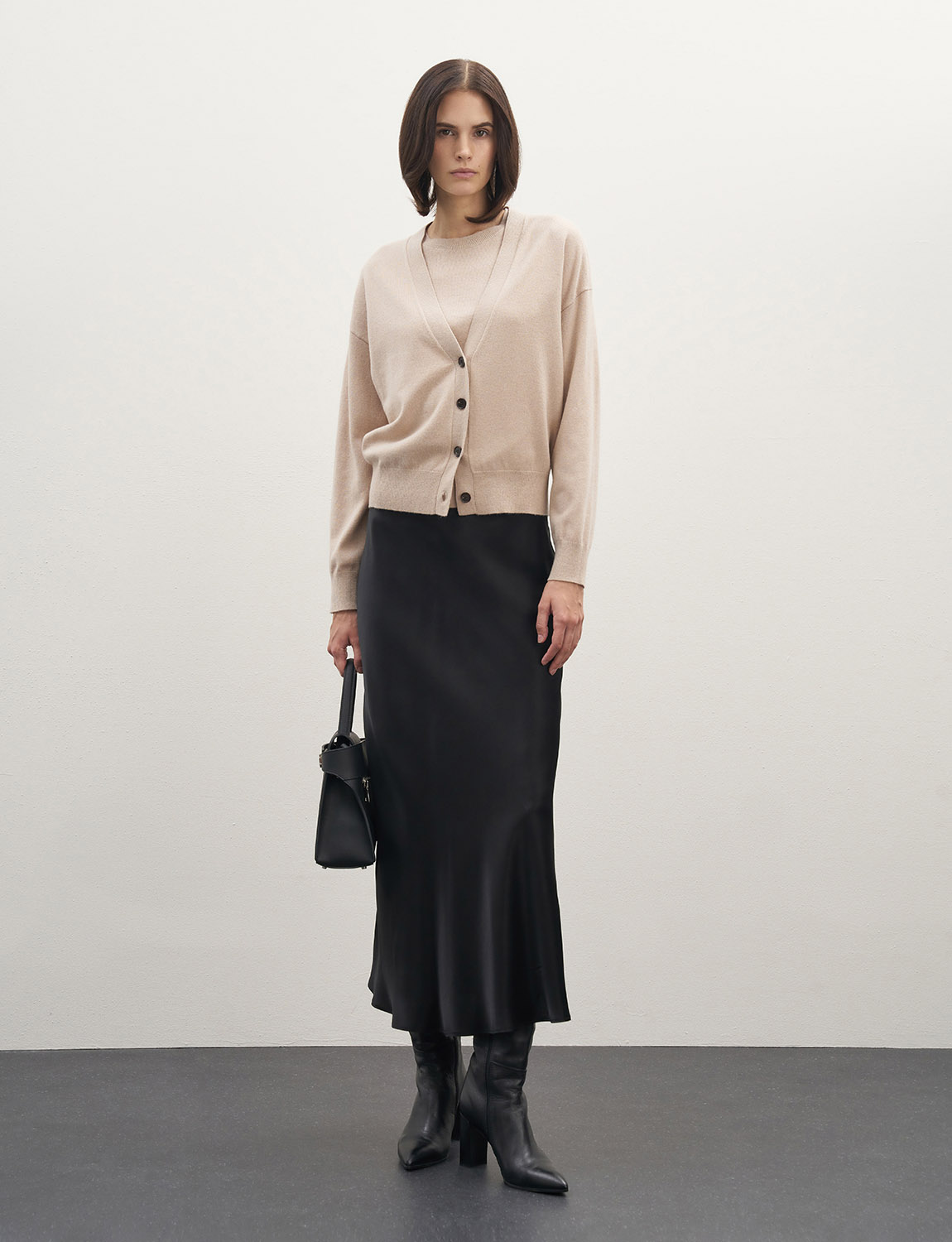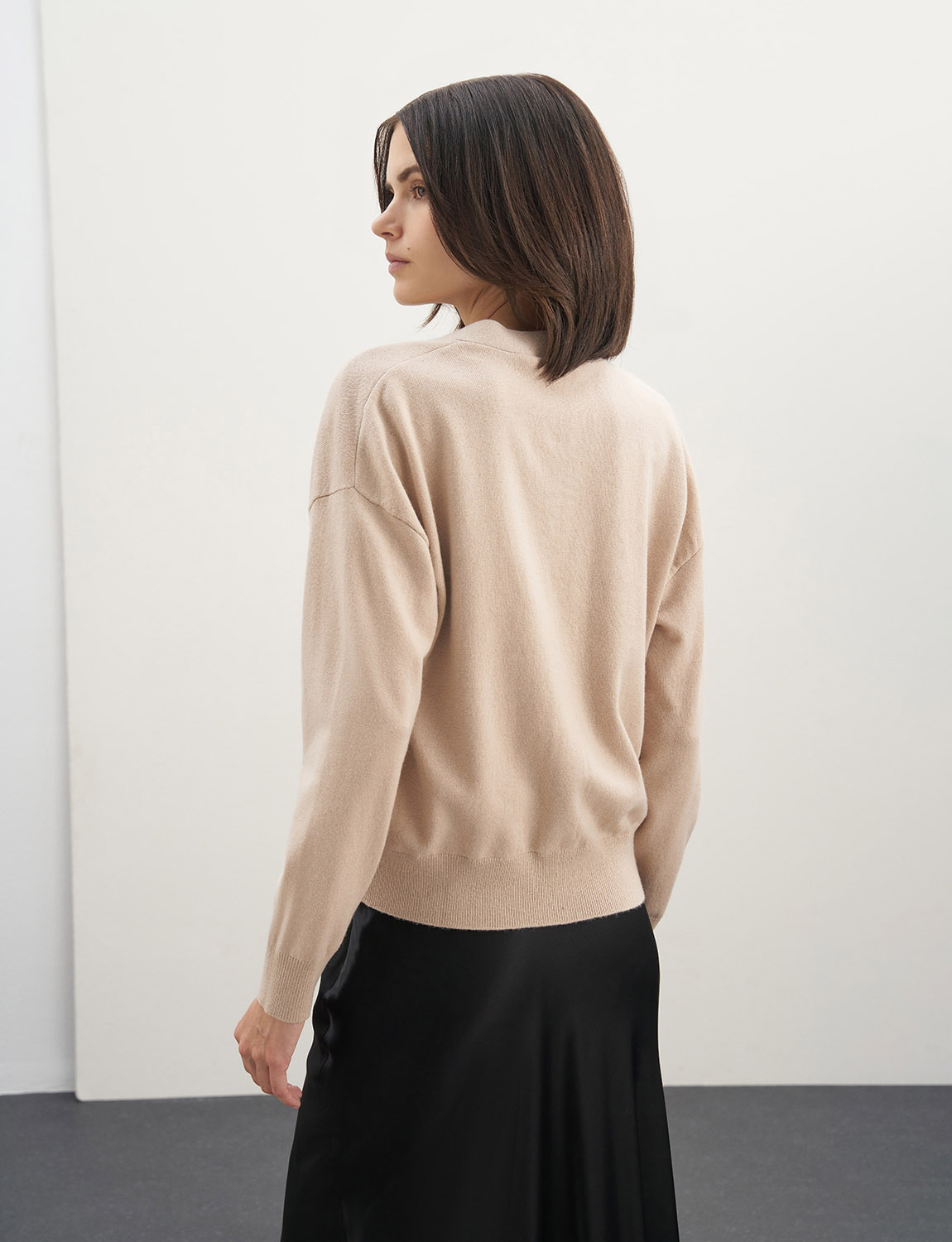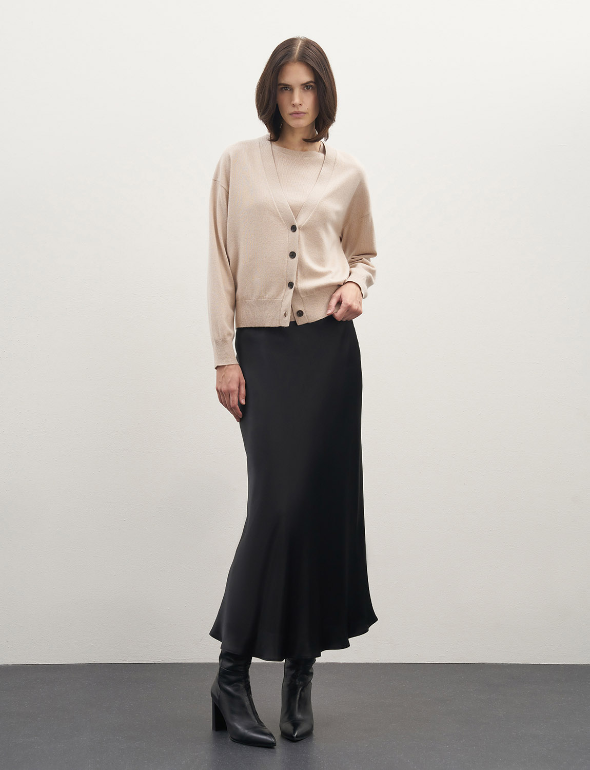 Кардиган свободного кроя из натуральной шерсти мериноса. V-образный вырез, застежка на пуговицы, спущенная линия рукава, мягкая и приятная телу ткань. Шерсть мериноса согревает и дарит чувство комфорта, сочетайте кардиган вторым слоем с трикотажными топами, с джинсами, классическими брюками, юбками или трикотажными платьями. На модели размер S. Параметры модели: рост 179, 75-59-87.