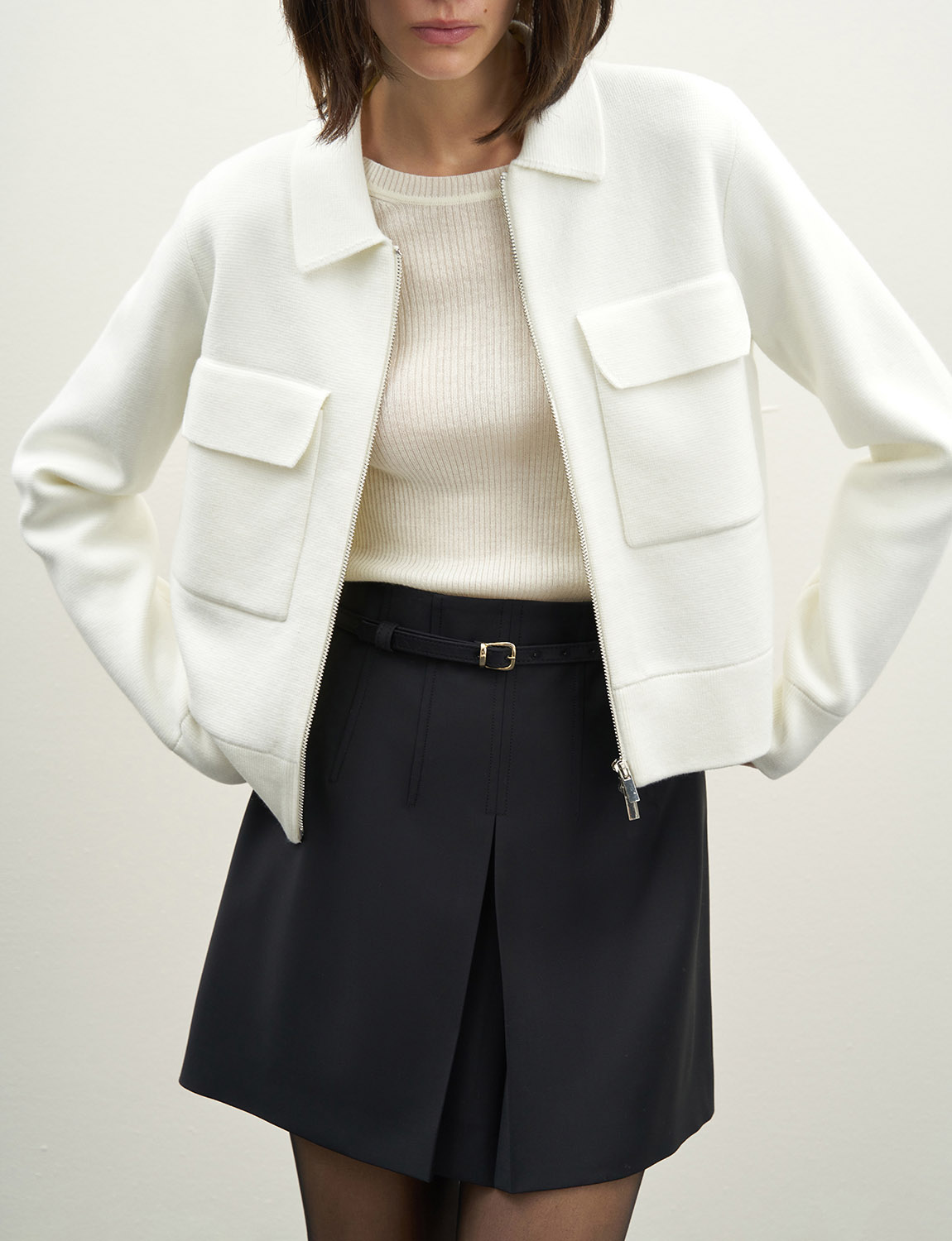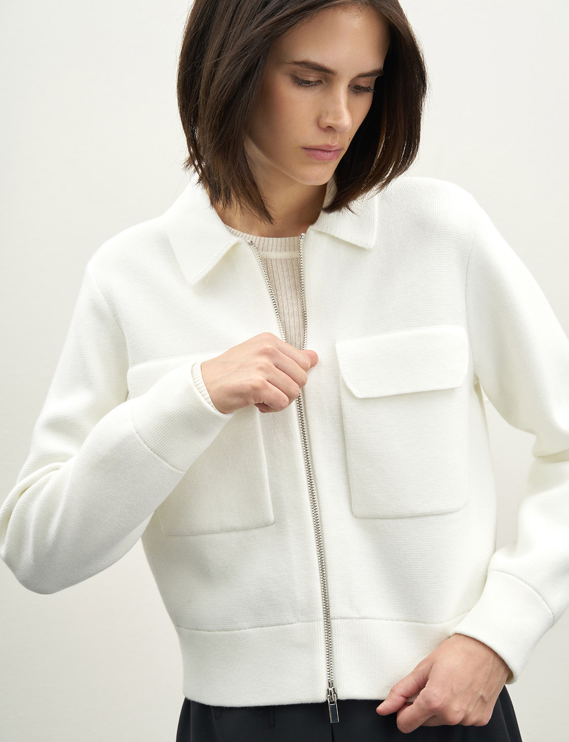 Элегантный бомбер на молнии из смесовой ткани с натуральной шерстью. У бомбера прямой крой, классический отложной воротник, накладные карманы на груди. Ткань мягкая и приятная на ощупь, шерсть в составе согревает, а добавление искусственных нитей позволяет сохранить форму. Бомбер дополнит лаконичные образы с водолазками, джинсами, юбками и джемперами. На модели размер S. Параметры модели: рост 179, 75-59-87.