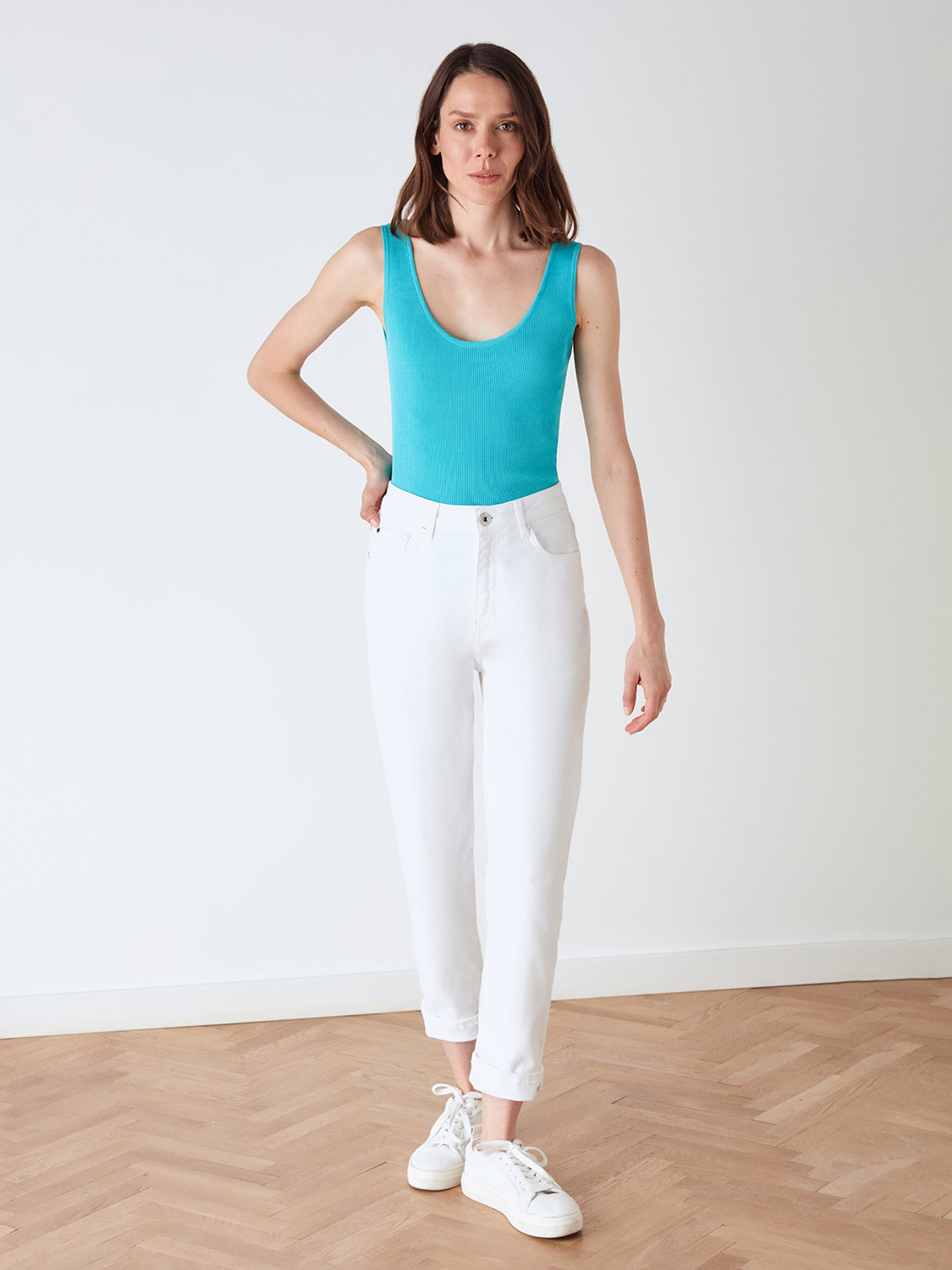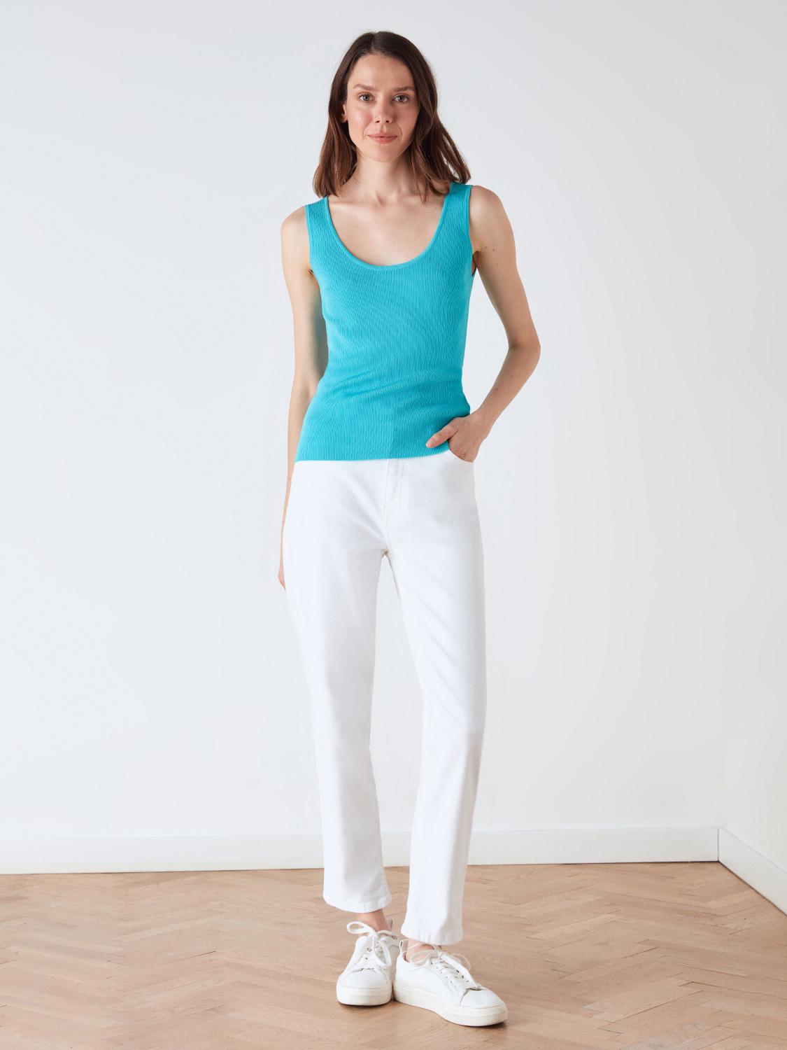 Базовый и яркий трикотажный топ из смесовой ткани. Округлый вырез, мягкая и приятная телу ткань, которая не просвечивает и не теряет форму со временем. Облегающий крой и широкие комфортные бретели. В жаркую погоду самостоятельно дополнит образы с денимом, а в прохладную подойдет первым слоем под рубашку, жакет или кардиган.