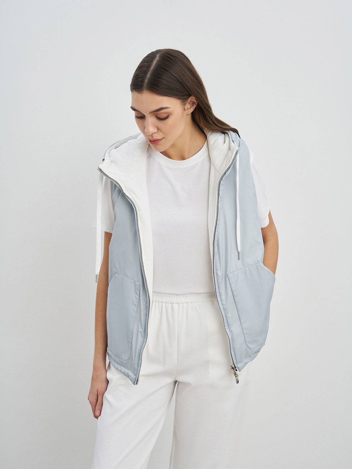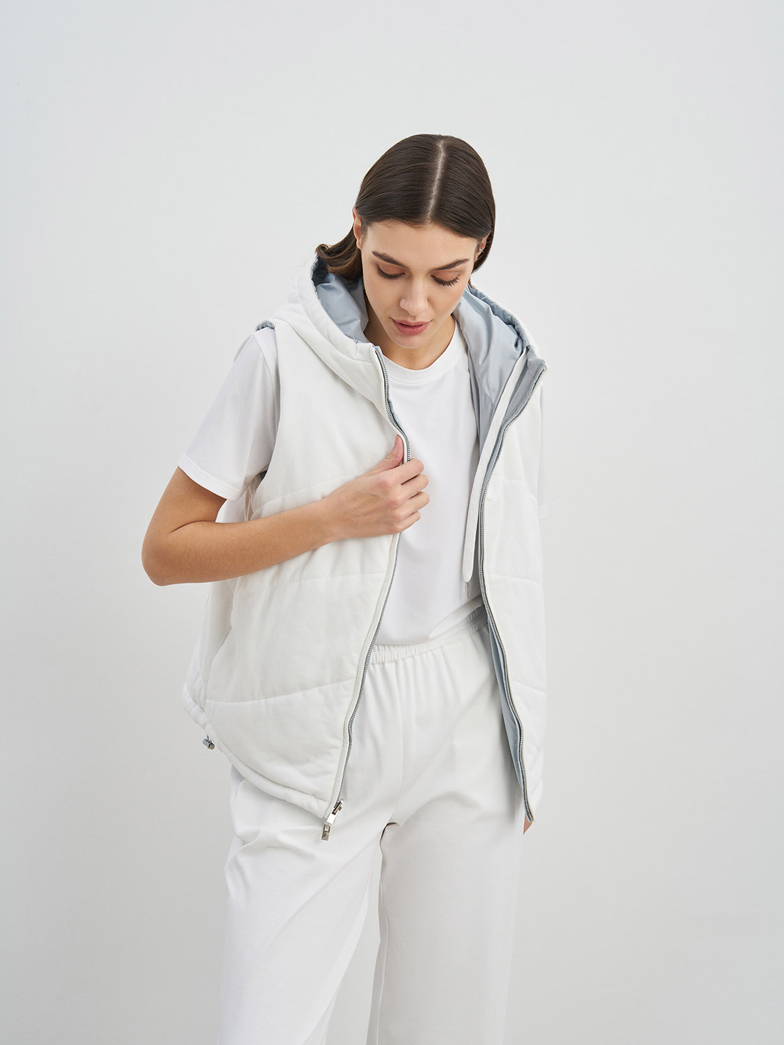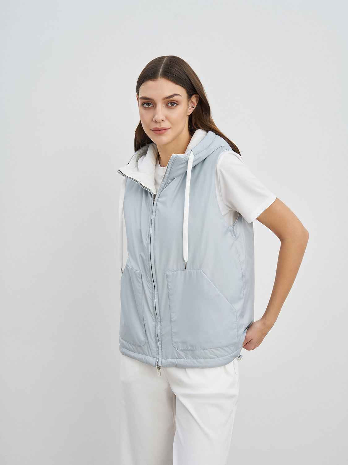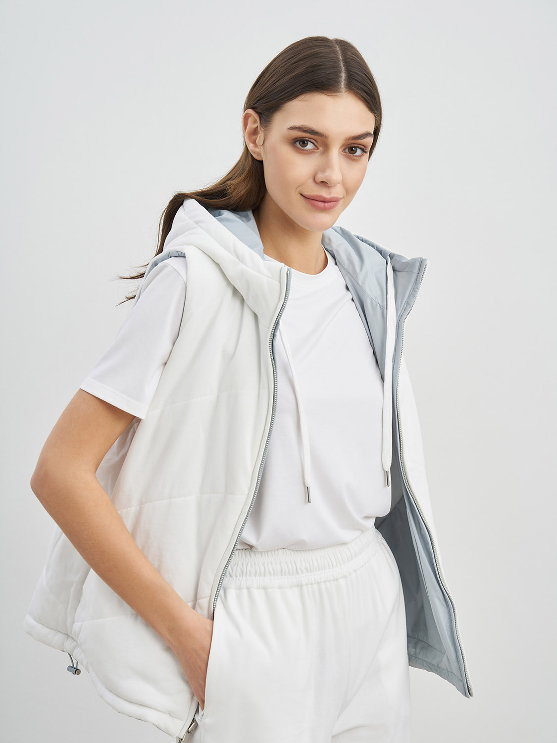 Двусторонняя утепленная жилетка с капюшоном. Застежка на молнию, боковые накладные карманы, кулиски в капюшоне и по низу жилетки, регулирующие прилегание. Ткань и подкладка из дышащего полиэстера, благодаря которому жилетка защищает от ветра, не продувается и сохраняет свой первоначальный вид. Жилетка сочетается с базовыми кэжуал образами- джинсами, прямыми брюками, футболками, водолазками, худи и кедами. На модели размер S. Параметры модели: рост 177, 84-62-93.
