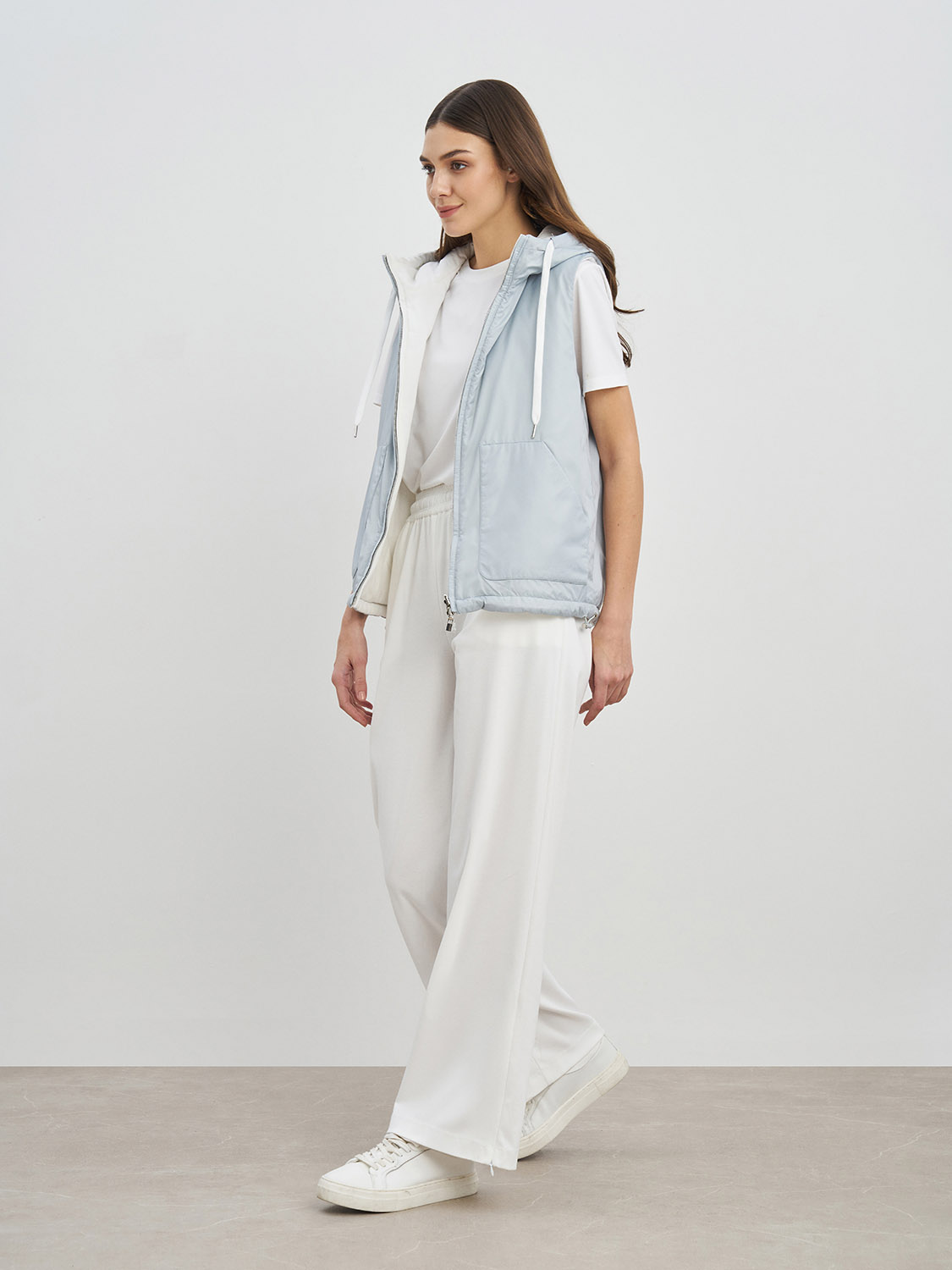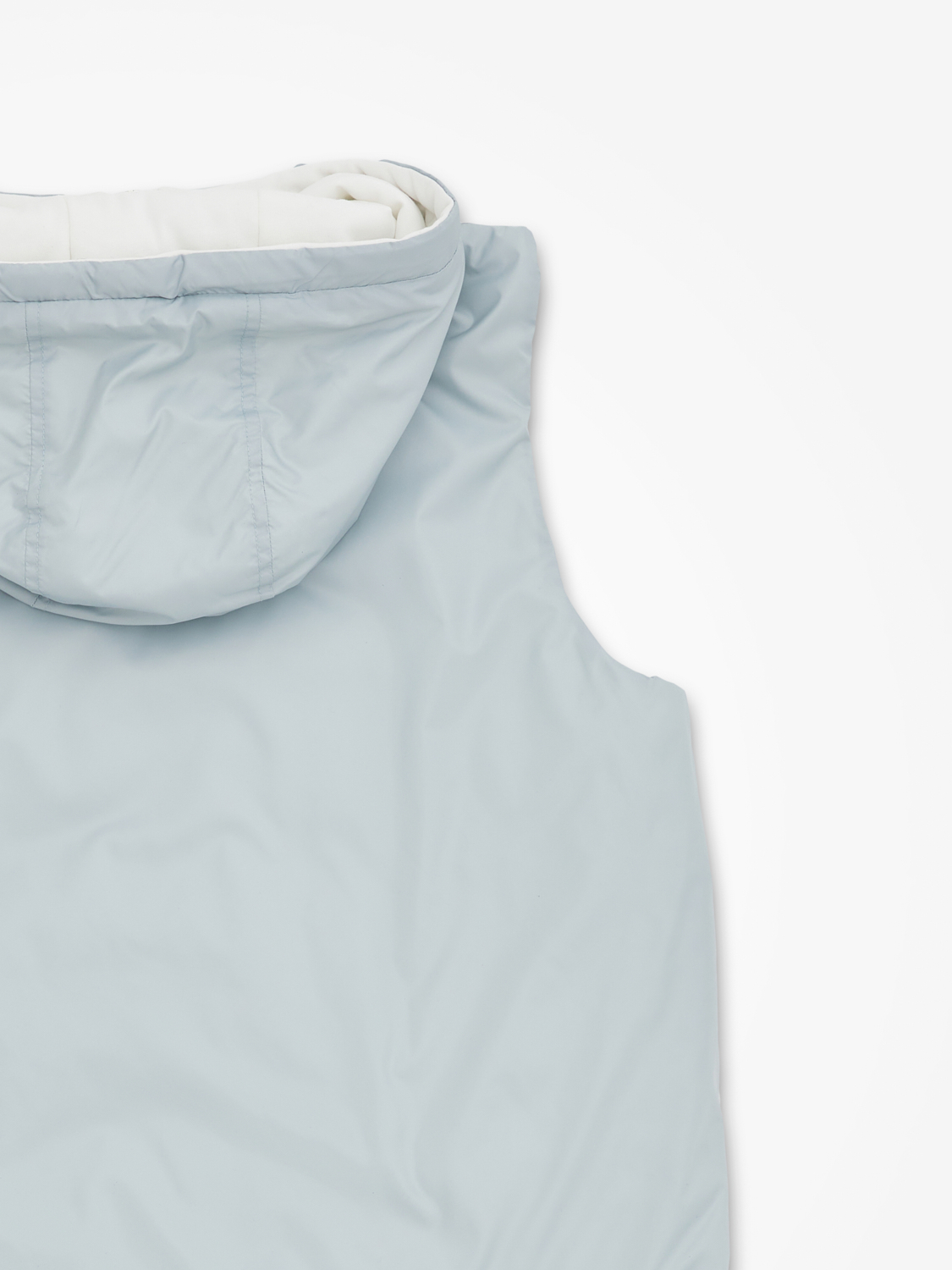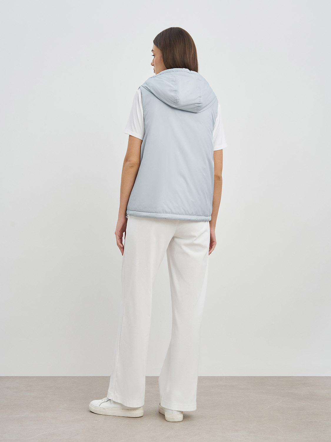Двусторонняя утепленная жилетка с капюшоном. Застежка на молнию, боковые накладные карманы, кулиски в капюшоне и по низу жилетки, регулирующие прилегание. Ткань и подкладка из дышащего полиэстера, благодаря которому жилетка защищает от ветра, не продувается и сохраняет свой первоначальный вид. Жилетка сочетается с базовыми кэжуал образами- джинсами, прямыми брюками, футболками, водолазками, худи и кедами. На модели размер S. Параметры модели: рост 177, 84-62-93.