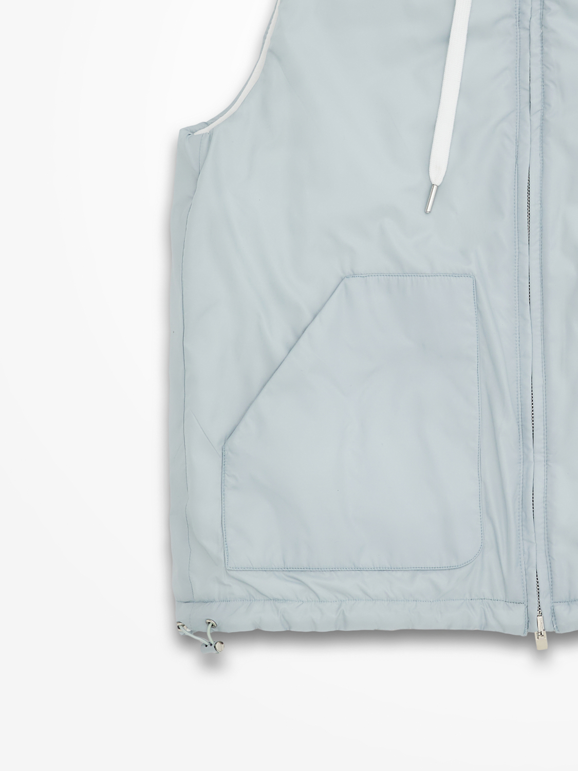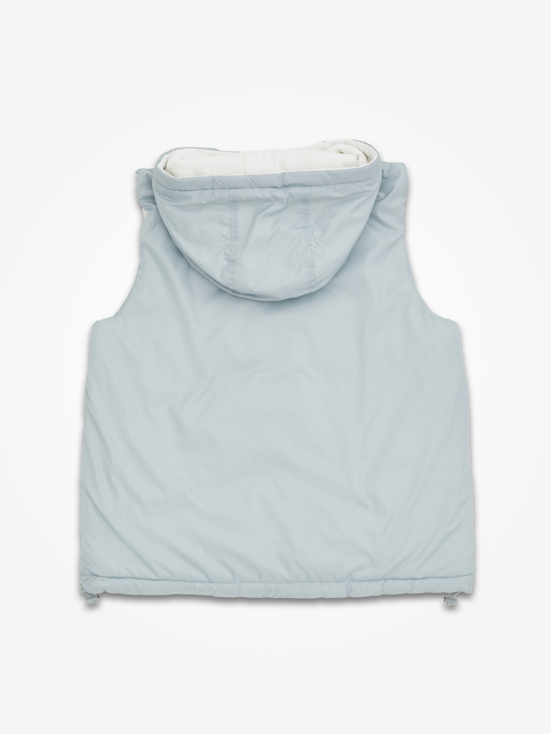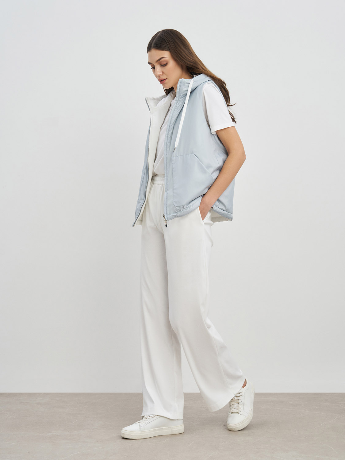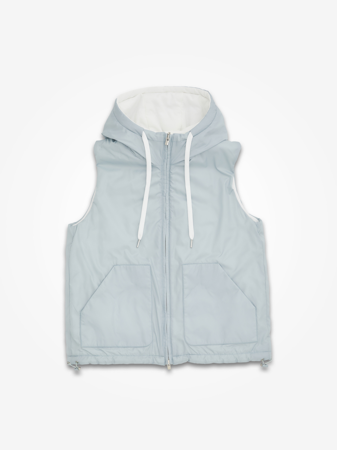 Двусторонняя утепленная жилетка с капюшоном. Застежка на молнию, боковые накладные карманы, кулиски в капюшоне и по низу жилетки, регулирующие прилегание. Ткань и подкладка из дышащего полиэстера, благодаря которому жилетка защищает от ветра, не продувается и сохраняет свой первоначальный вид. Жилетка сочетается с базовыми кэжуал образами- джинсами, прямыми брюками, футболками, водолазками, худи и кедами. На модели размер S. Параметры модели: рост 177, 84-62-93.