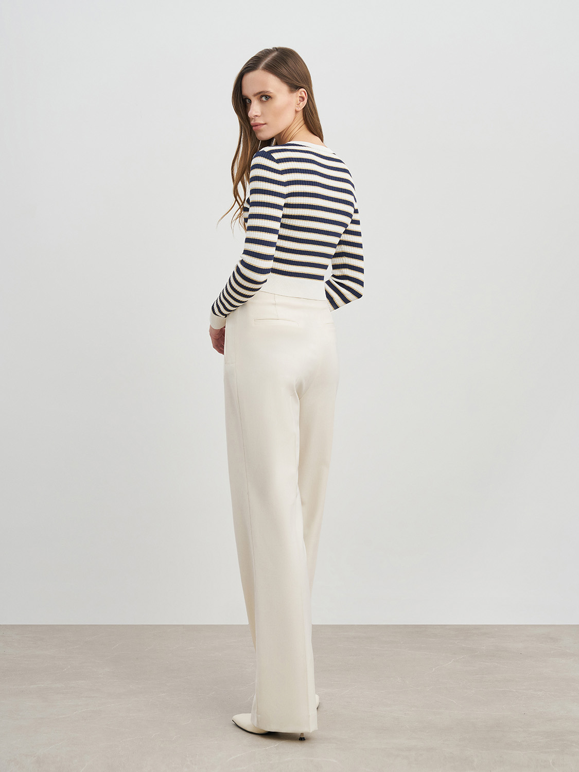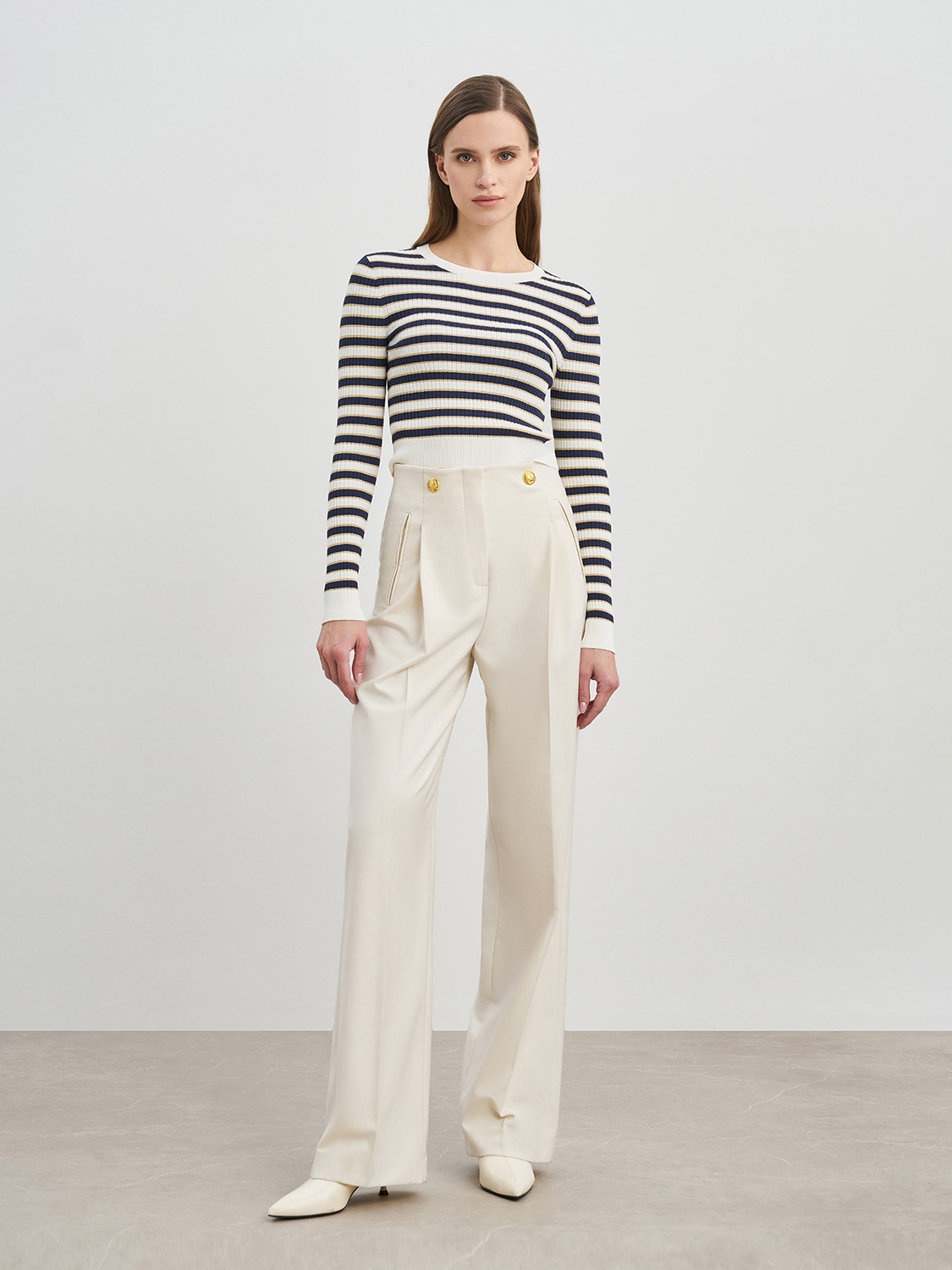 Облегающий укороченный джемпер в рубчик с длинными рукавами. Округлый вырез, комфортные манжеты на рукавах и резинка по низу, актуальный узор в горизонтальную полоску, мягкая и приятная на ощупь и телу ткань. Благодаря смесовому составу, джемпер не растягивается и не теряет свою форму при должном уходе. Дополнит офисные и рабочие образы с брюками и жакетами, а также с денимом, универсален для повседневных и деловых образов. На модели размер S. Параметры модели: рост 173, 80-63-91.