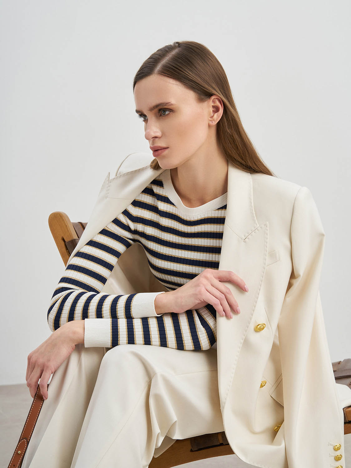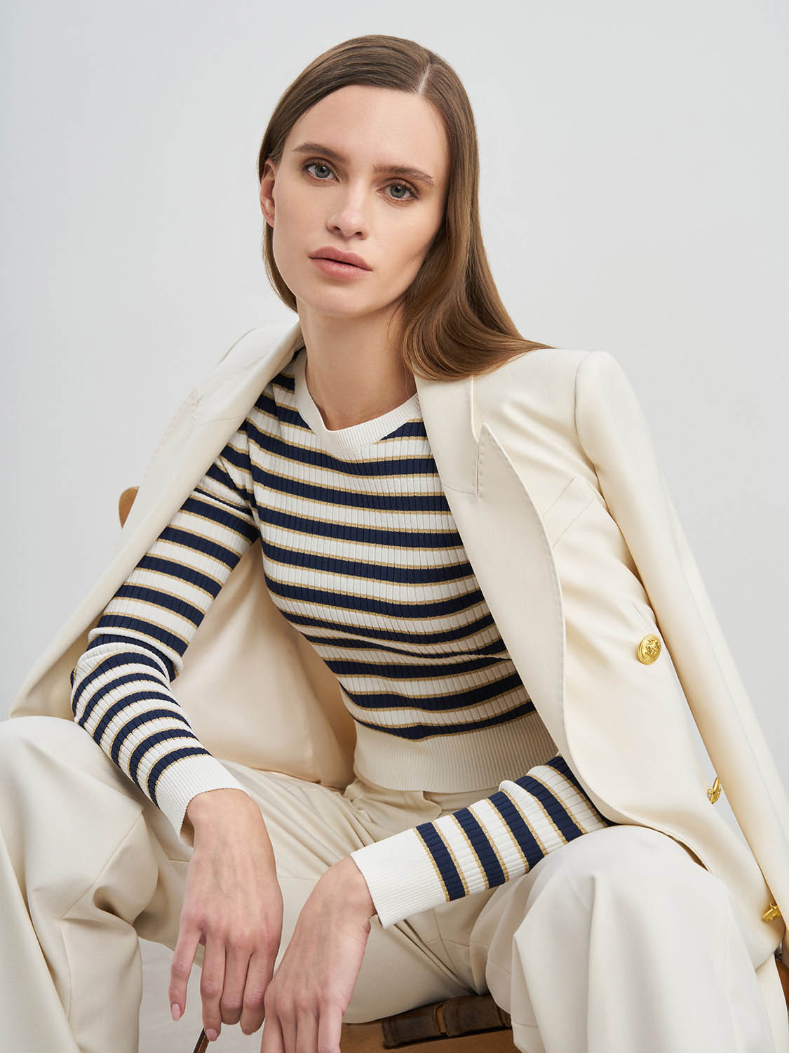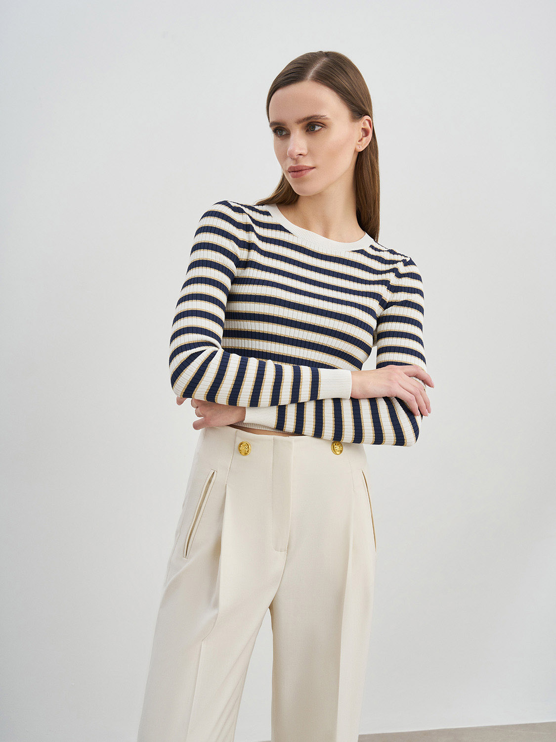 Облегающий укороченный джемпер в рубчик с длинными рукавами. Округлый вырез, комфортные манжеты на рукавах и резинка по низу, актуальный узор в горизонтальную полоску, мягкая и приятная на ощупь и телу ткань. Благодаря смесовому составу, джемпер не растягивается и не теряет свою форму при должном уходе. Дополнит офисные и рабочие образы с брюками и жакетами, а также с денимом, универсален для повседневных и деловых образов. На модели размер S. Параметры модели: рост 173, 80-63-91.
