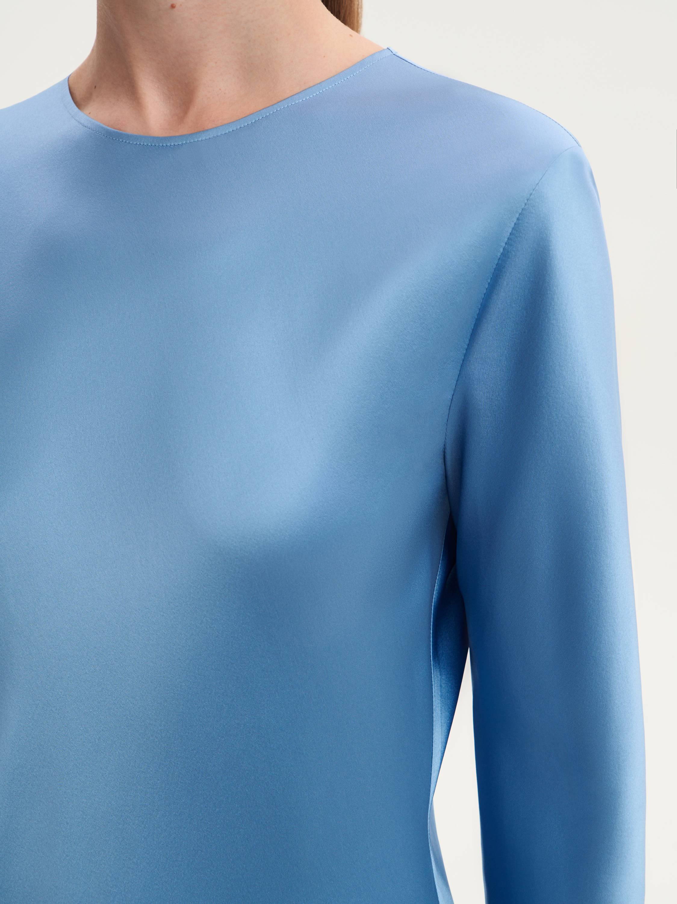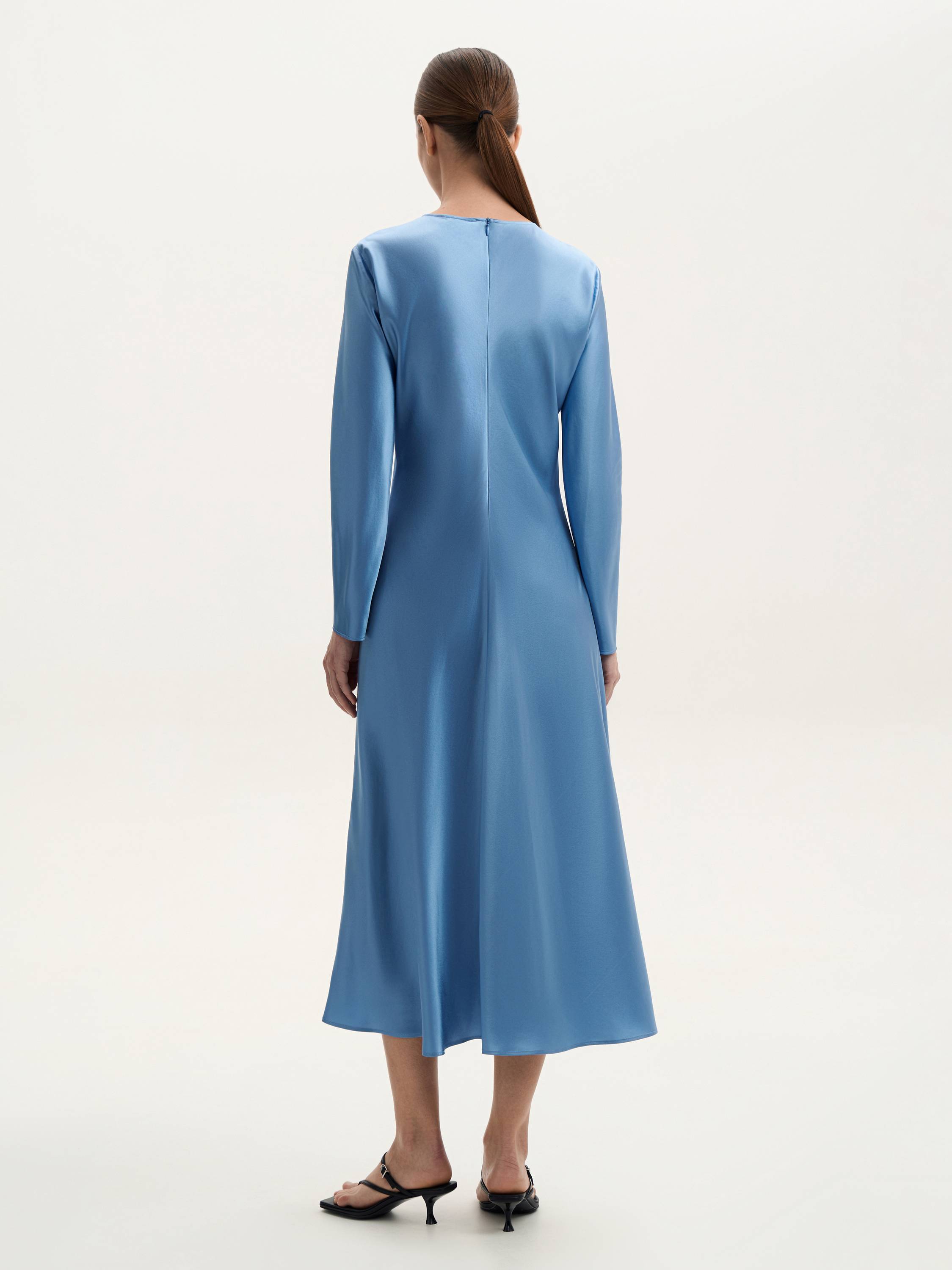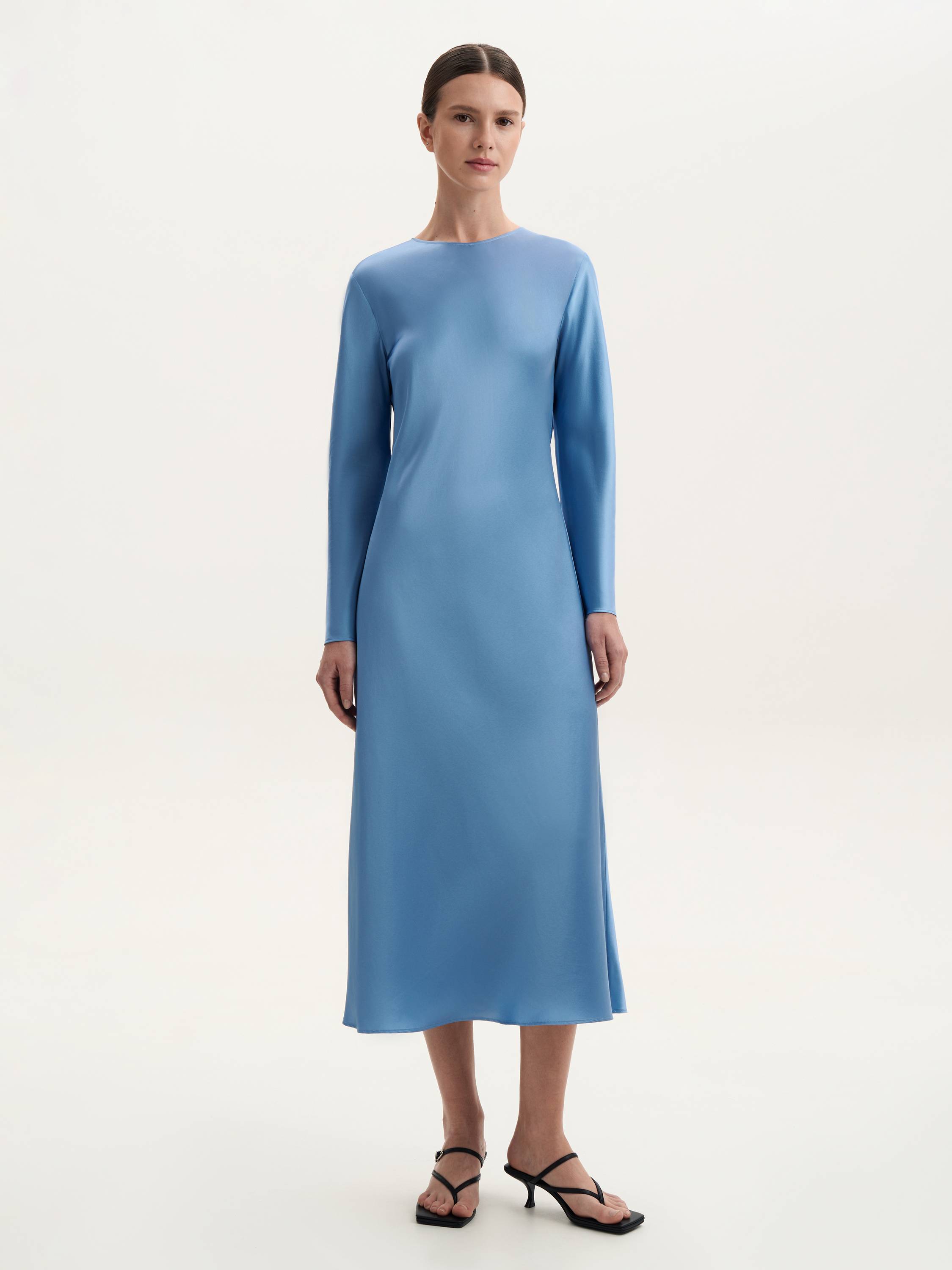 Лаконичное шелковое платье с длинным рукавом, в котором все говорит о достоинстве формы и качества. Прямой силуэт мягко очерчивает фигуру, оставаясь нейтральным фоном для выразительной фактуры шелка. Материал с деликатным блеском приятно ложится по телу, струится при движении и дарит ощущение комфорта. Цвет заслуживает отдельного внимания: воздушный голубой с тонким сиянием — он наполняет образ светом и подчеркивает его чистоту. Минимум деталей — максимум стиля: такой наряд легко адаптировать под разные поводы — от деловой встречи до вечернего выхода.