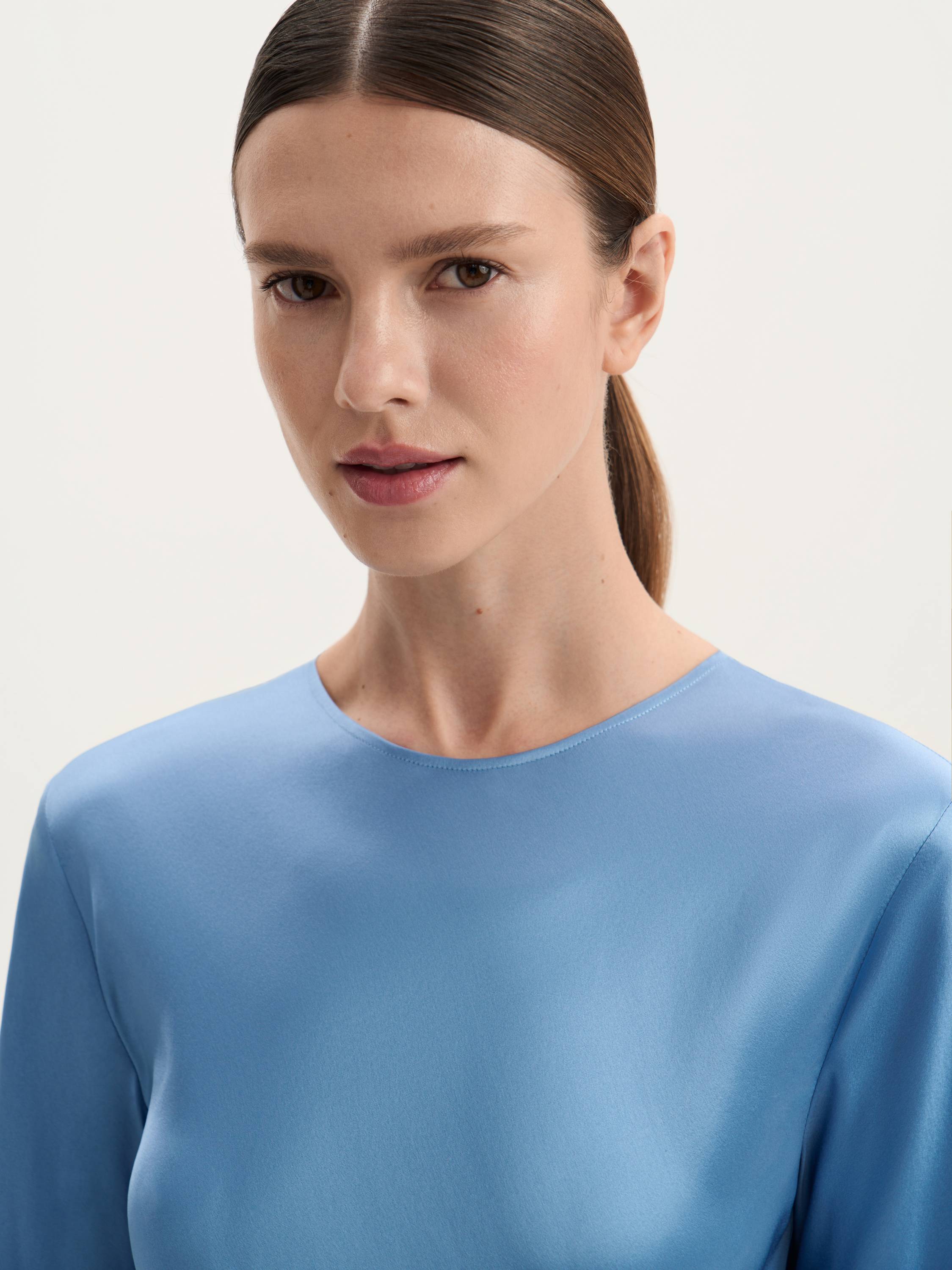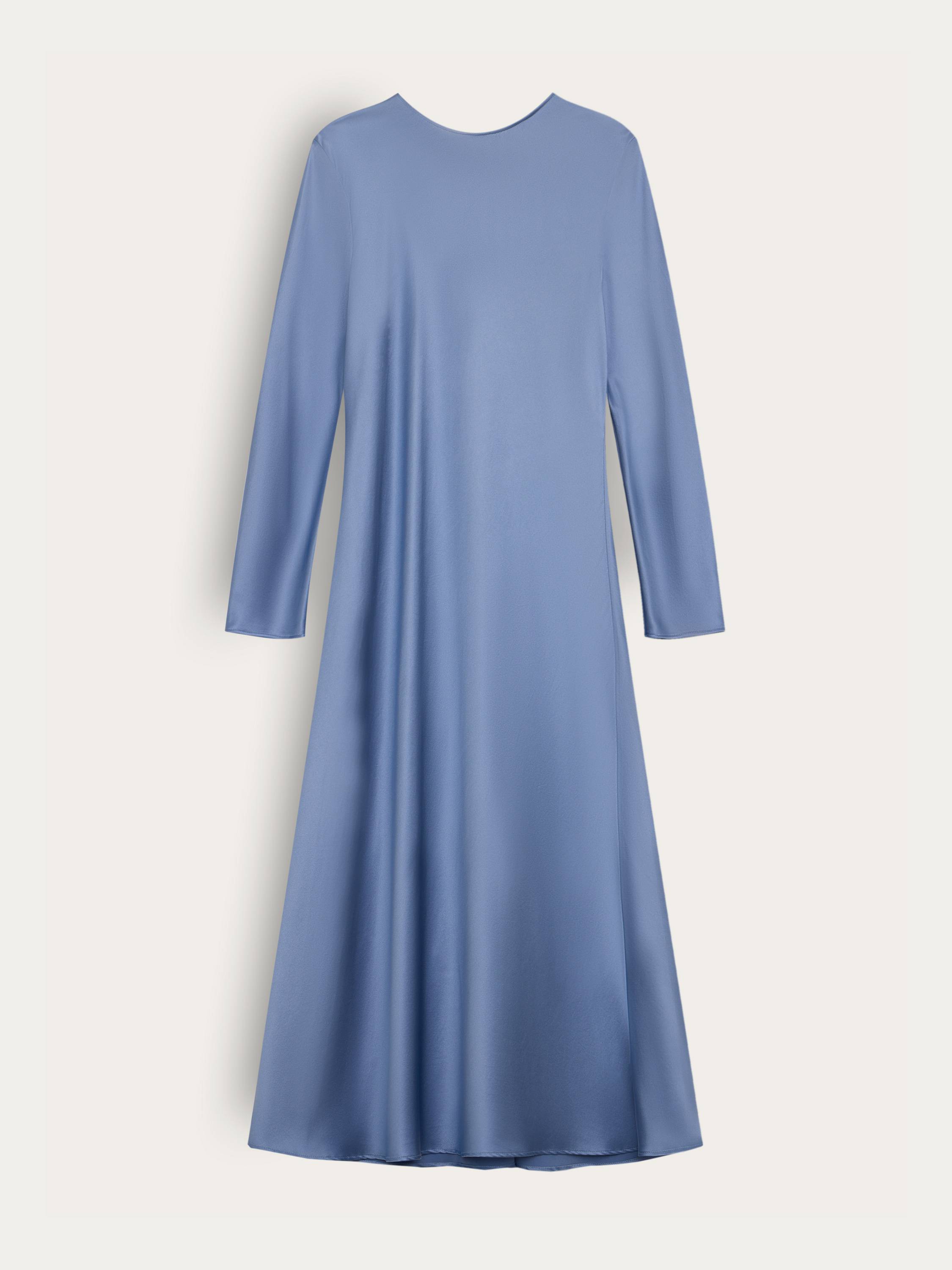 Лаконичное шелковое платье с длинным рукавом, в котором все говорит о достоинстве формы и качества. Прямой силуэт мягко очерчивает фигуру, оставаясь нейтральным фоном для выразительной фактуры шелка. Материал с деликатным блеском приятно ложится по телу, струится при движении и дарит ощущение комфорта. Цвет заслуживает отдельного внимания: воздушный голубой с тонким сиянием — он наполняет образ светом и подчеркивает его чистоту. Минимум деталей — максимум стиля: такой наряд легко адаптировать под разные поводы — от деловой встречи до вечернего выхода.