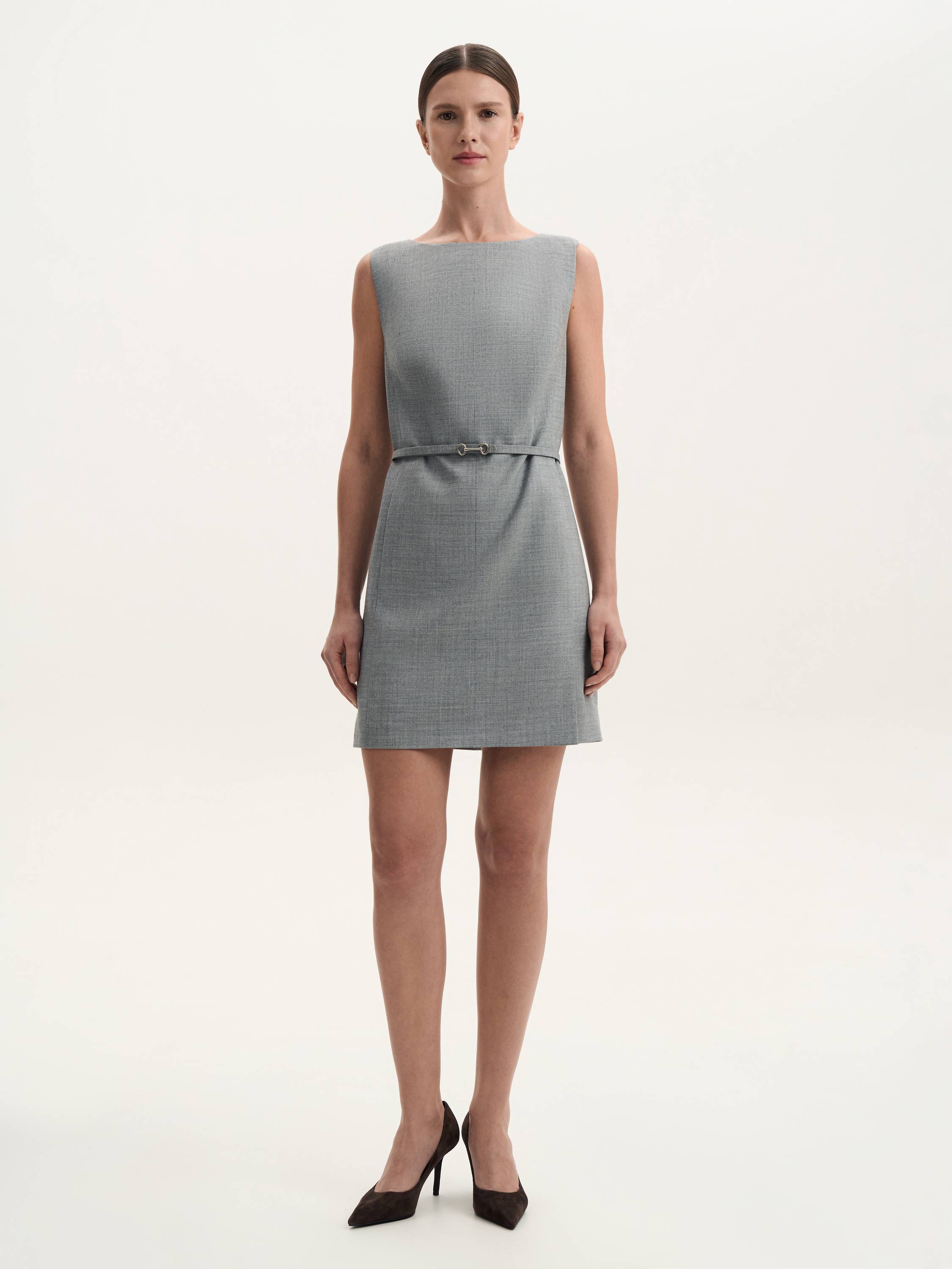 Платье мини из шерсти с декоративным поясом — лаконичный силуэт с акцентом на детали. Приталенный крой подчеркивает фигуру, а плотный материал с шерстью обеспечивает комфорт и мягкость. Изящный пояс визуально выделяет талию, придавая образу завершенность. Гладкая фактура ткани и сдержанный оттенок делают модель универсальной — она легко впишется как в повседневный, так и в более формальный гардероб. Сочетайте с высокими сапогами или лаконичными туфлями для стильного образа в холодное время года.