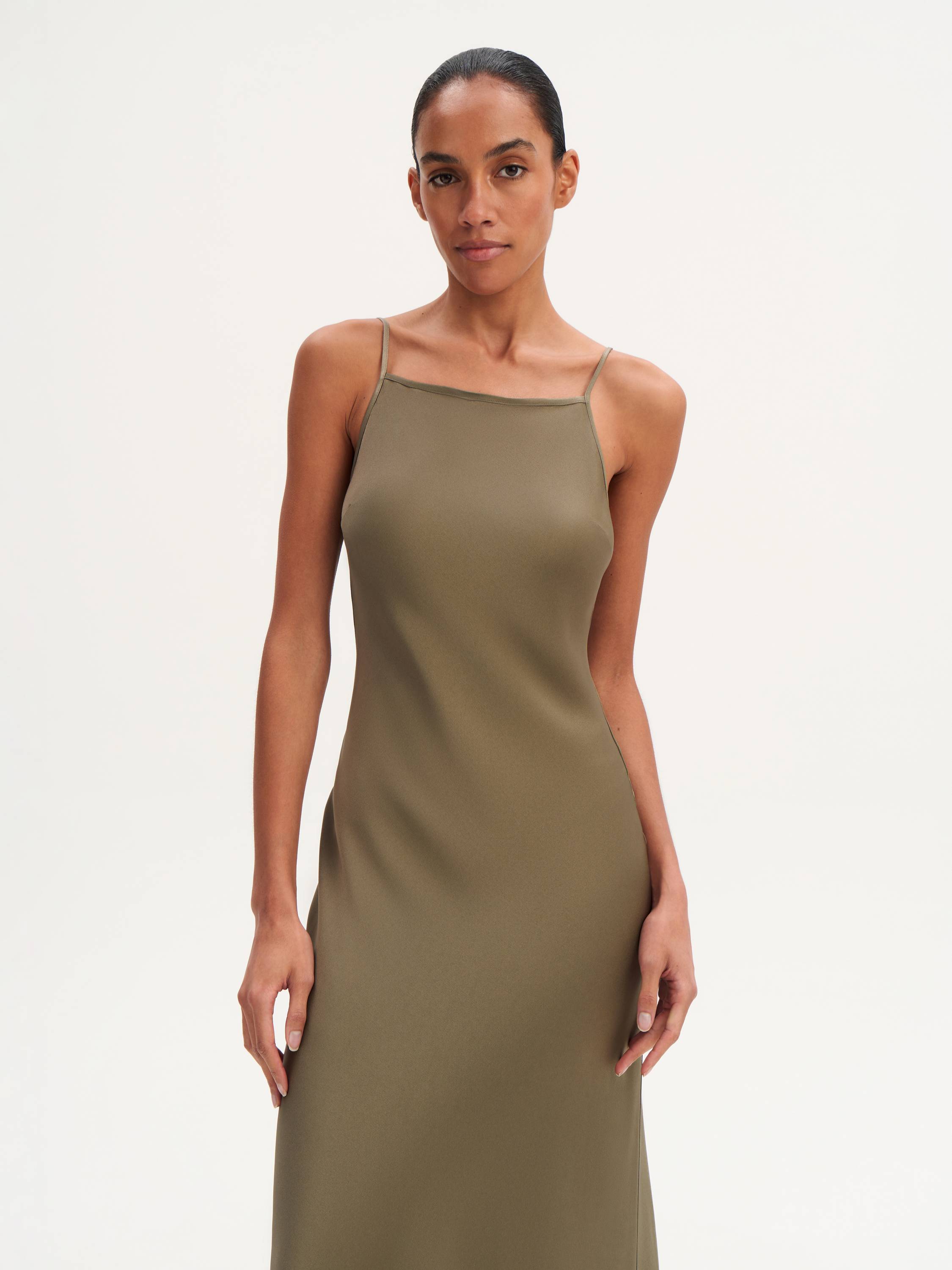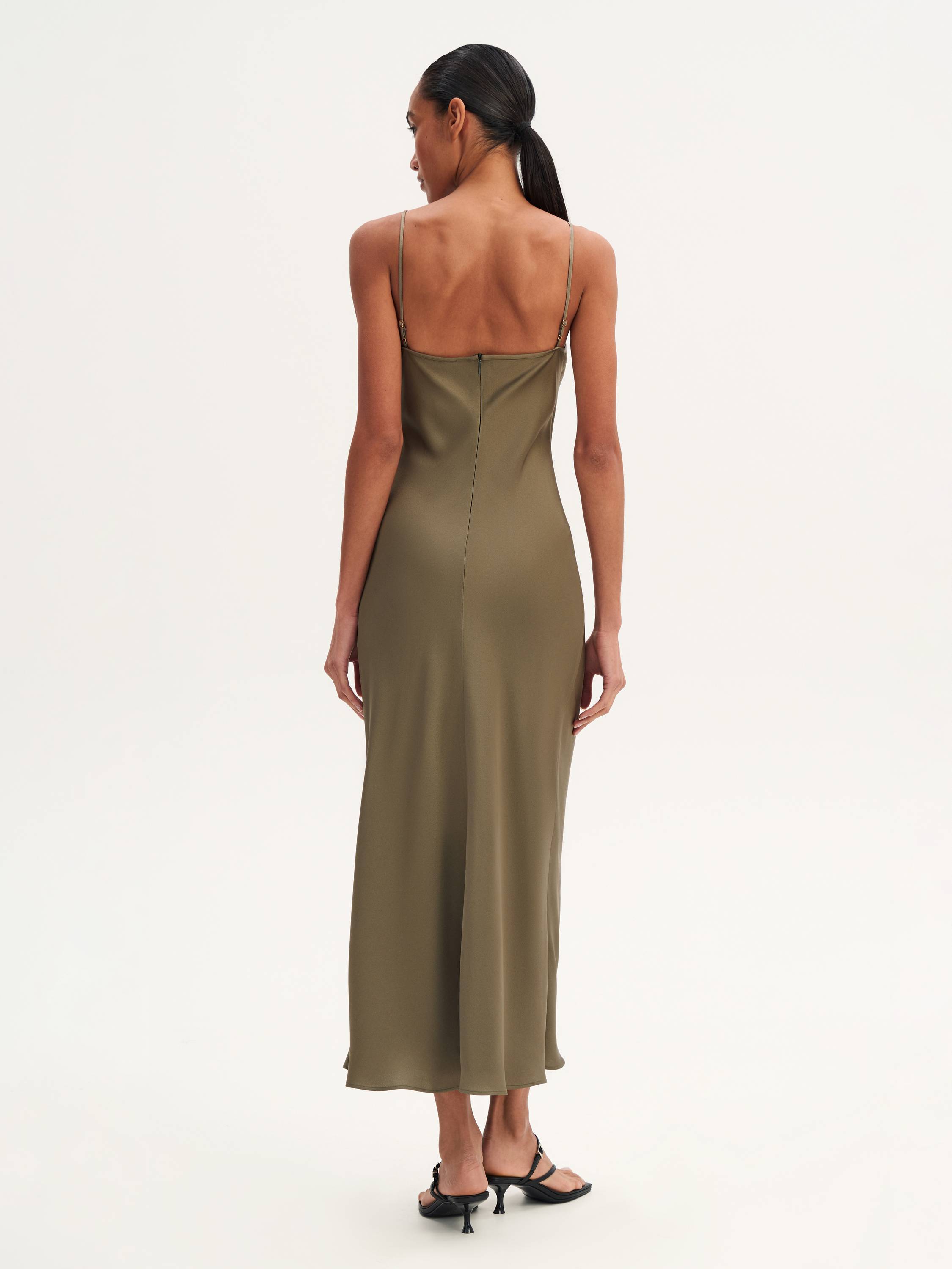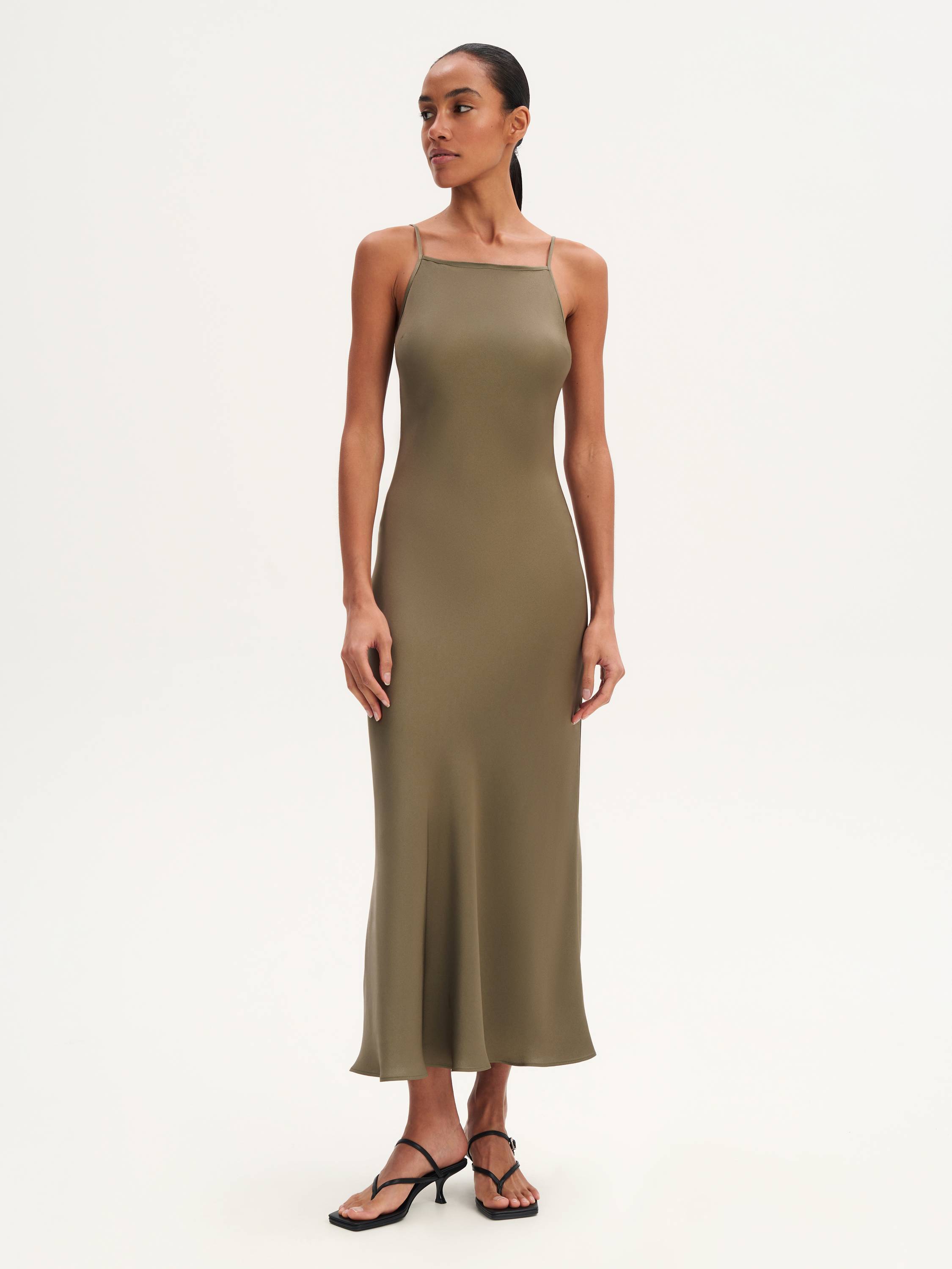 Это миди-платье воплощает эстетику минимализма и мягкой женственности. Лаконичный фасон на тонких бретелях открывает плечи и акцентирует линию ключиц, а струящийся силуэт мягко повторяет движения тела. Сочетание вискозы и ацетата придает ткани легкий шелковистый блеск, приятную прохладу и высокую драпируемость. Такая модель станет идеальной базой летнего гардероба: она универсальна и может адаптироваться к разным случаям — от повседневных прогулок до вечерних выходов. Добавьте к платью босоножки, жакет или акцентные украшения — и образ готов.