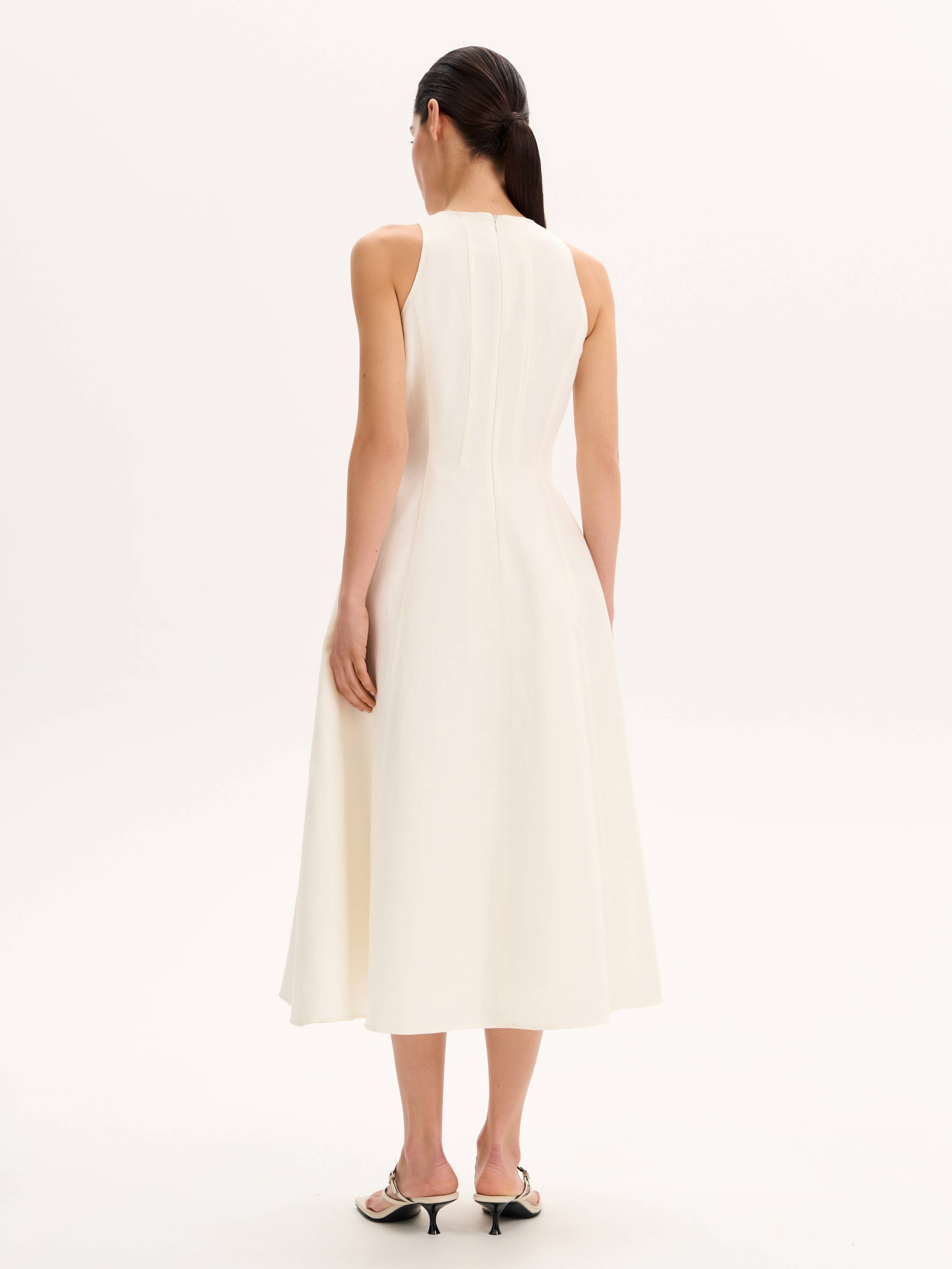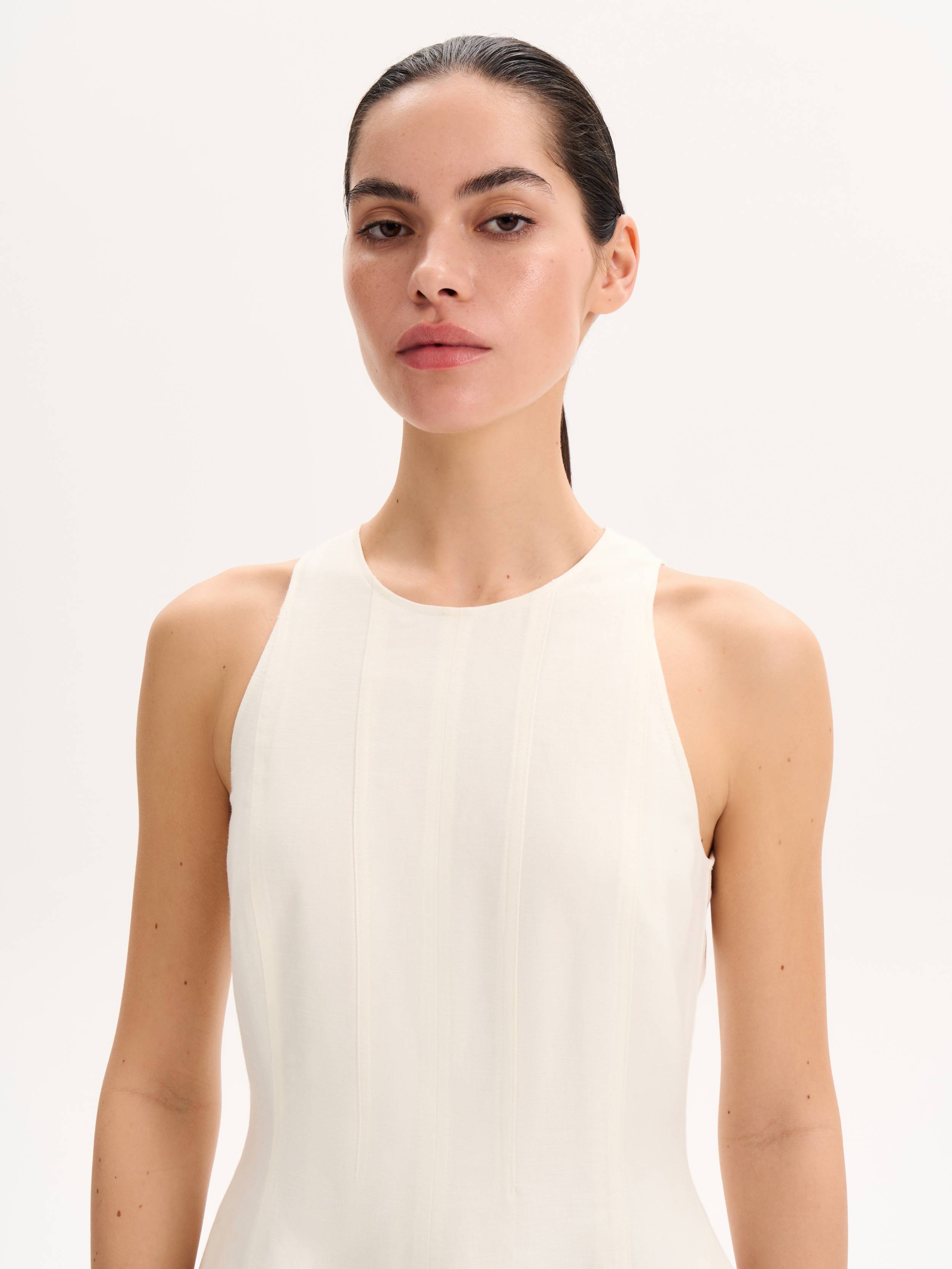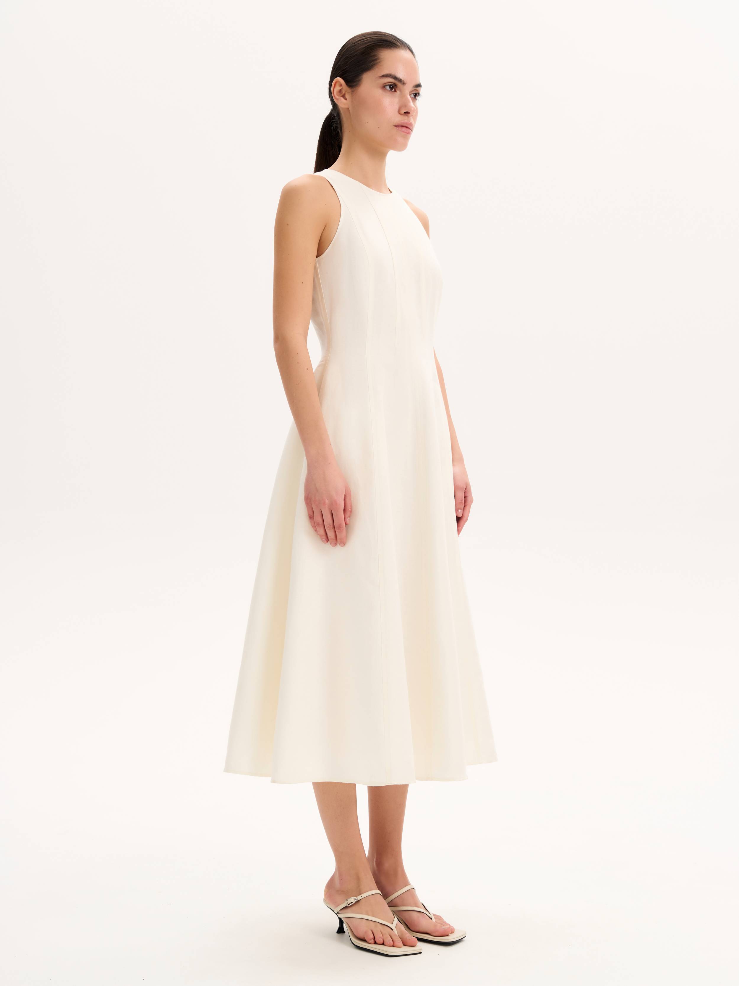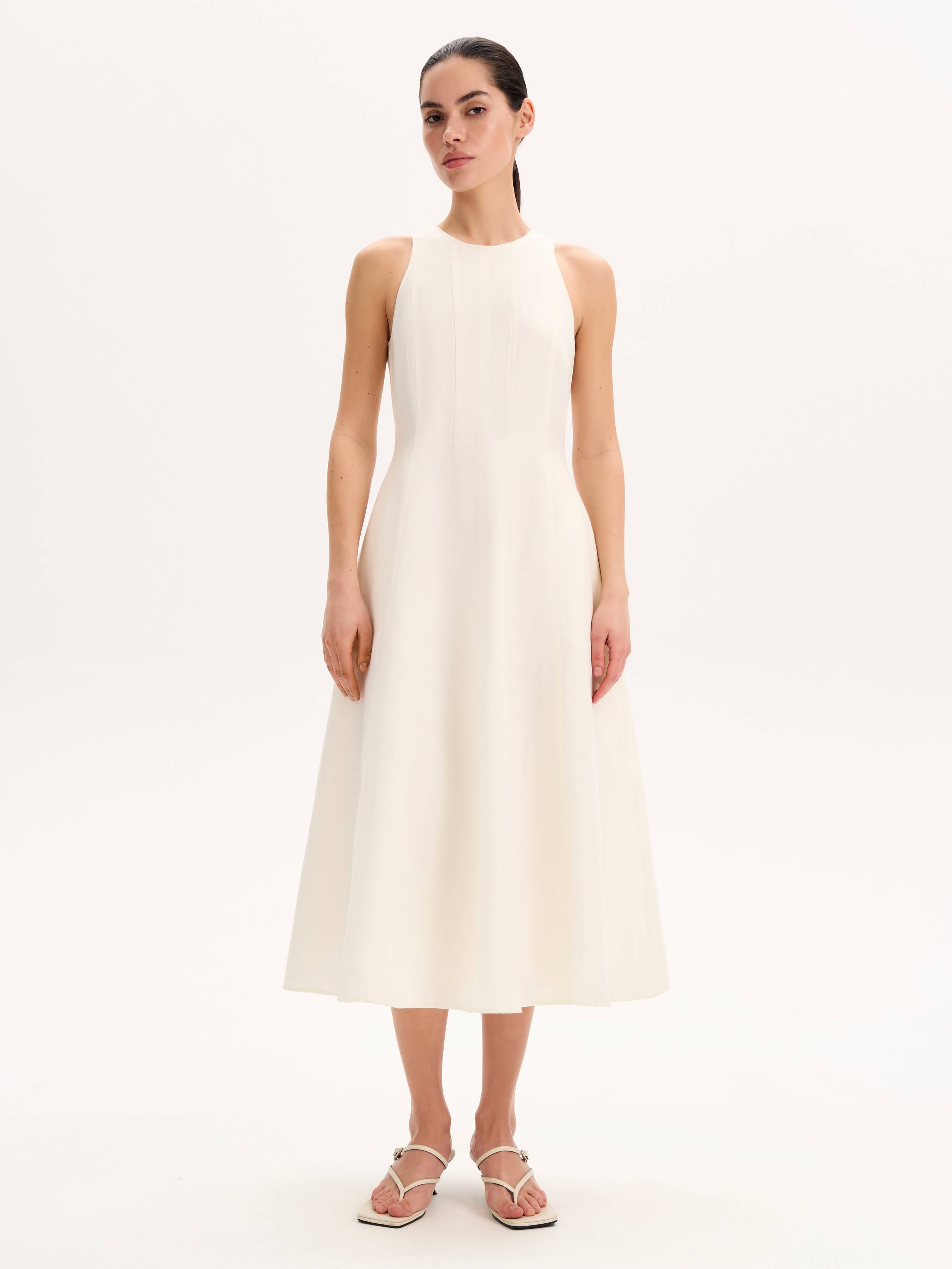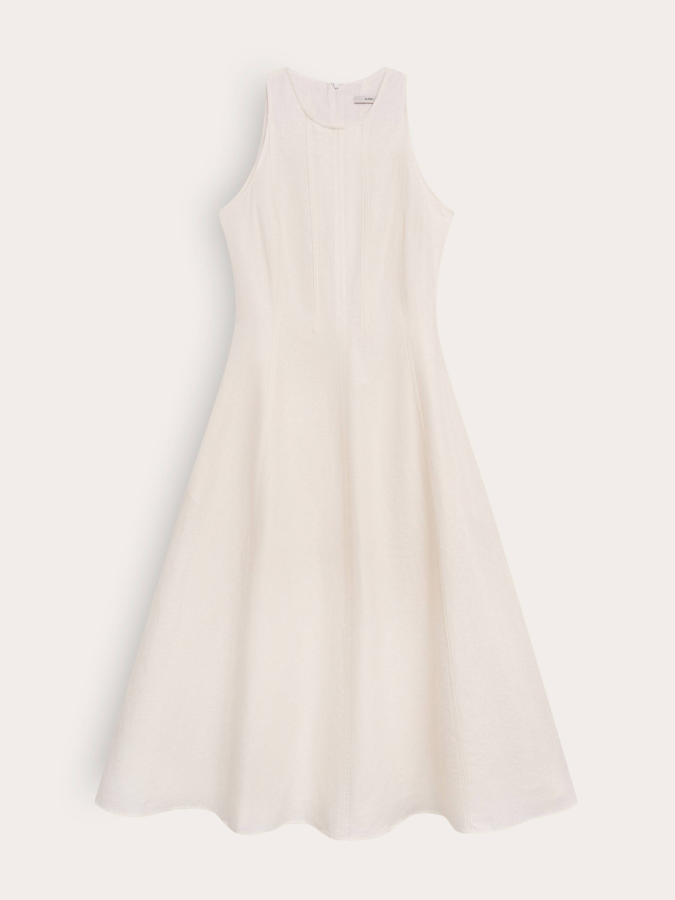 Воздушное и собранное по форме — это платье-миди изо льна создано для летних дней, когда хочется простоты, не теряя элегантности. Продуманный силуэт с выточками и расклешенной юбкой подчеркивает фигуру и при этом остается легким и дышащим. Высокий вырез делает образ сдержанным и современным, а отсутствие рукавов придает свежести и элегантности. Натуральный лен комфортно ощущается на теле, не перегревает и быстро адаптируется к температуре — именно то, что нужно в жаркий сезон. Добавить акцентные аксессуары — и стильный летний аутфит готов.