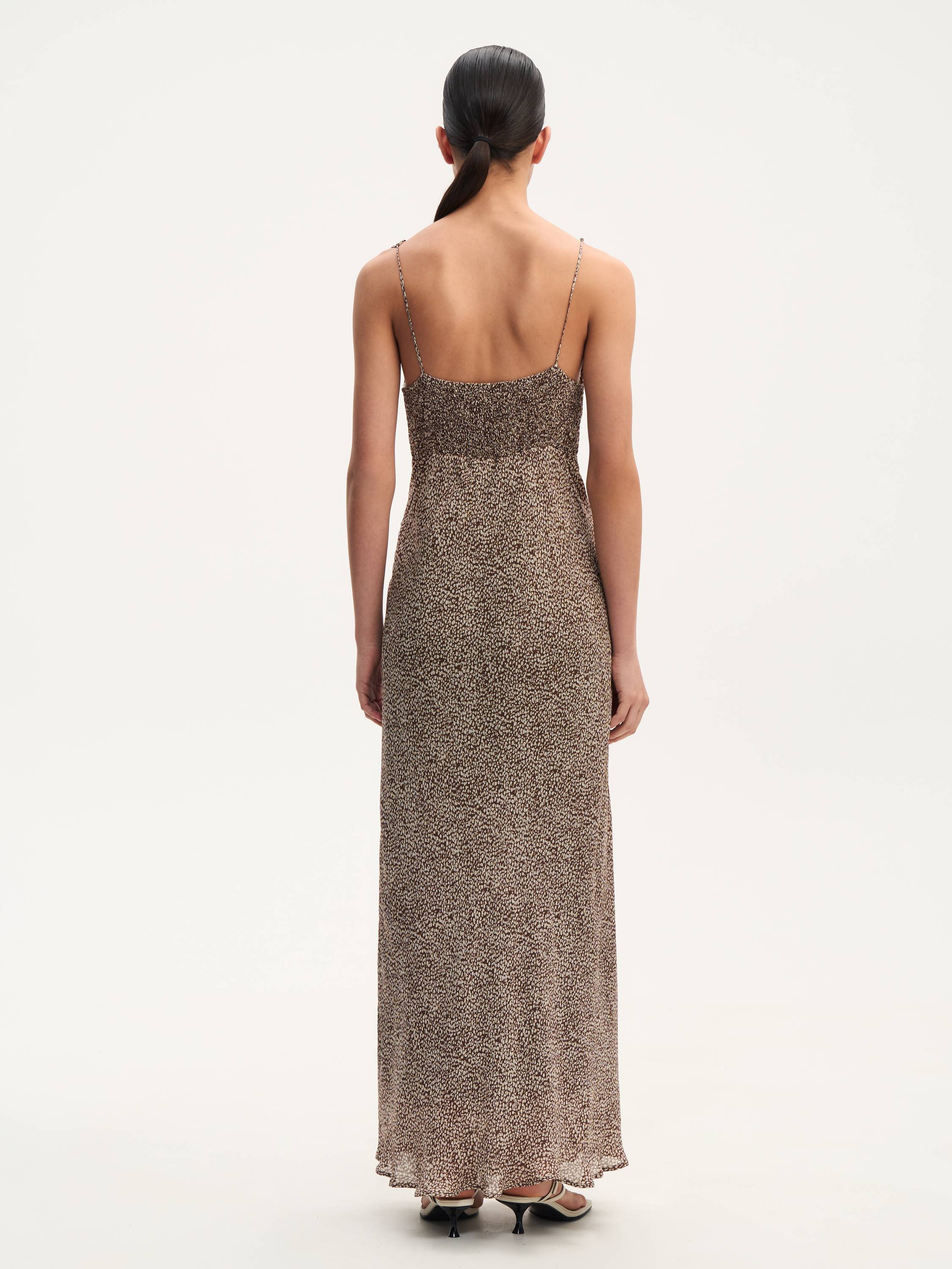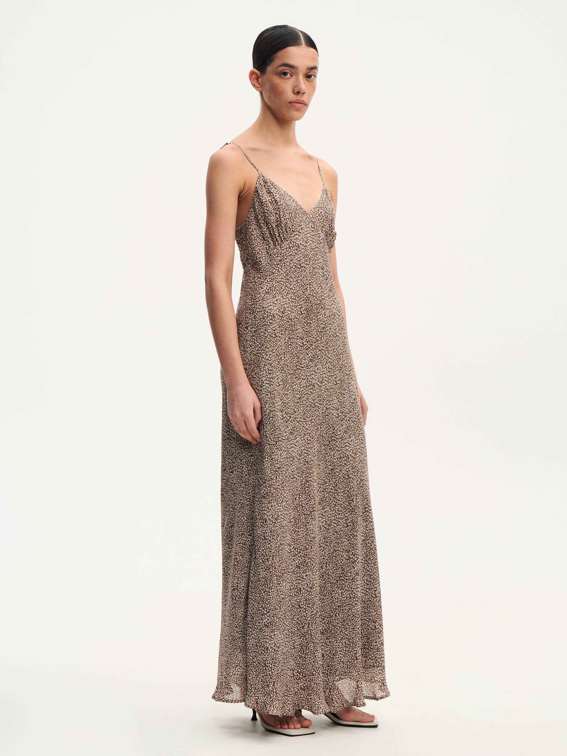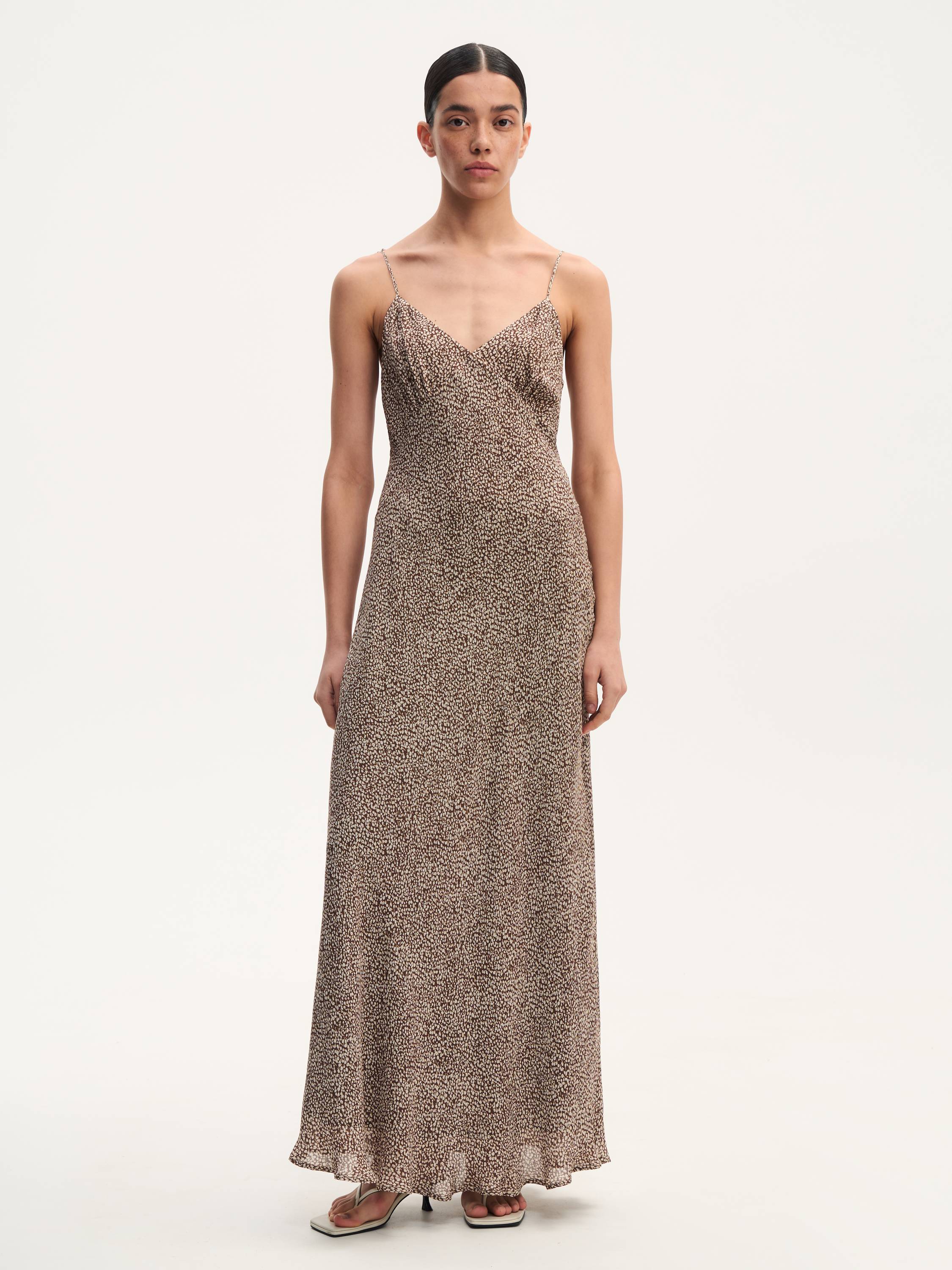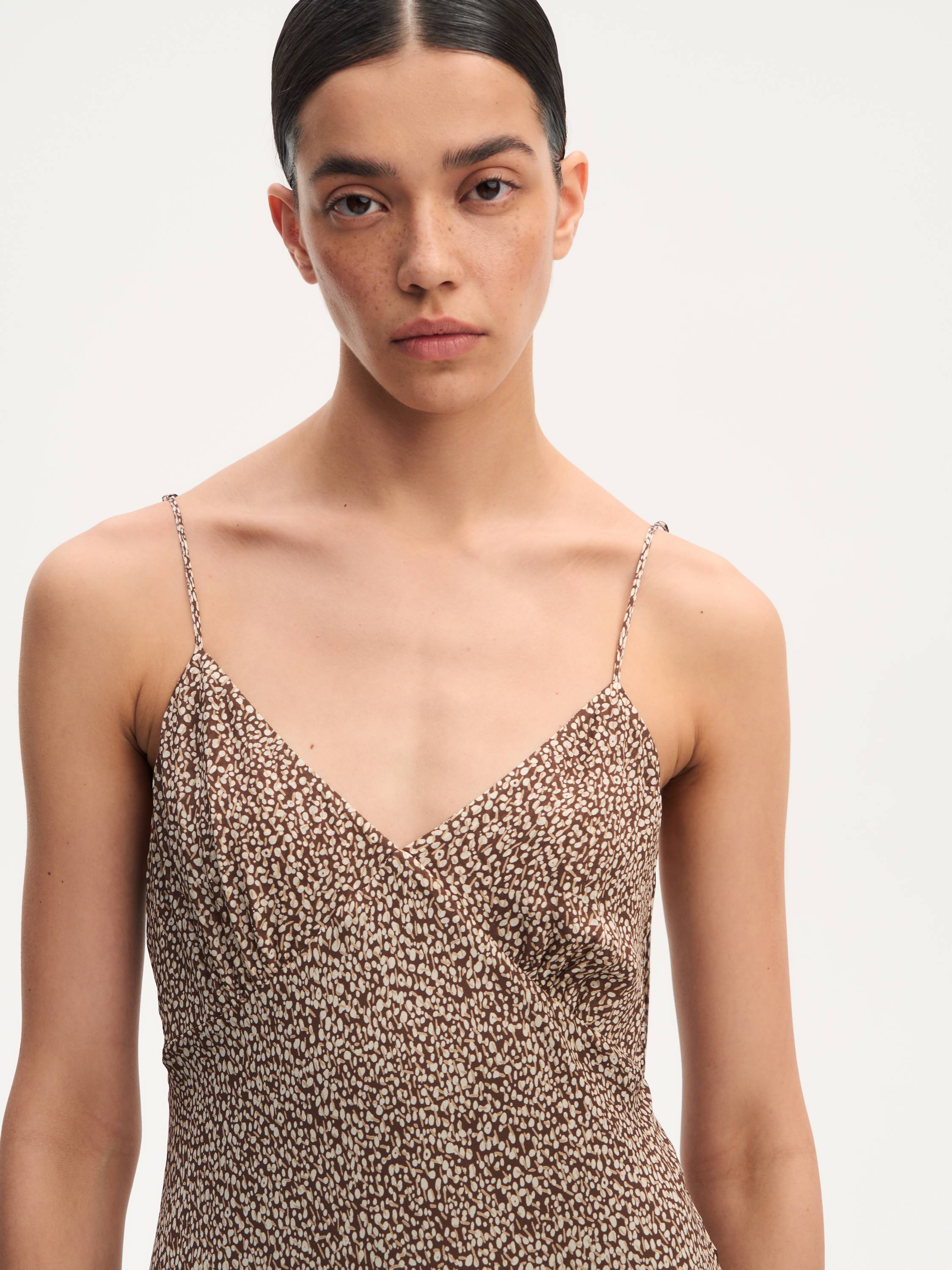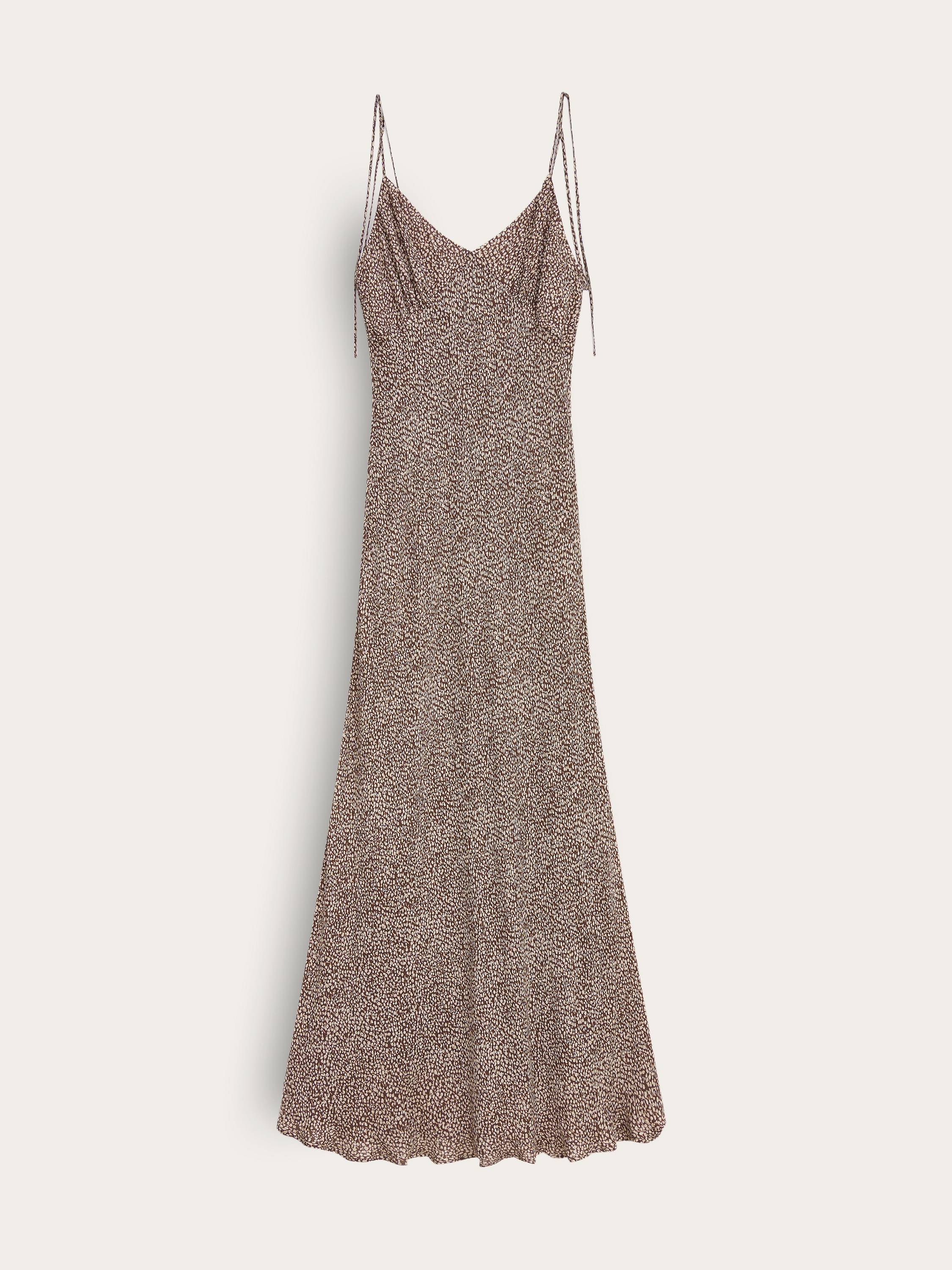 Легкое, струящееся, словно скользящее по телу — платье на тонких регулируемых бретелях подчеркивает женственность через движение ткани. V-образный вырез и мягкая драпировка в области груди создают элегантный акцент, а собранная на спинке резинка обеспечивает комфортную посадку без утяжеления силуэта. Графичный микропринт добавляет фактурности, не перегружая образ. Идеальный вариант для жаркого города, отпуска у моря или вечерних встреч, когда хочется выглядеть легко, но выразительно.