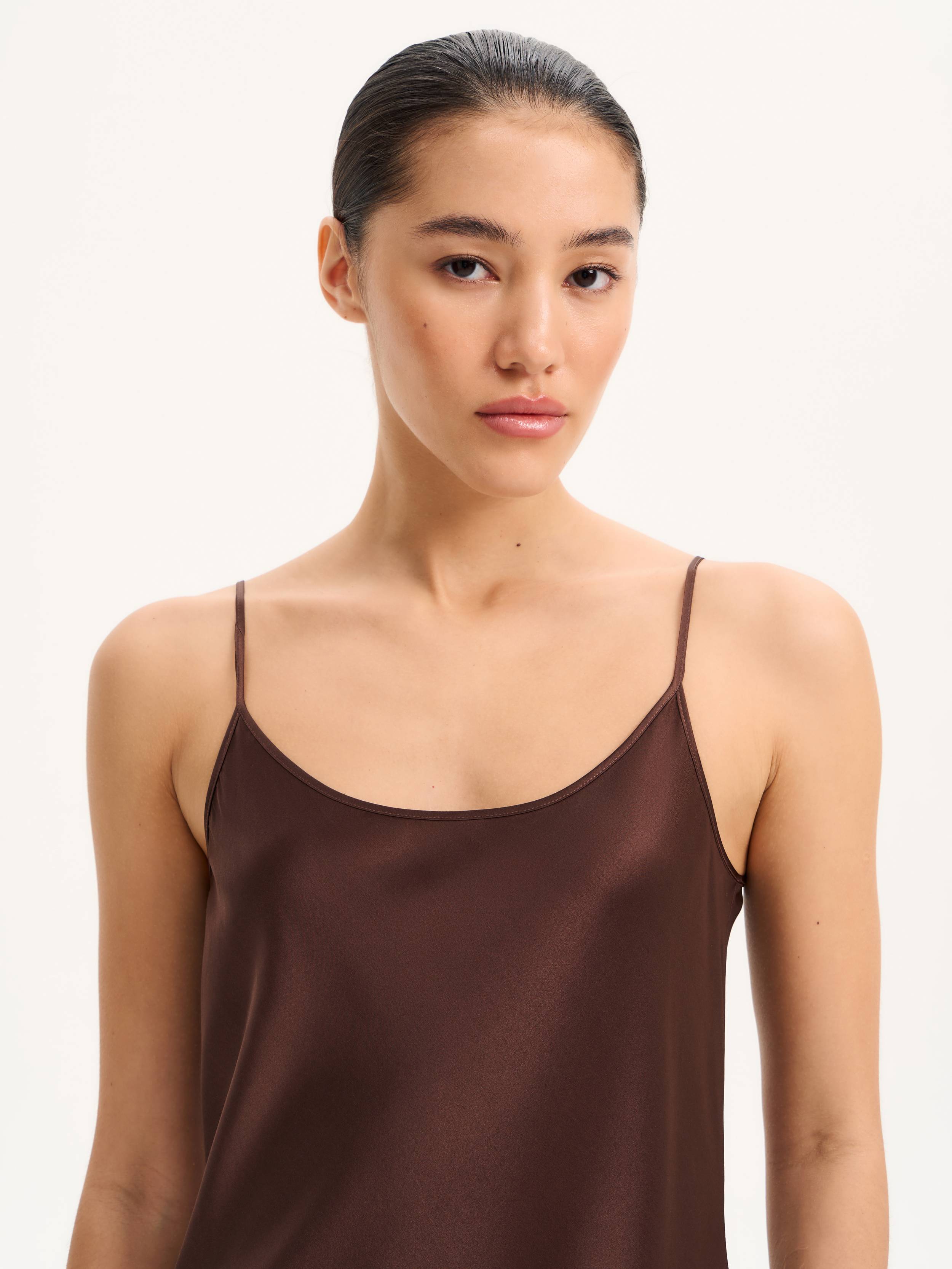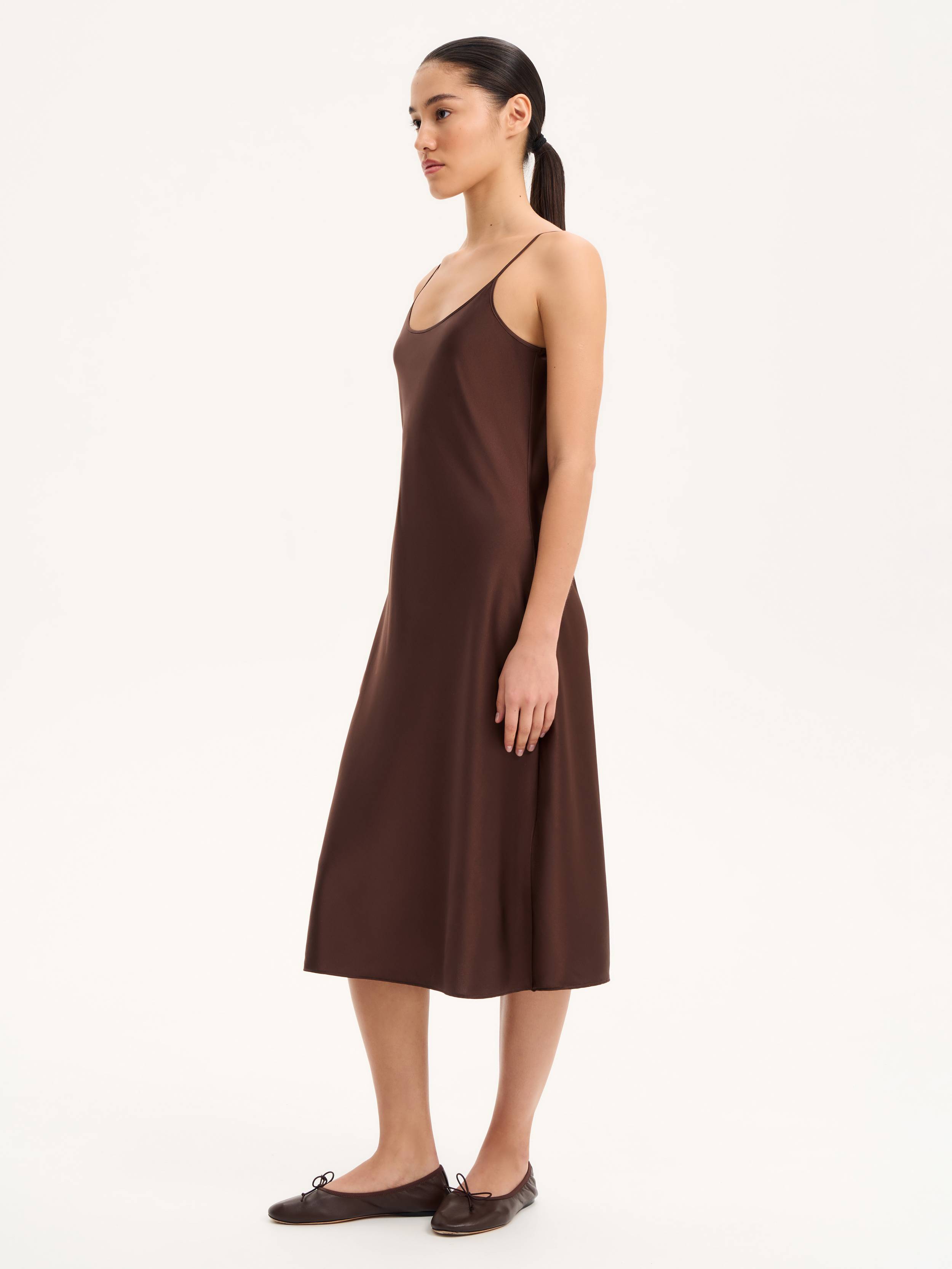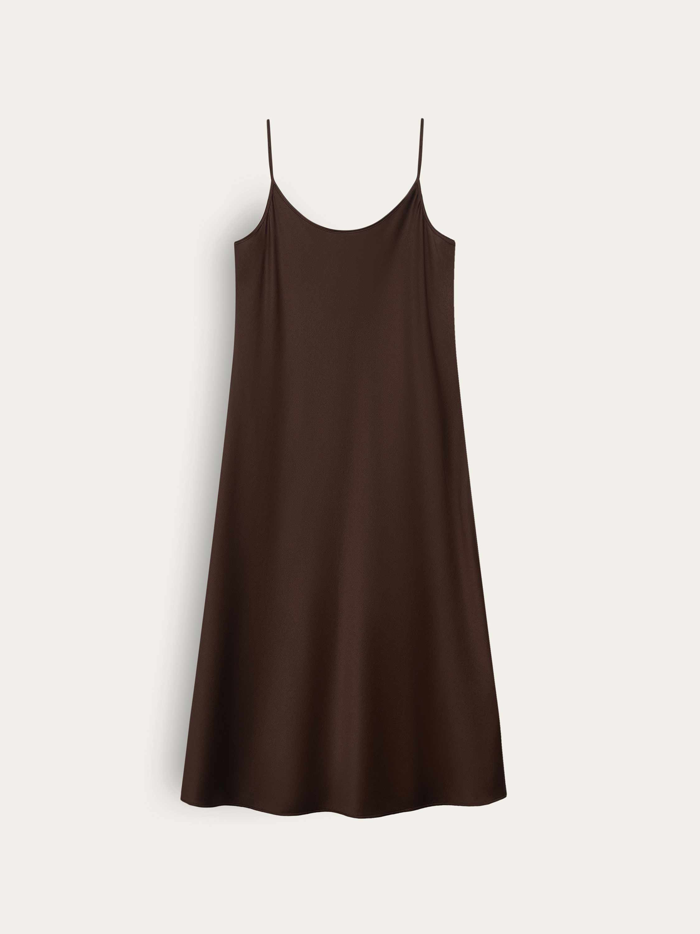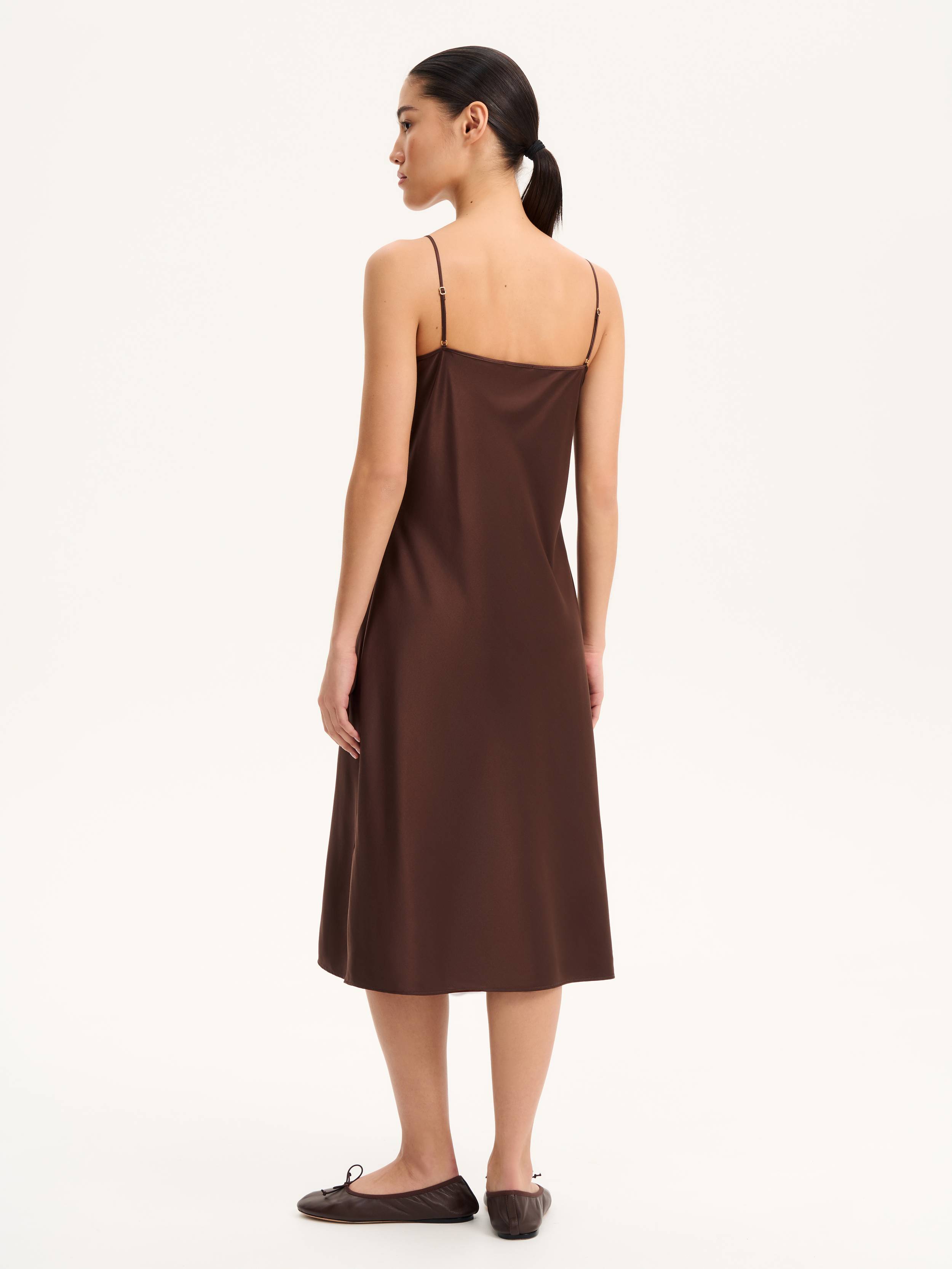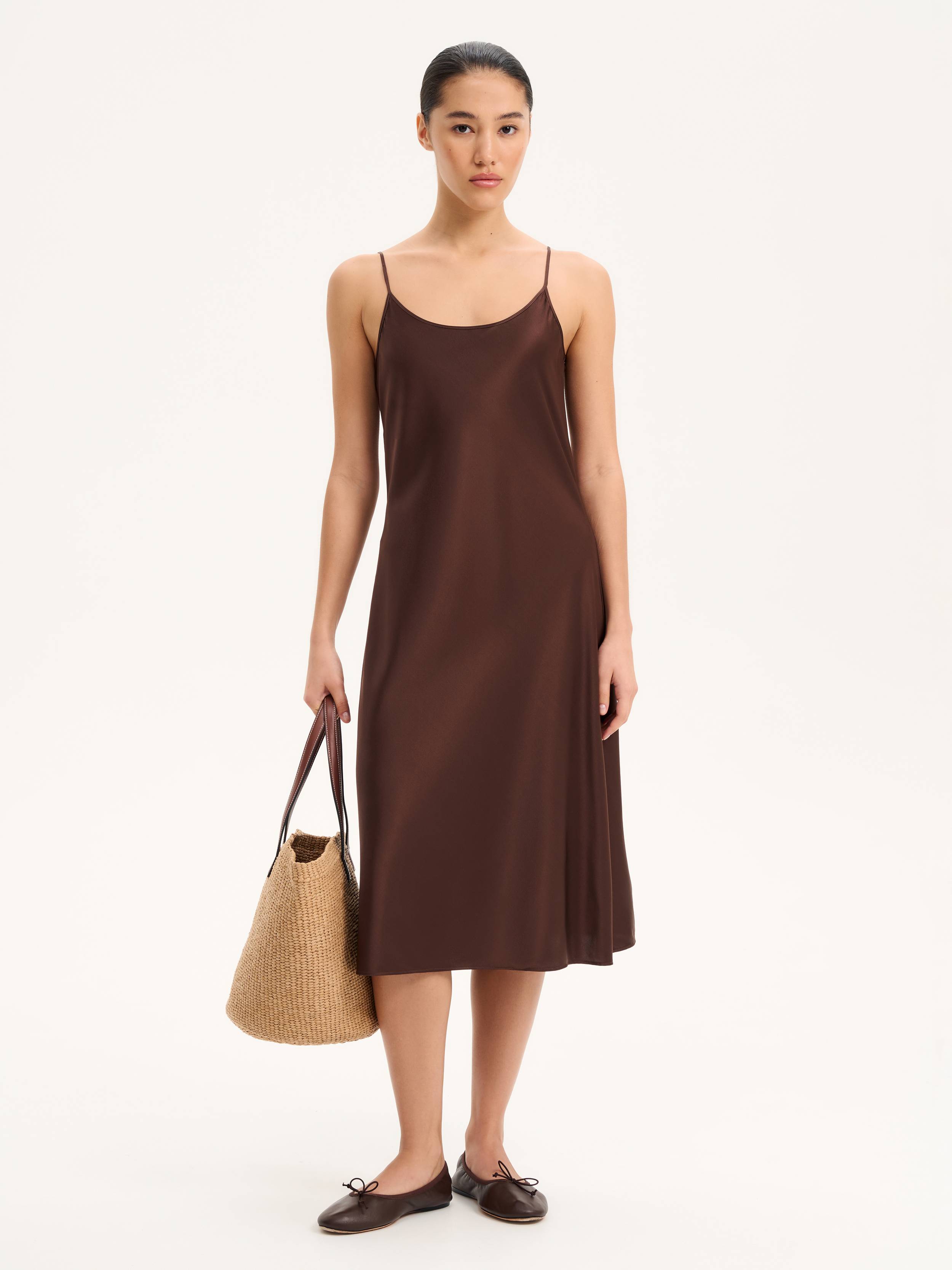 Платье-комбинация из чистого шелка — лаконичное и выразительное в своей простоте. Свободный силуэт в длине миди струится по фигуре, не утяжеляя образ, а тонкие регулируемые бретели подчеркивают изящество плеч. Матовая поверхность шелка приглушает блеск, сохраняя ощущение благородства и сдержанной роскоши. Эта модель легко адаптируется под разный контекст — от расслабленного дневного наряда до деликатного вечернего выхода.