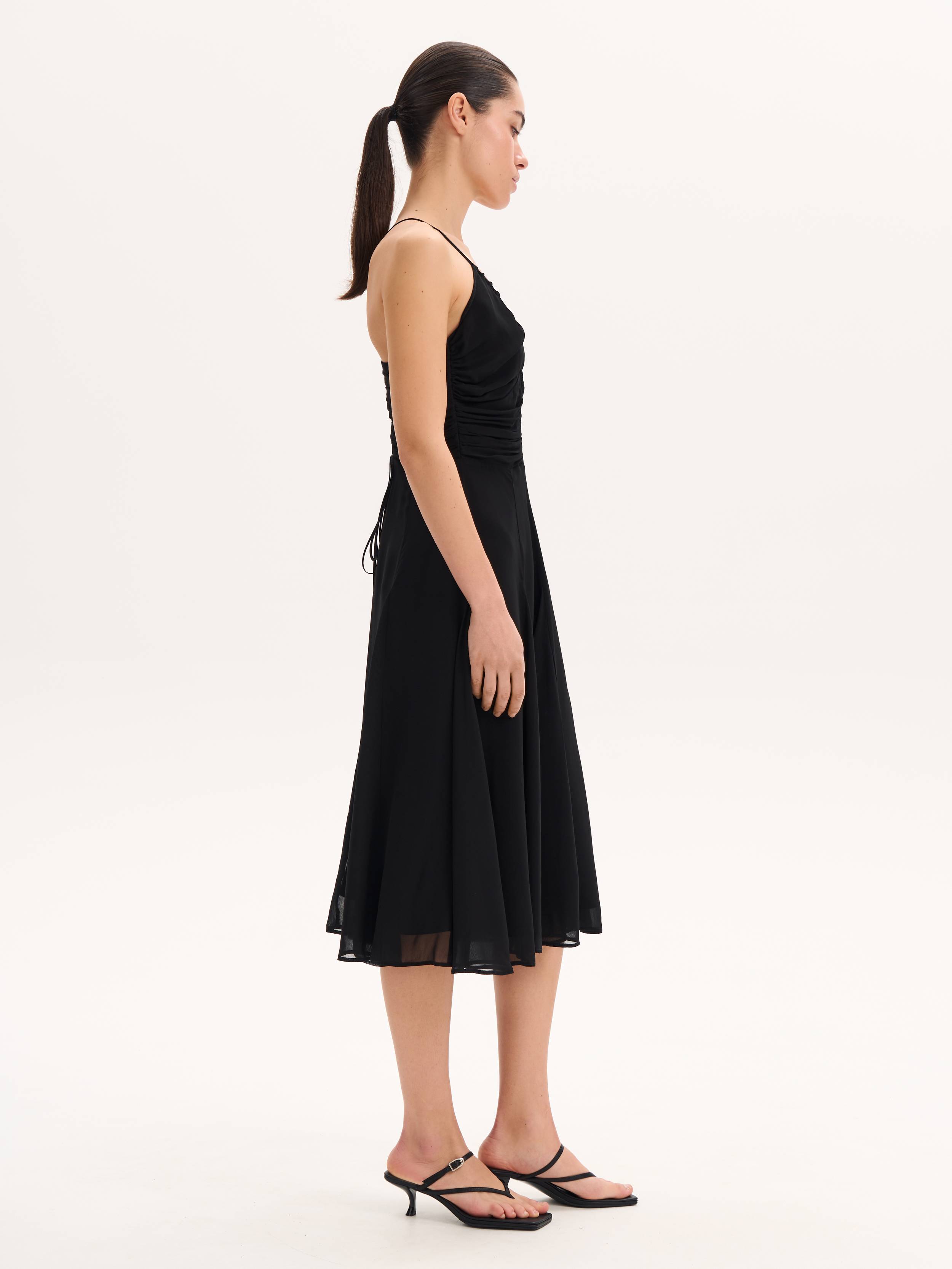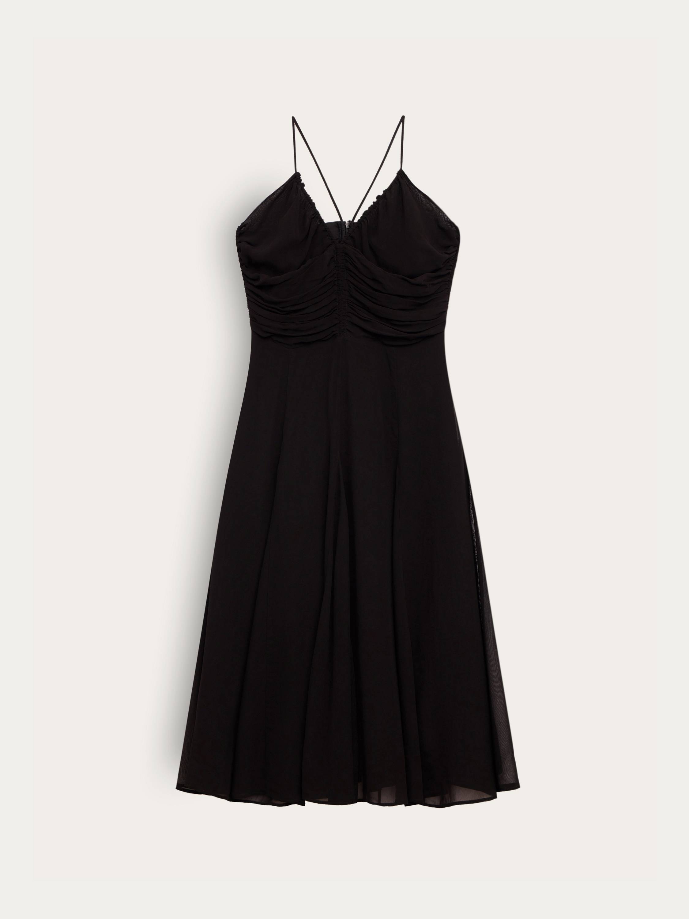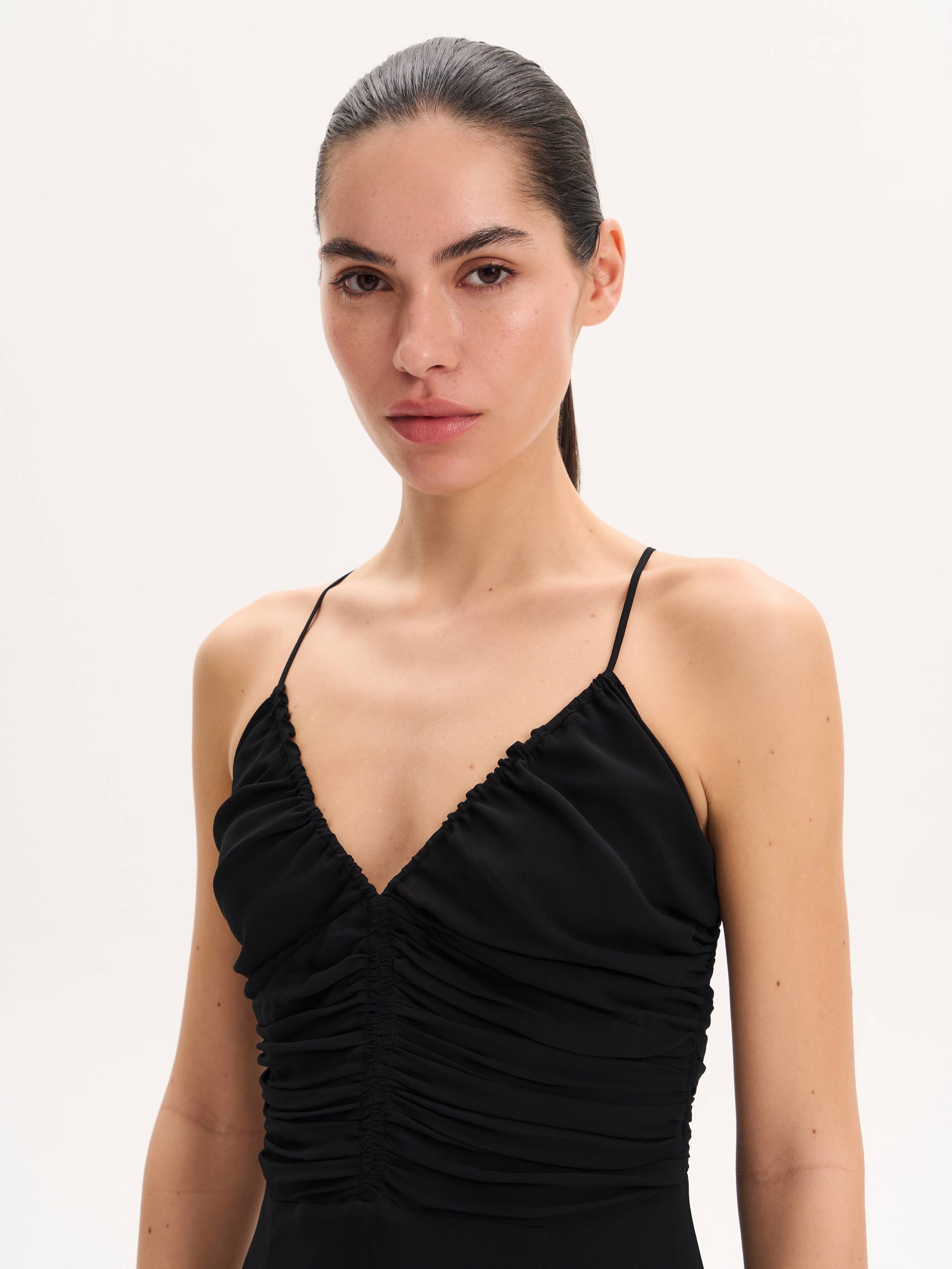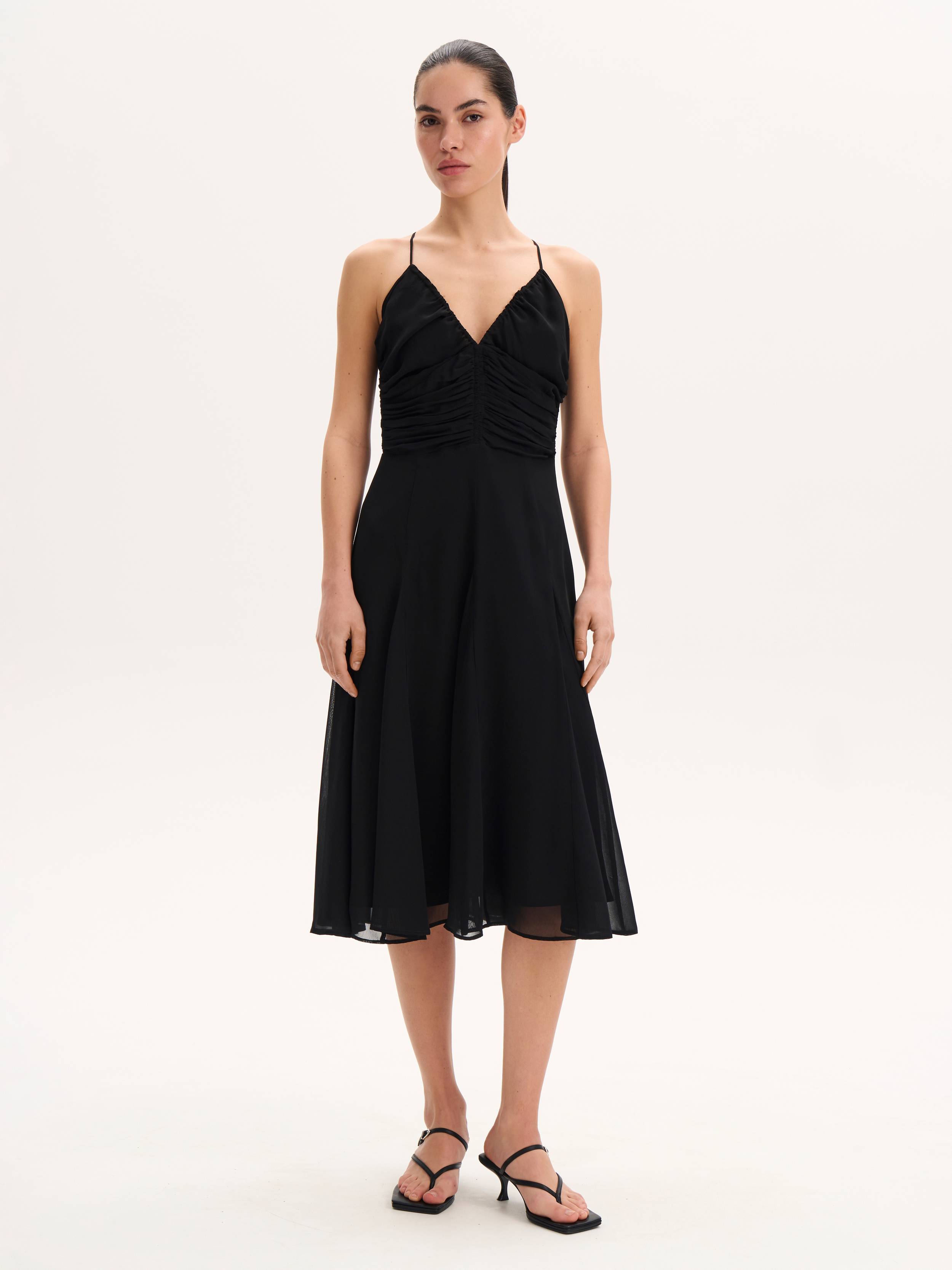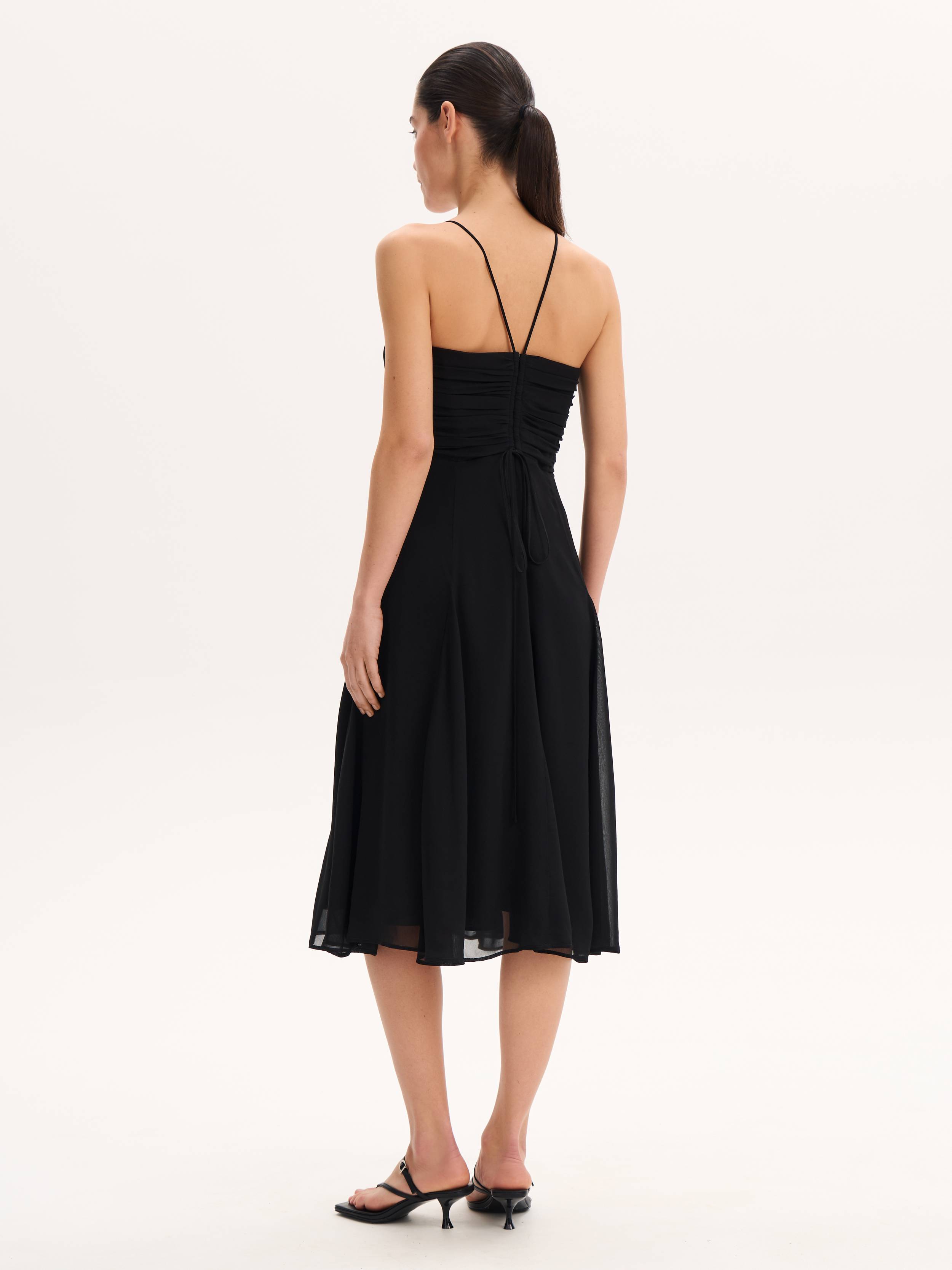 Миди-платье на тонких бретелях, выполненное из чистого района — легкого, дышащего материала с шелковистой фактурой и струящимся, почти жидким движением. Район — это целлюлозное волокно, которое сочетает в себе эстетику натурального шелка и комфорт повседневной ткани: оно приятно охлаждает кожу, не электризуется и красиво драпируется, подчеркивая линии тела. Акцент — на лифе с изящной драпировкой: деликатная сборка выделяет зону декольте и придает образу мягкий объем. Спинка открыта, бретели перекрещиваются и регулируются, позволяя точно настроить посадку. Свободный силуэт юбки мягко расширяется к подолу и красиво раскрывается в движении. Это платье ощущается как второе дыхание — невесомое, прохладное, женственное. Идеальный выбор для летних вечеров, эстетичных встреч и тех моментов, когда хочется звучать тонко и выразительно.