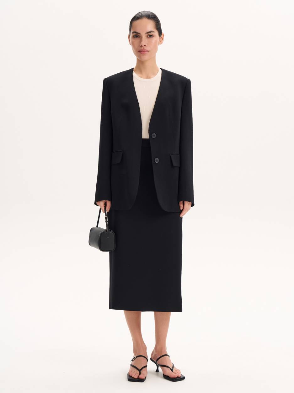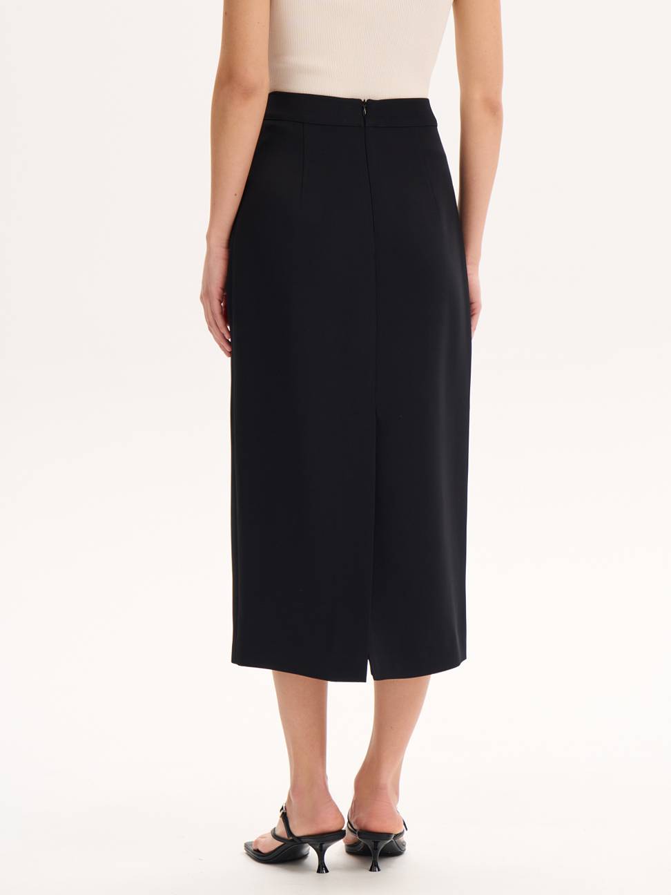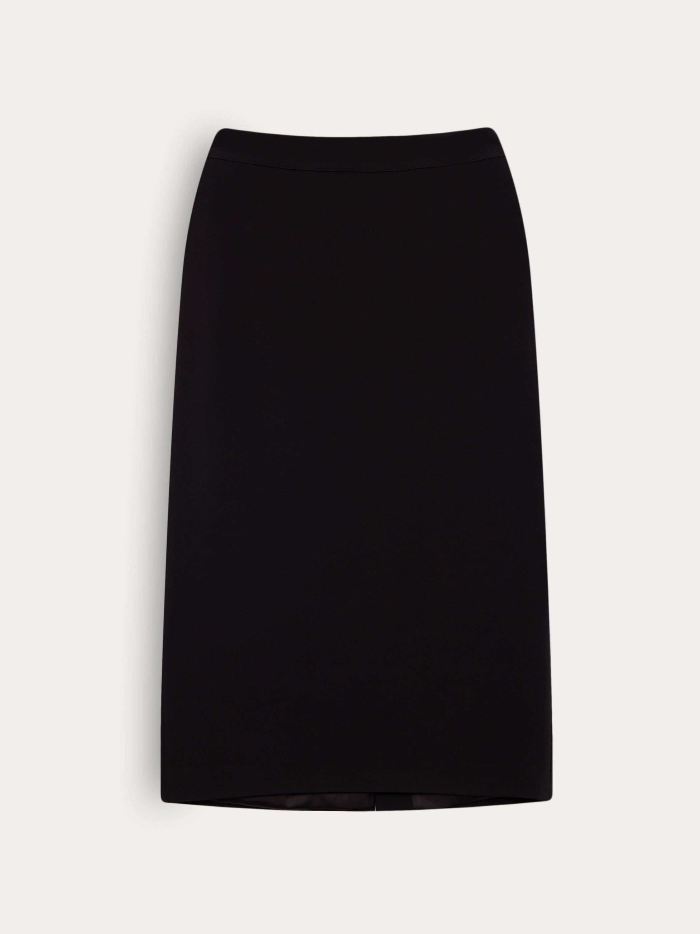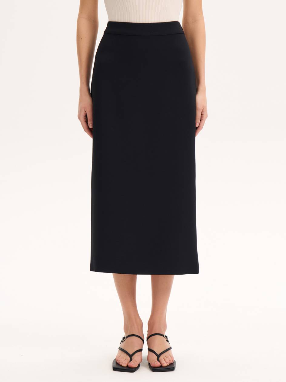 Прямая юбка миди из гладкой струящейся ткани с матовой поверхностью и плотной, но пластичной структурой. Посадка точно по талии, со скрытой застежкой сзади и разрезом снизу для свободы движений. Материал комфортно прилегает к телу, не стесняет шаг и сохраняет форму в течение дня. Глубокий черный оттенок делает вещь универсальной — она легко вписывается в деловой, вечерний или минималистичный повседневный образ. Сочетается с топами, рубашками, жакетами. Можно носить как частью костюма или как самостоятельный элемент.