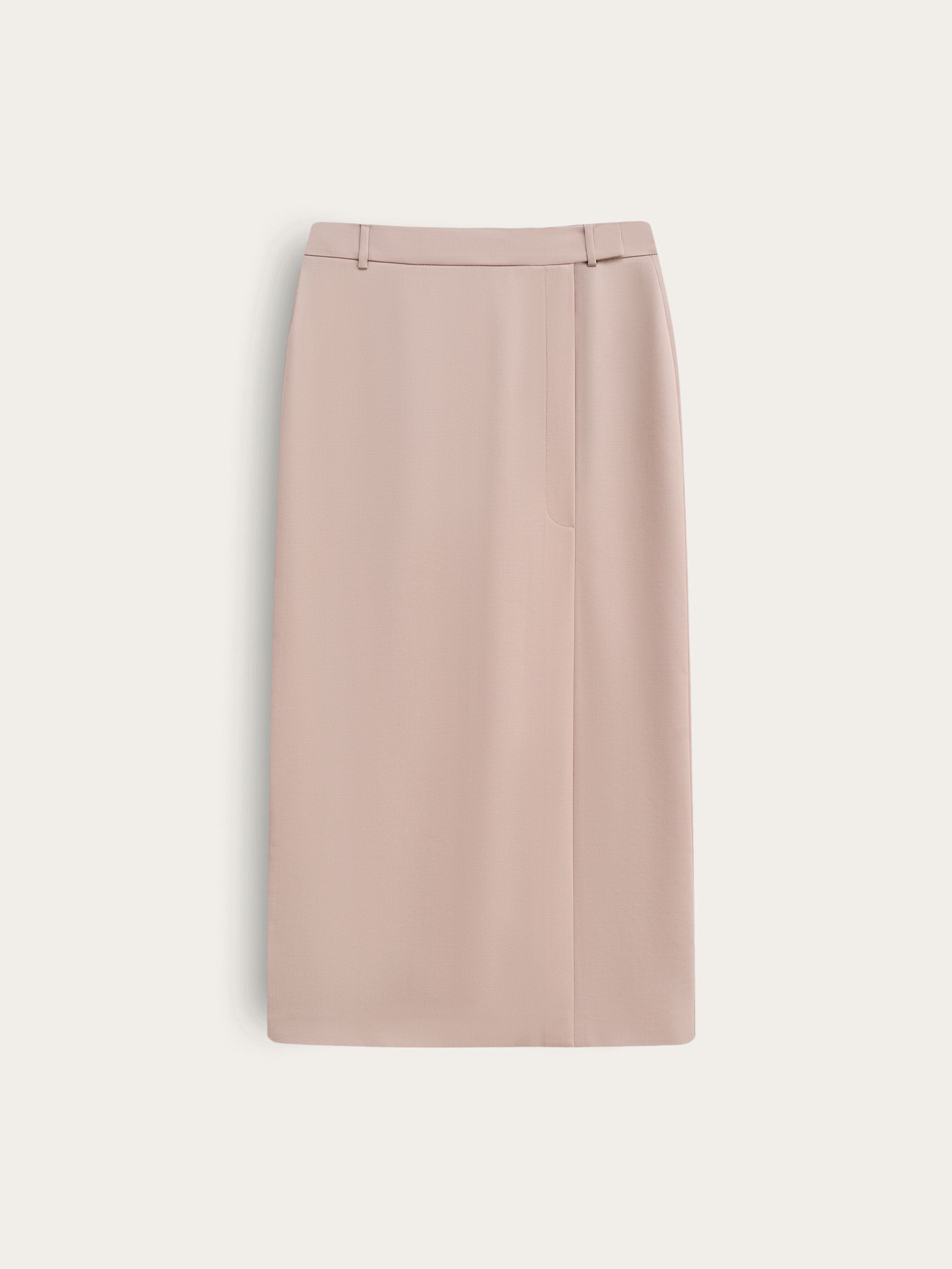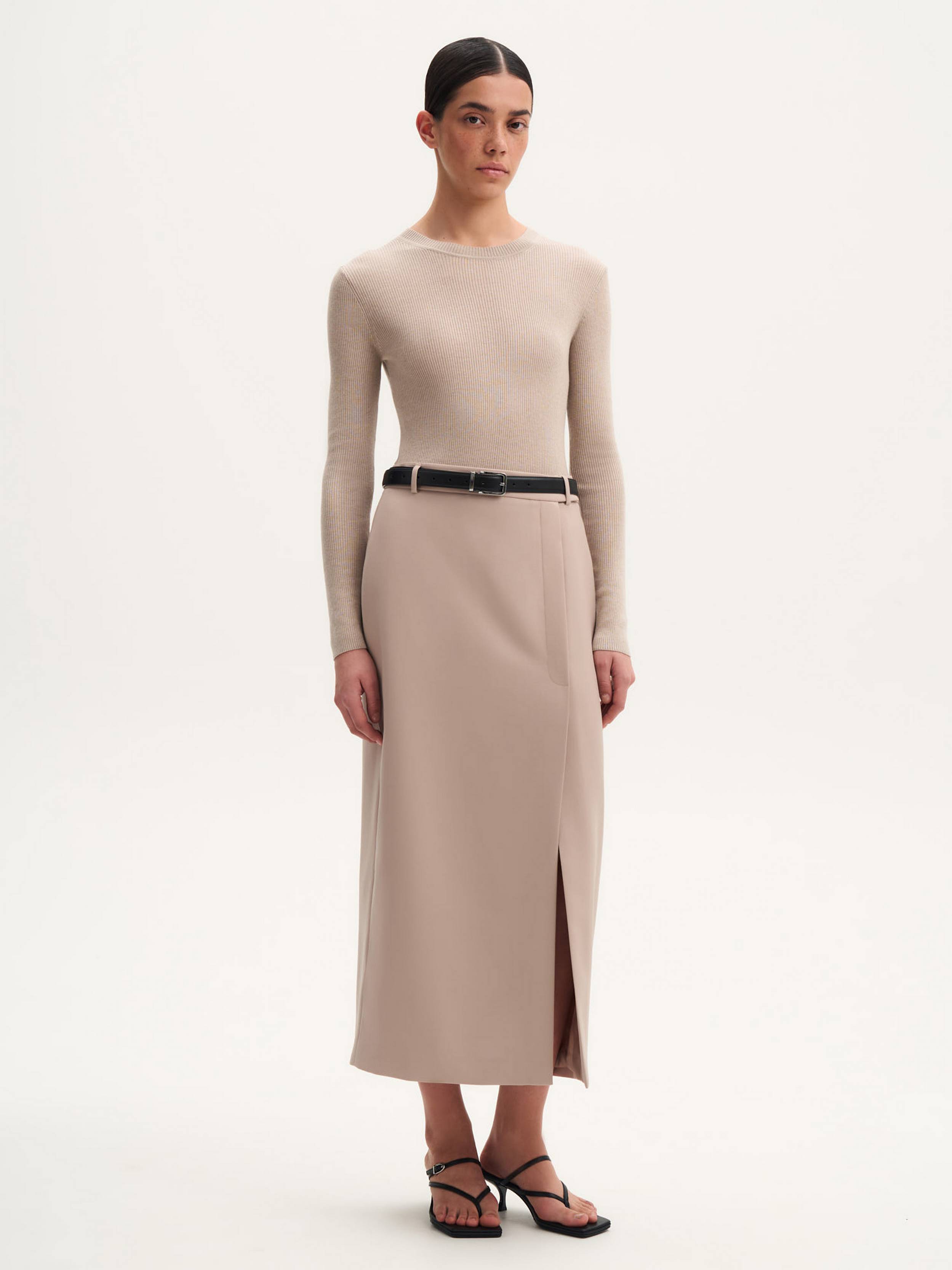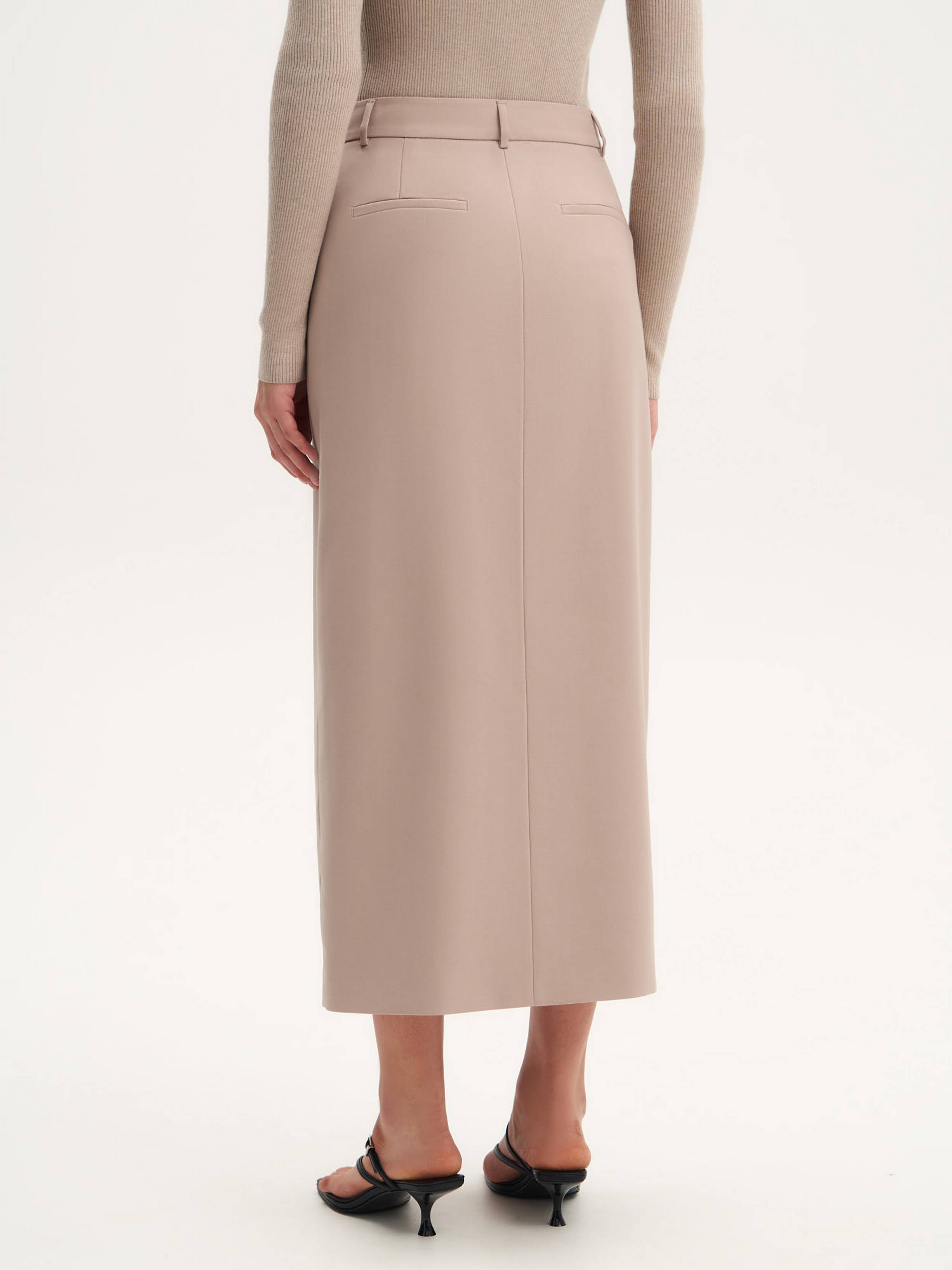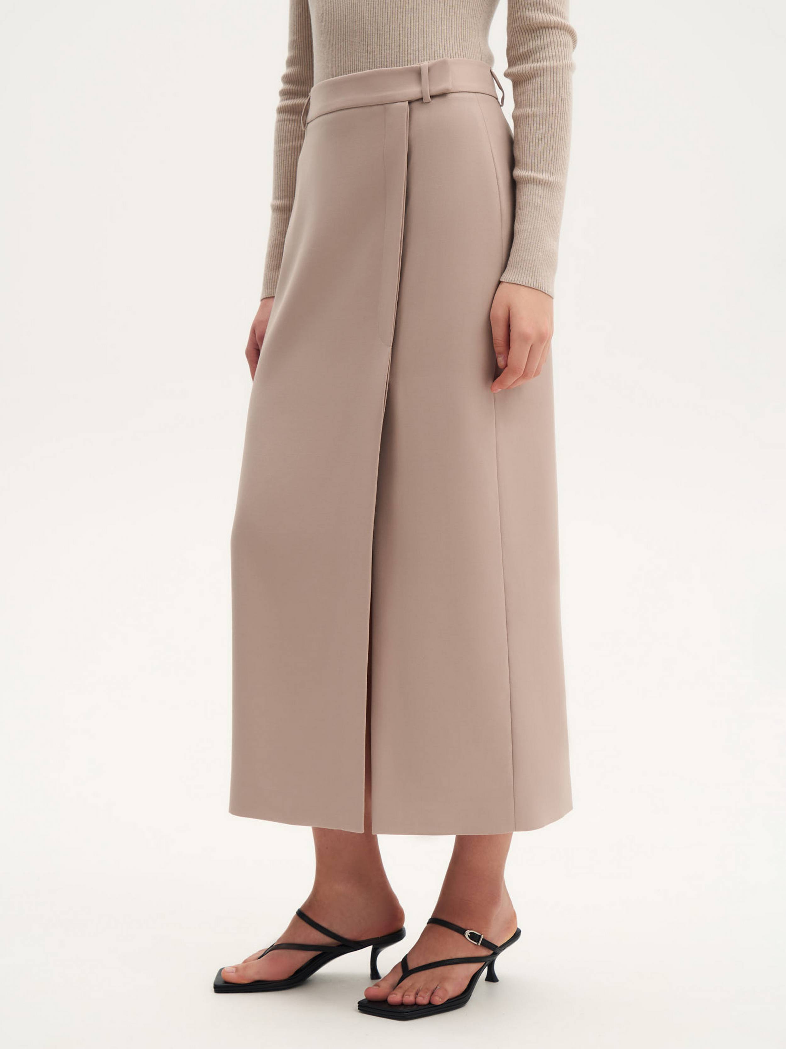 Юбка, в которой строгость линий сочетается с пластикой движения. Прямой удлиненный силуэт подчеркивает вертикаль и визуально вытягивает фигуру, а потайной разрез спереди добавляет свободу шагу и легкость композиции. Модель дополнена поясом со шлевками и лаконичными прорезными карманами сзади, что делает образ цельным и собранным. Ткань с высоким содержанием шерсти хорошо держит форму и комфортна в течение дня. Носите юбку с водолазками, рубашками, жакетами или простыми топами — она органично впишется в капсульный гардероб.