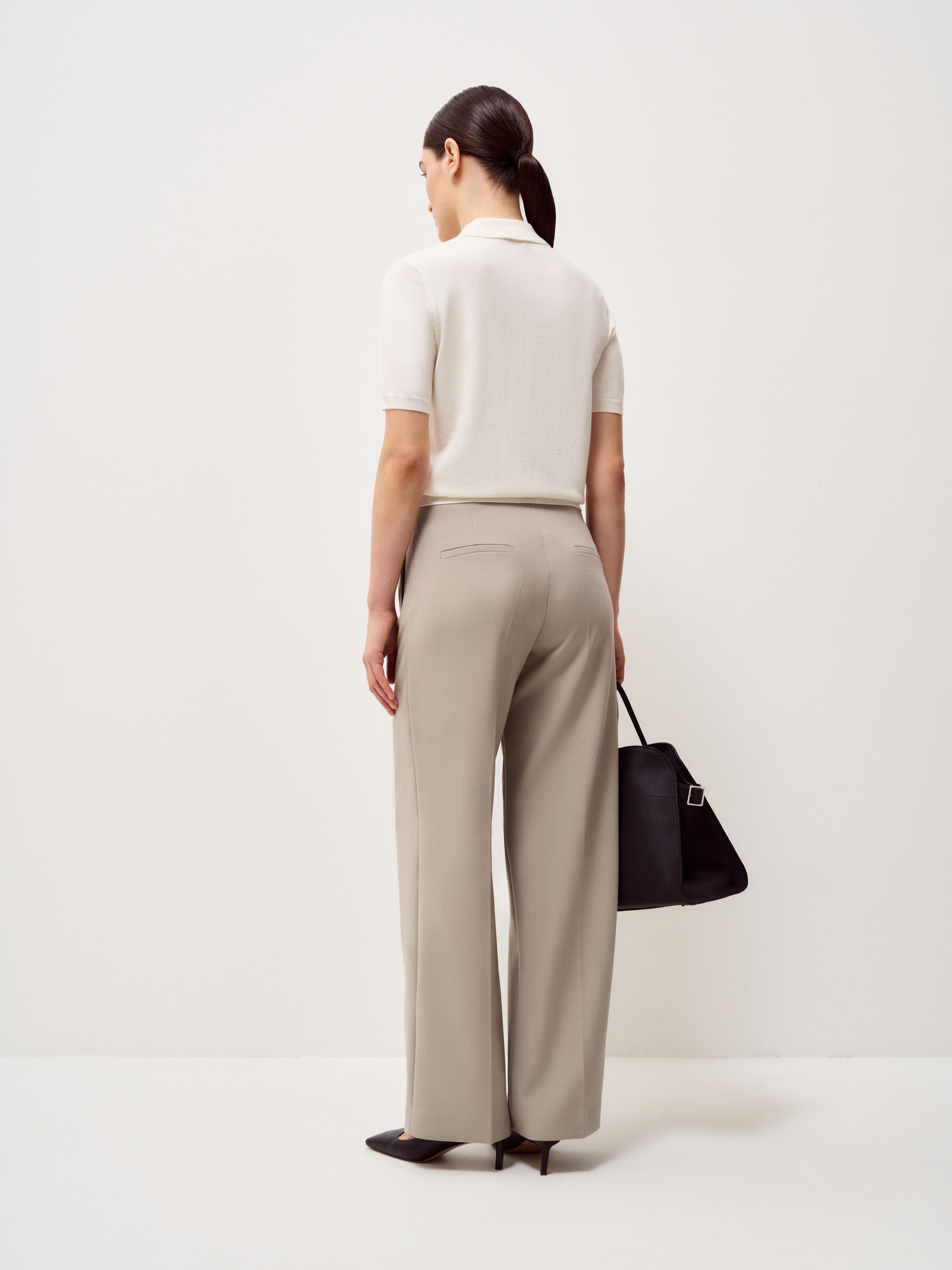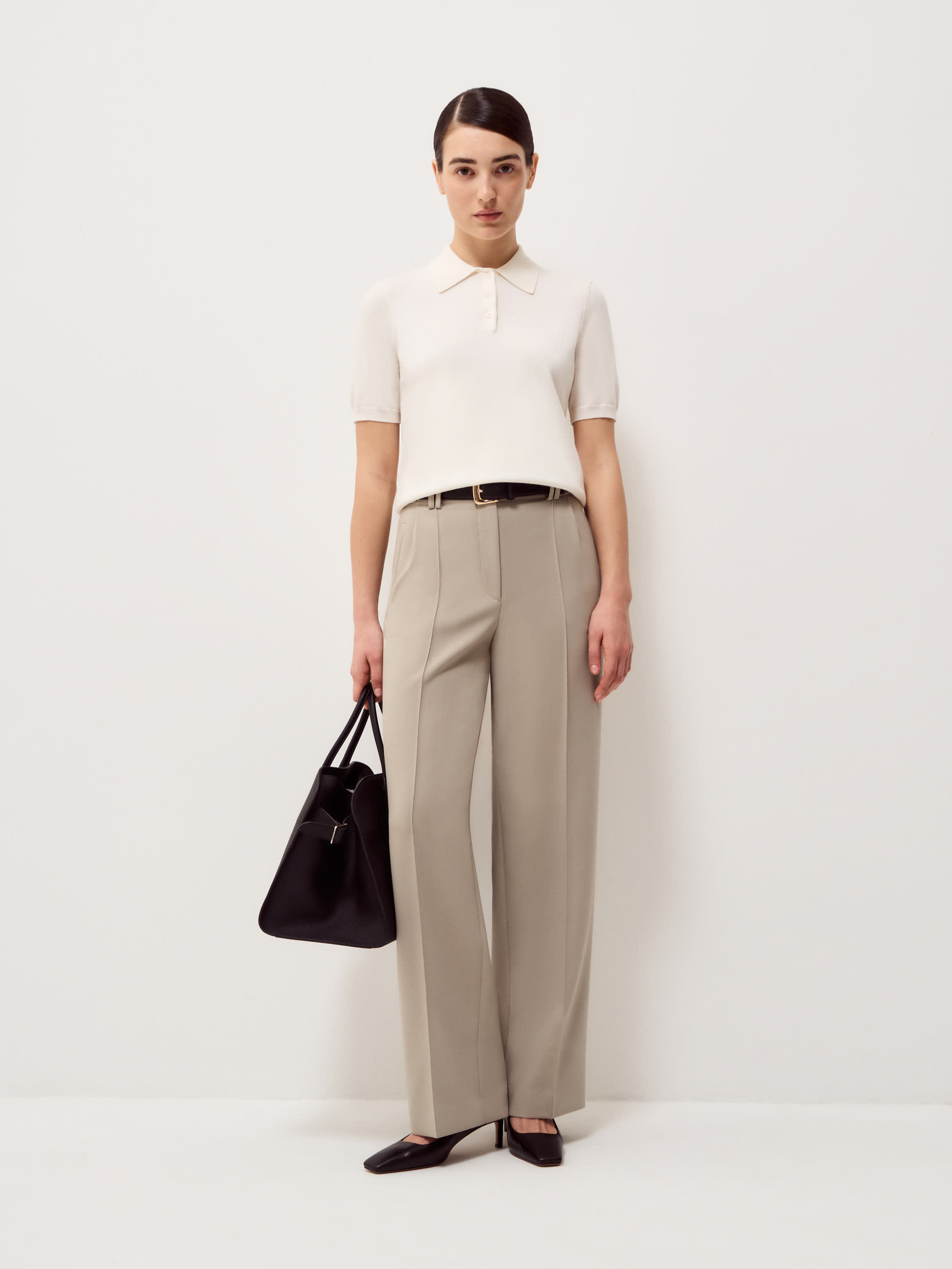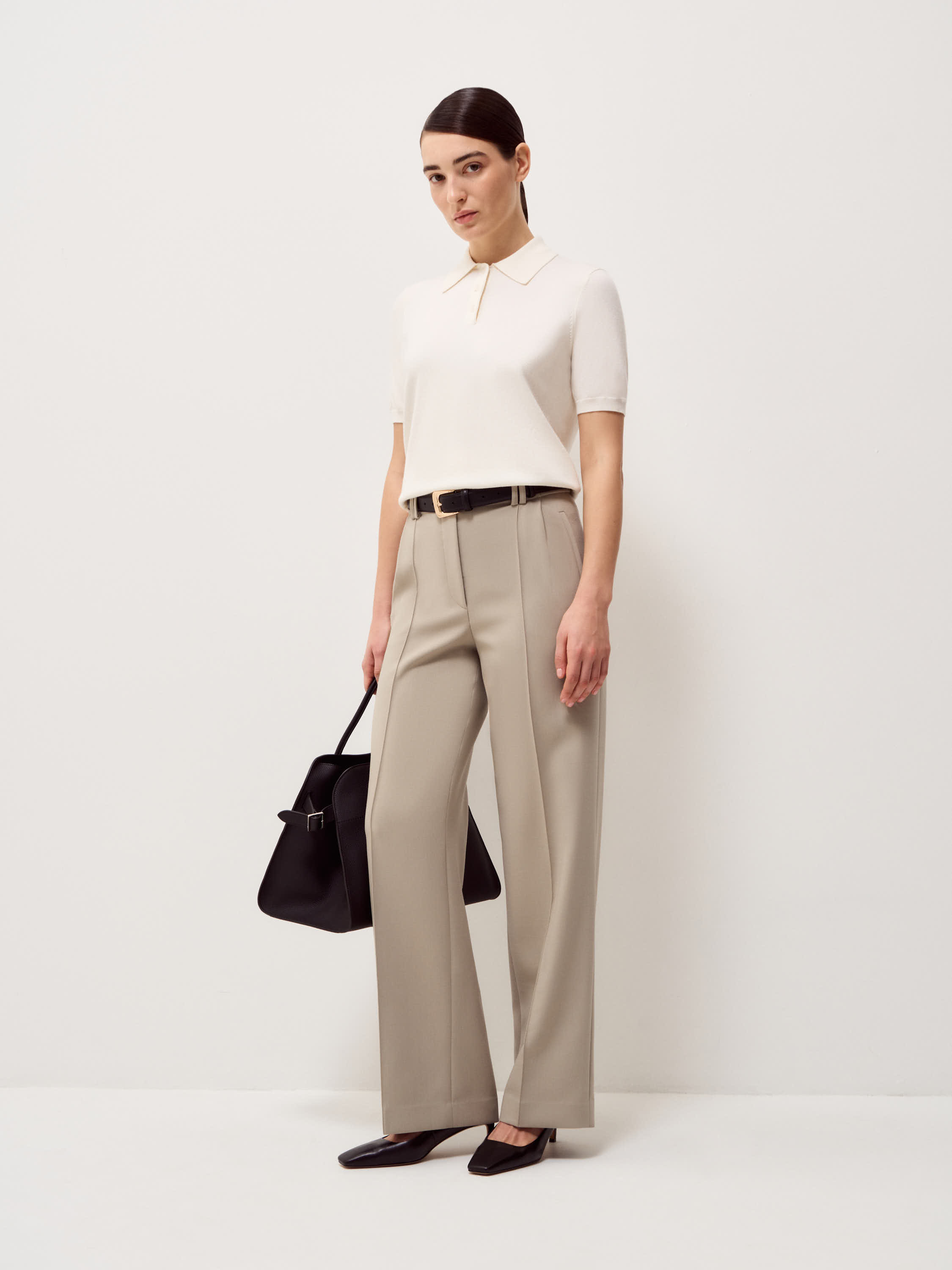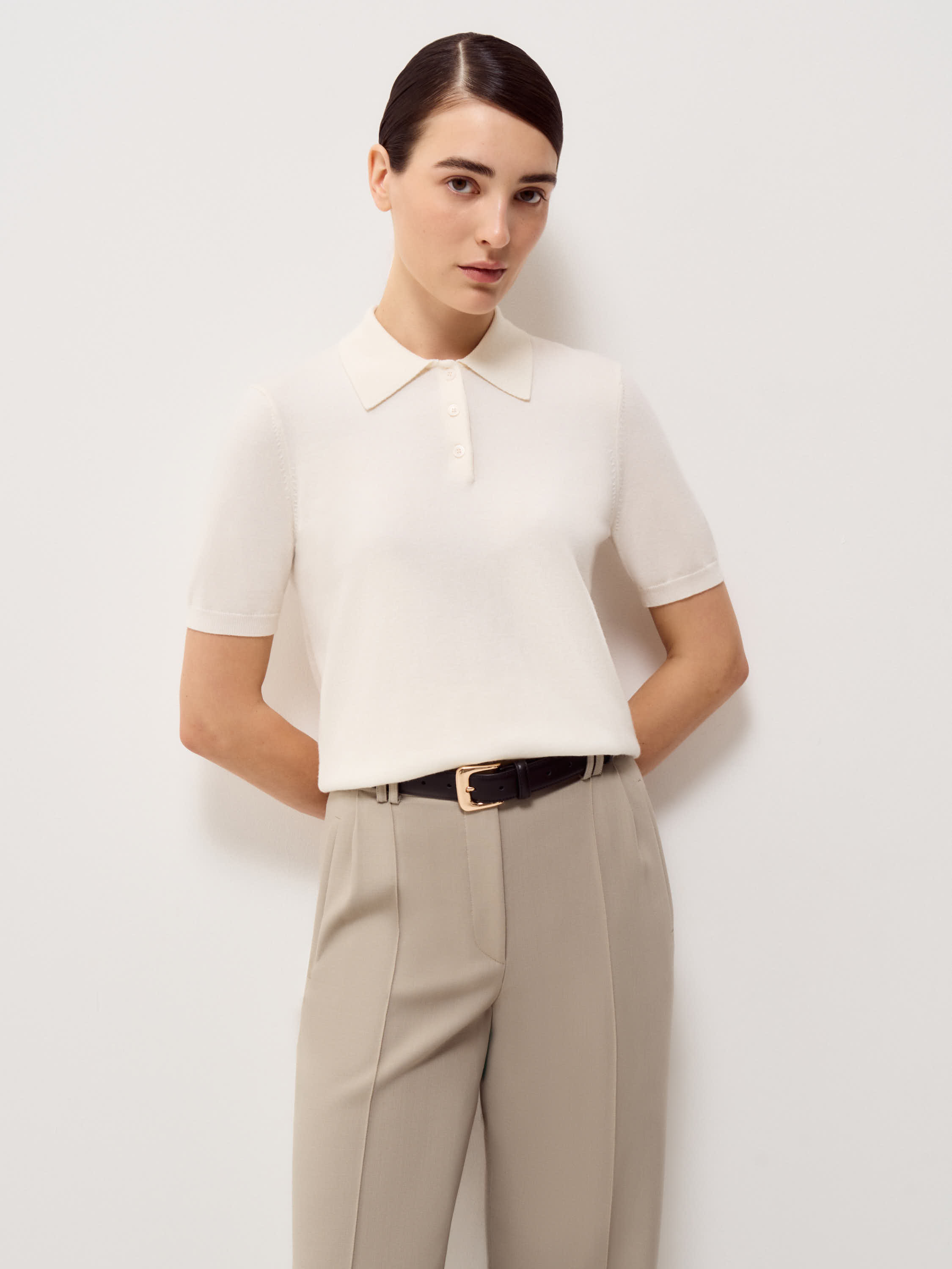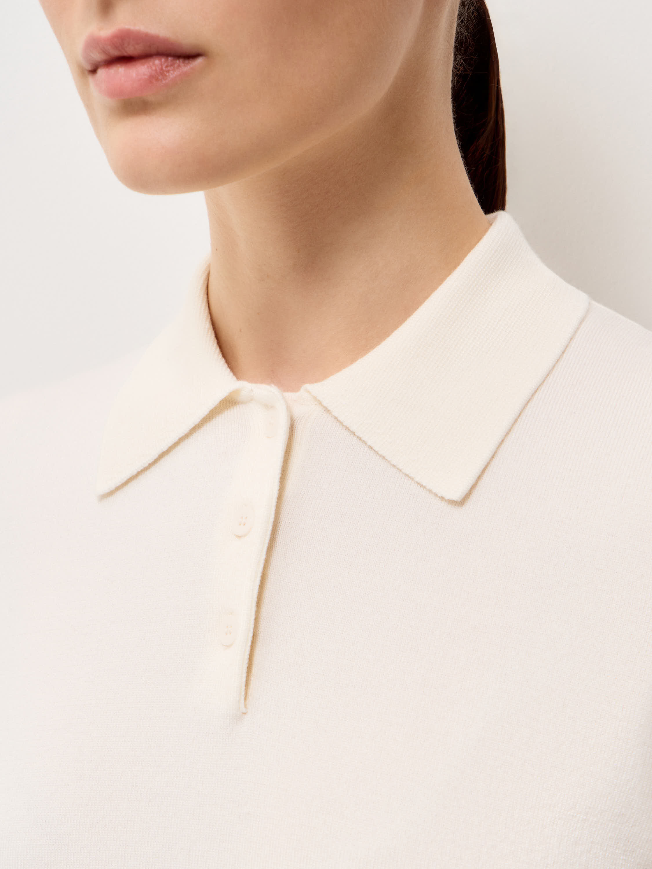 Трикотажное поло из шерсти мериноса сочетает элегантный минимализм с утонченным дизайном. Мягкая текстура натуральной шерсти дарит тепло и комфорт в прохладную погоду, а продуманный крой обеспечивает свободу движений. Отложной воротник с аккуратной застежкой на пуговицах добавляет модели изысканности. Поло органично смотрится в ансамблях с классическими брюками, юбками или джинсами, позволяя создавать стильные и современные образы для любого случая.
