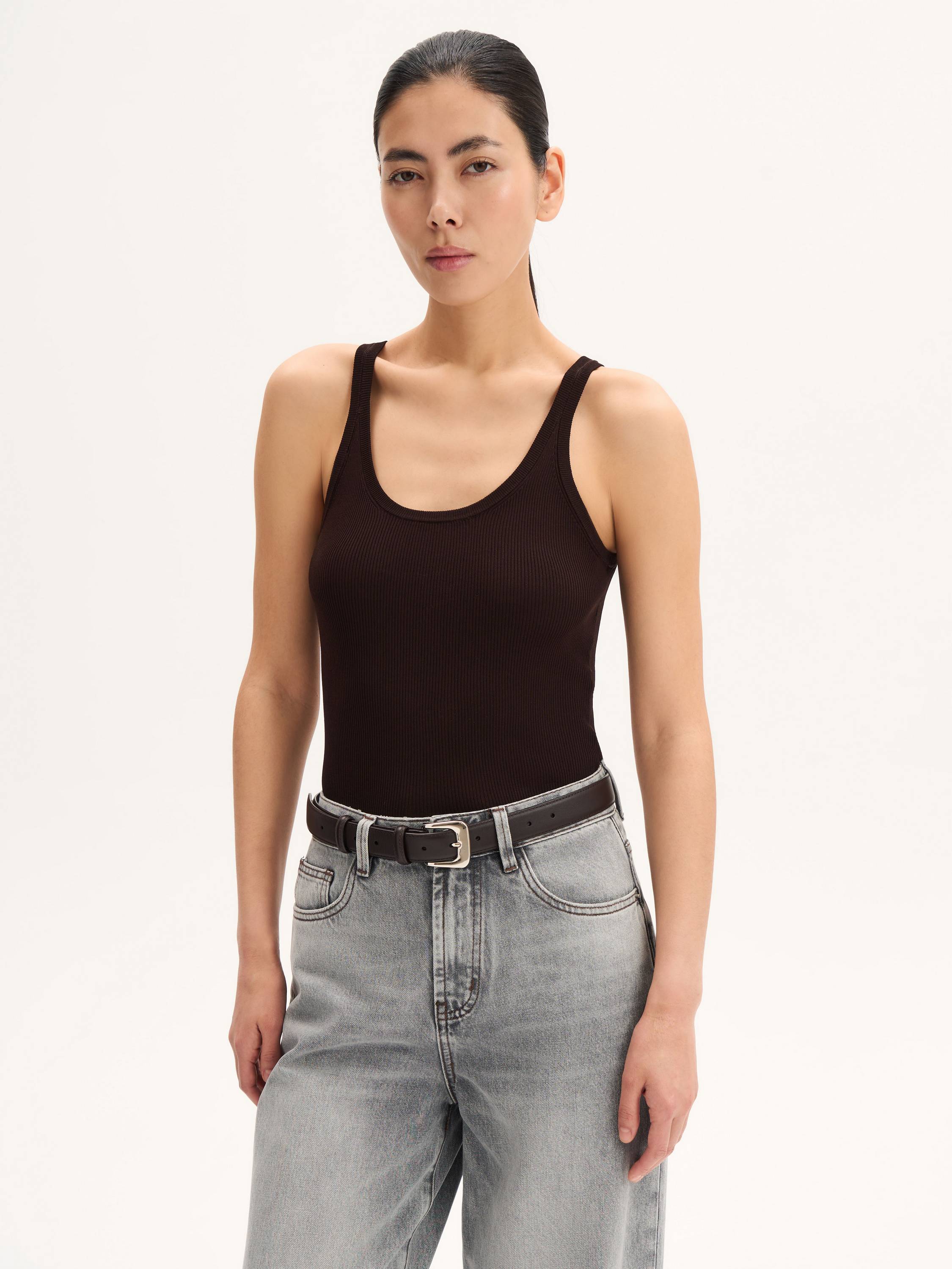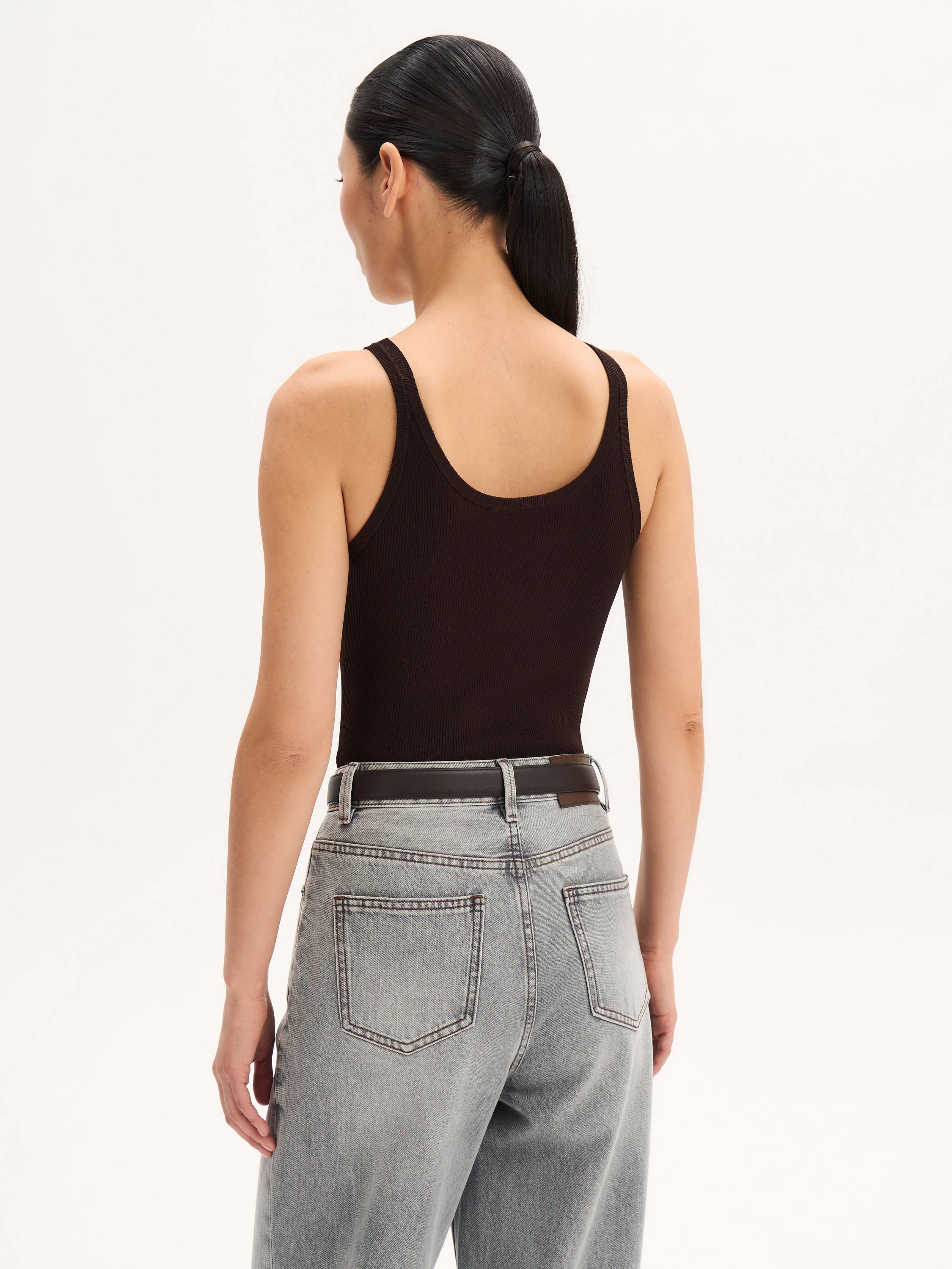 Минималистичный топ в рубчик — базовая модель с премиальной фактурой. Полотно с высоким содержанием шелка мягко прилегает к телу, дарит деликатный блеск и приятные тактильные ощущения. Эластичная структура материала обеспечивает комфортную посадку и сохраняет форму в течение дня. Глубокий округлый вырез подчеркивает линию декольте, а лаконичный крой делает этот топ универсальным элементом летнего гардероба. Носите его как самостоятельную вещь или в многослойных образах — с жакетами, рубашками и кардиганами.