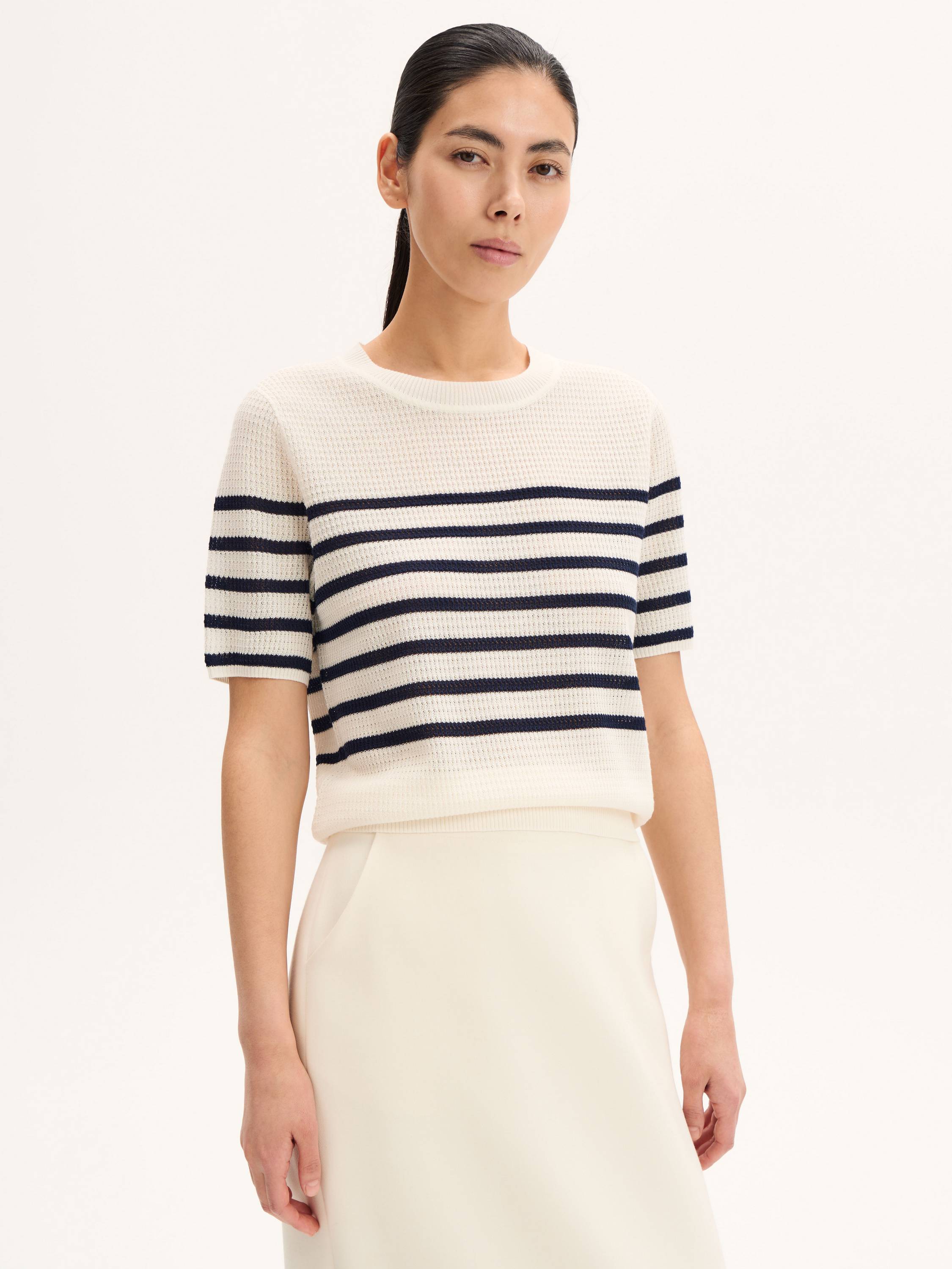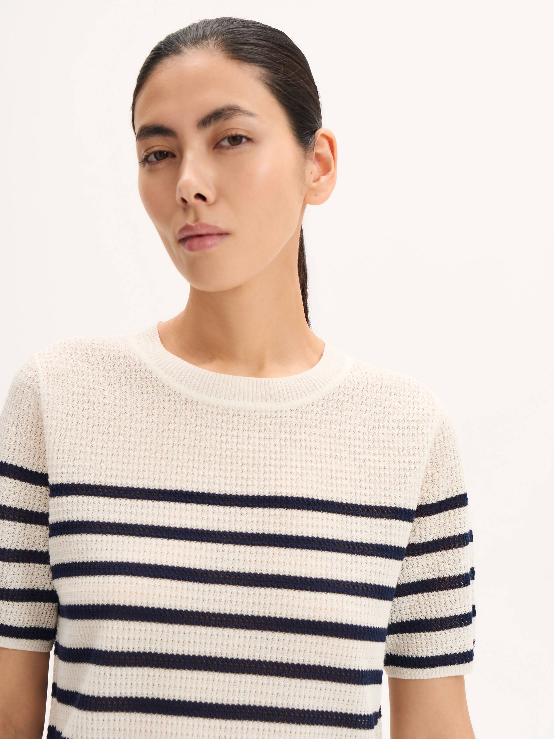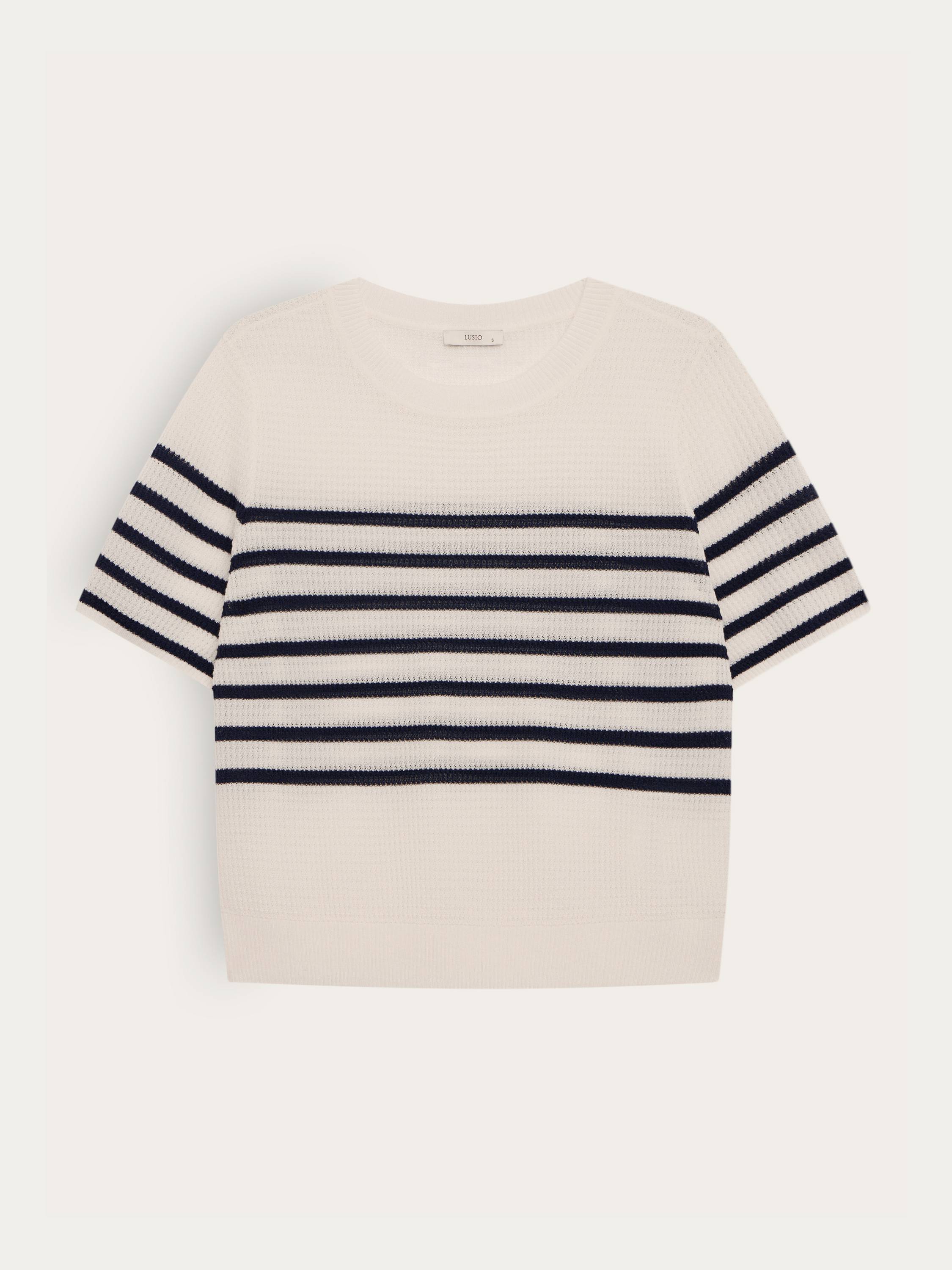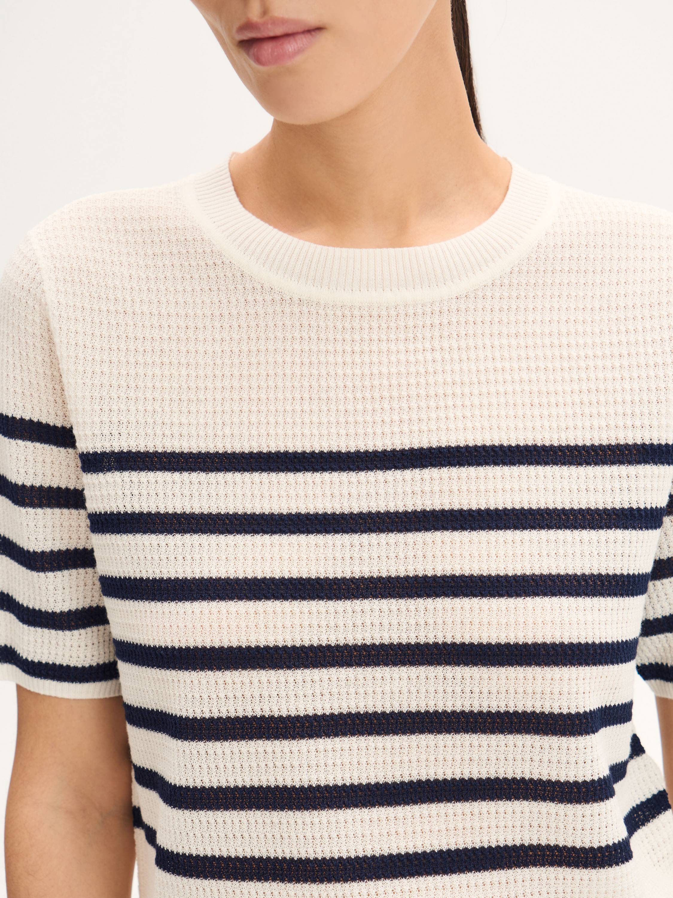 Трикотажный топ с короткими рукавами и круглыми вырезом — идеальный базовый элемент для летнего гардероба. Мягкий, но плотный материал с добавлением льна и тенсела дарит ощущение свежести и комфорта даже в самые жаркие дни. Лаконичные горизонтальные полосы создают спокойную ритмичность, а слегка приталенный силуэт и аккуратные края подчеркивают естественную женственность без лишних деталей. Такой топ легко сочетается с брюками, юбками или джинсами, вписываясь как в деловой, так и в повседневный стиль.