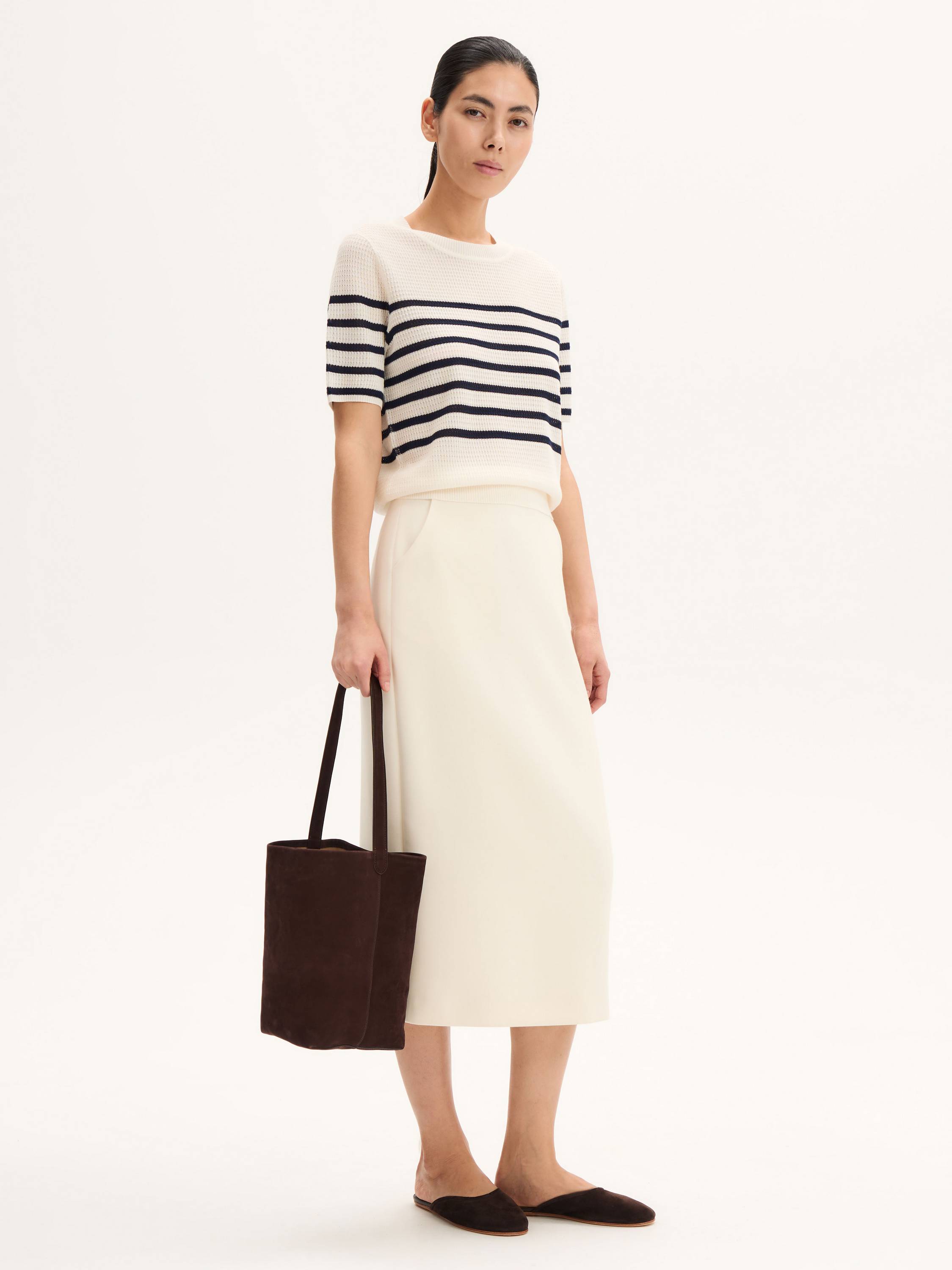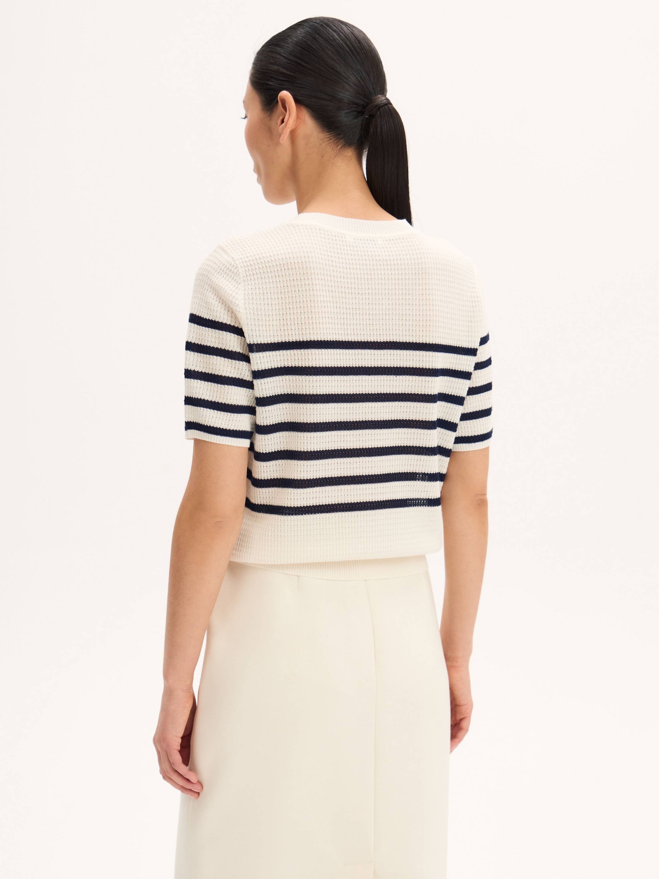 Трикотажный топ с короткими рукавами и круглыми вырезом — идеальный базовый элемент для летнего гардероба. Мягкий, но плотный материал с добавлением льна и тенсела дарит ощущение свежести и комфорта даже в самые жаркие дни. Лаконичные горизонтальные полосы создают спокойную ритмичность, а слегка приталенный силуэт и аккуратные края подчеркивают естественную женственность без лишних деталей. Такой топ легко сочетается с брюками, юбками или джинсами, вписываясь как в деловой, так и в повседневный стиль.