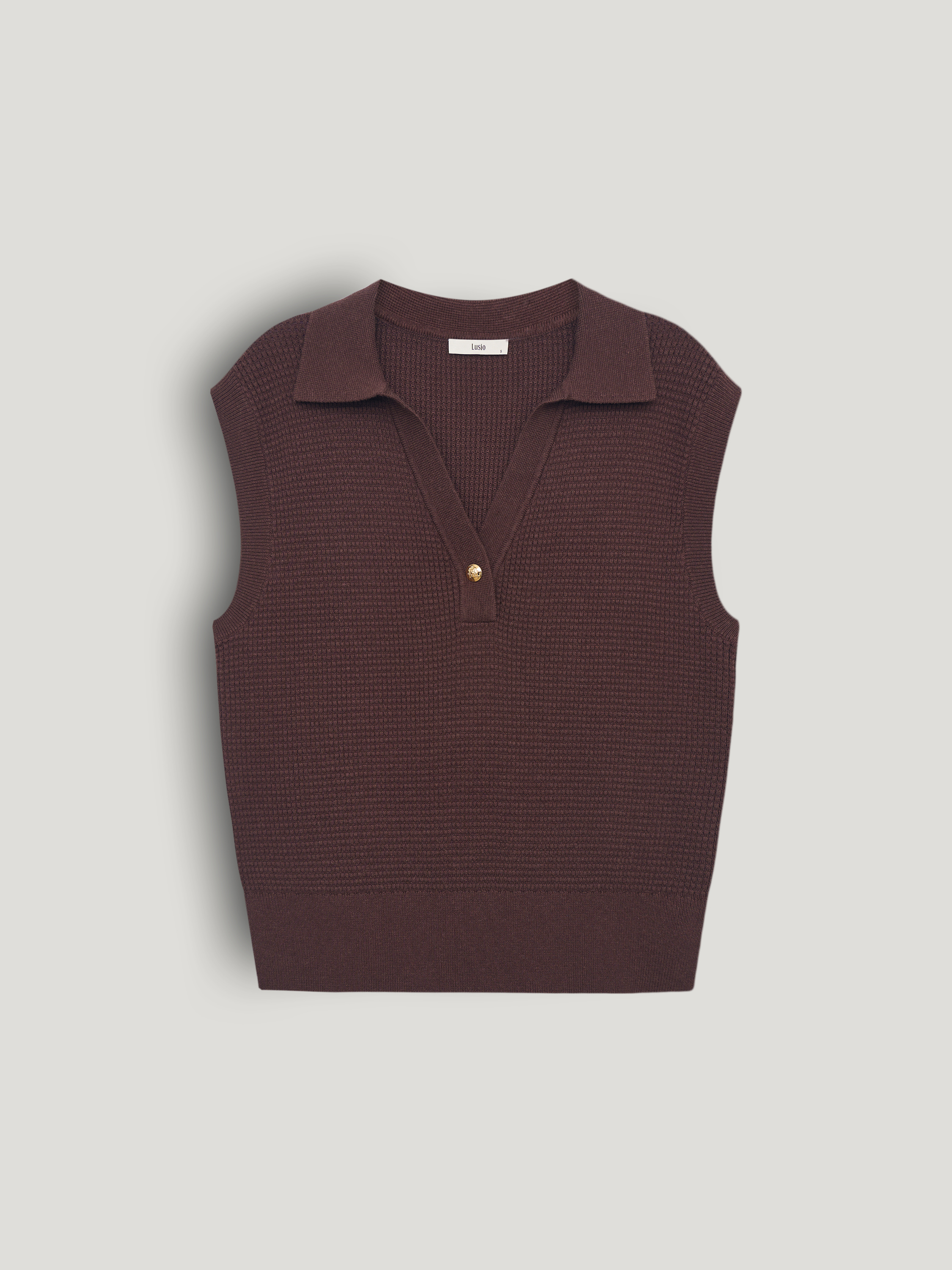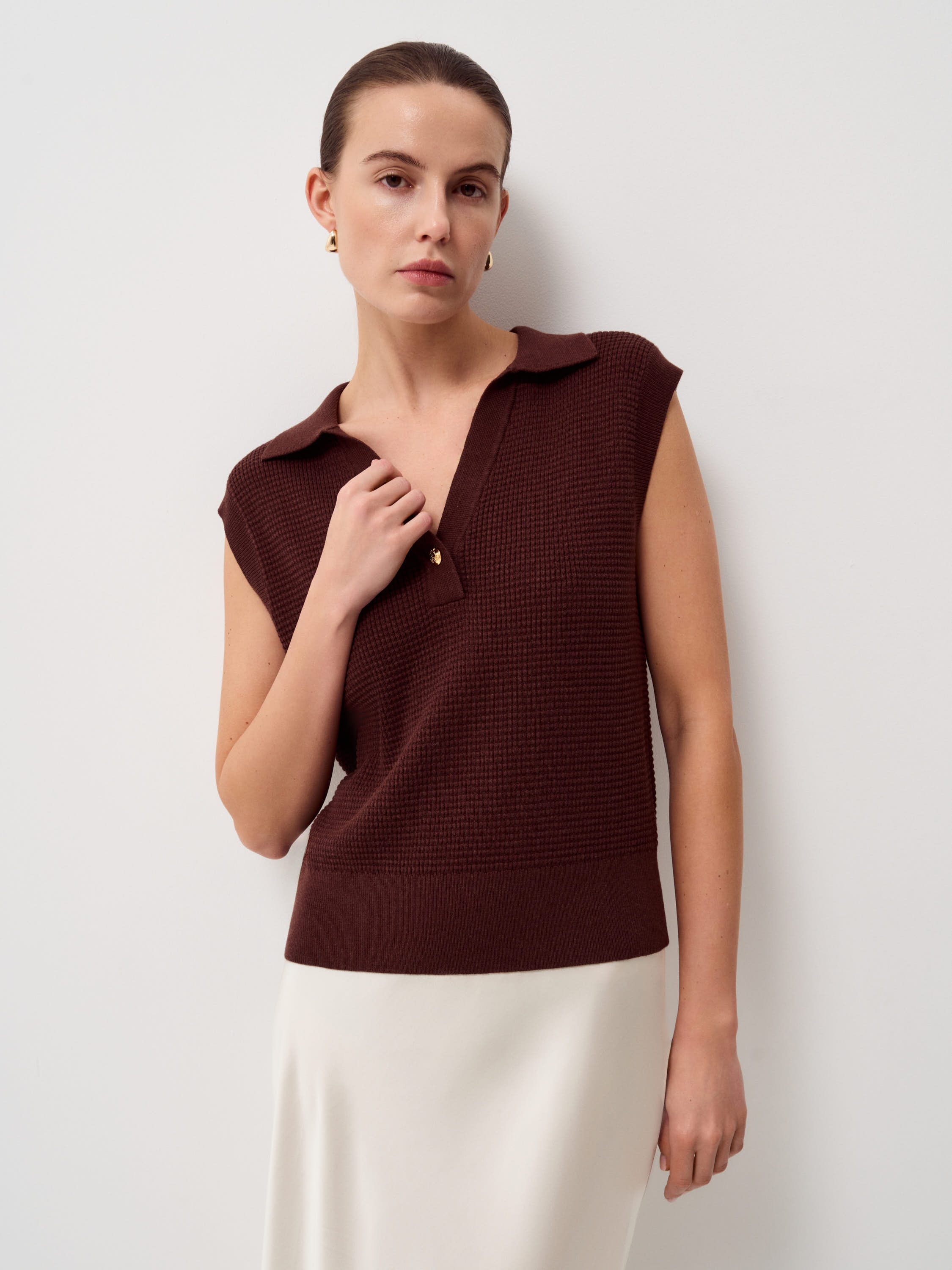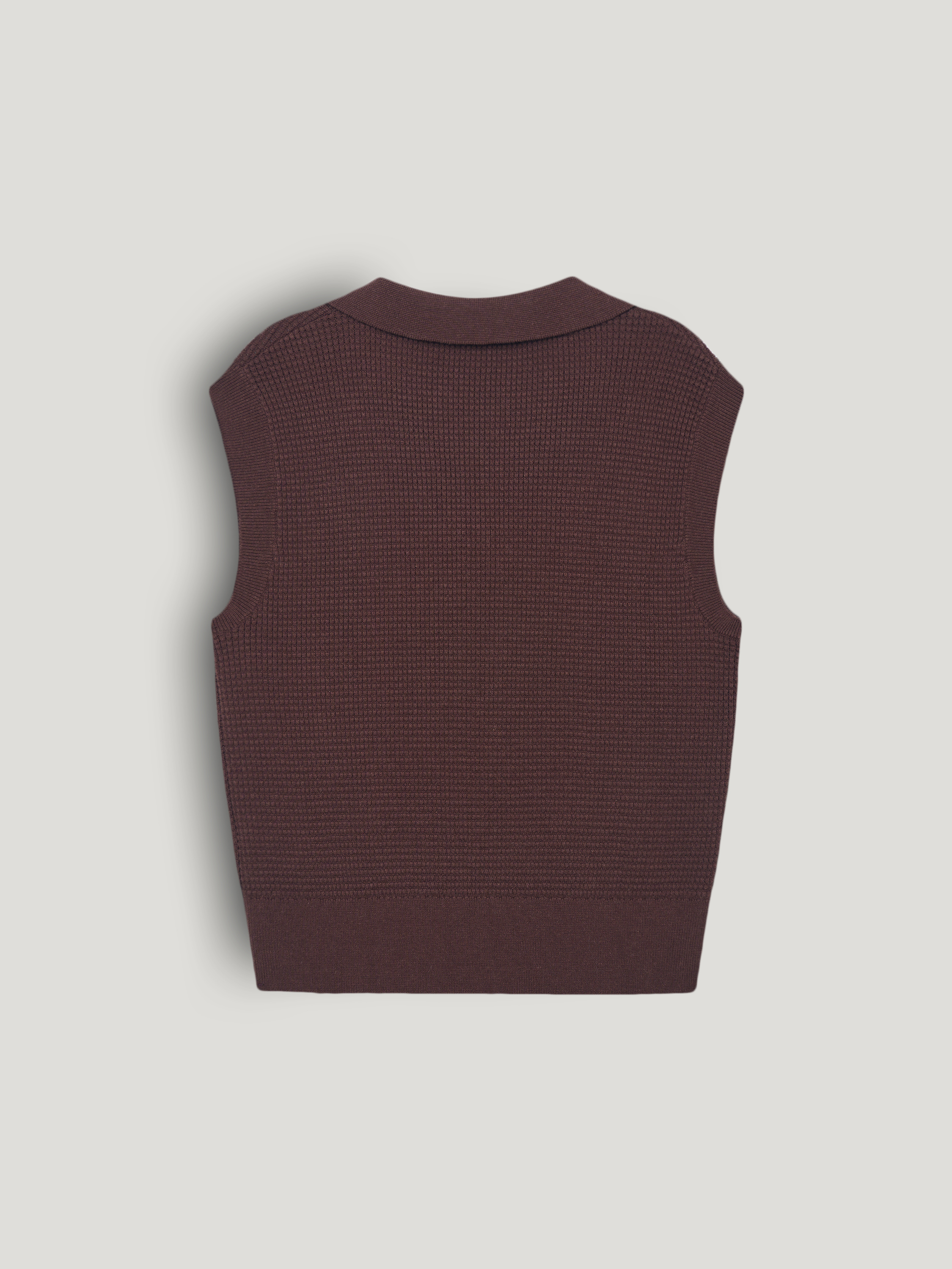 Эта жилетка — классика в современной интерпретации. Отложной воротник с декоративной пуговицей добавляет образу утонченности, а мягкий хлопковый трикотаж обеспечивает комфорт в течение дня. Прямой крой создает чистый силуэт, который легко вписывается в многослойные комплекты. Жилетка универсальна: ее можно носить самостоятельно или сочетать с рубашками и водолазками, создавая стильные повседневные и офисные образы.