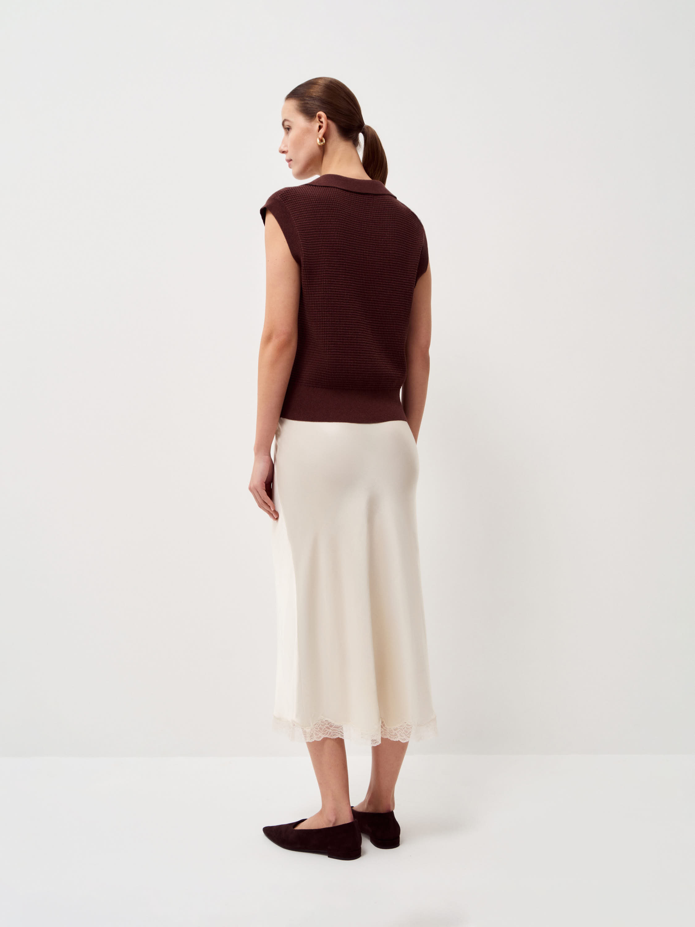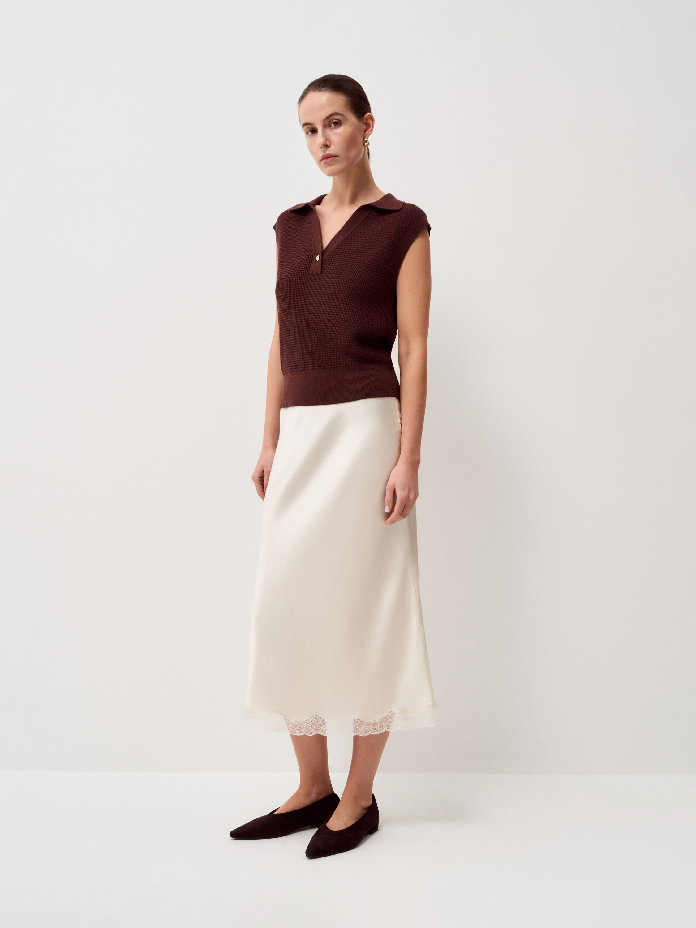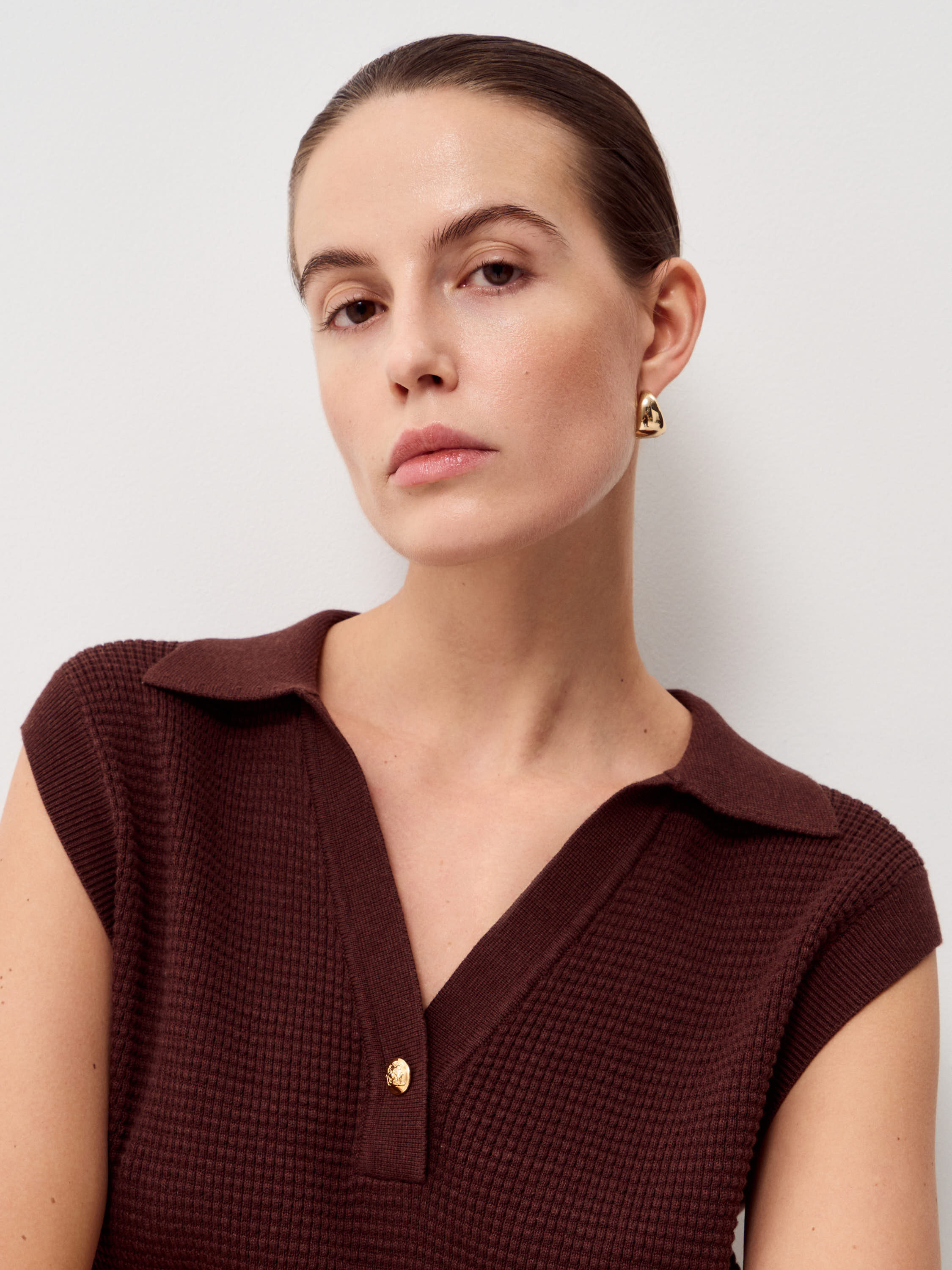 Эта жилетка — классика в современной интерпретации. Отложной воротник с декоративной пуговицей добавляет образу утонченности, а мягкий хлопковый трикотаж обеспечивает комфорт в течение дня. Прямой крой создает чистый силуэт, который легко вписывается в многослойные комплекты. Жилетка универсальна: ее можно носить самостоятельно или сочетать с рубашками и водолазками, создавая стильные повседневные и офисные образы.