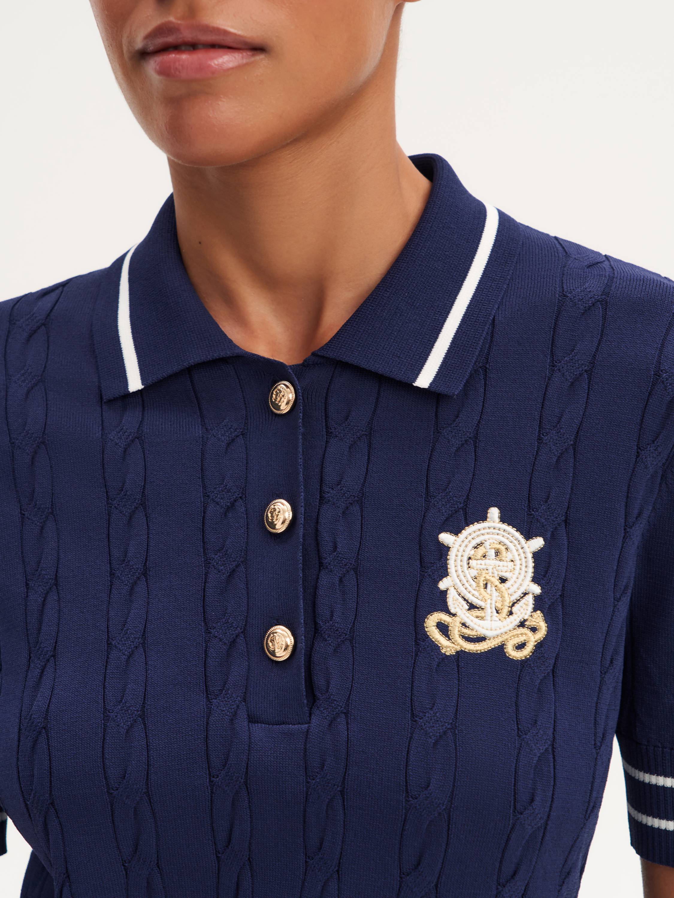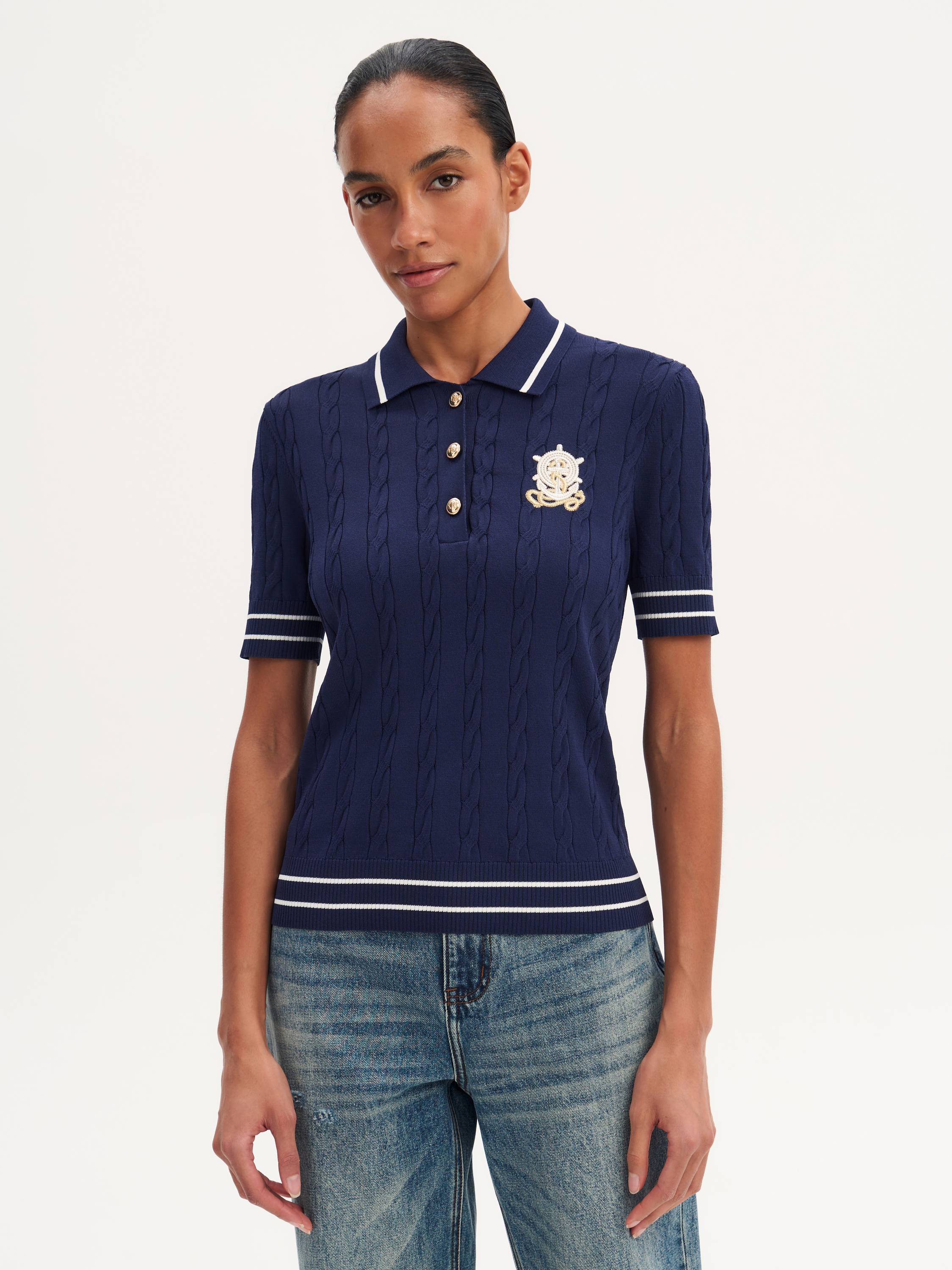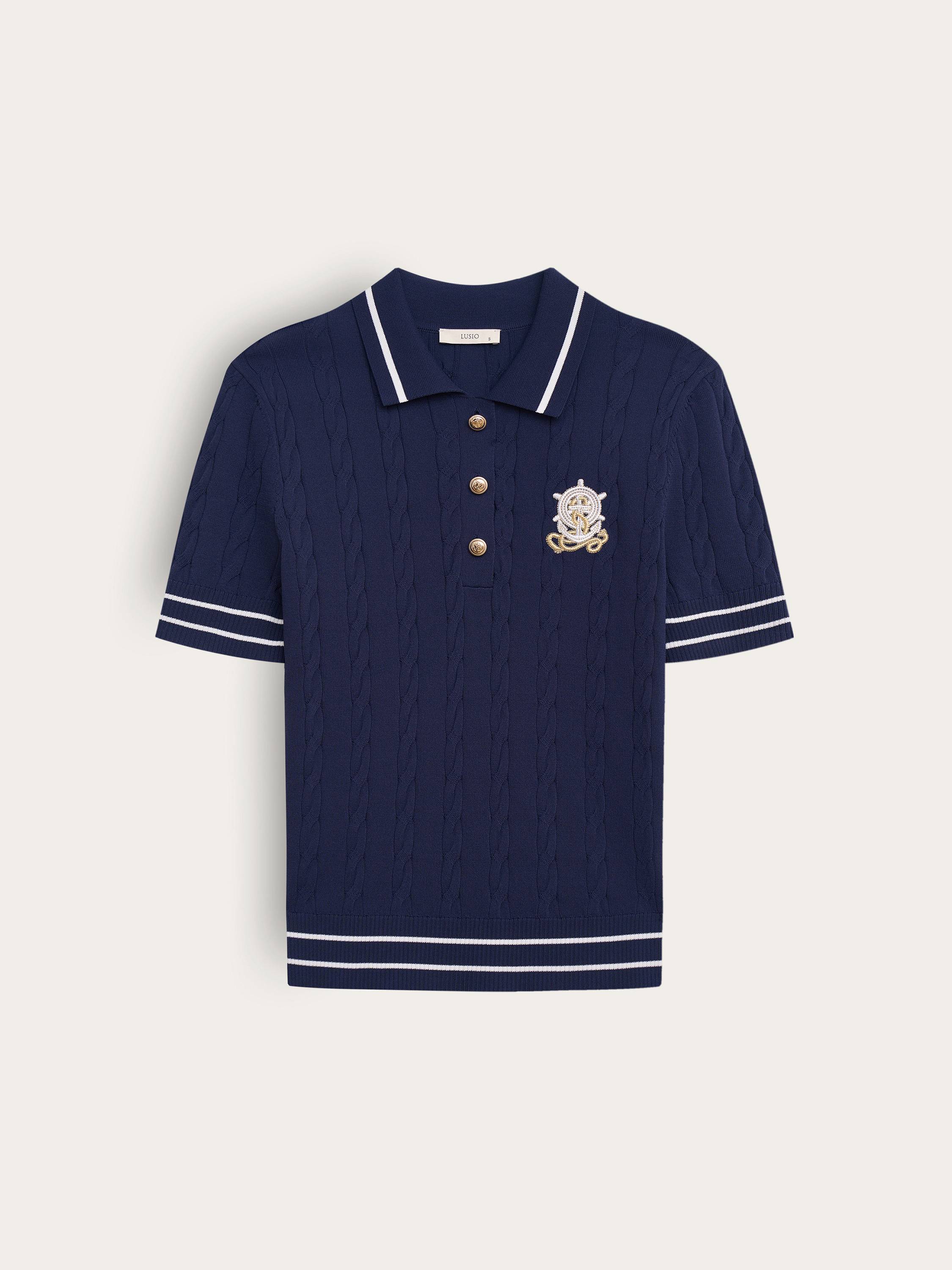 Поло из мягкого трикотажа оформлено классическим вязаным узором «косы». Модель дополнена воротником с контрастной бейкой и планкой на пуговицах, что придает ей спортивную элегантность. На груди — вышитый гербовый шеврон, подчеркивающий характер в стиле преппи. Короткие рукава и аккуратная длина делают поло удобным для повседневных образов: оно гармонично смотрится как с денимом и брюками, так и с юбками, создавая современный вариант casual-классики.