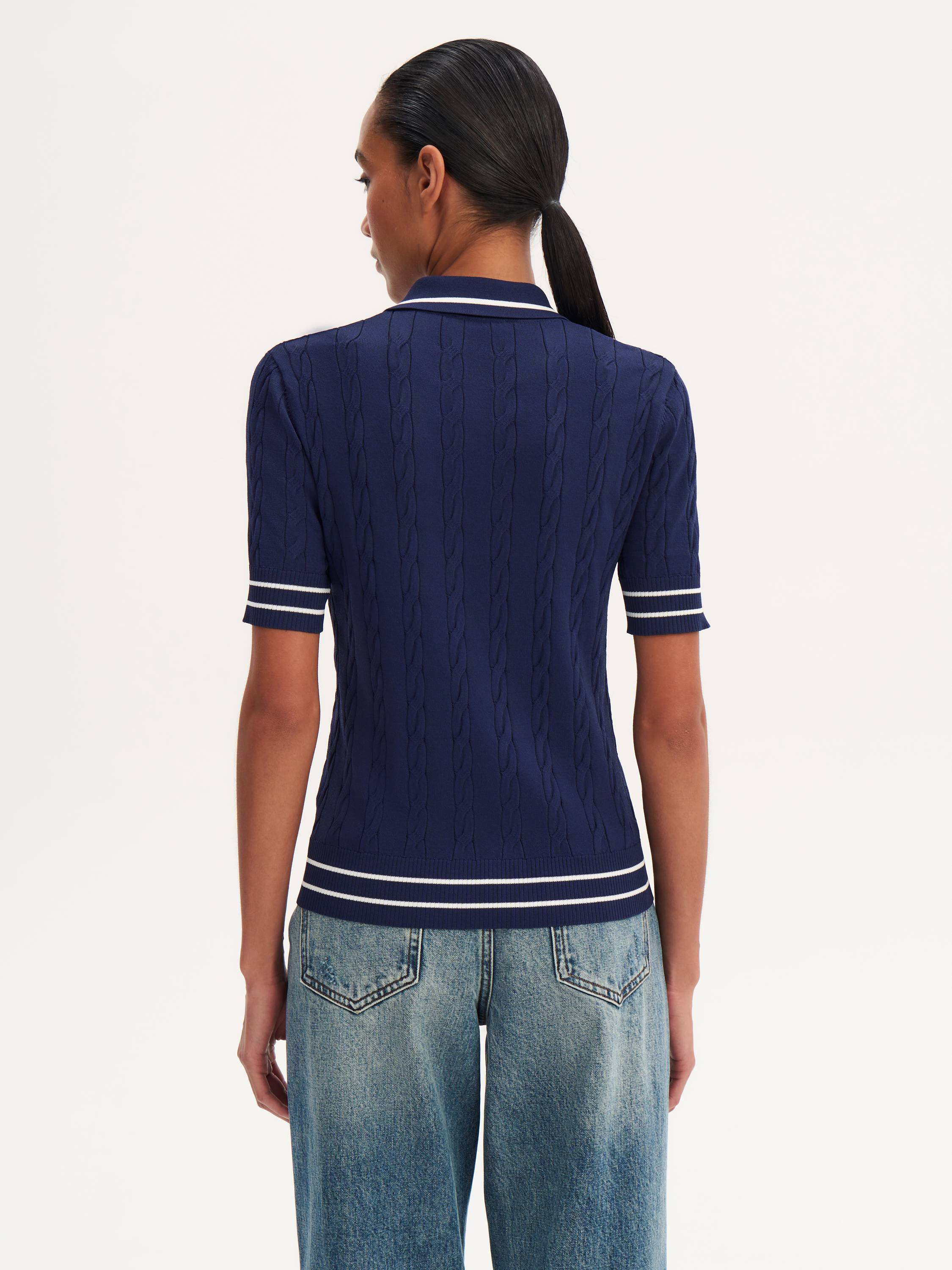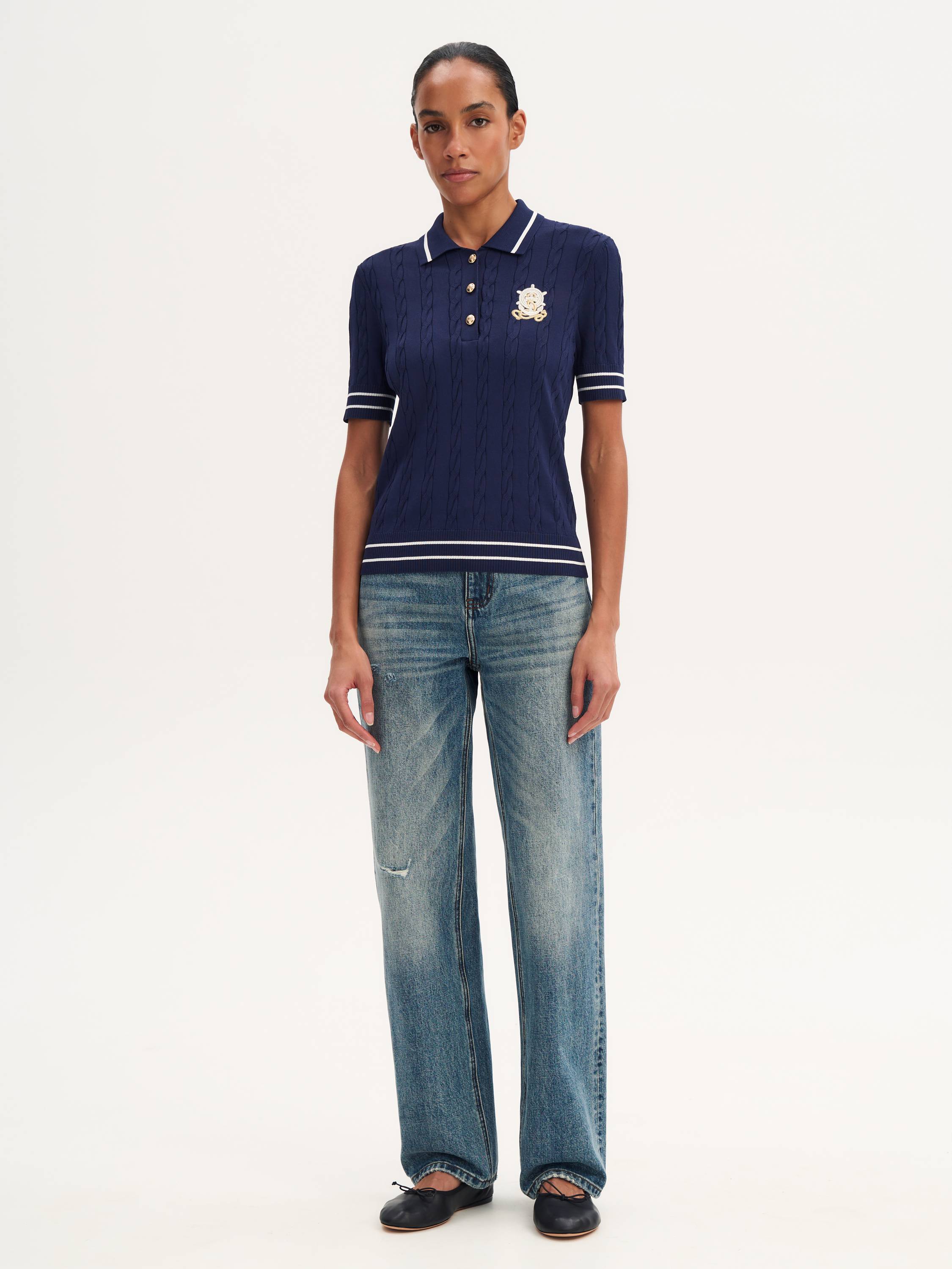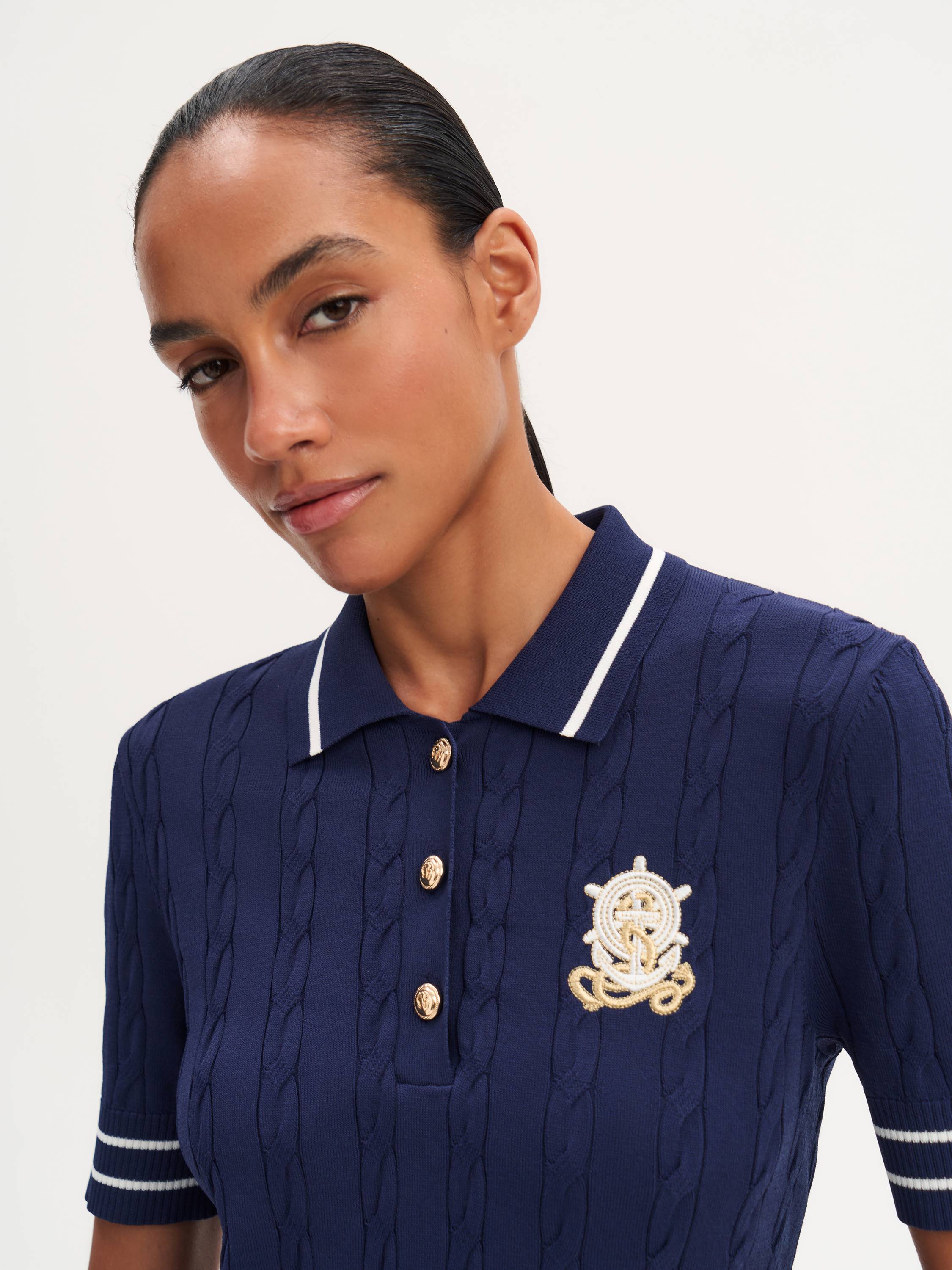 Поло из мягкого трикотажа оформлено классическим вязаным узором «косы». Модель дополнена воротником с контрастной бейкой и планкой на пуговицах, что придает ей спортивную элегантность. На груди — вышитый гербовый шеврон, подчеркивающий характер в стиле преппи. Короткие рукава и аккуратная длина делают поло удобным для повседневных образов: оно гармонично смотрится как с денимом и брюками, так и с юбками, создавая современный вариант casual-классики.