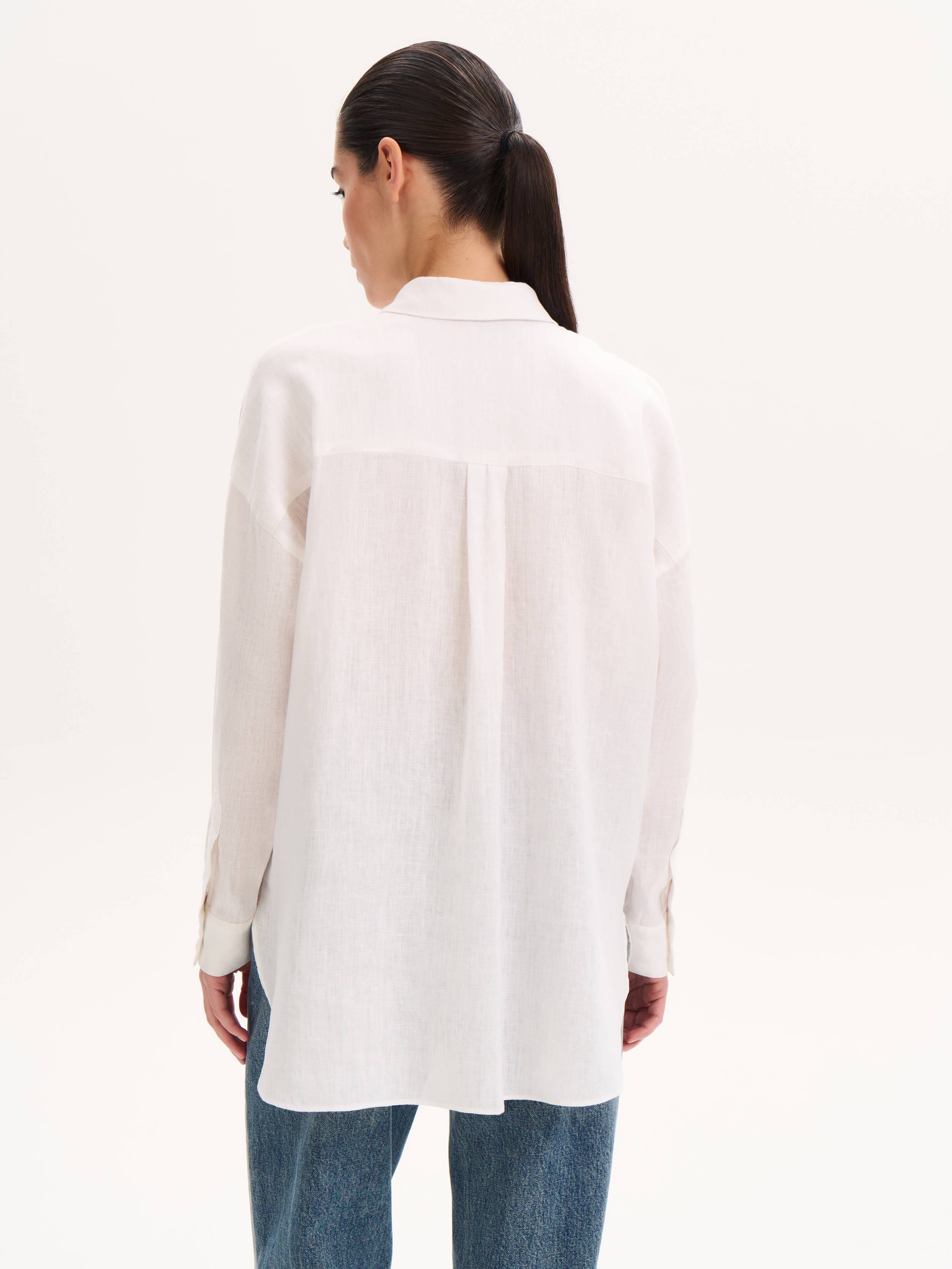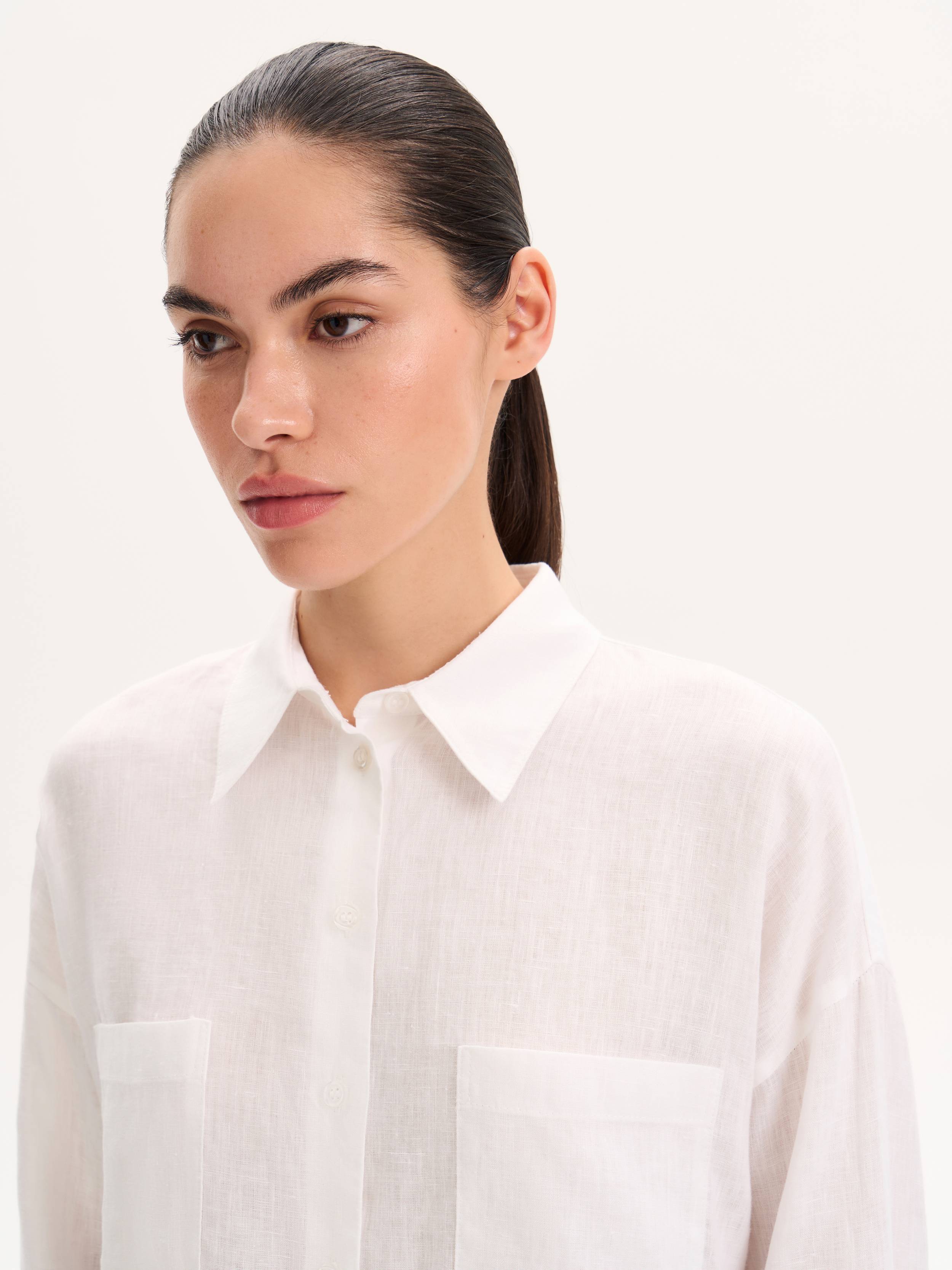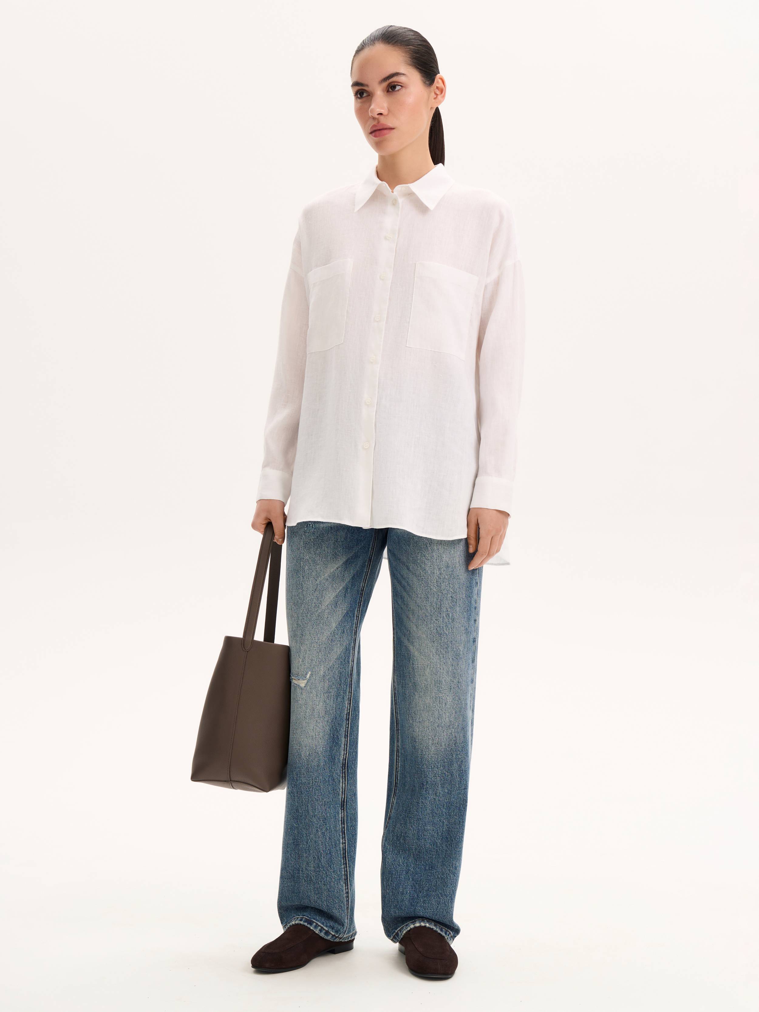 Льняная рубашка свободного силуэта с двумя нагрудными карманами — лаконичная, но выразительная база летнего гардероба. Натуральный лен обеспечивает приятную прохладу в жаркую погоду, позволяя коже дышать, а сдержанный дизайн делает модель универсальной. Классический воротник и ровная планка на пуговицах придают образу собранность, в то время как свободная посадка и удлиненная спинка поддерживают актуальный расслабленный стиль. Носите рубашку навыпуск или заправленной — в зависимости от настроения и сценария.
