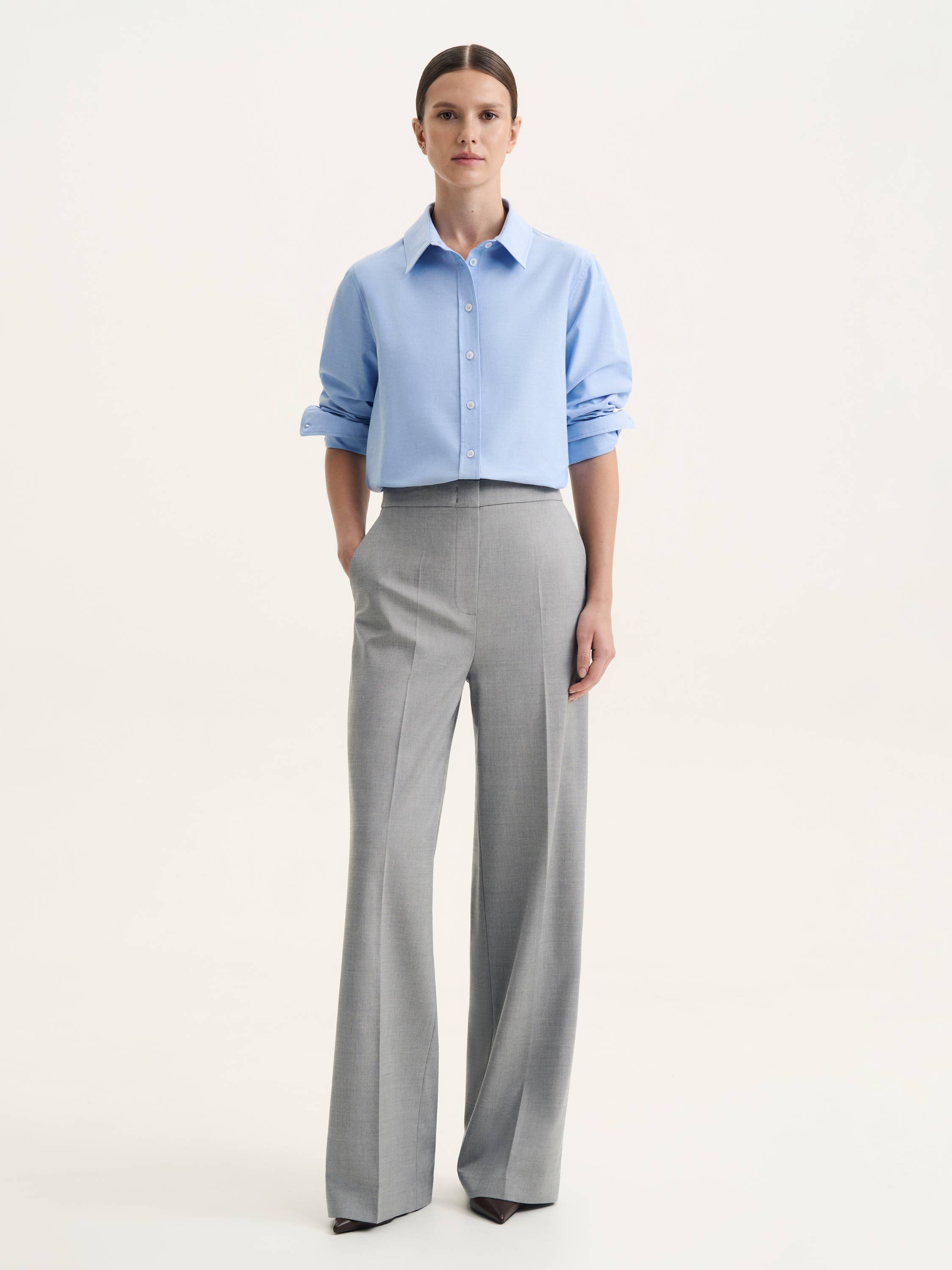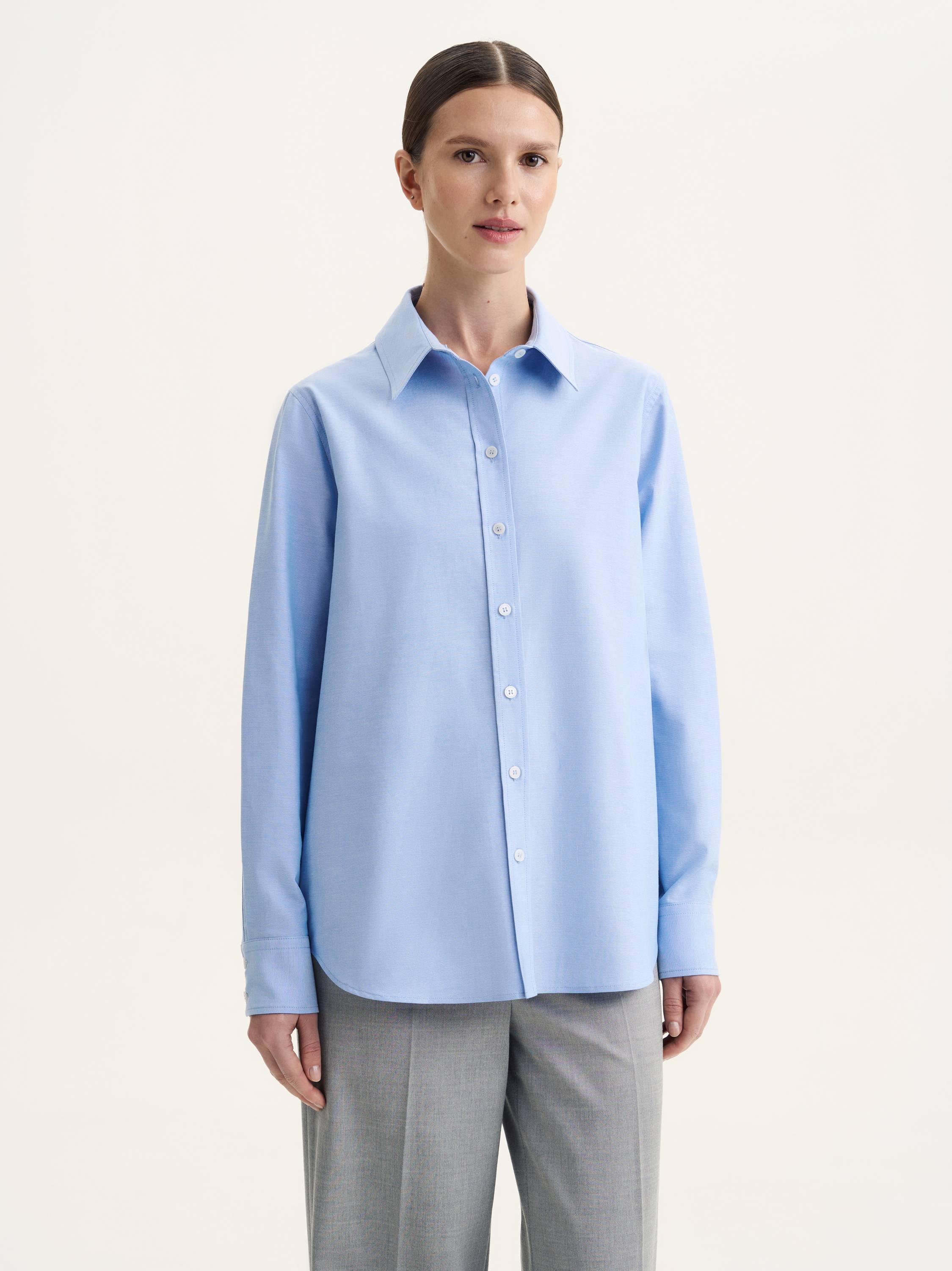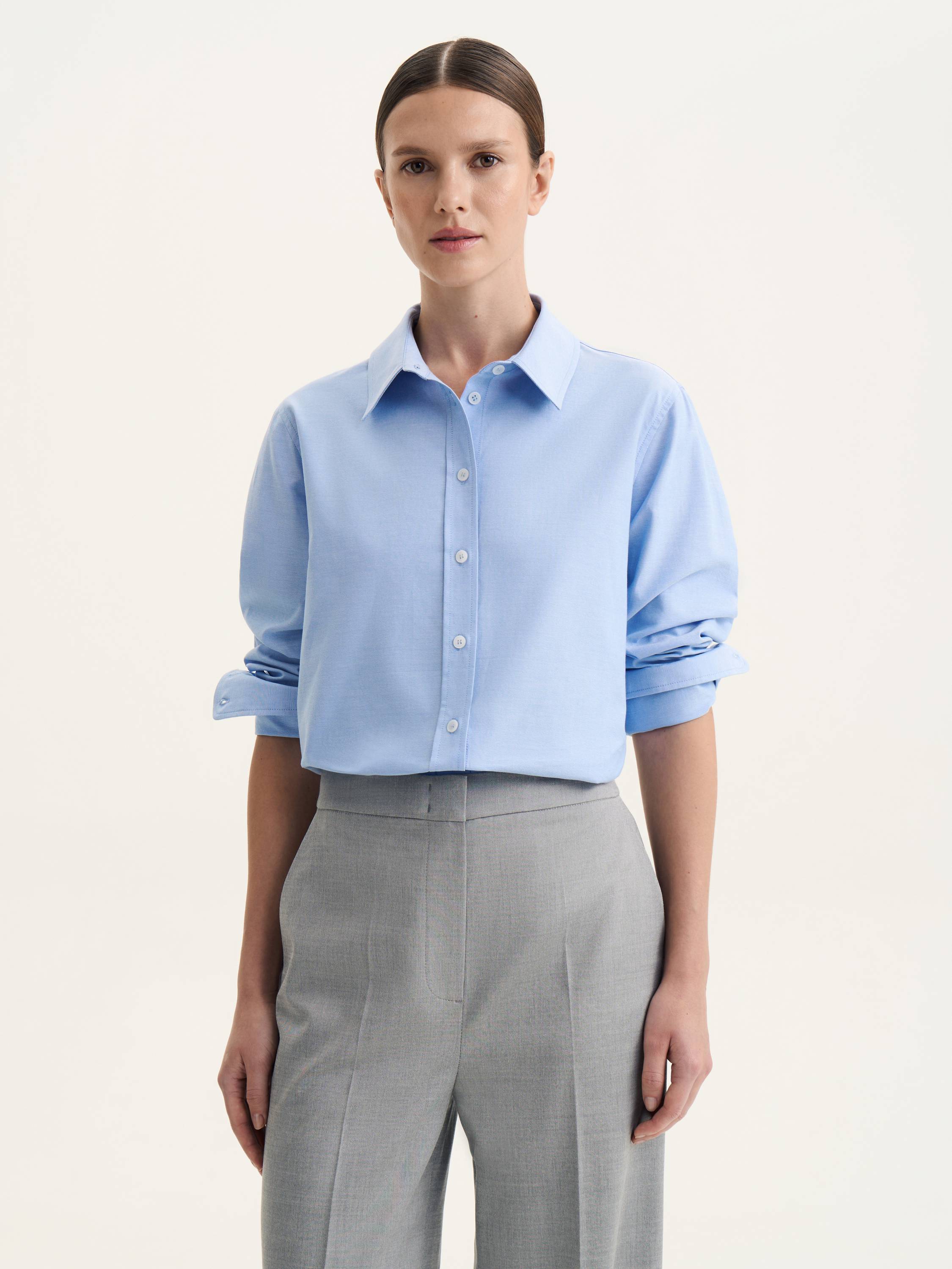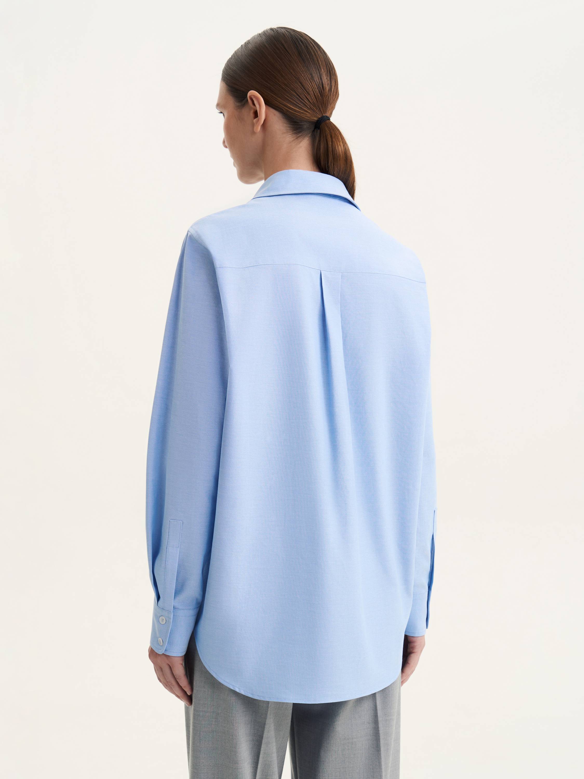 Рубашка из натурального хлопка — это сочетание классики, комфорта и современной универсальности. Легкая, дышащая ткань приятно прилегает к телу, обеспечивая комфорт в течение всего дня. Прямой крой создает чистые линии и расслабленный силуэт, а аккуратный отложной воротник и манжеты на пуговицах придают модели структурность и сдержанную элегантность. Голубой оттенок делает рубашку выразительной и универсальной, позволяя адаптировать ее под разные образы. В сочетании с классическими брюками или юбкой она создает собранный деловой стиль, а в ансамбле с джинсами или трикотажными изделиями выглядит непринужденно и современно. Практичная и стильная модель, которая легко впишется в базовый гардероб.