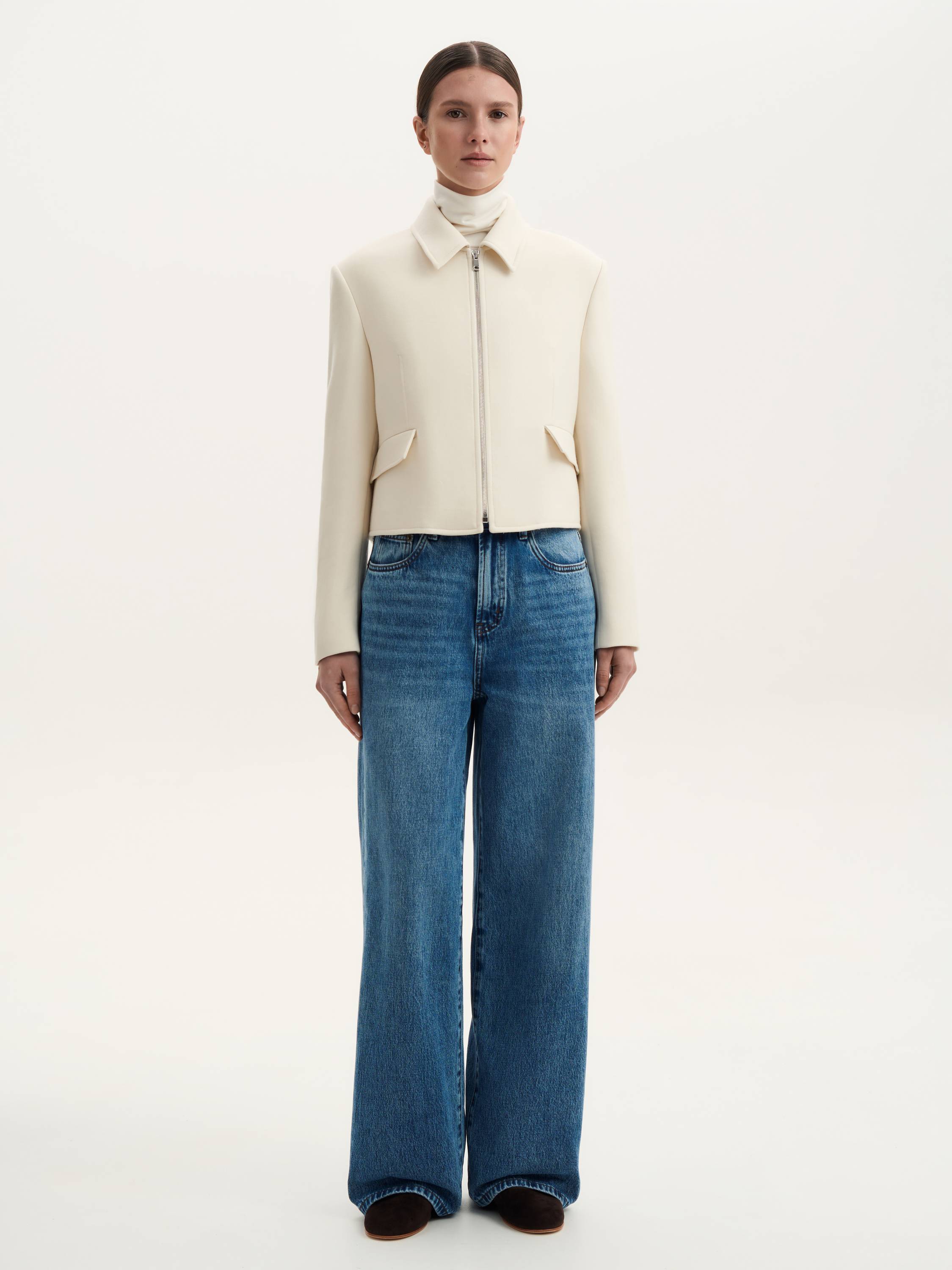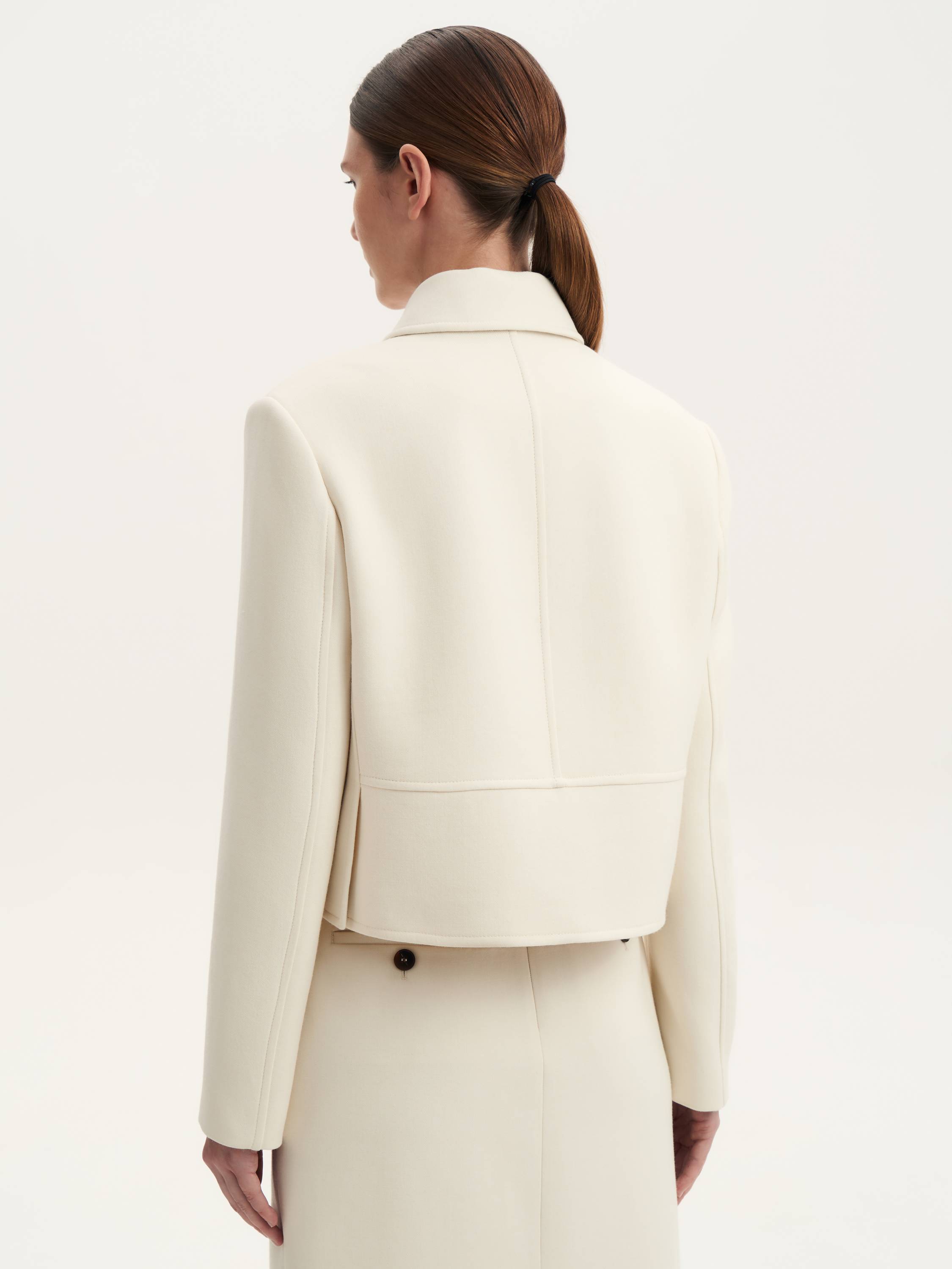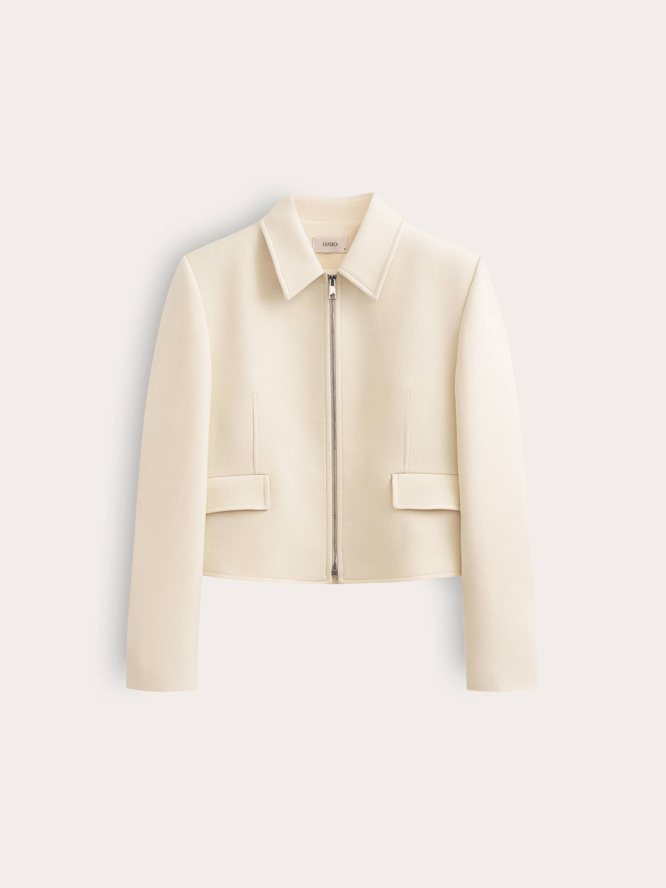 Укороченный жакет на молнии — это сочетание элегантности, современного кроя и универсальности. Лаконичный силуэт подчеркивает линию плеч, создавая структурированный, но при этом мягкий образ. Гладкая ткань приятно прилегает к телу, обеспечивая комфорт, а минималистичный дизайн делает модель стильной основой гардероба. Застежка на молнию придает жакету современный характер и практичность, позволяя легко регулировать посадку. Укороченная длина делает его идеальным дополнением к юбкам и брюкам с завышенной талией, создавая гармоничные пропорции. Нейтральный кремовый оттенок добавляет универсальности, позволяя адаптировать жакет под разные стили — от элегантных и офисных до расслабленных кэжуал-образов.