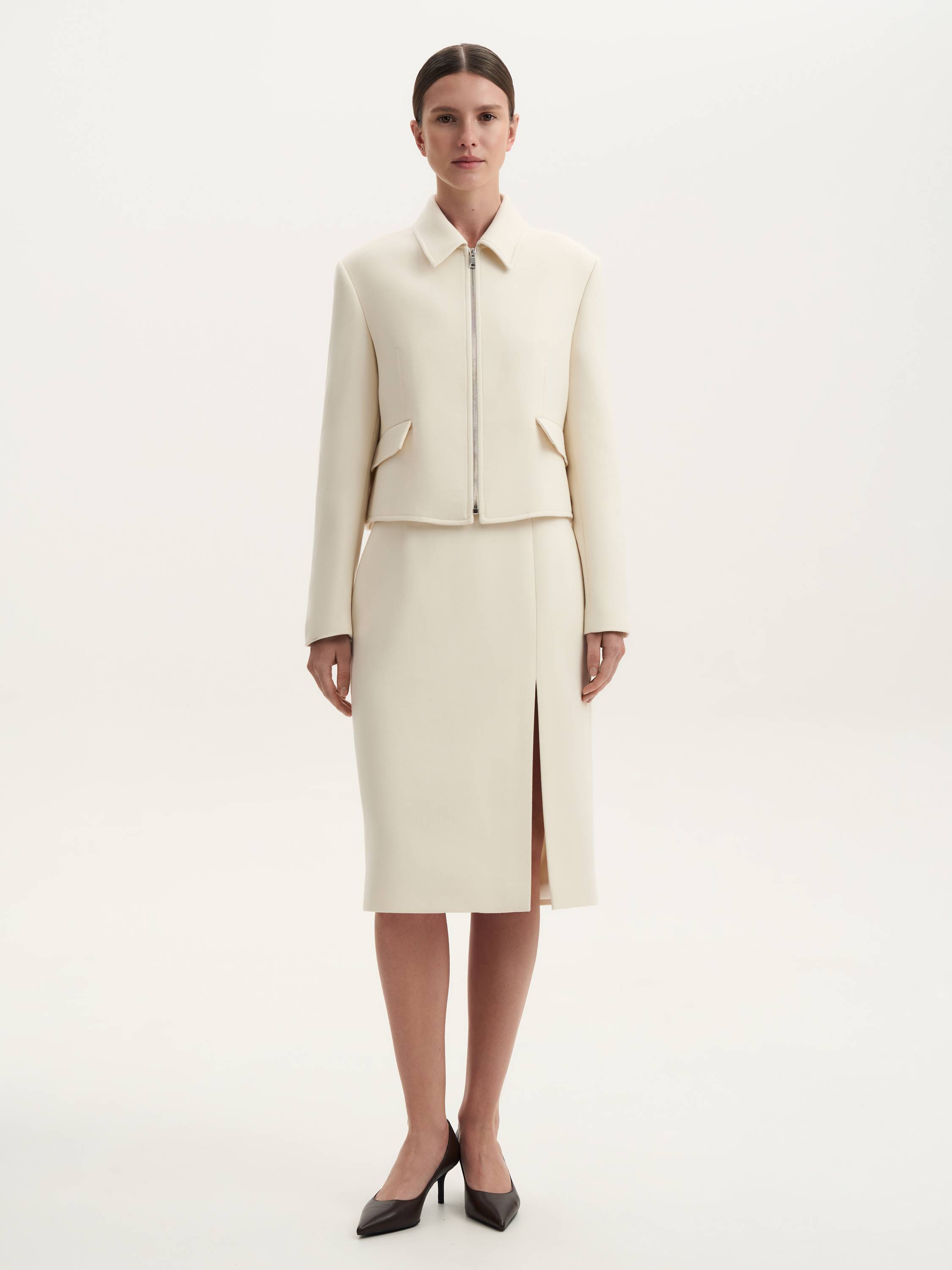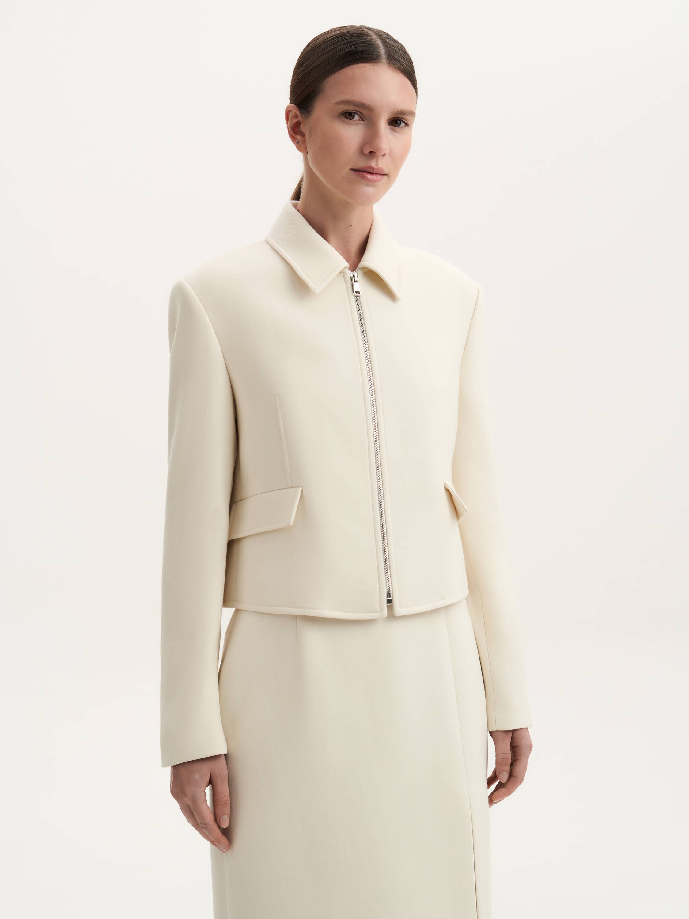 Укороченный жакет на молнии — это сочетание элегантности, современного кроя и универсальности. Лаконичный силуэт подчеркивает линию плеч, создавая структурированный, но при этом мягкий образ. Гладкая ткань приятно прилегает к телу, обеспечивая комфорт, а минималистичный дизайн делает модель стильной основой гардероба. Застежка на молнию придает жакету современный характер и практичность, позволяя легко регулировать посадку. Укороченная длина делает его идеальным дополнением к юбкам и брюкам с завышенной талией, создавая гармоничные пропорции. Нейтральный кремовый оттенок добавляет универсальности, позволяя адаптировать жакет под разные стили — от элегантных и офисных до расслабленных кэжуал-образов.