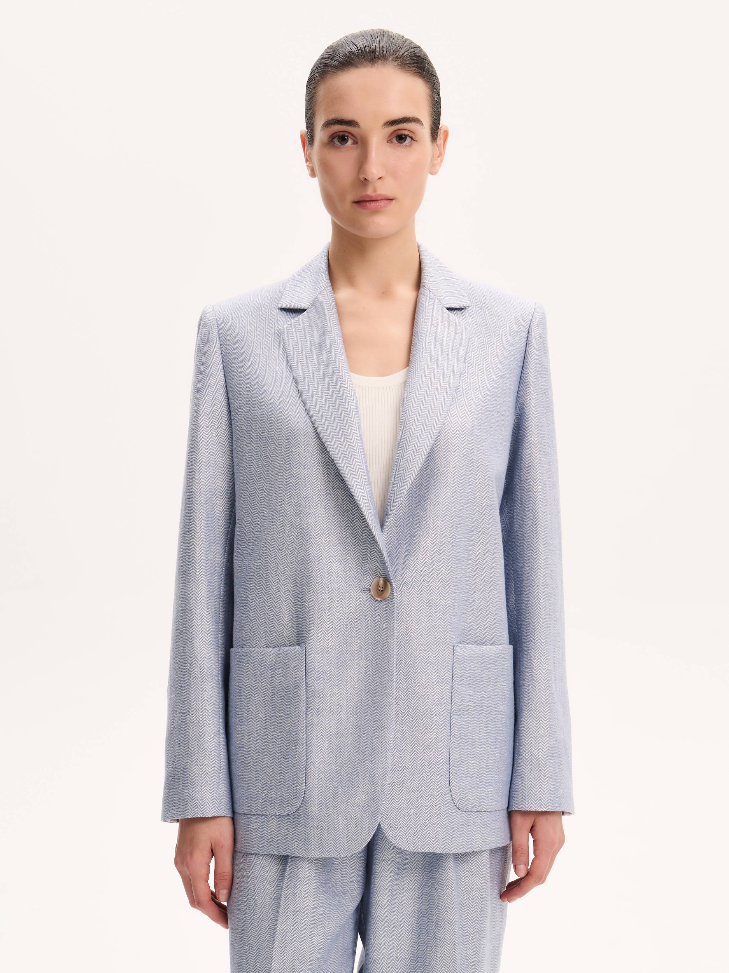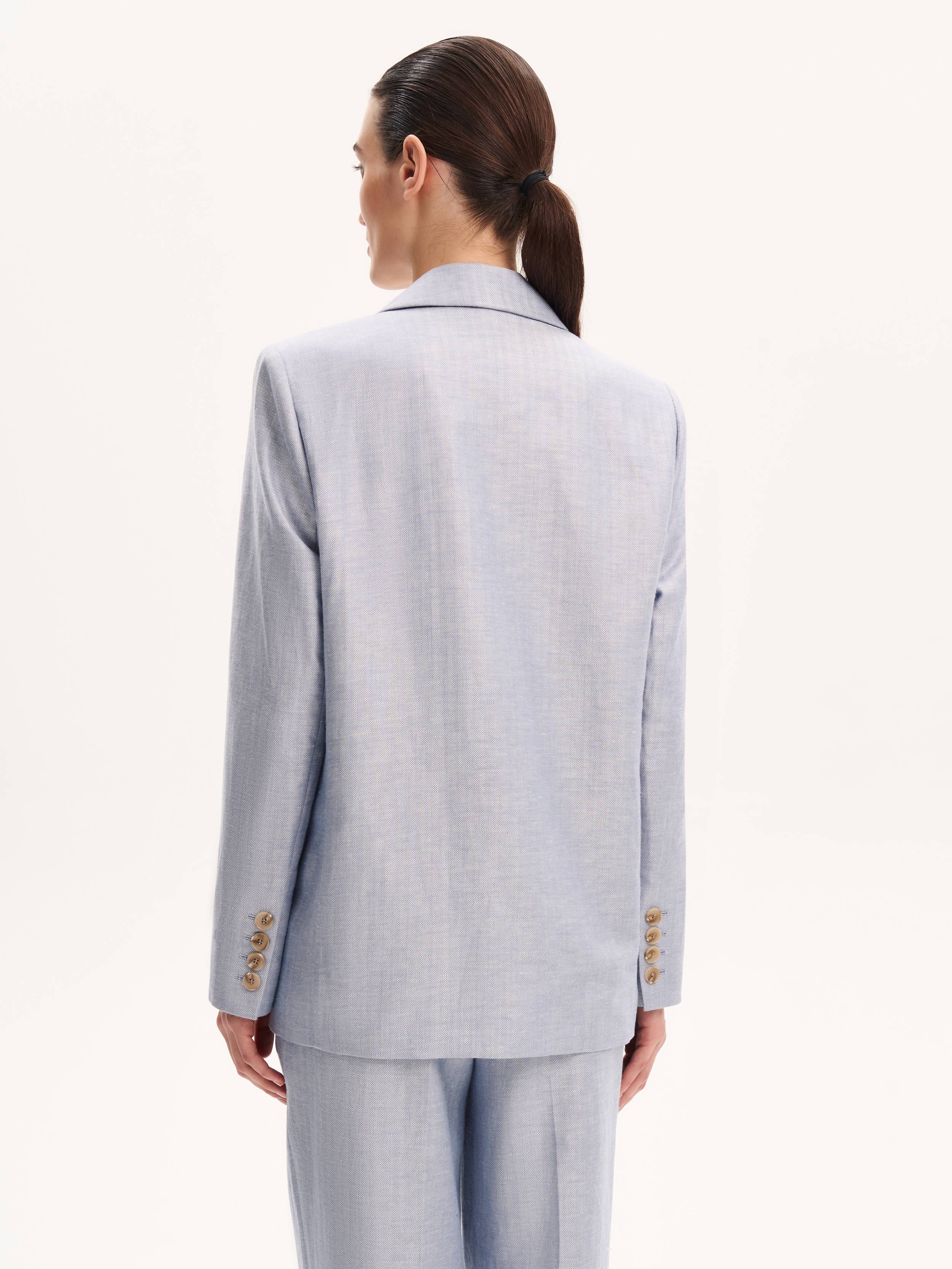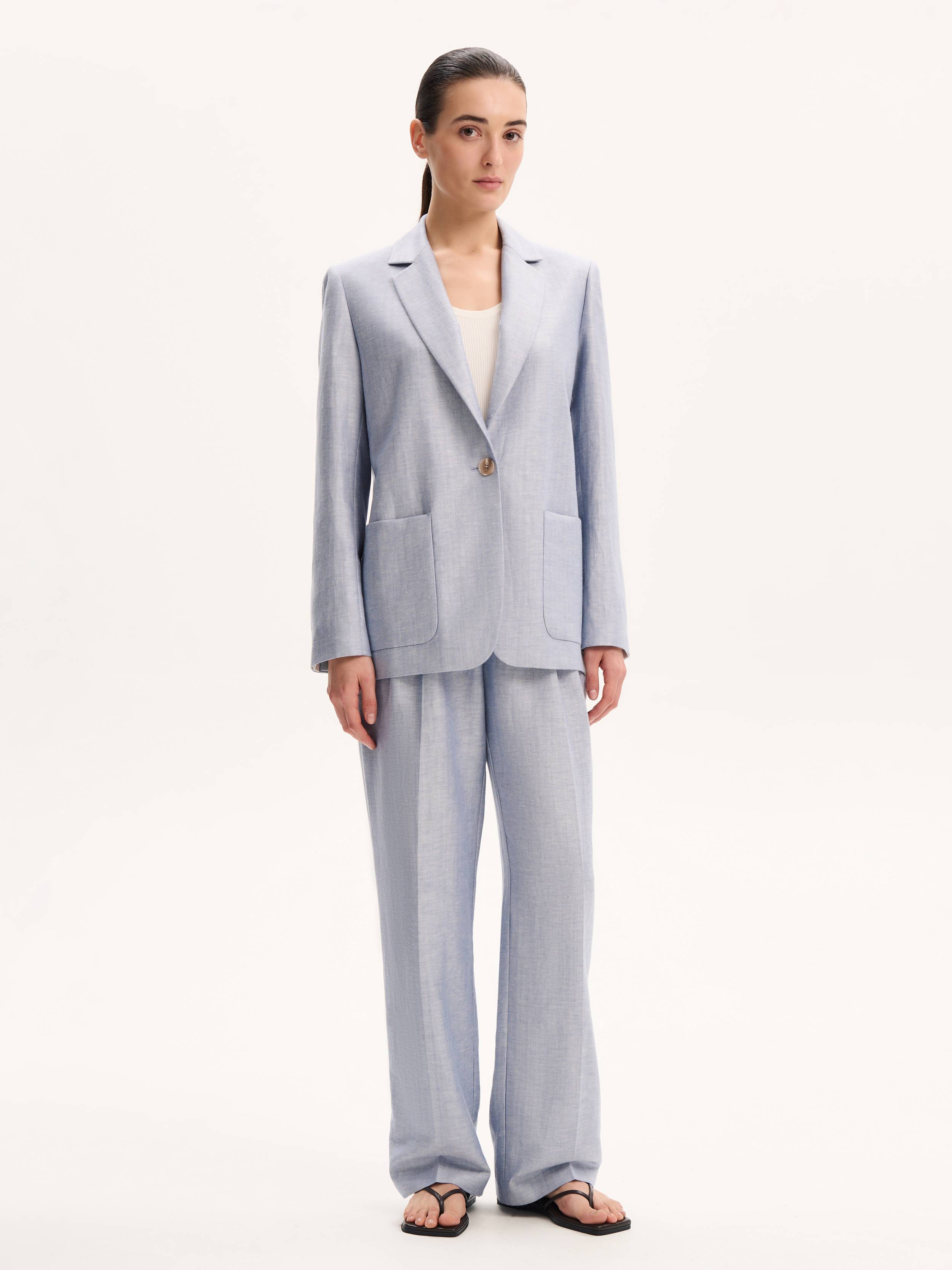 Жакет изо льна, шерсти и шелка в деликатном светло-голубом оттенке — универсальная модель для летнего гардероба с уклоном в современную классику. Ткань с легкой фактурной выразительностью обеспечивает комфорт в жару, оставаясь пластичной и формоустойчивой. Прямой силуэт с классическим воротником, прорезными карманами и застежкой на одну пуговицу создает современный образ в духе архитектурного минимализма. Акцентные накладные карманы добавляют графики, не нарушая лаконичного ритма. Идеален в комплекте с брюками из той же ткани или как самостоятельный акцент к однотонным юбкам, топам или платьям.