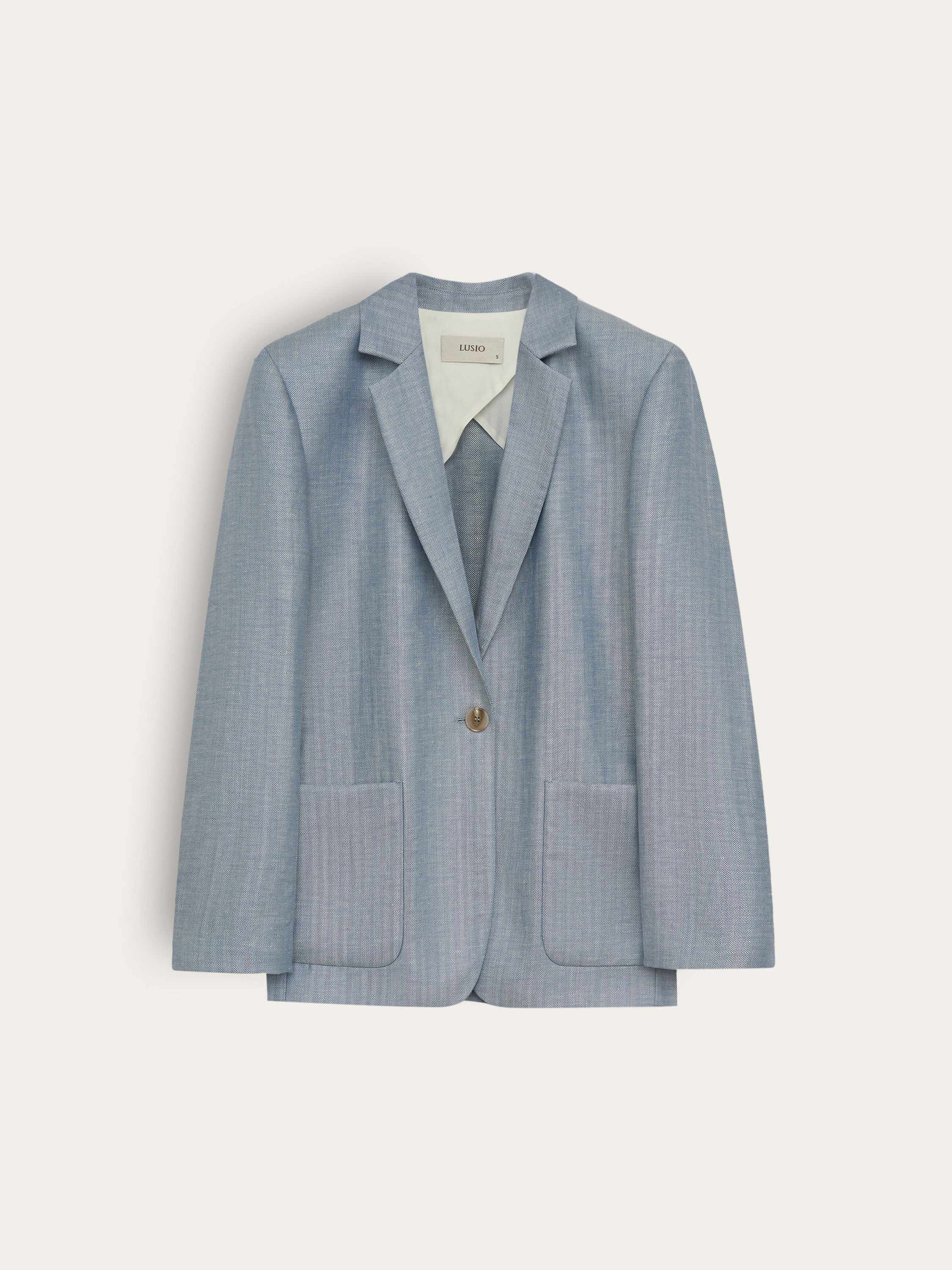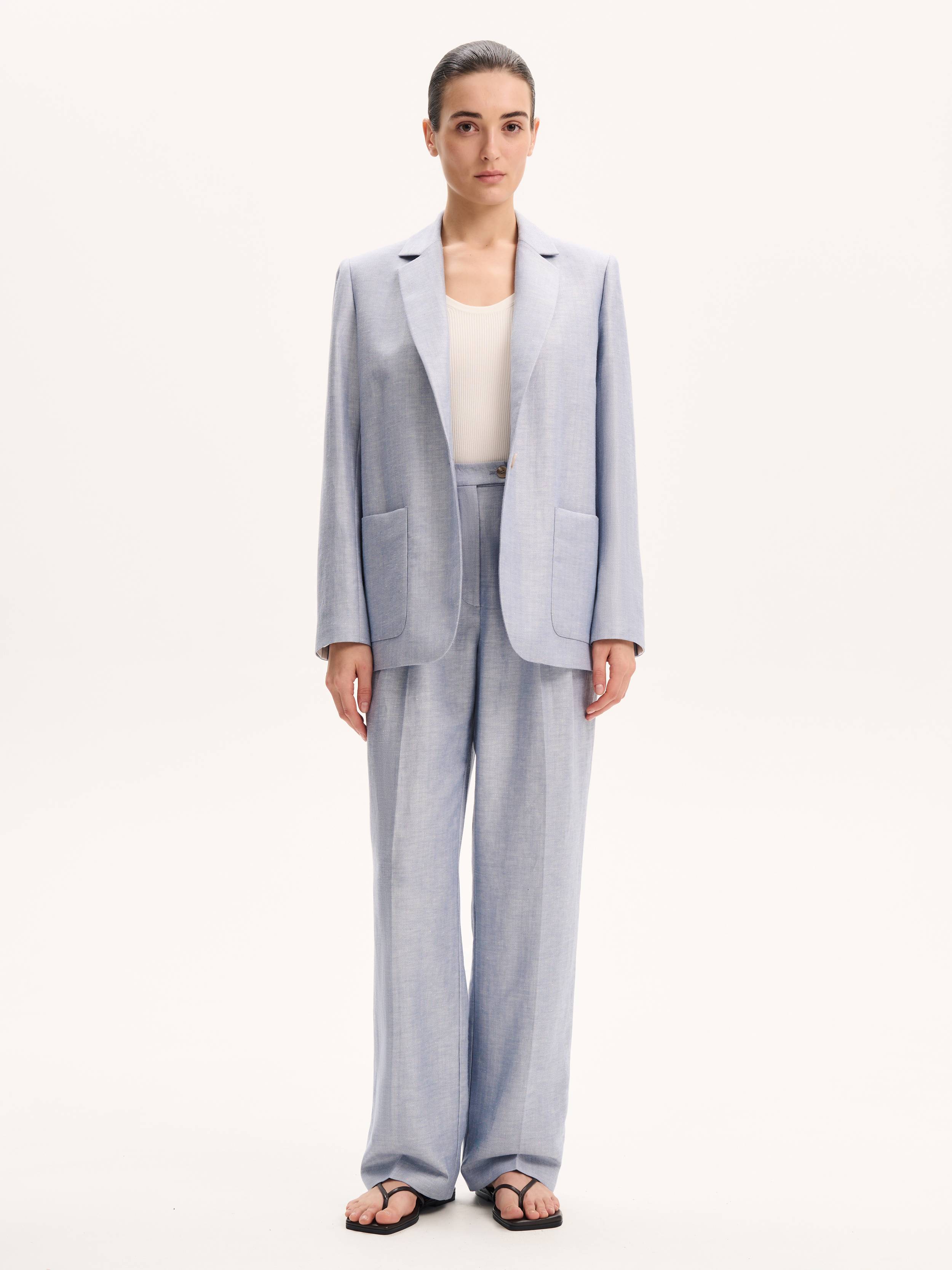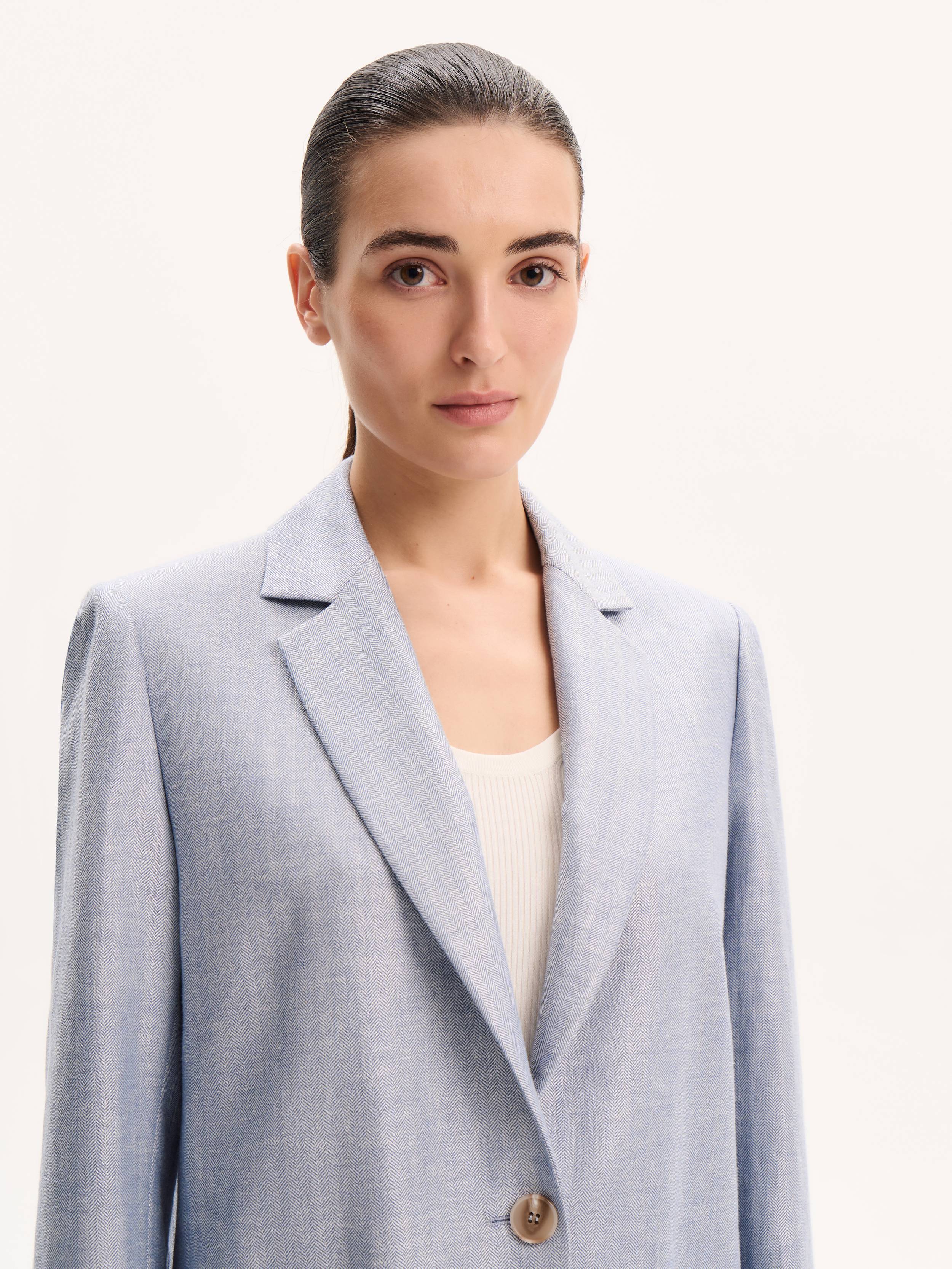 Жакет изо льна, шерсти и шелка в деликатном светло-голубом оттенке — универсальная модель для летнего гардероба с уклоном в современную классику. Ткань с легкой фактурной выразительностью обеспечивает комфорт в жару, оставаясь пластичной и формоустойчивой. Прямой силуэт с классическим воротником, прорезными карманами и застежкой на одну пуговицу создает современный образ в духе архитектурного минимализма. Акцентные накладные карманы добавляют графики, не нарушая лаконичного ритма. Идеален в комплекте с брюками из той же ткани или как самостоятельный акцент к однотонным юбкам, топам или платьям.