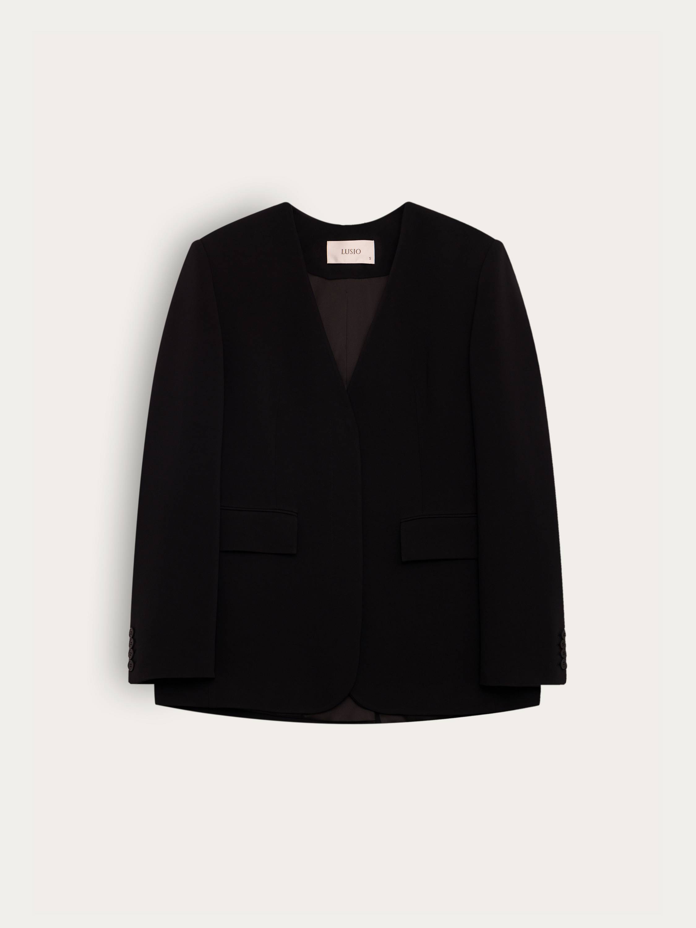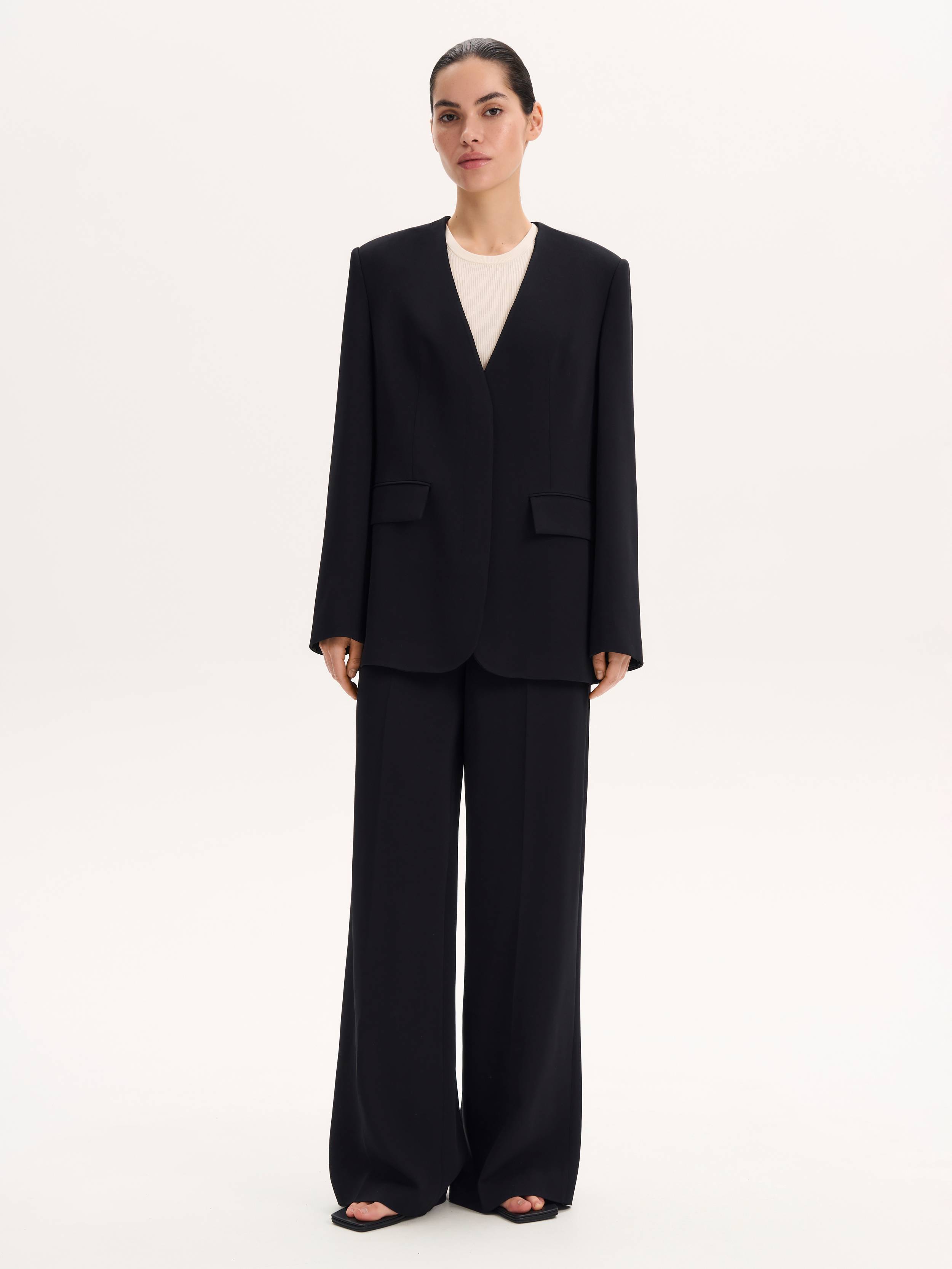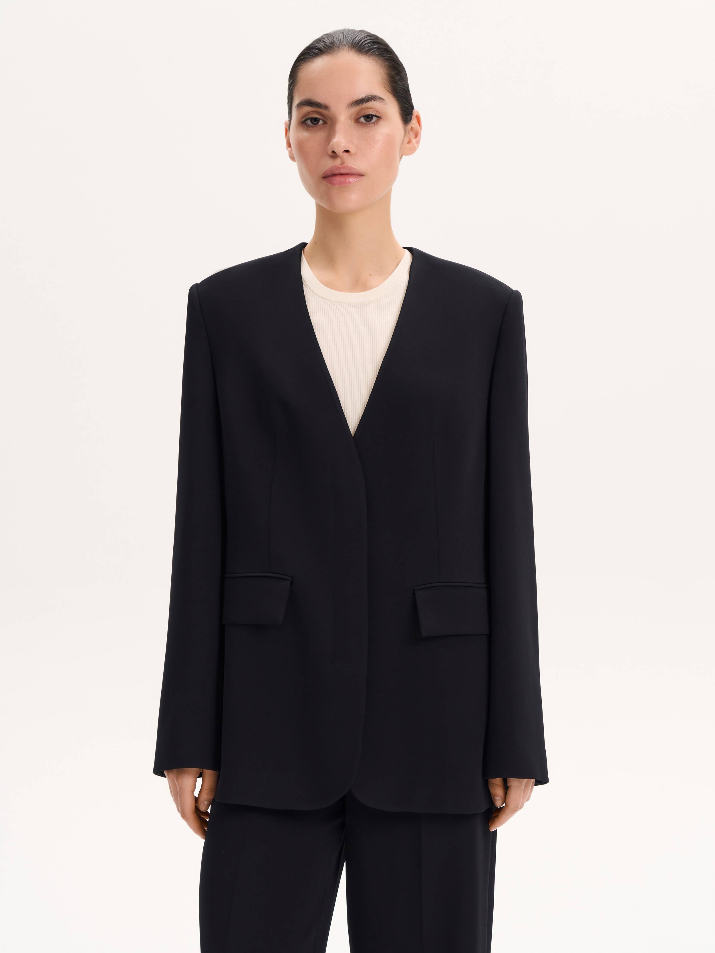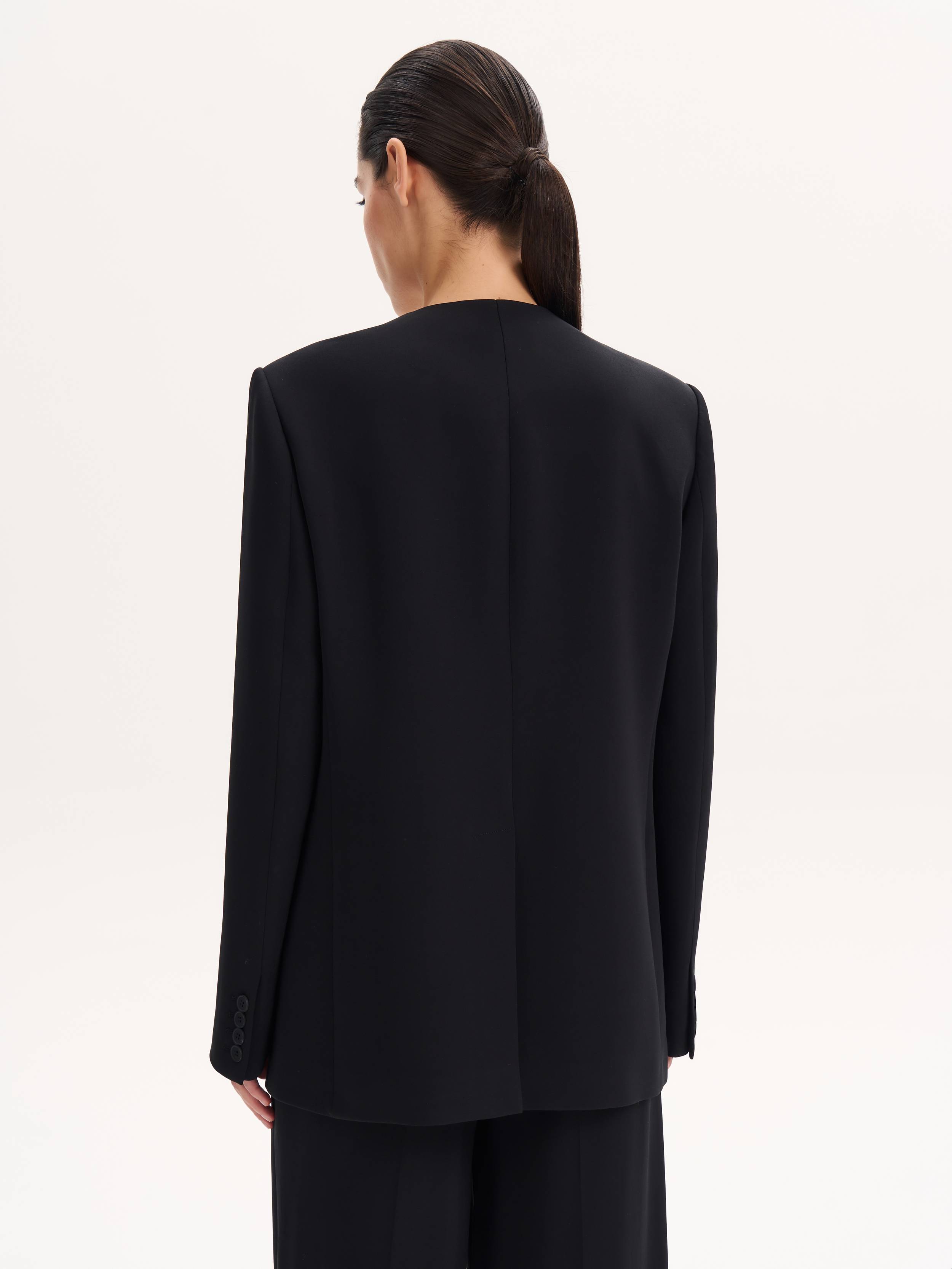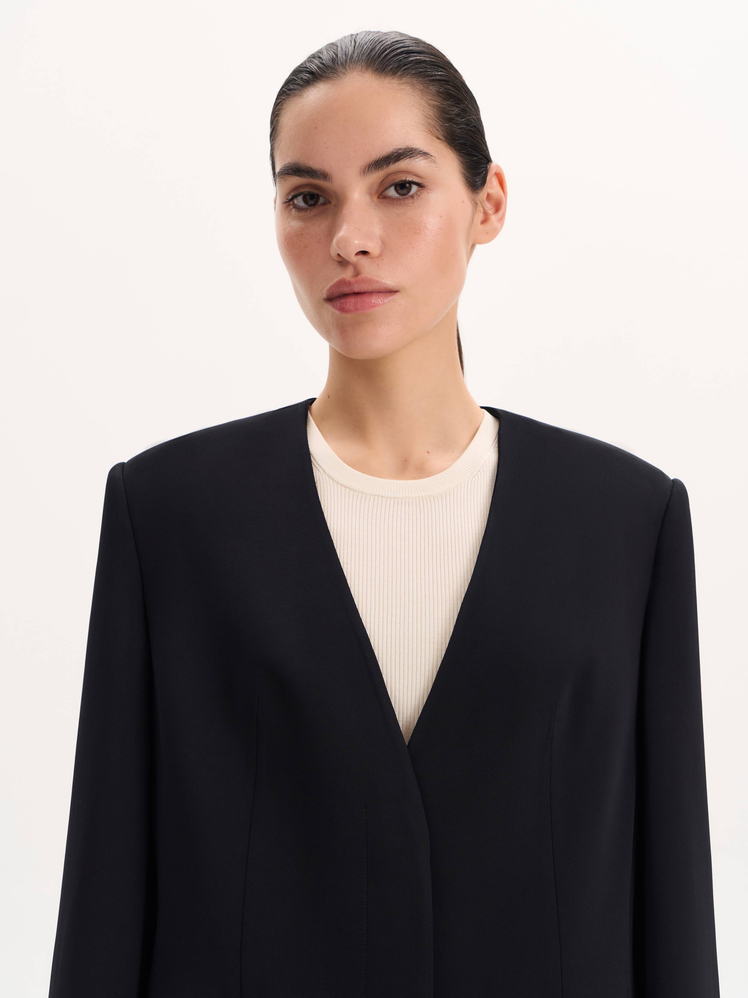 Лаконичный и собранный жакет прямого кроя с чистой линией плеча и V-образным вырезом без лацканов. Благодаря мягкой, пластичной ткани на основе района он держит форму, не сковывая движения. Минимум деталей: скрытая застежка, прорезные карманы с клапанами, ровная спинка без шлицы — все работает на архитектуру и выразительность силуэта. Глубокий черный оттенок универсален: уместен и в повседневных образах с футболками и джинсами, и в комплекте с брюками для строгого формального выхода.