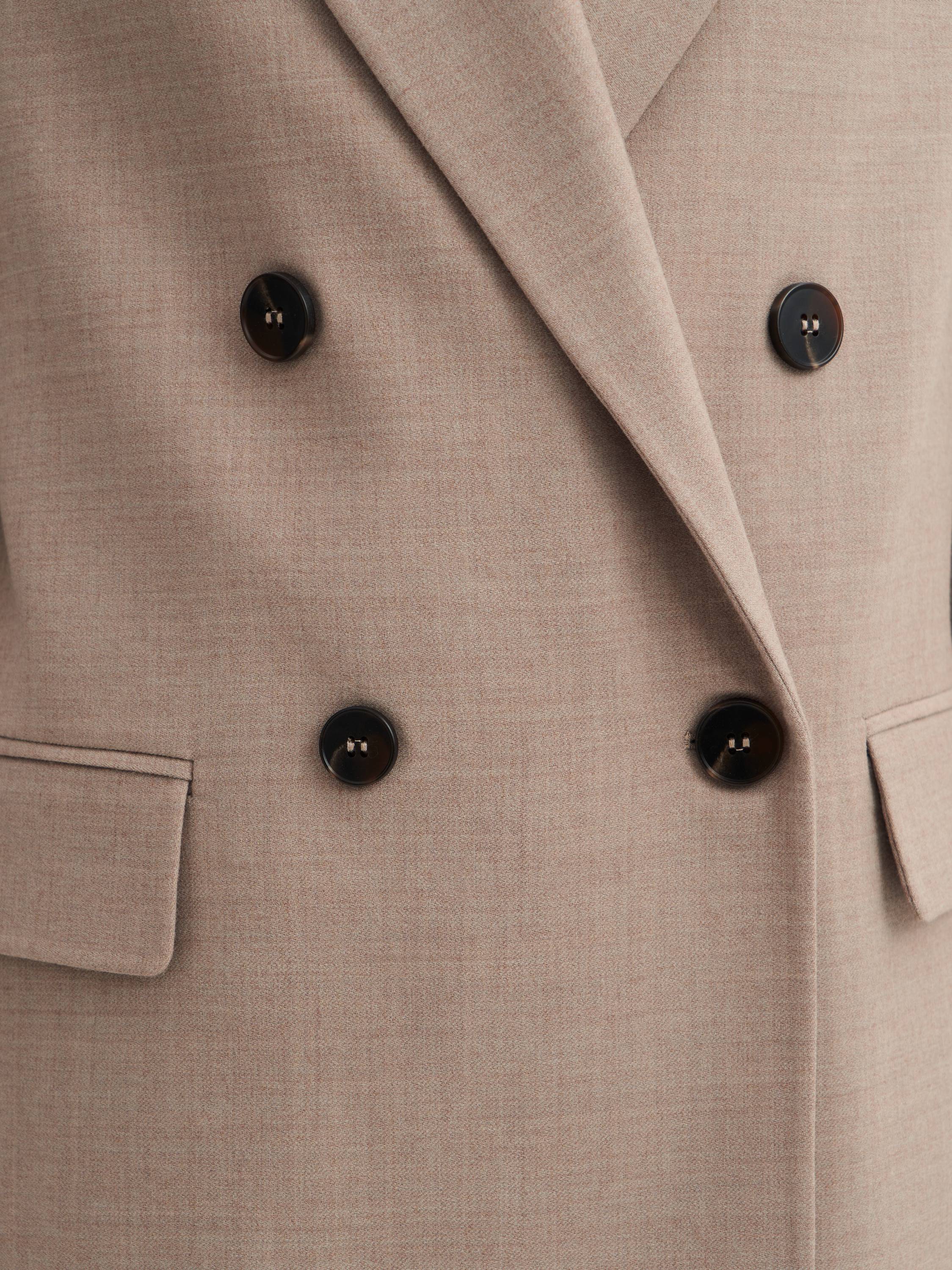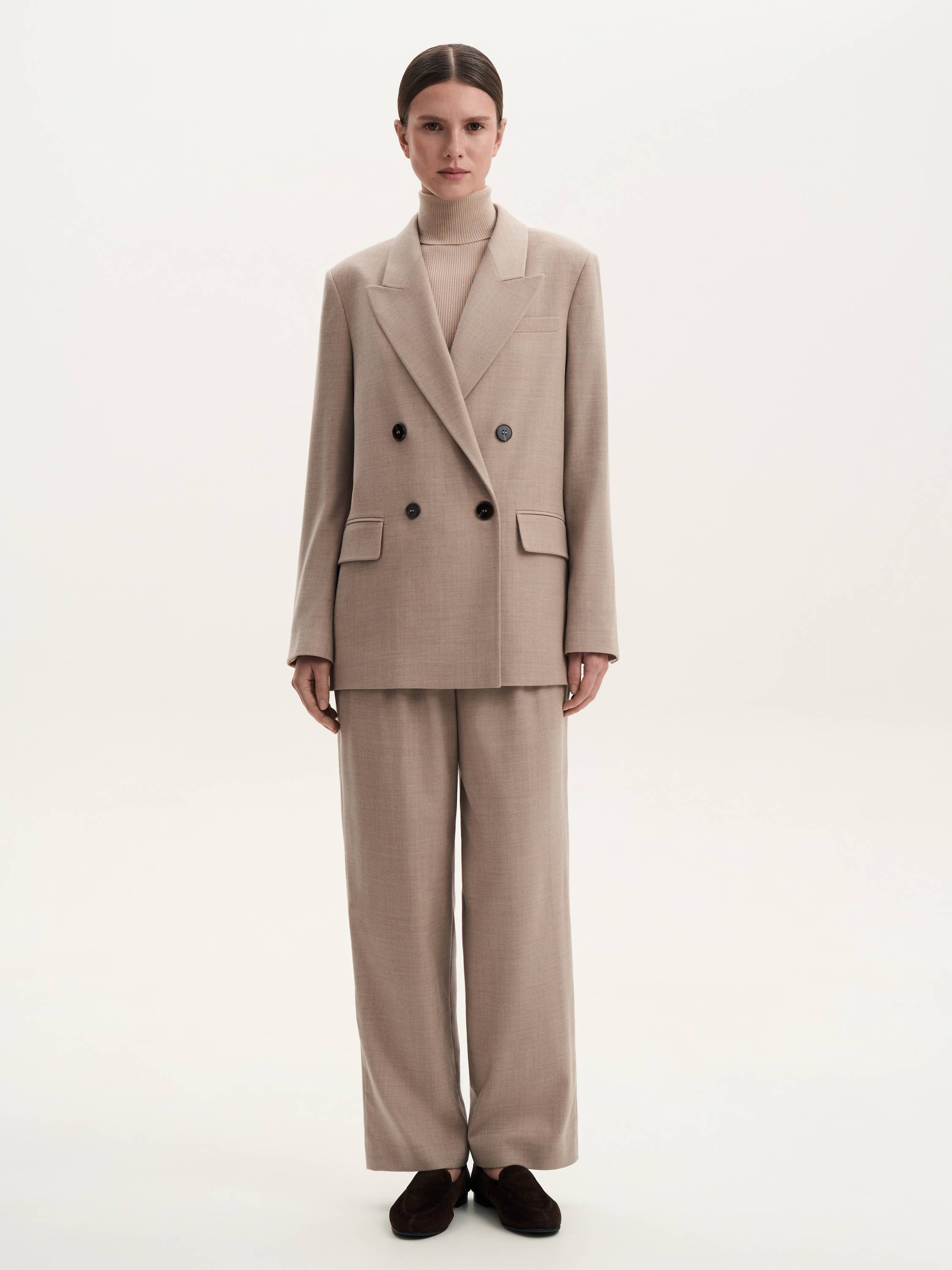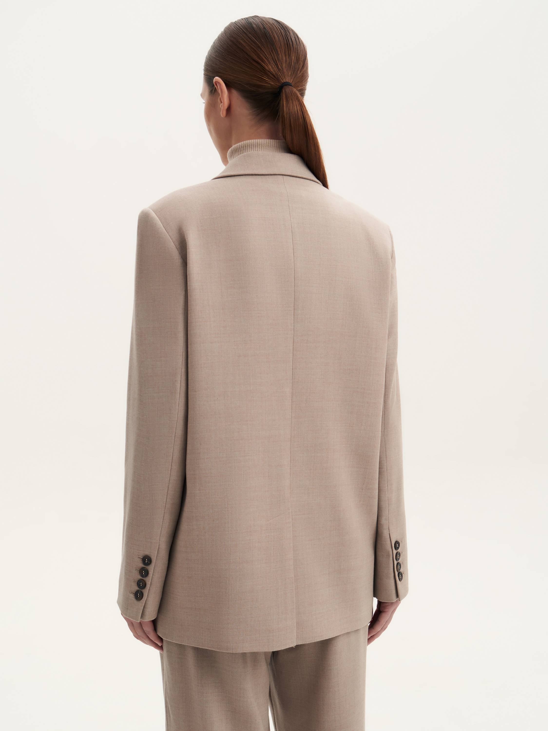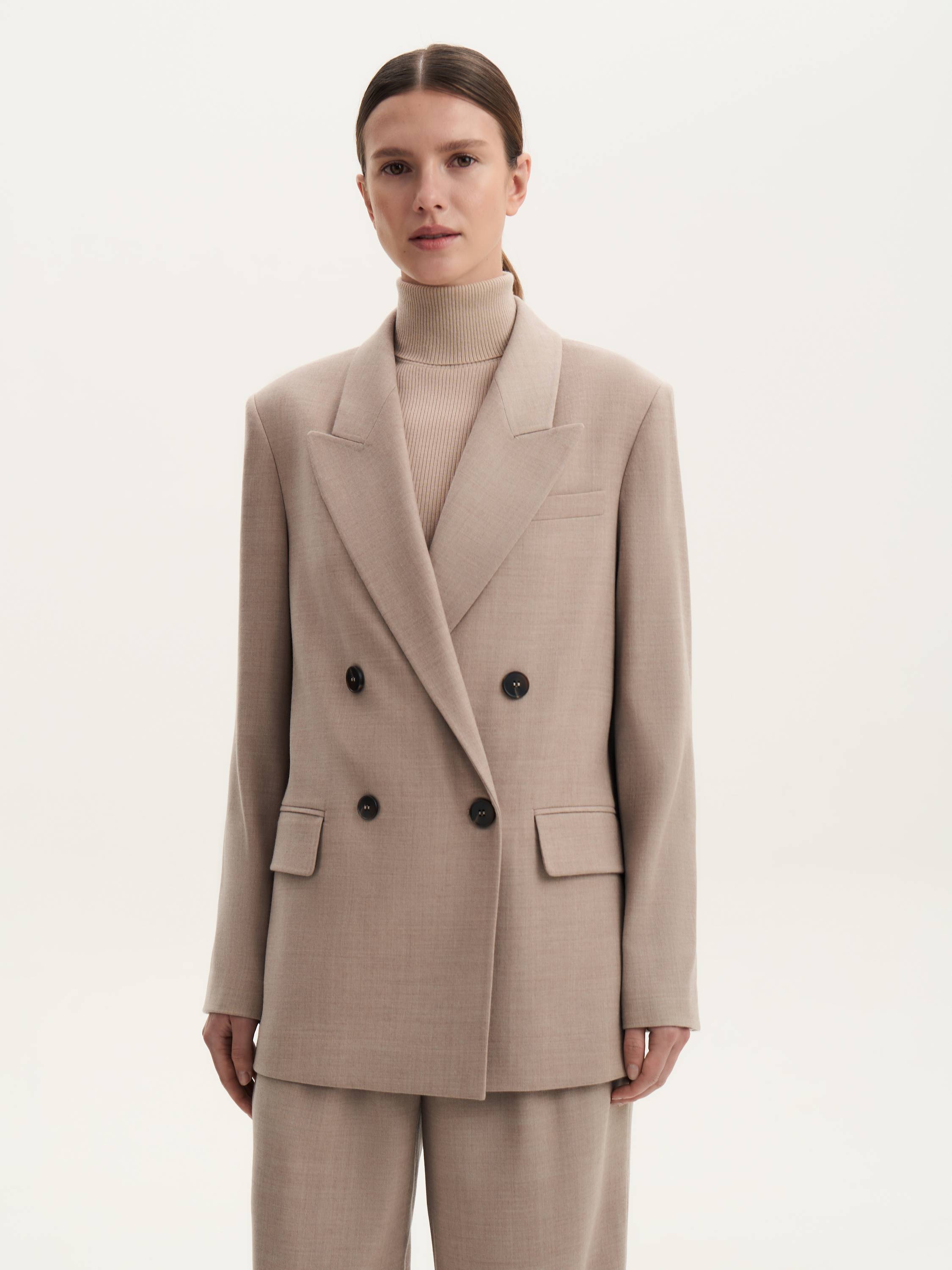 Двубортный жакет с настроением уверенной лаконичности. Архитектурный силуэт с акцентной линией плеч и удлиненной формой создает выстроенный образ, в котором легко чувствовать внутреннюю собранность. Классический лацкан, прорезные карманы с клапанами и выразительная фурнитура придают модели законченность и сдержанный акцент. Ткань из австралийской шерсти — легкая, пластичная, с деликатной матовостью — прекрасно держит форму и комфортна в носке. Носите жакет как часть костюма или сочетайте с джинсами, платьями или юбками — он универсален и всегда актуален.