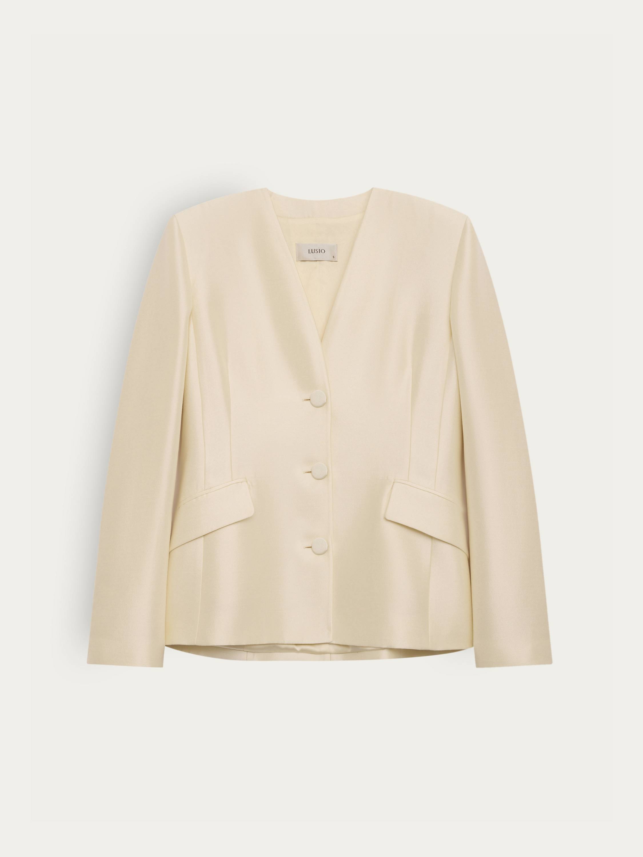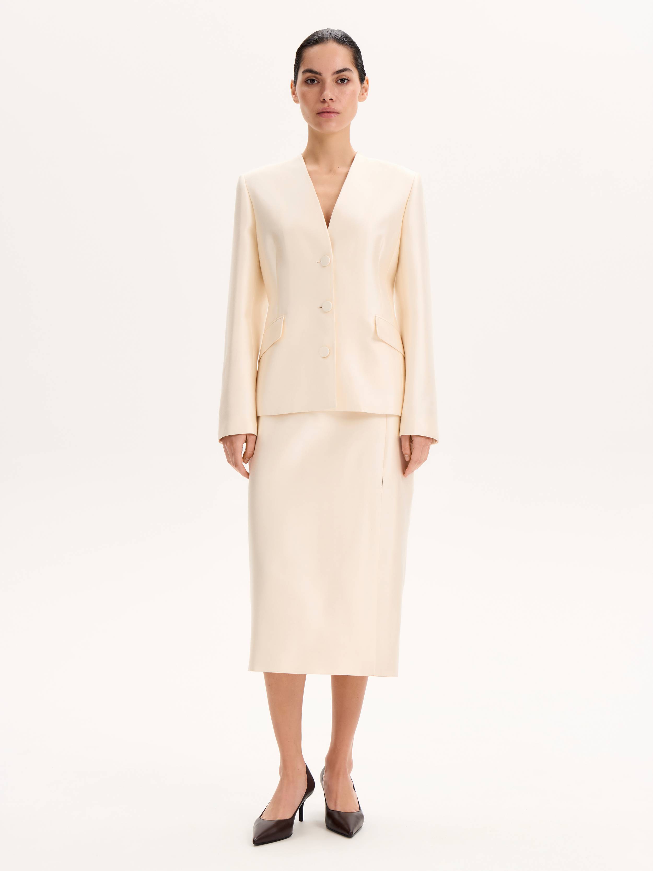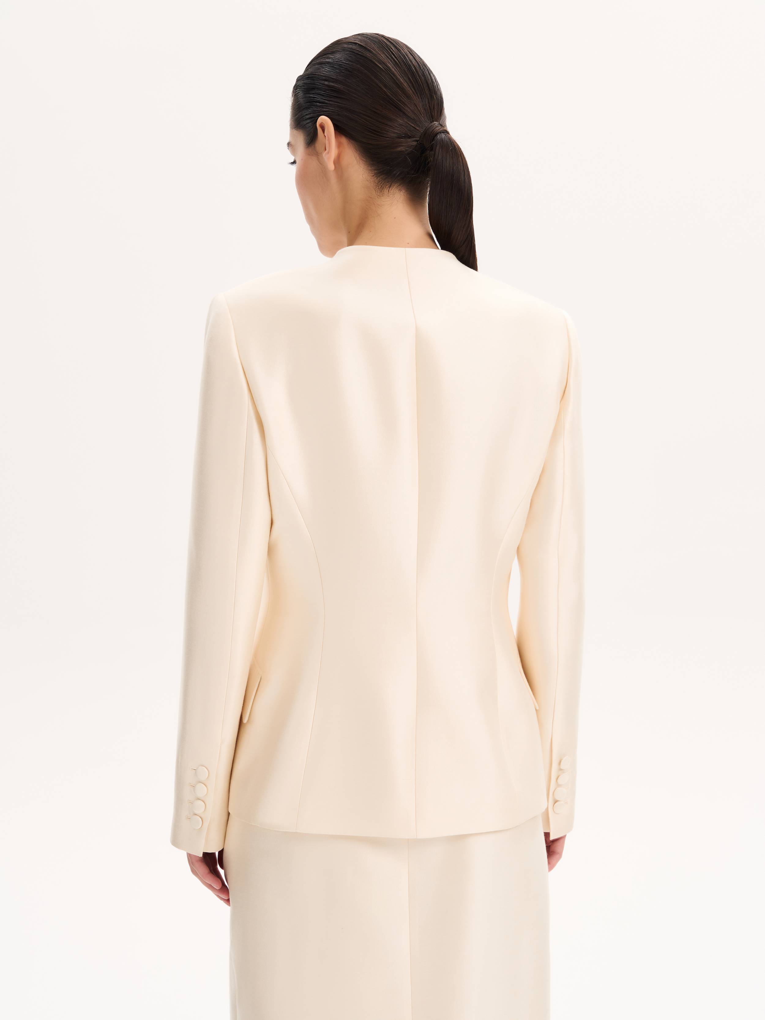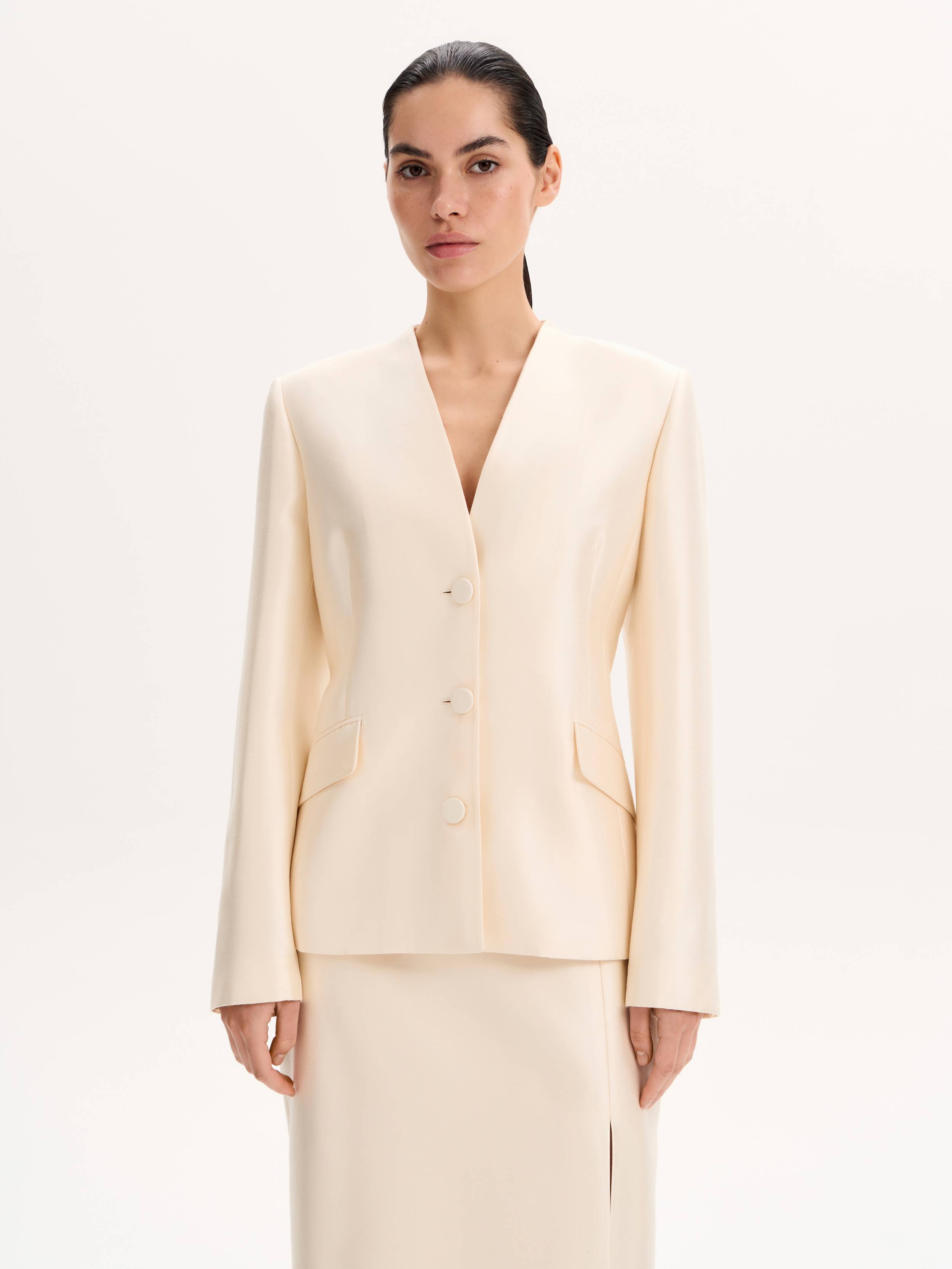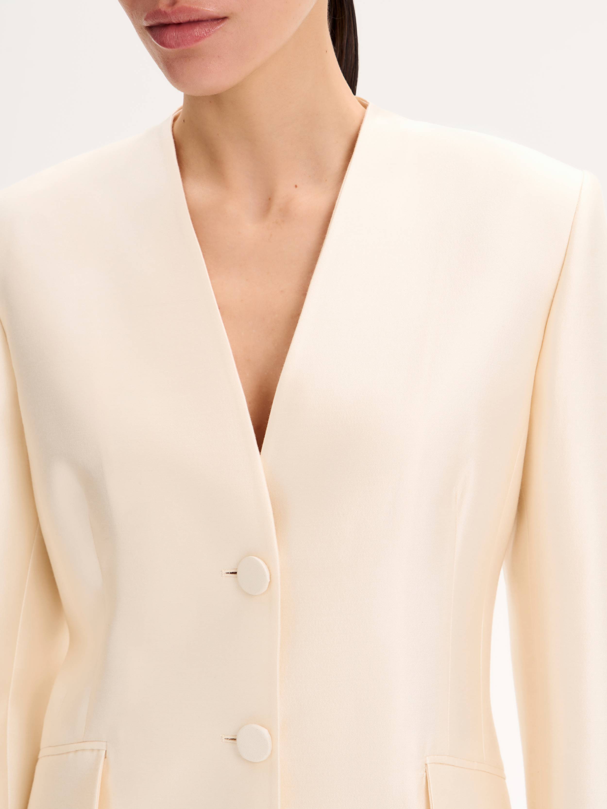 Жакет лаконичного силуэта, выполненный из премиальной ткани с добавлением шелка и шерсти. Материал отличается деликатным блеском, мягкой структурой и комфортной терморегуляцией. Прямой крой с четко выверенными линиями подчеркивает архитектуру образа, а V-образный вырез и три обтянутые пуговицы придают модели изысканность. Детали — прорезные карманы с клапанами и аккуратные плечи — создают собранный, но ненавязчиво женственный силуэт. Жакет гармонично сочетается с юбкой или брюками из той же ткани, формируя утонченный комплект в духе современного костюмного шика.