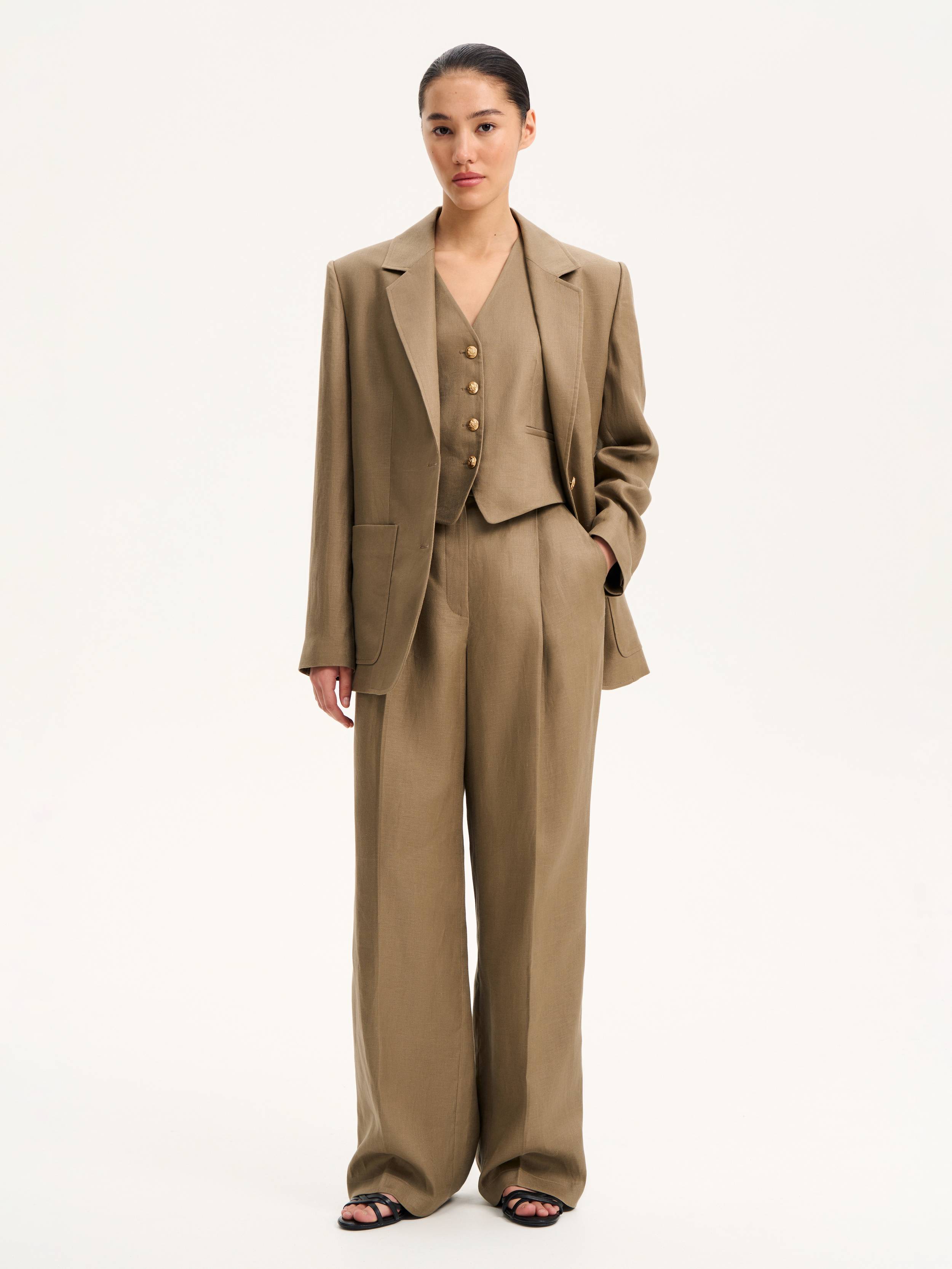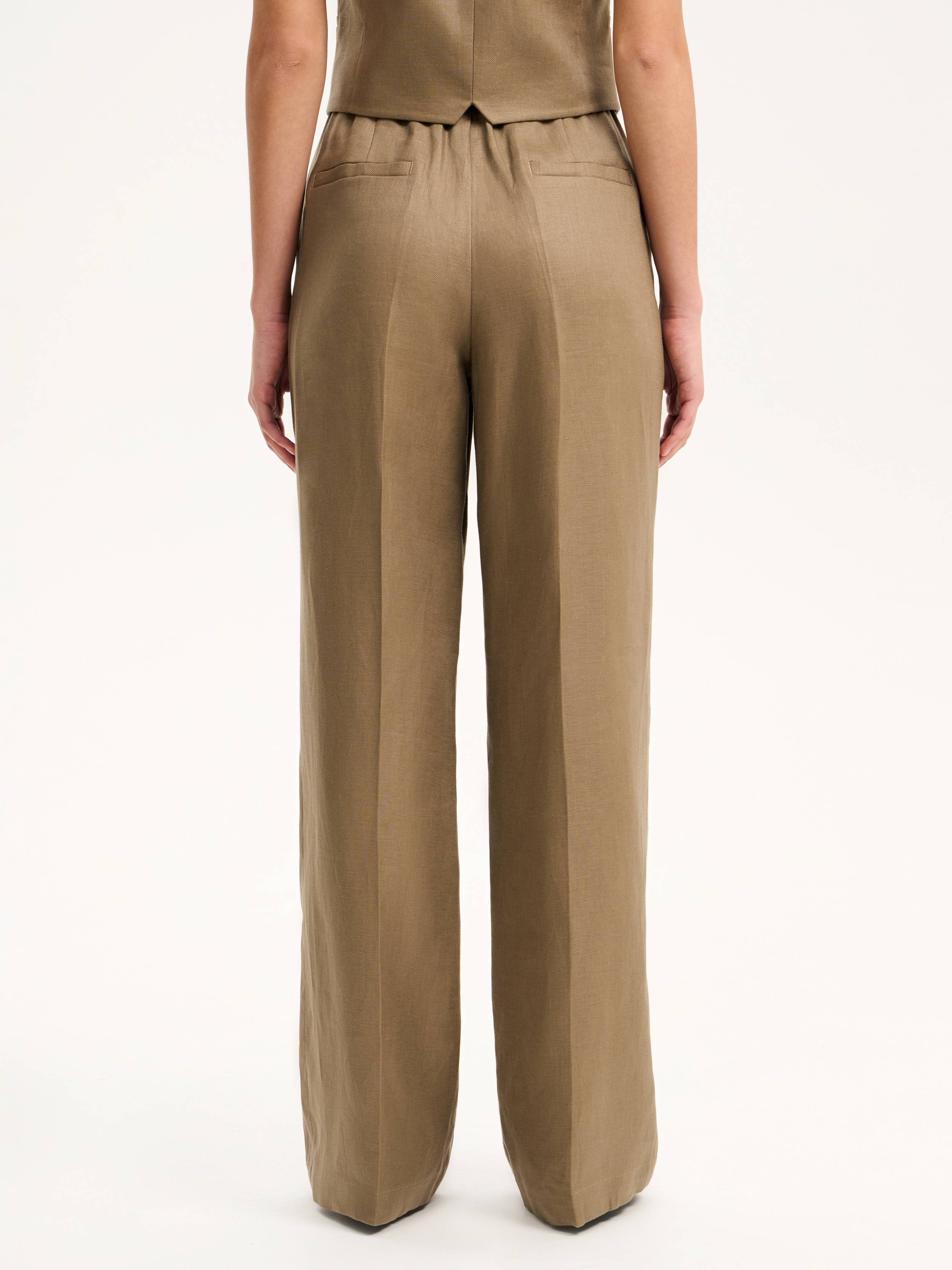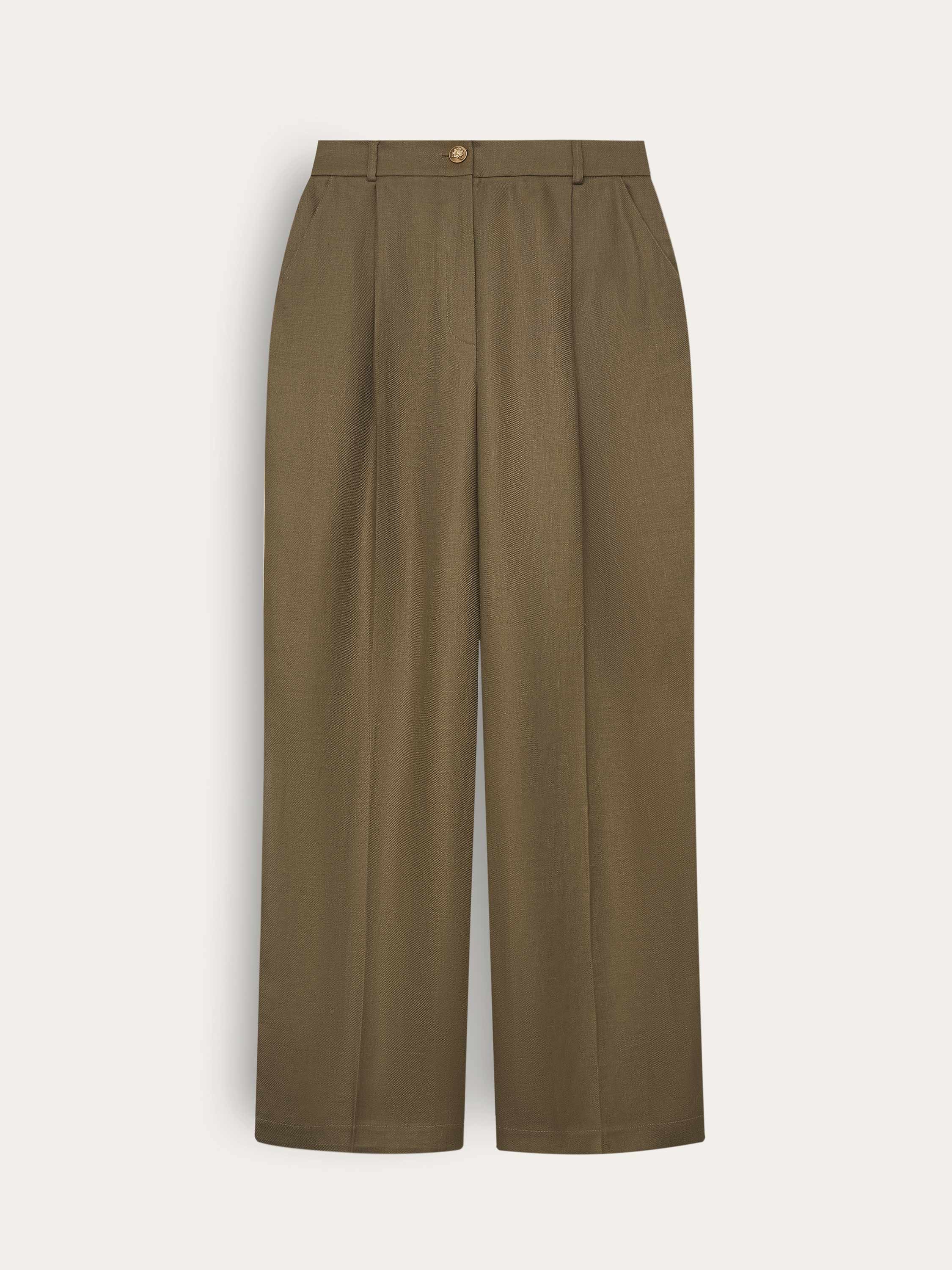 Льняные брюки прямого силуэта с четкой линией стрелок — базовая модель в духе современной классики. Плотный натуральный лен сохраняет форму, дышит и дарит комфорт даже в самую жаркую погоду. Посадка со спущенной линией талии, эластичной вставкой сзади и классическим поясом с застежкой подчеркивает расслабленную элегантность. Оттенок теплого хаки с золотисто-оливковым подтоном делает модель выразительной, но не броской — он легко сочетается с нейтральной палитрой и работает как мягкий цветовой акцент в летнем гардеробе.