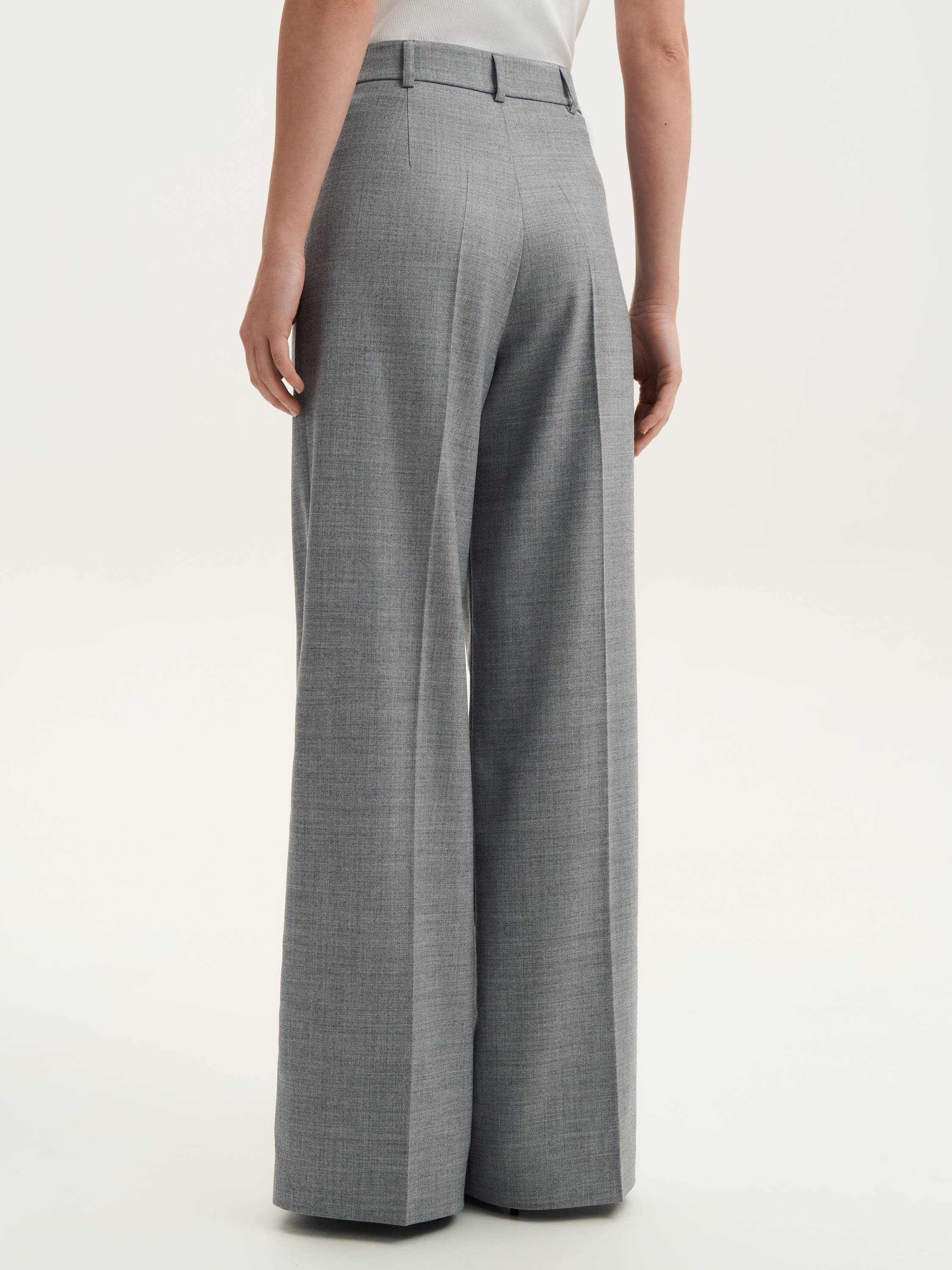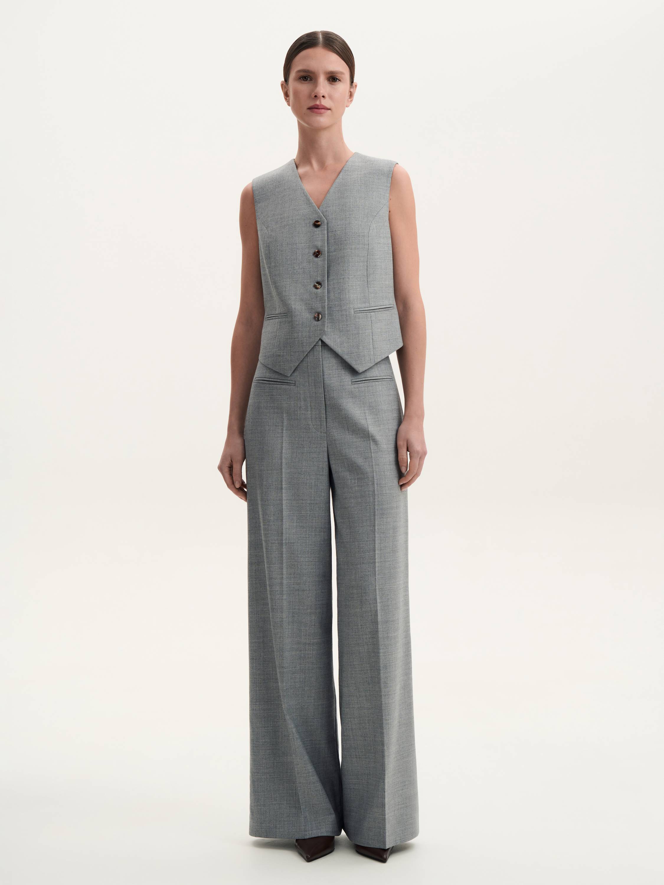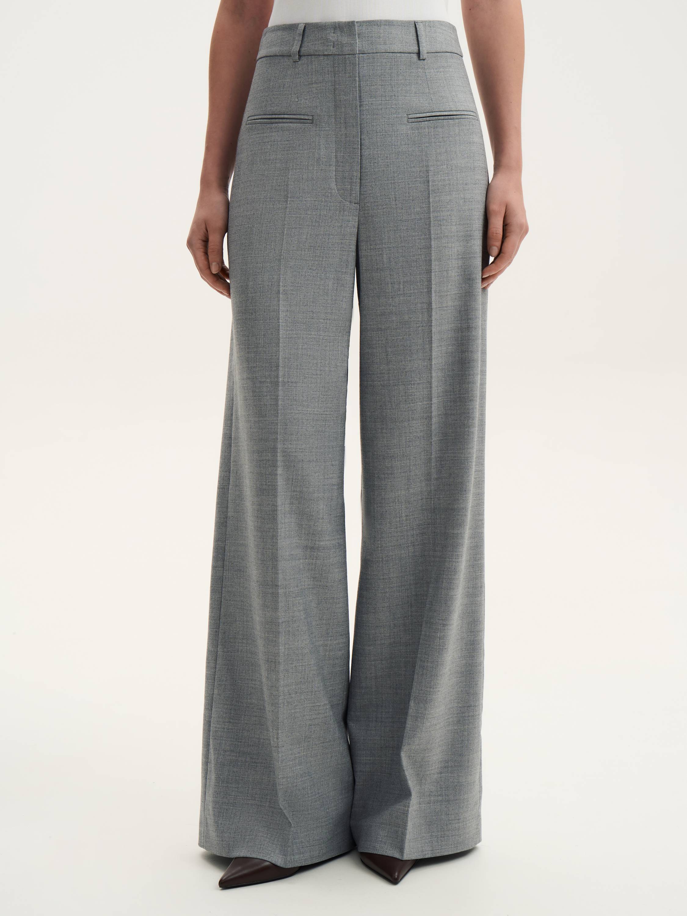 Костюмные брюки с шерстью — безупречный баланс элегантности и комфорта. Плотный материал с добавлением шерсти обеспечивает мягкость, тепло и приятные тактильные ощущения, сохраняя при этом четкость линий. Прямой силуэт визуально вытягивает силуэт, создавая строгий и лаконичный образ. Средняя посадка комфортно фиксируется на талии, а классические стрелки добавляют выразительности и структурности. Брюки легко вписываются в гардероб: сочетайте их с жакетом для делового стиля или с трикотажем и обувью на плоском ходу для расслабленного образа.