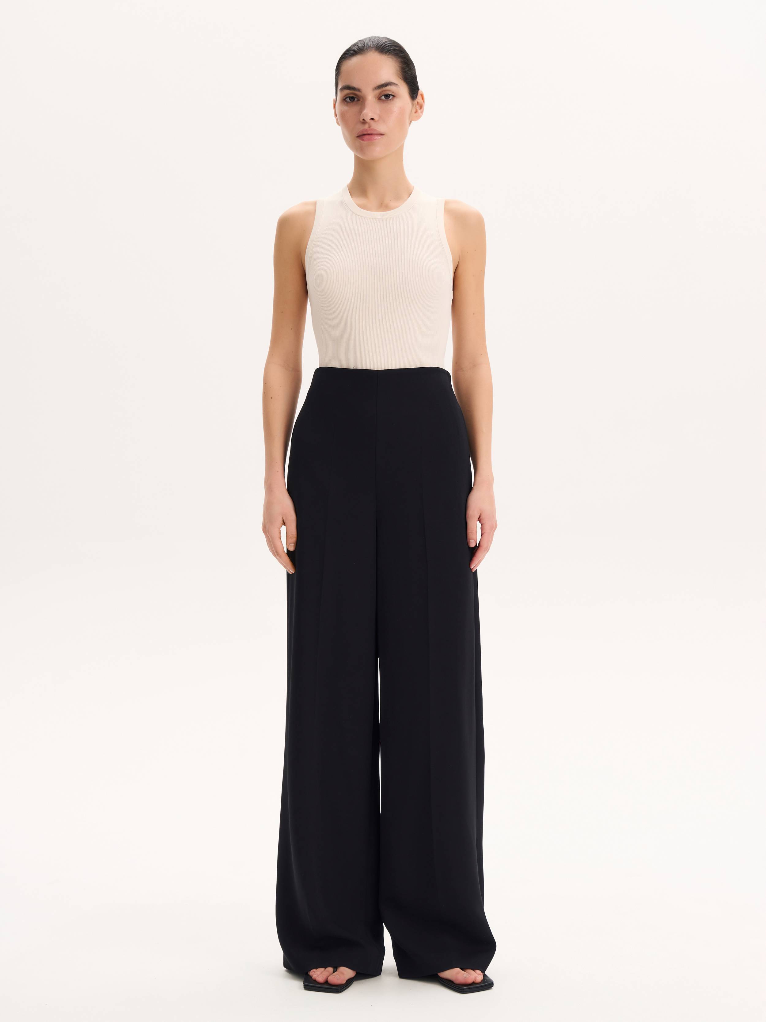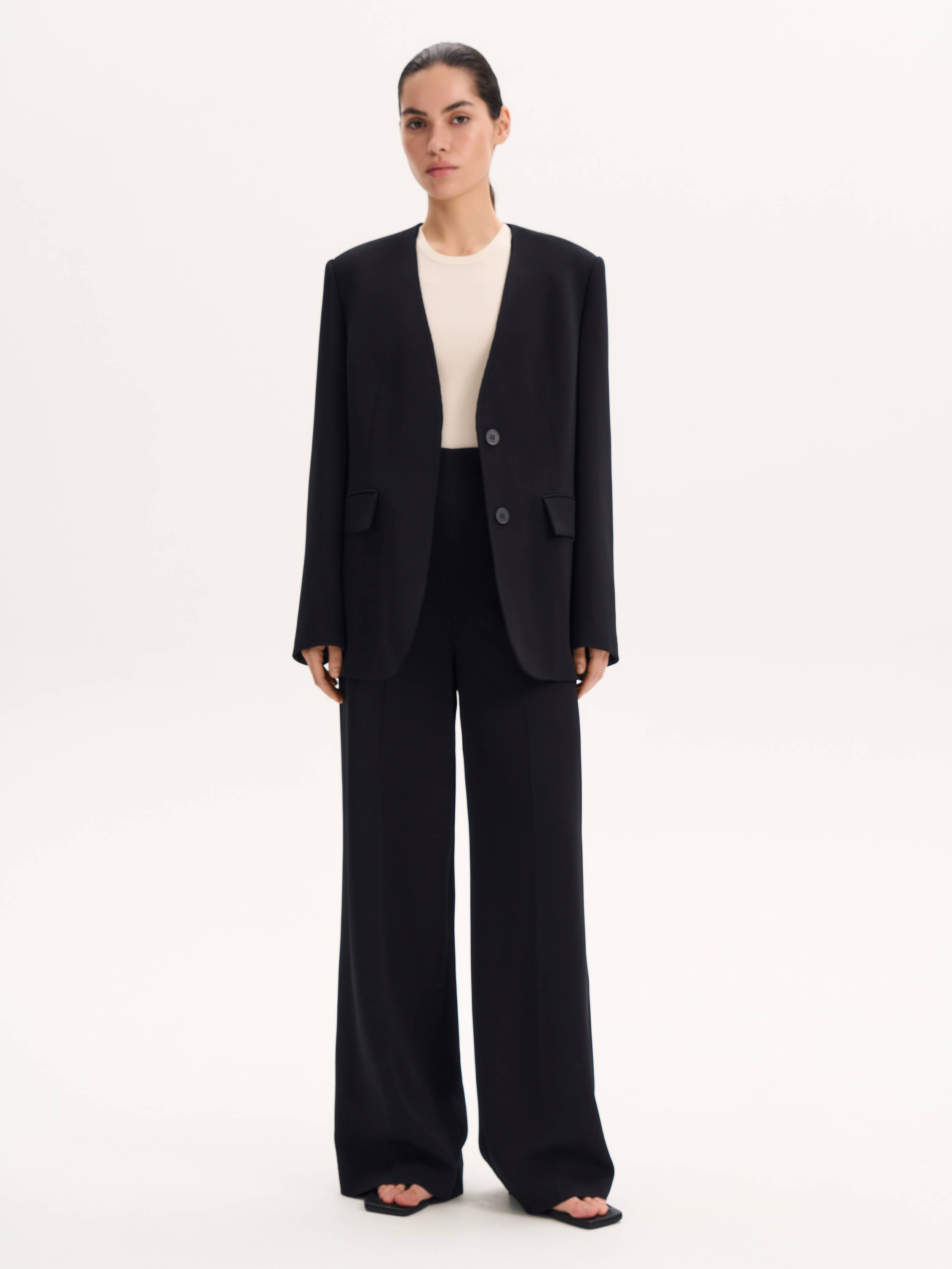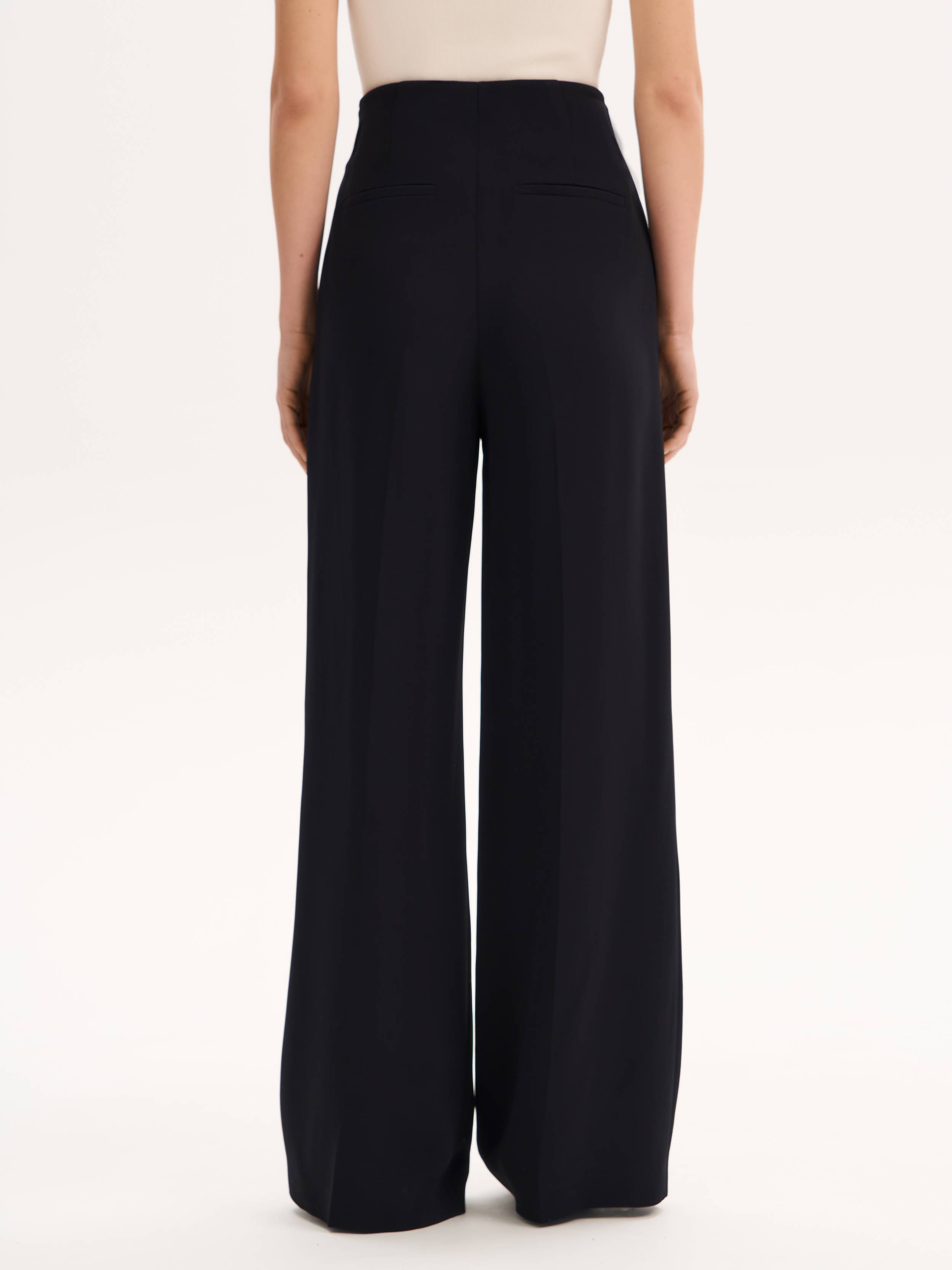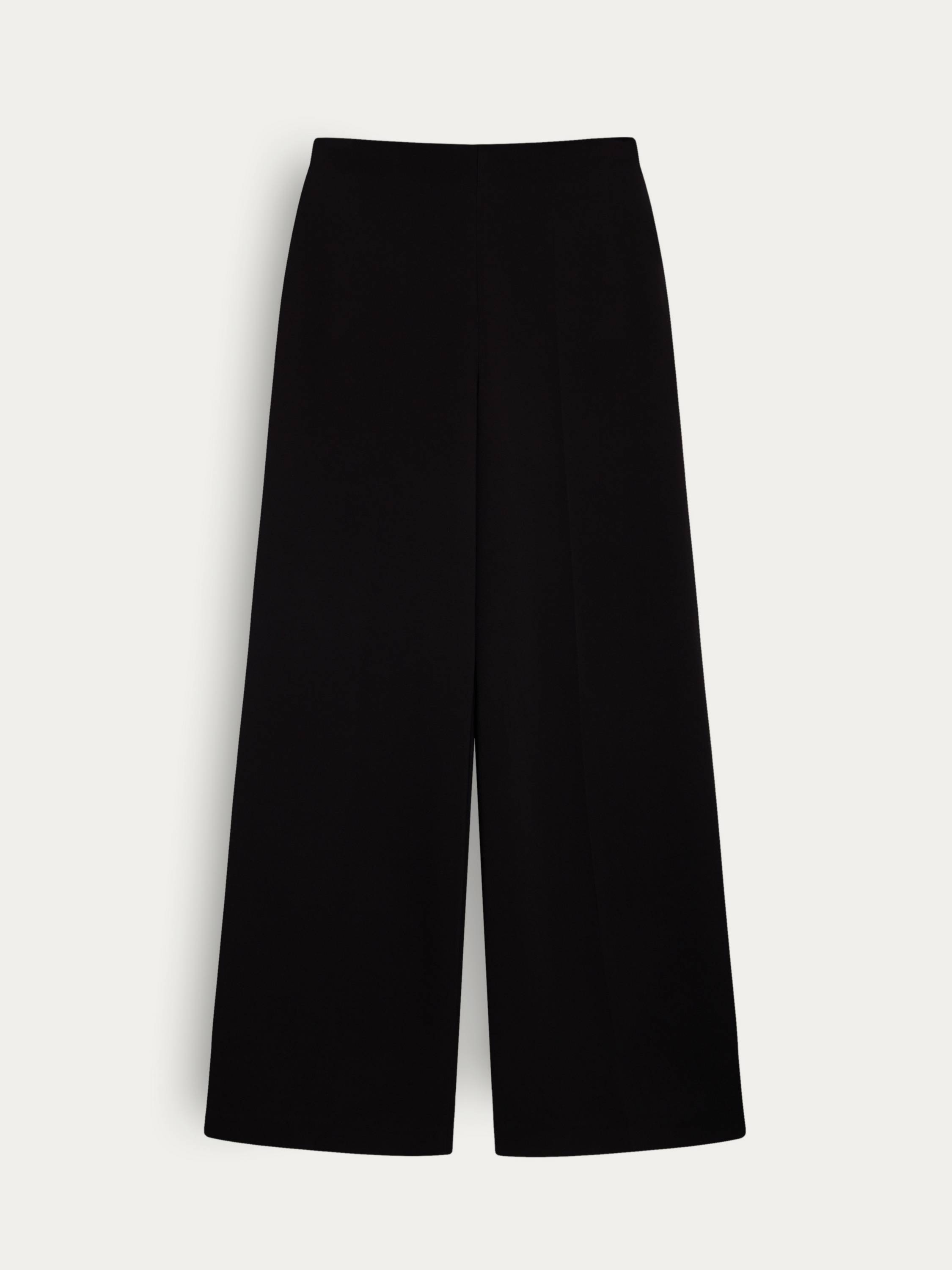 Брюки из гладкого смесового полотна на основе района с добавлением эластана — пластичные, с тонким матовым блеском и мягким скольжением ткани. Посадка высокая, линия талии чистая, без пояса. Брючины прямые, широкие, с четкой вертикалью стрелок, визуально вытягивающей фигуру. За счет плотности ткань не теряет форму и движется в ритме тела. Лаконичные карманы сзади подчеркивают геометрию модели, а длина в пол формирует актуальный вытянутый силуэт. Брюки вписываются в городскую и деловую капсулу, сочетаются с топами, рубашками, жакетами, обувью на каблуке и на плоском ходу.
