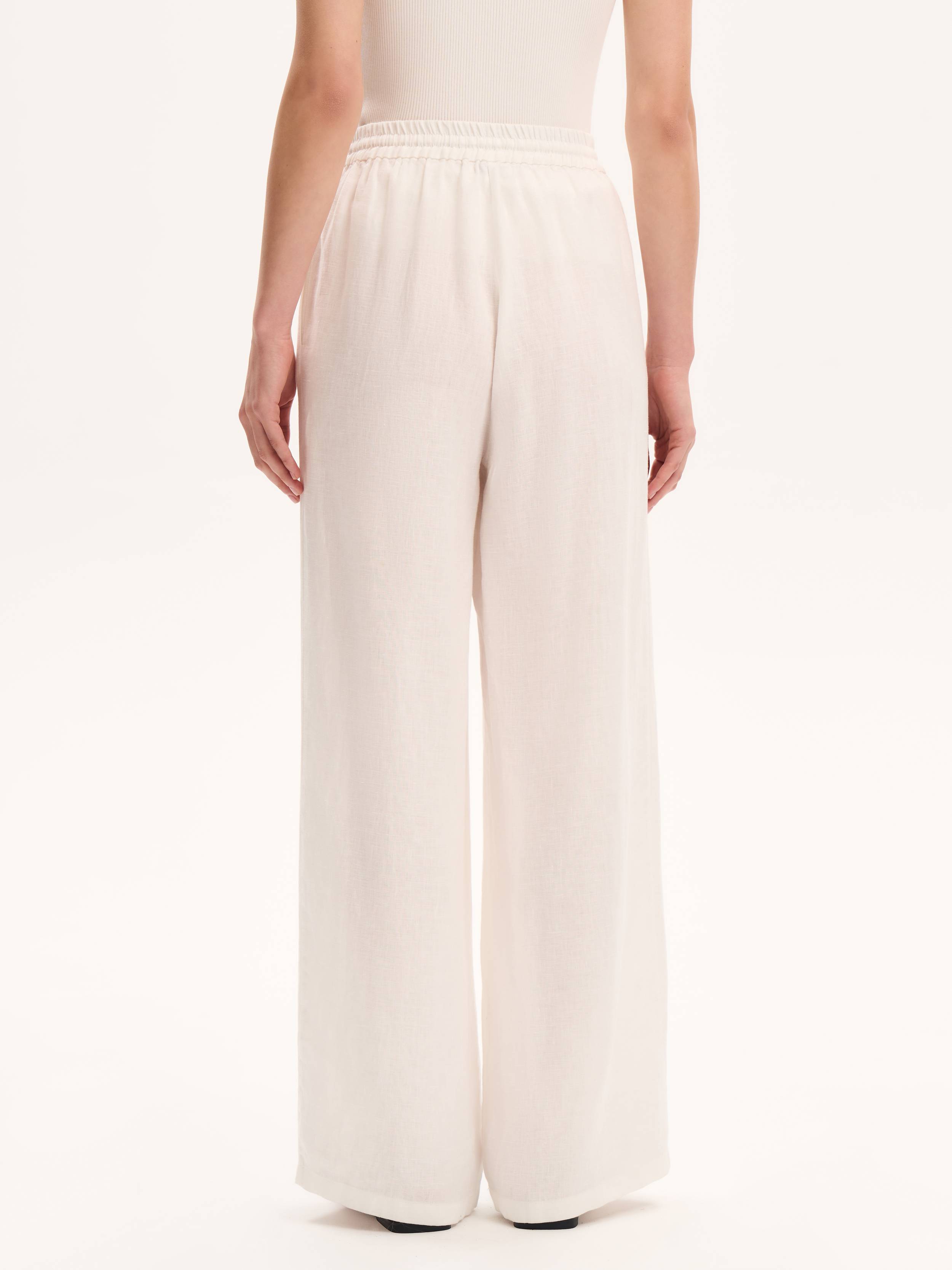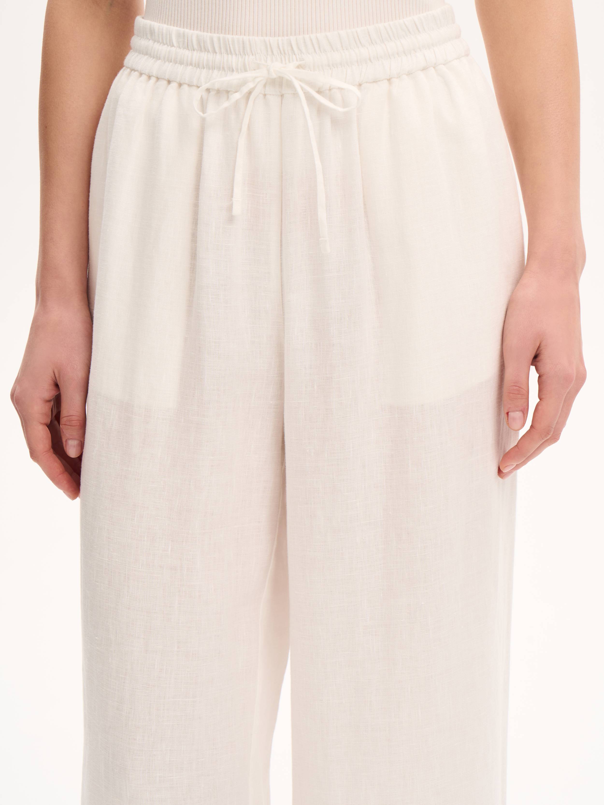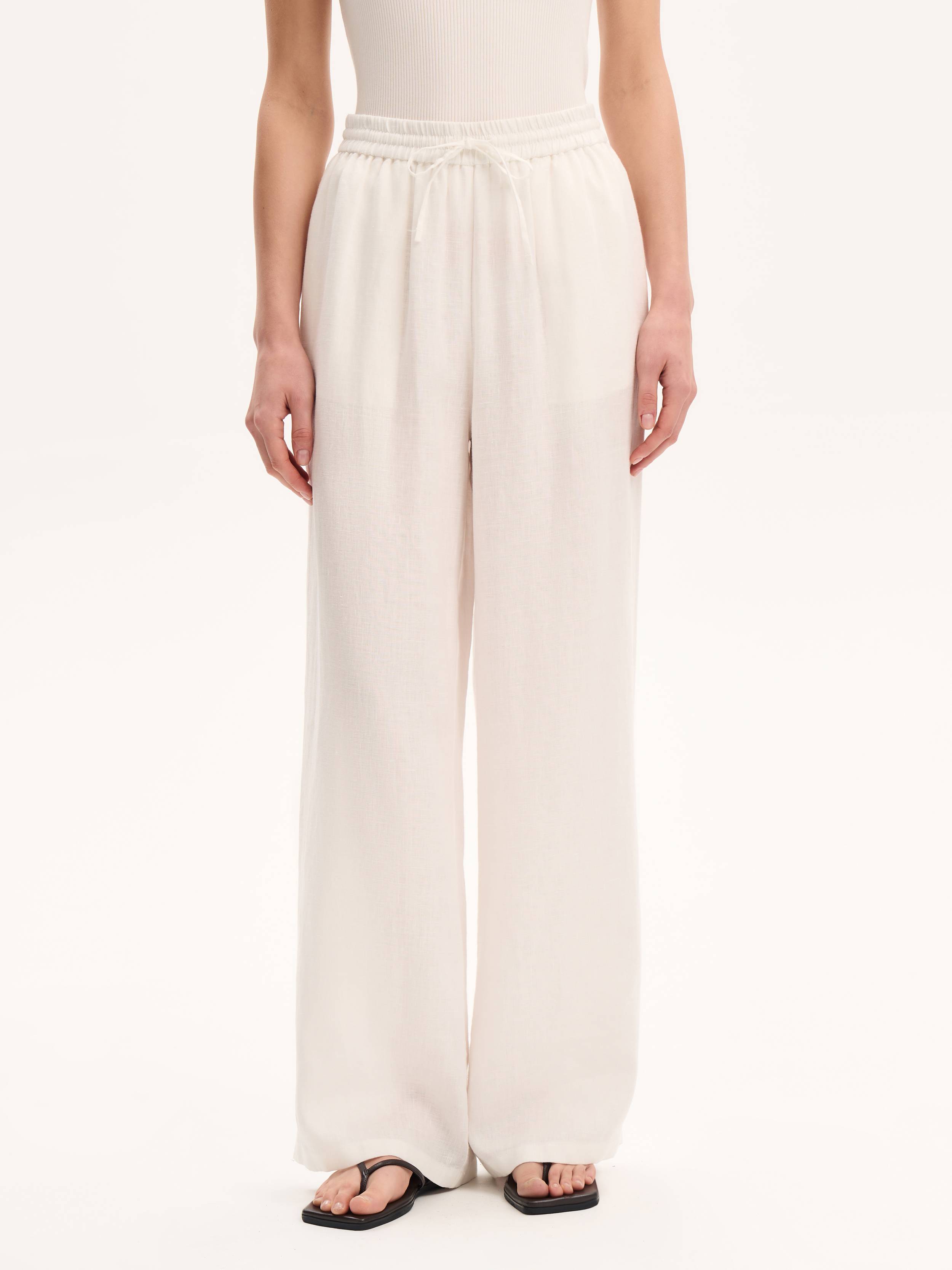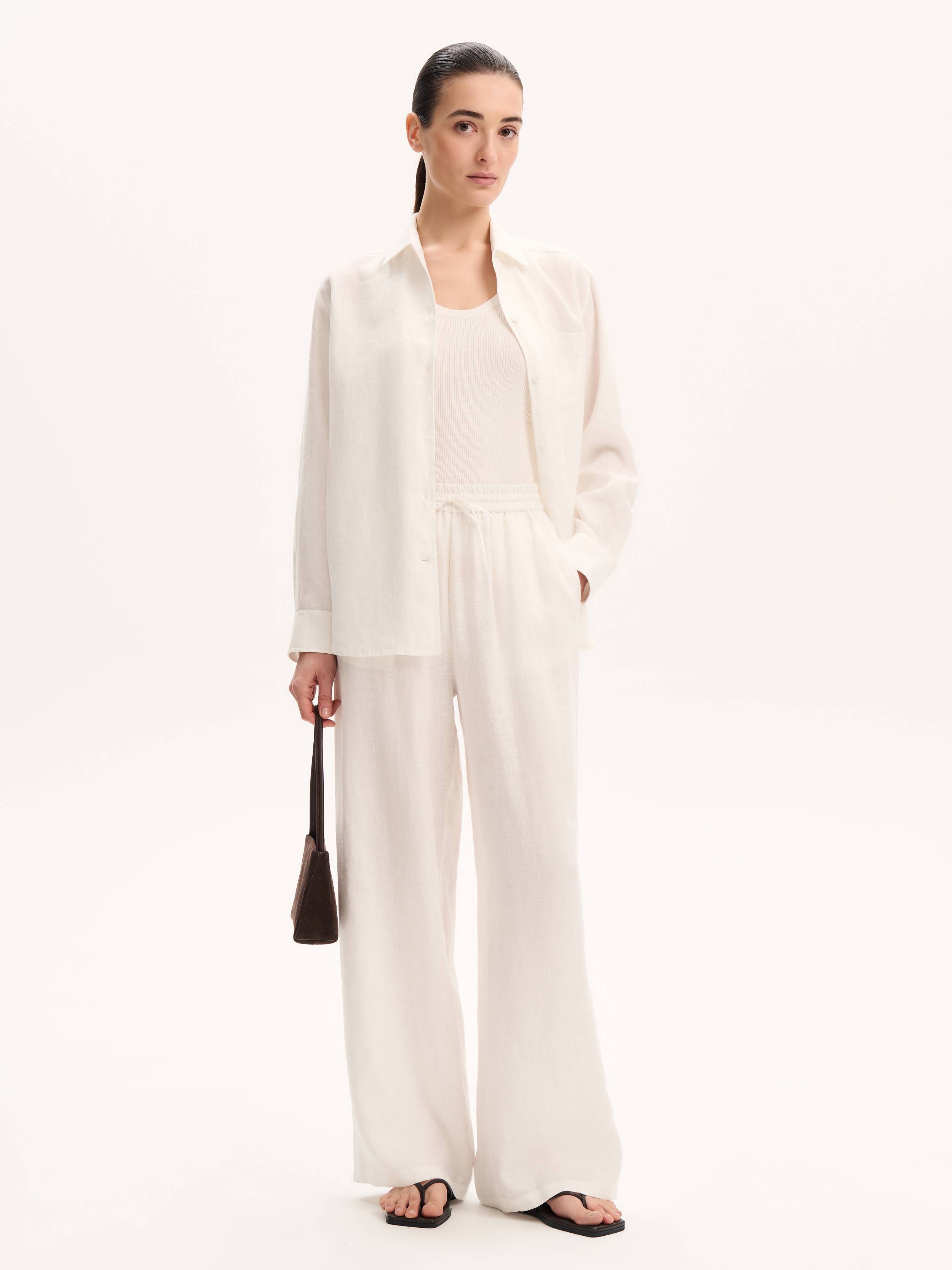 Брюки изо льна с расслабленным силуэтом — удобная и стильная база для летнего гардероба. Свободная посадка с эластичным поясом и регулируемым шнурком создает ощущение легкости и непринужденности, а широкие прямые штанины визуально вытягивают силуэт. Натуральный лен дарит ткани плотность и воздух одновременно: она не просвечивает, позволяет коже дышать и остается комфортной даже в жаркую погоду. Прорезные карманы делают модель функциональной, а лаконичный дизайн сохраняет чистоту линий. Эти брюки легко адаптируются под разное настроение — от расслабленного выходного образа с майкой и сандалиями до более собранного с рубашкой или жакетом.