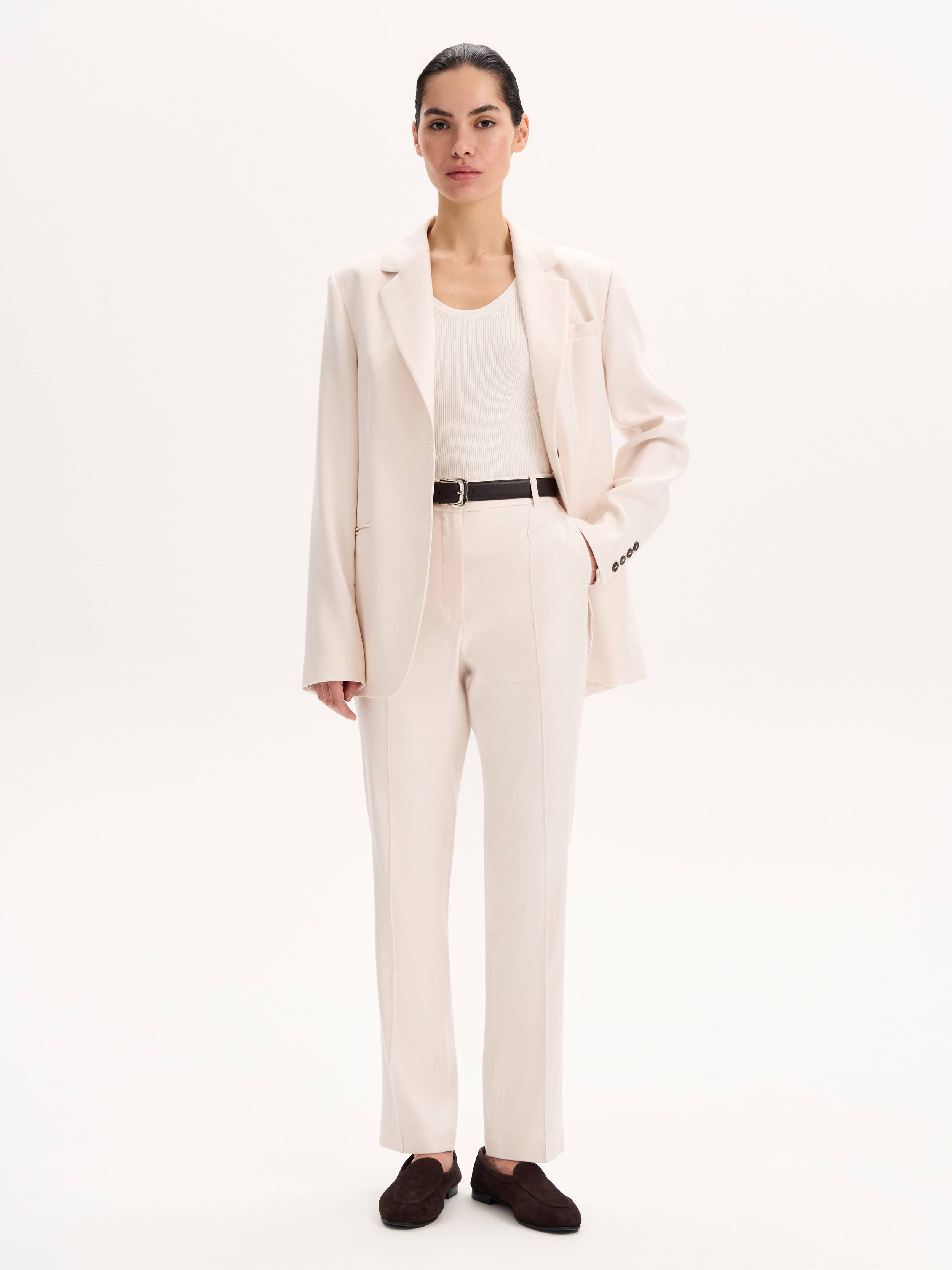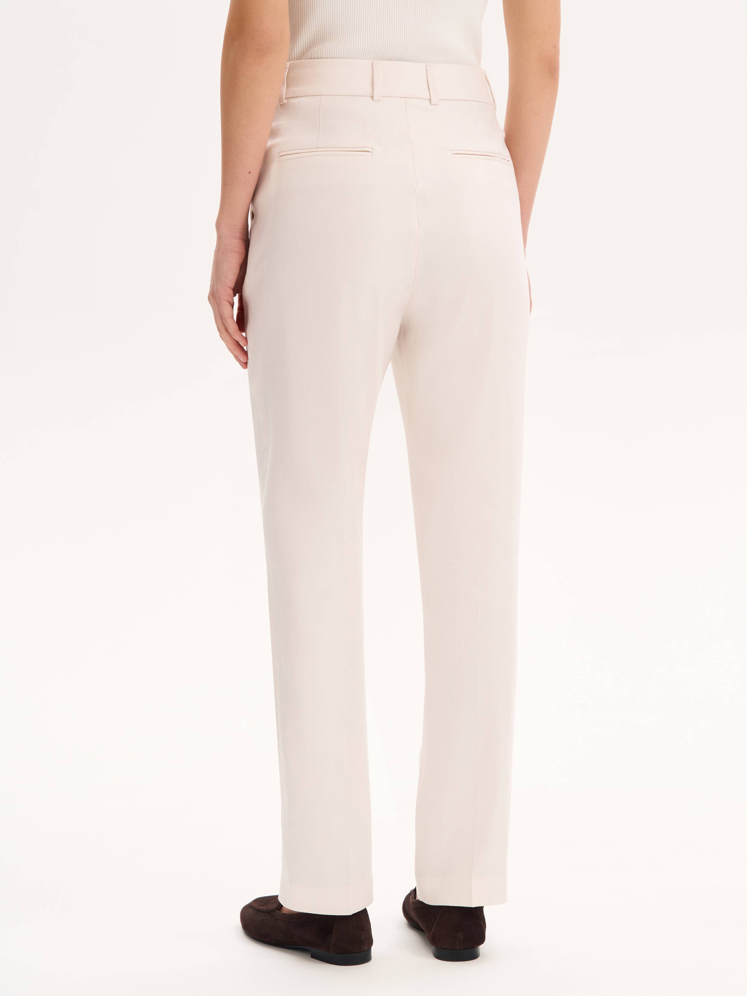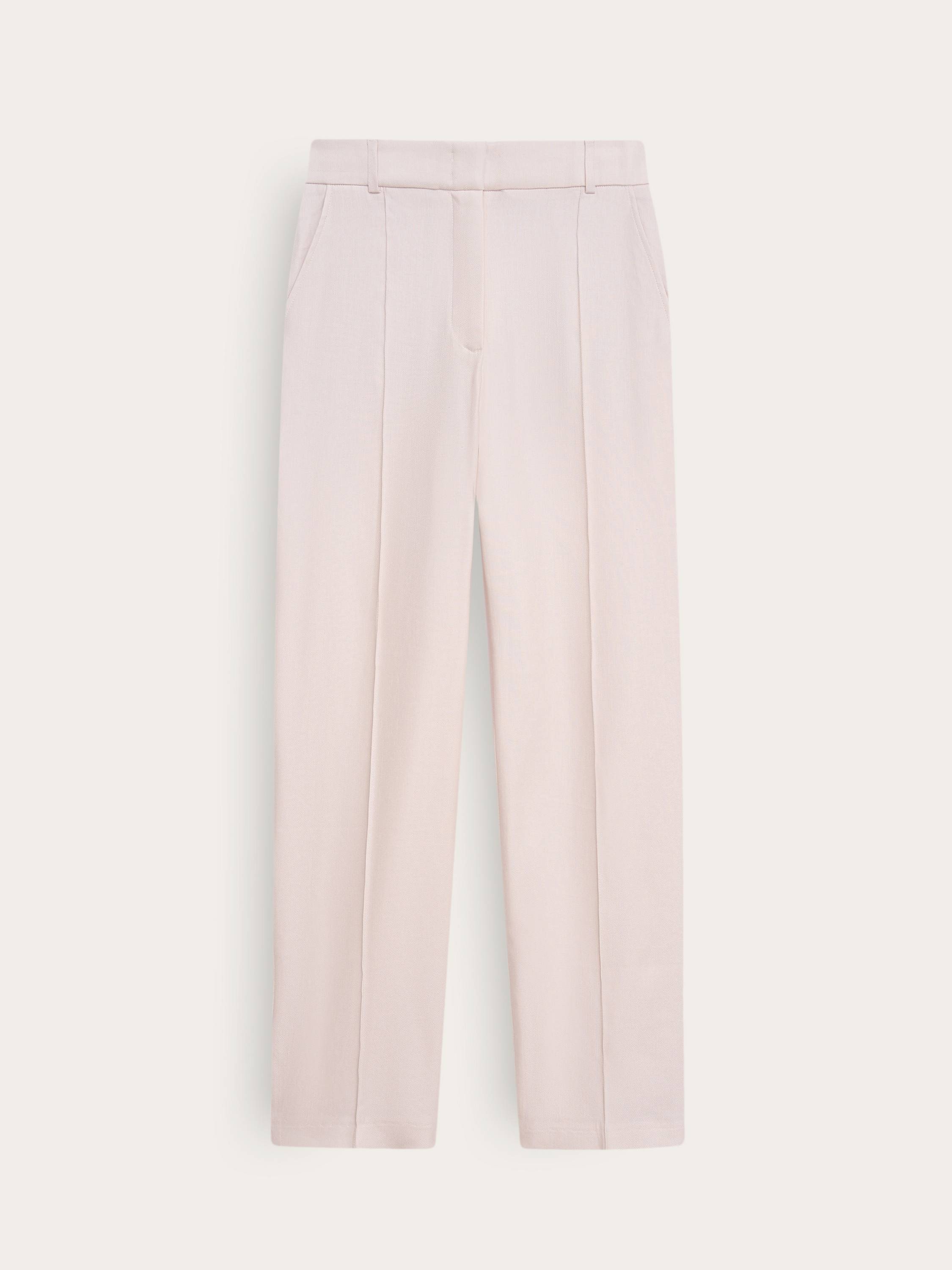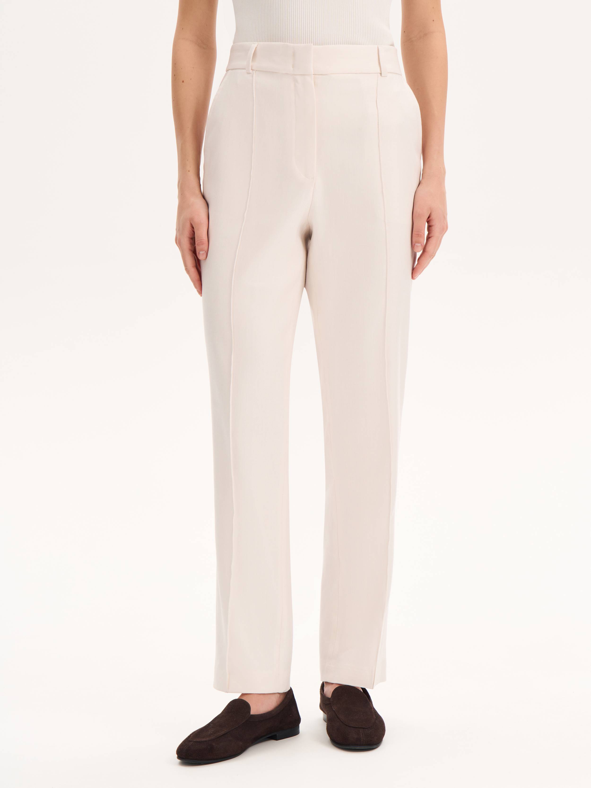 Брюки прямого кроя выполнены из плотного смесового полотна с высоким содержанием льна. Натуральное волокно обеспечивает комфорт и воздухопроницаемость, а вискоза и эластан добавляют мягкость, эластичность и устойчивость к заломам. Благодаря продуманной конструкции — высокой посадке, стрелкам и поясу с вытачками — модель формирует аккуратный силуэт и визуально вытягивает линию ног. Классический крой делает брюки универсальной базой: они легко сочетаются как с рубашками и жакетами, так и с расслабленными топами в духе slow tailoring.