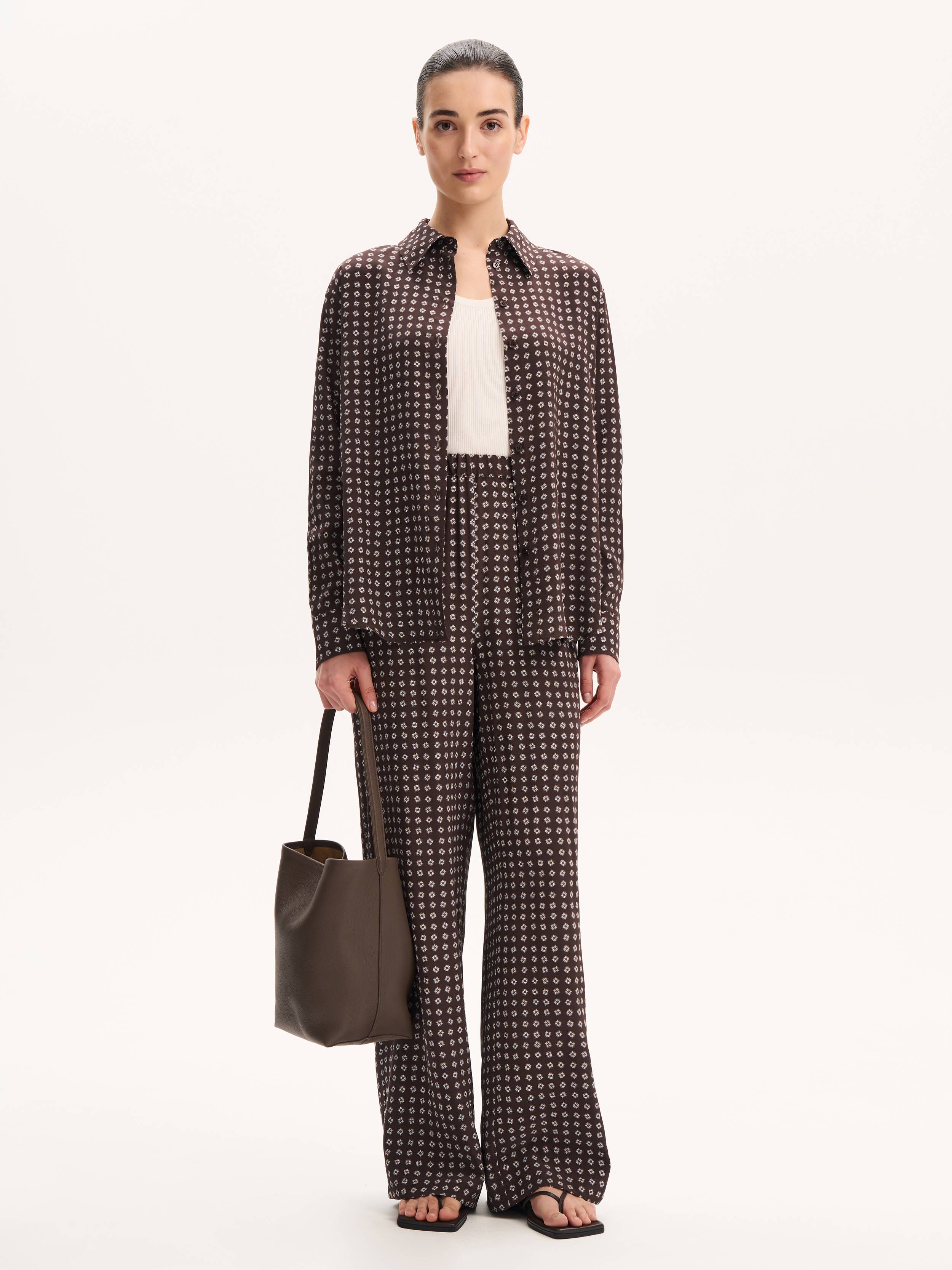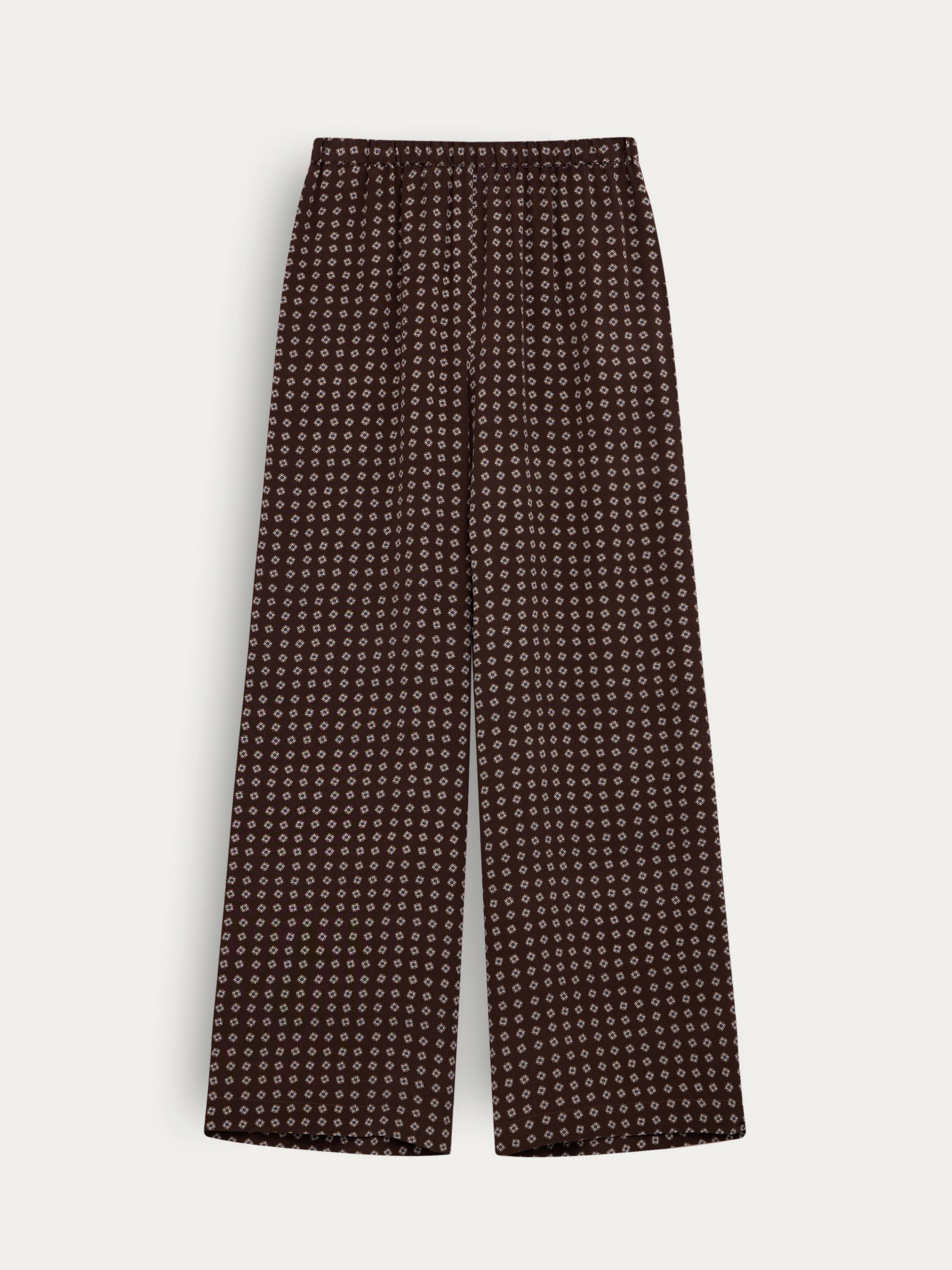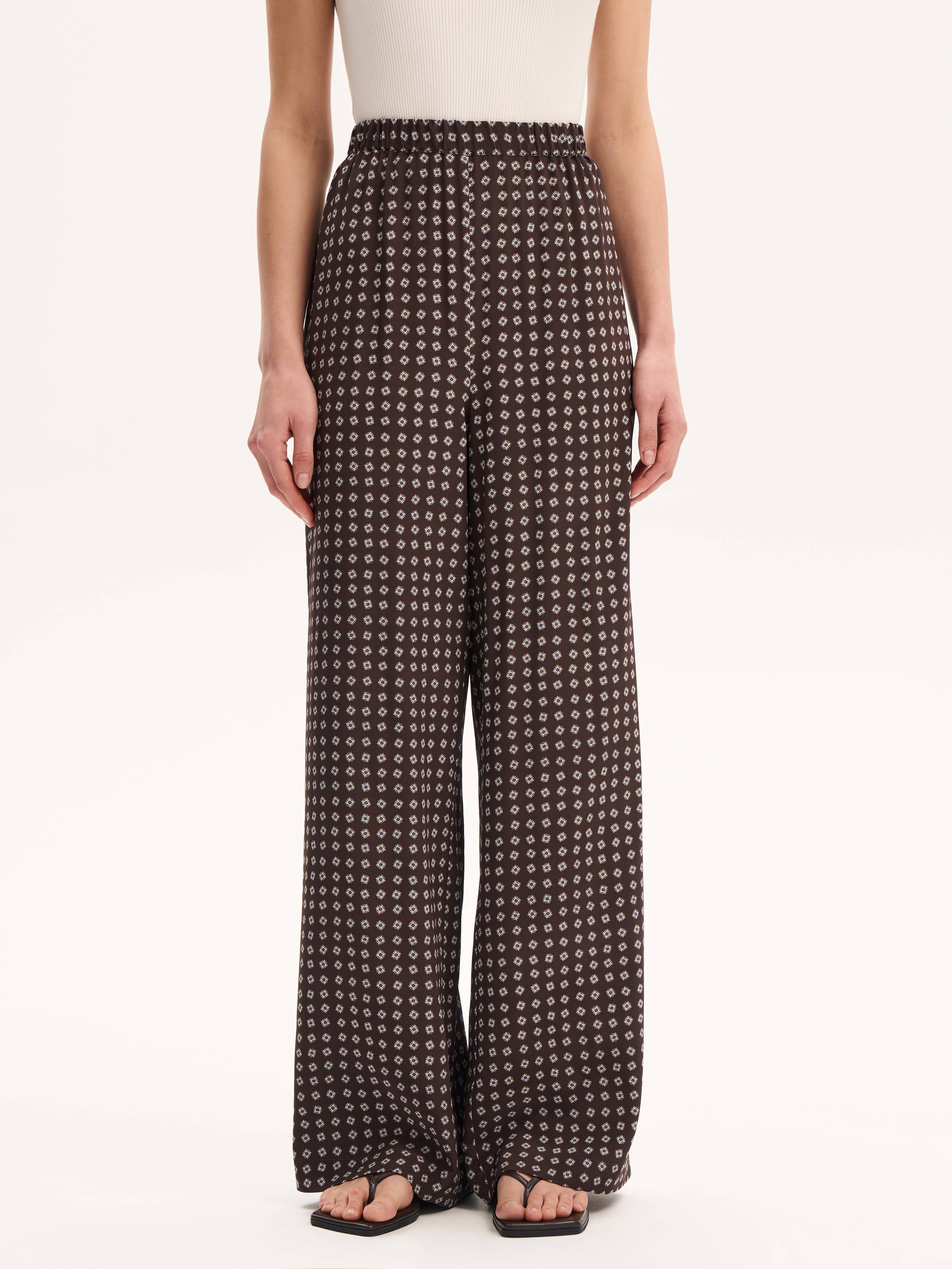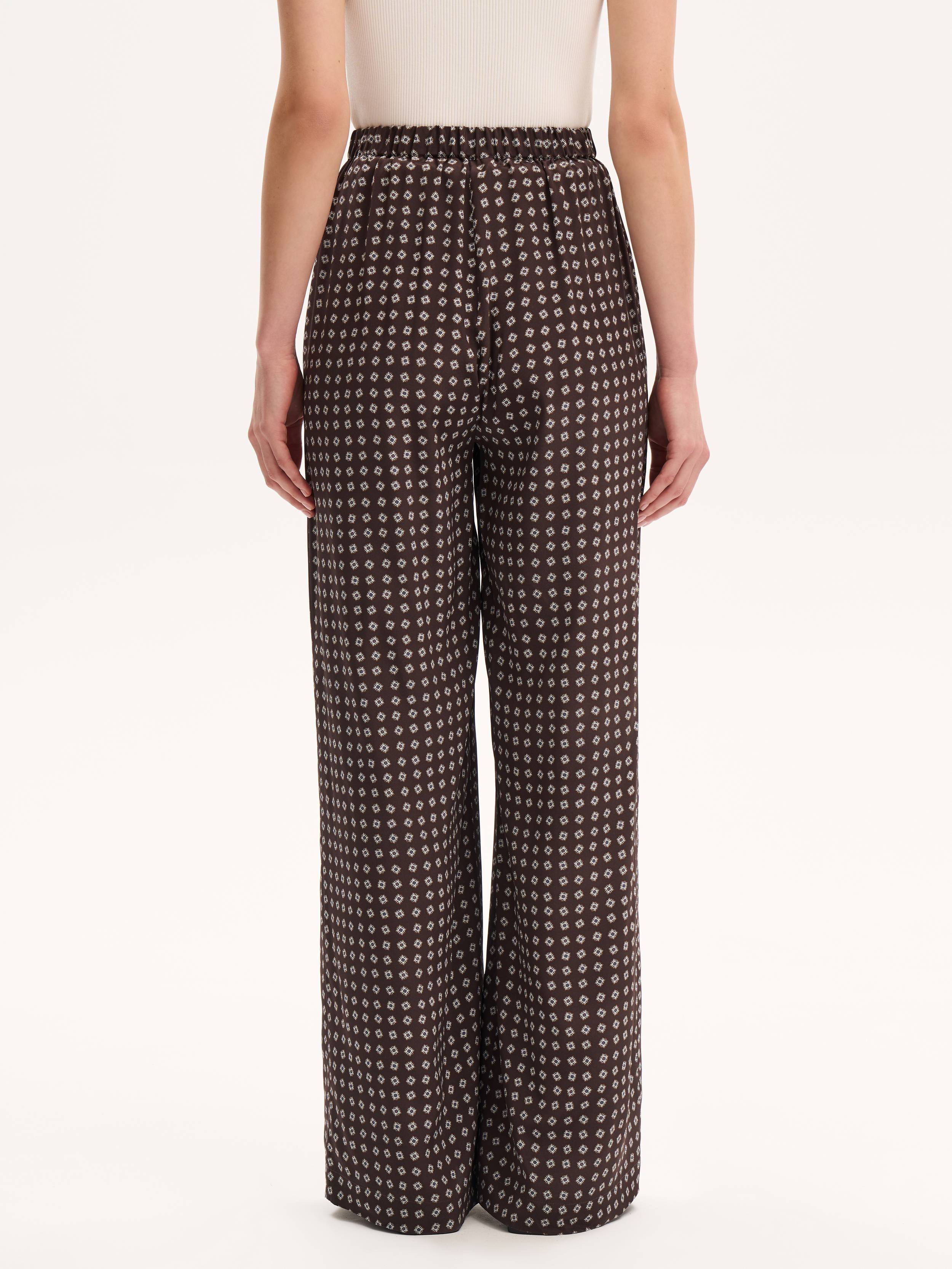 Брюки, которые сочетают в себе комфорт, выразительность и тонкую эстетику повседневности. Лаконичный силуэт с широкой прямой штаниной дополнен мягким поясом на резинке — такая конструкция обеспечивает легкую посадку и свободу движения. Натуральный шелк с деликатным дизайнерским принтом придает модели визуальную ритмику и текстурную глубину. Материал дышит, струится при ходьбе и приятно ощущается на коже. Носите эти брюки с топом-компаньоном, рубашкой оверсайз или тонким джемпером — в каждом варианте они будут звучать по-разному, сохраняя образ цельным и собранным.