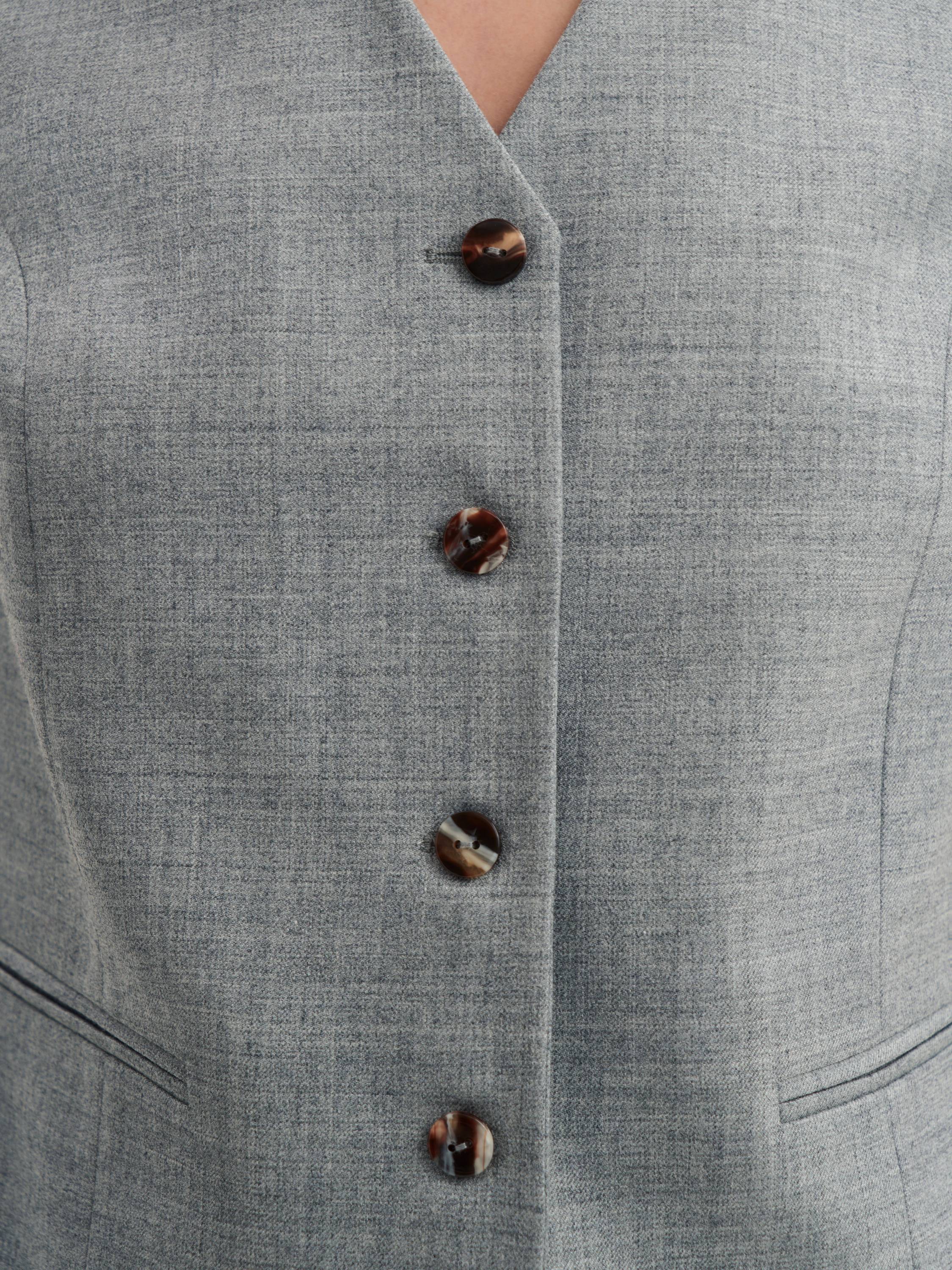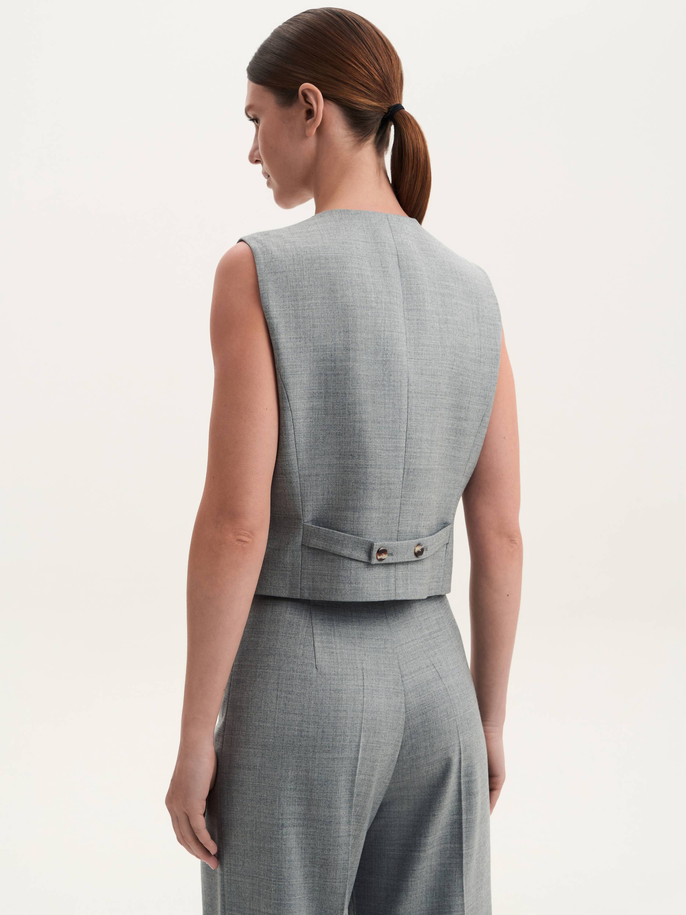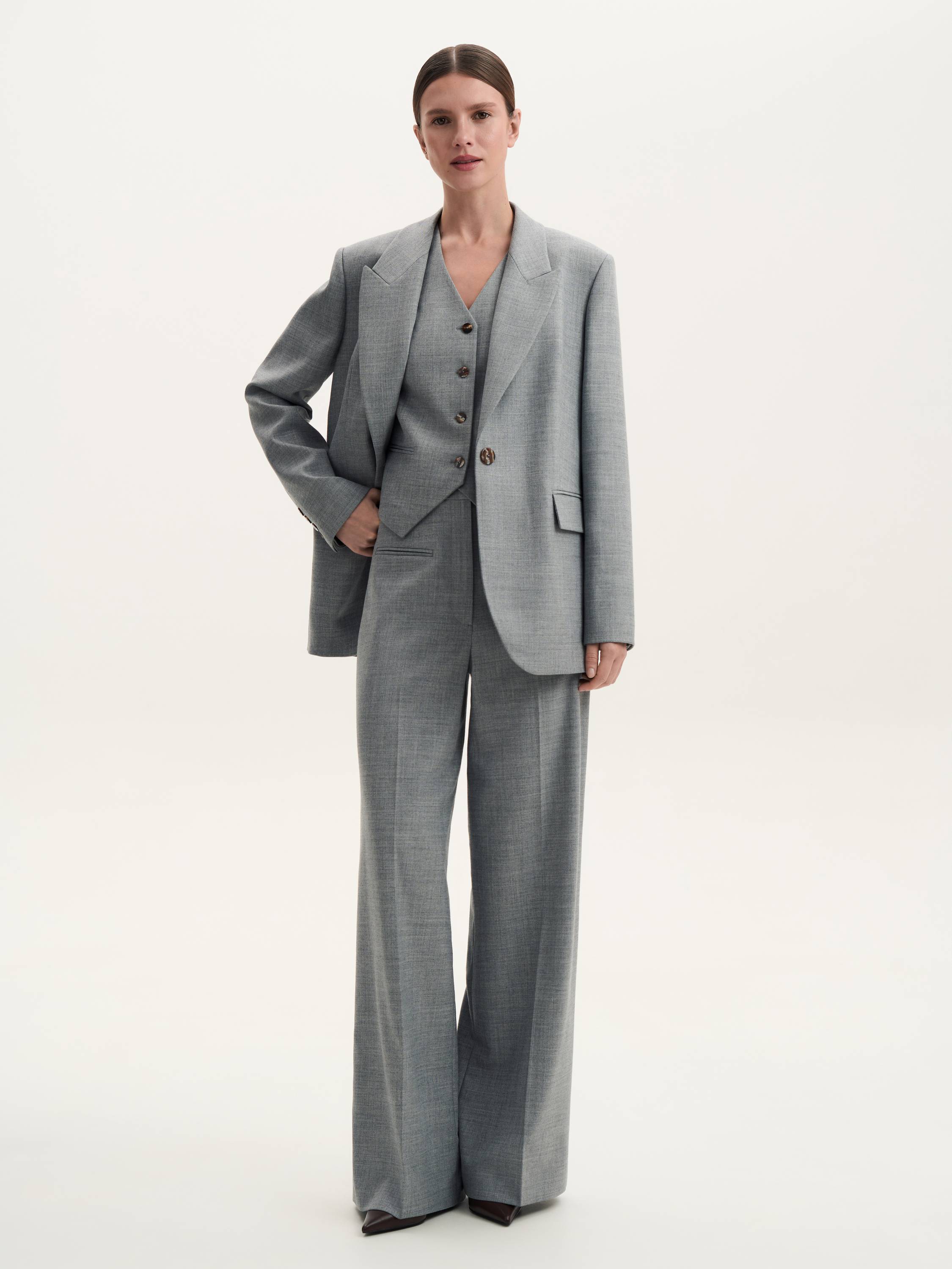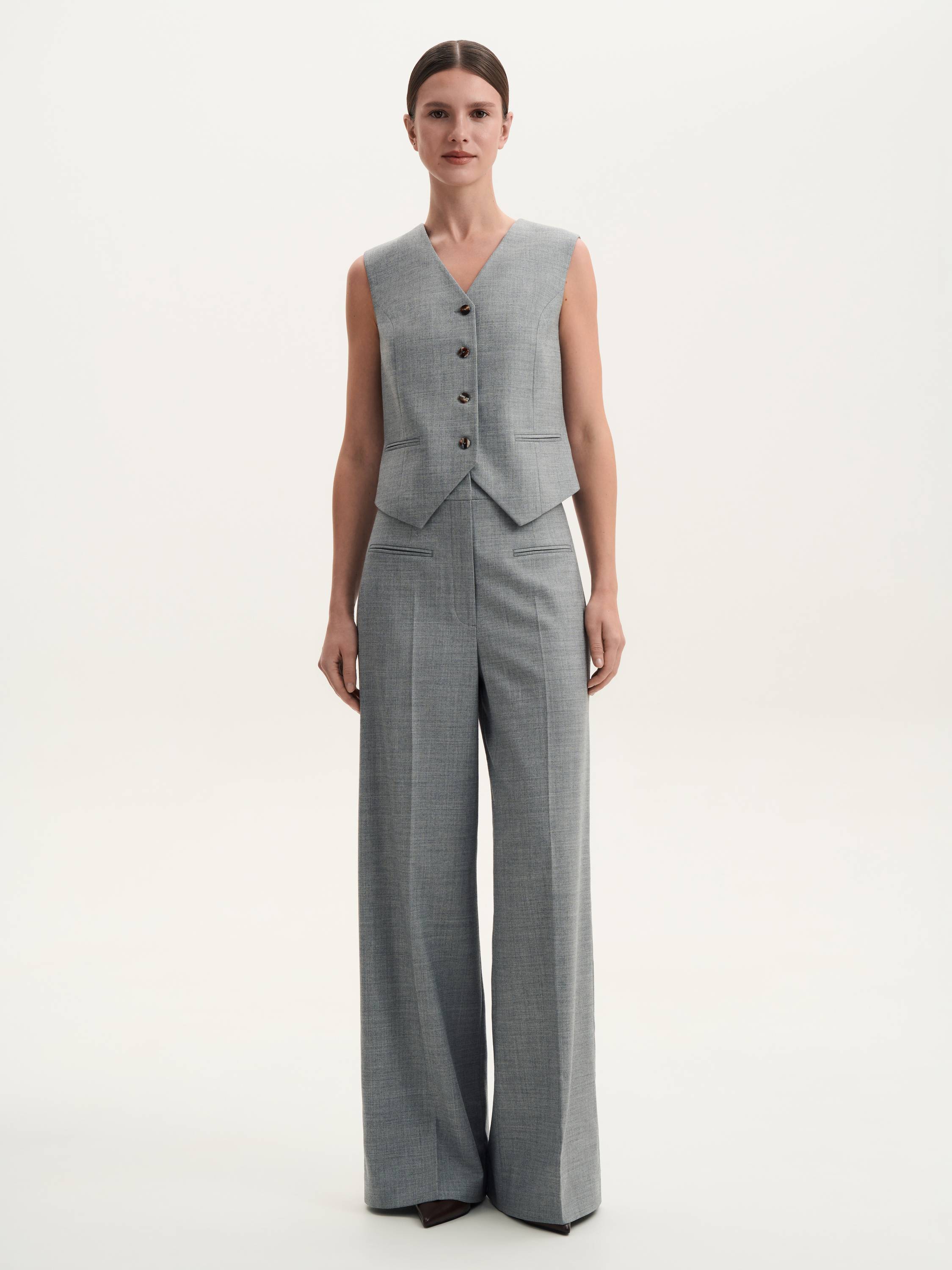Костюмная жилетка с шерстью — сдержанная элегантность с намеком на классику. Приталенный силуэт подчеркивает линии фигуры, а натуральная шерсть в составе делает ткань мягкой, комфортной и приятной к телу. Лаконичные пуговицы и строгий V-образный вырез придают образу завершенность, позволяя легко сочетать жилетку с рубашками, водолазками или носить на голое тело для создания актуального современного образа. Структурированная посадка делает модель универсальным элементом гардероба, который гармонично дополнит костюм или станет самостоятельным акцентом в образе.