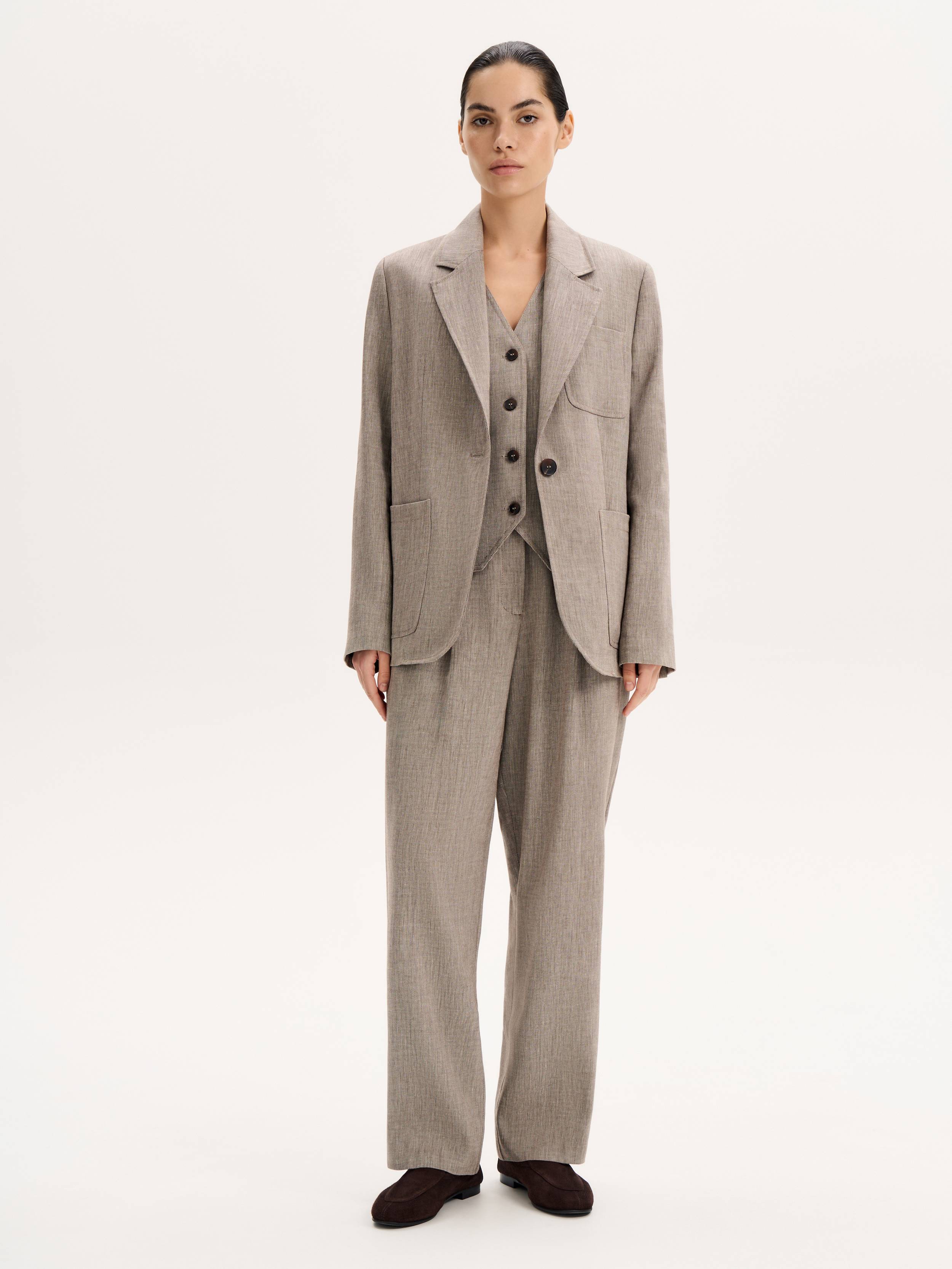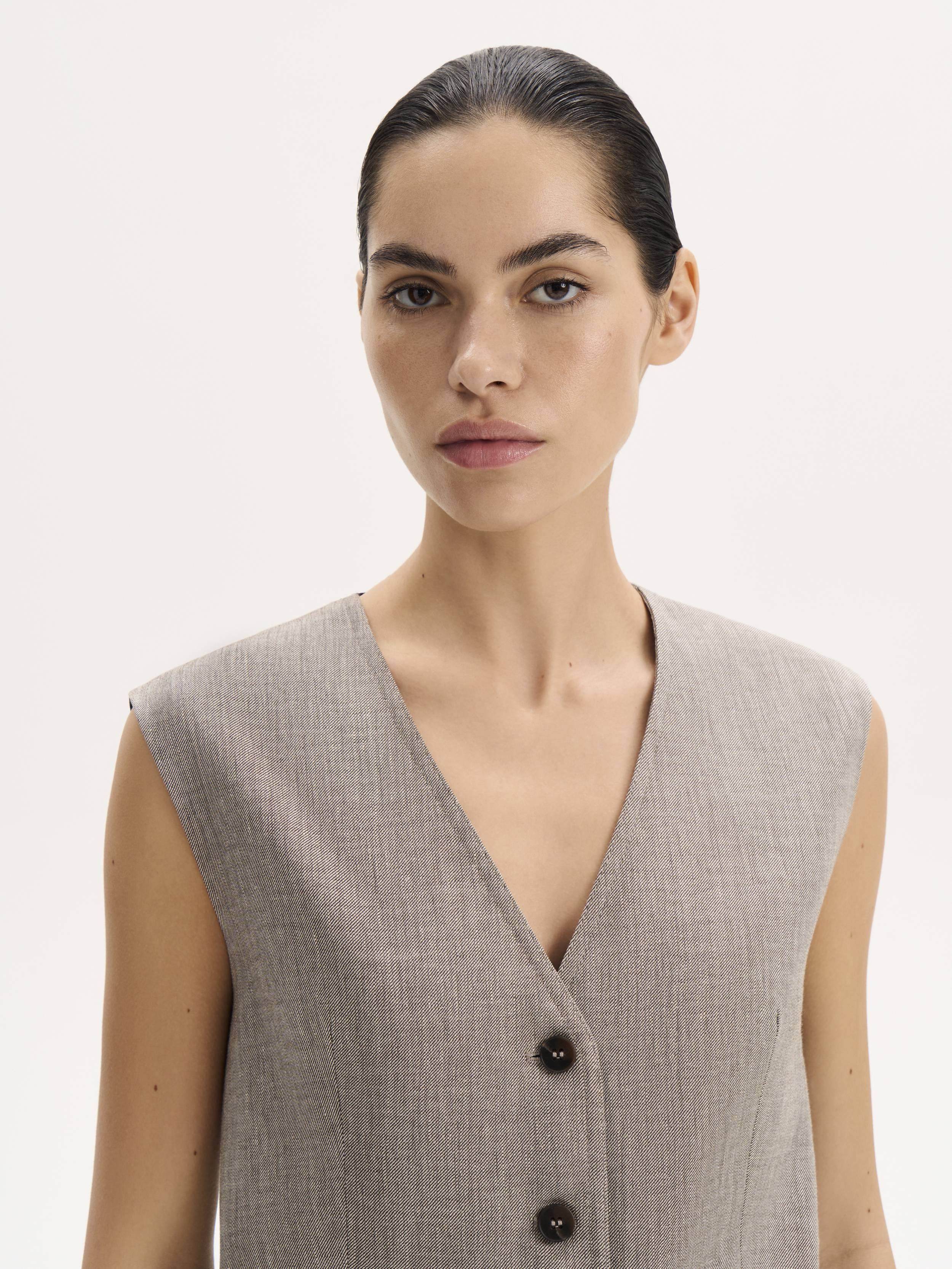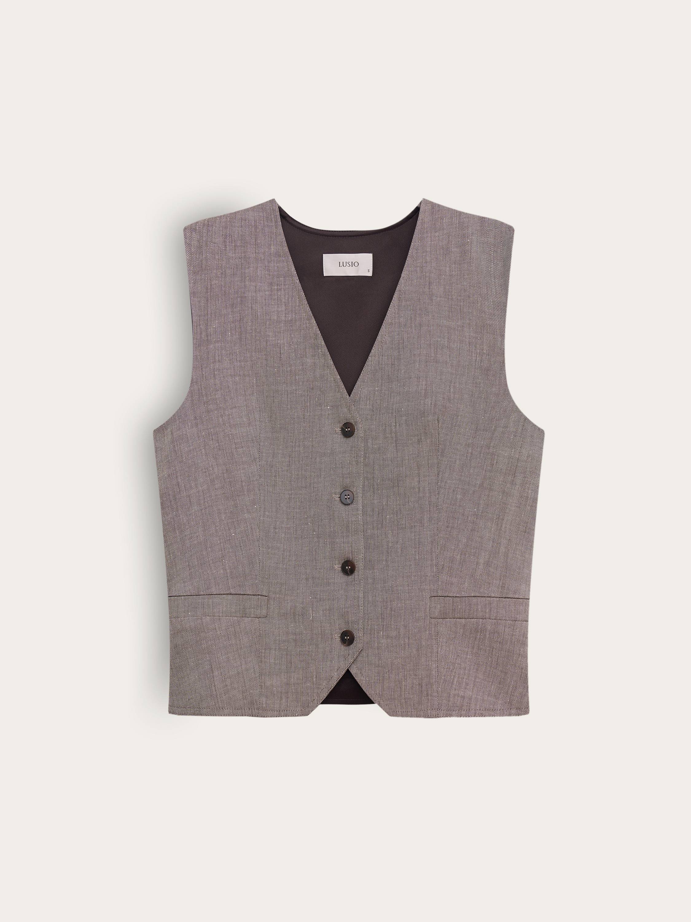 Современная альтернатива классическому пиджаку — жилетка из льна и шерсти с приталенным силуэтом. V-образный вырез, фигурный низ и застежка на пуговицы придают модели архитектурность и точность линий. Ткань с добавлением льна дышит и сохраняет свежесть даже в теплую погоду, а шерсть в составе отвечает за мягкость и аккуратную посадку. Носите жилет соло или в комплекте с жакетом — он легко адаптируется к деловому и повседневному стилю, добавляя образу структуру и утонченность.
