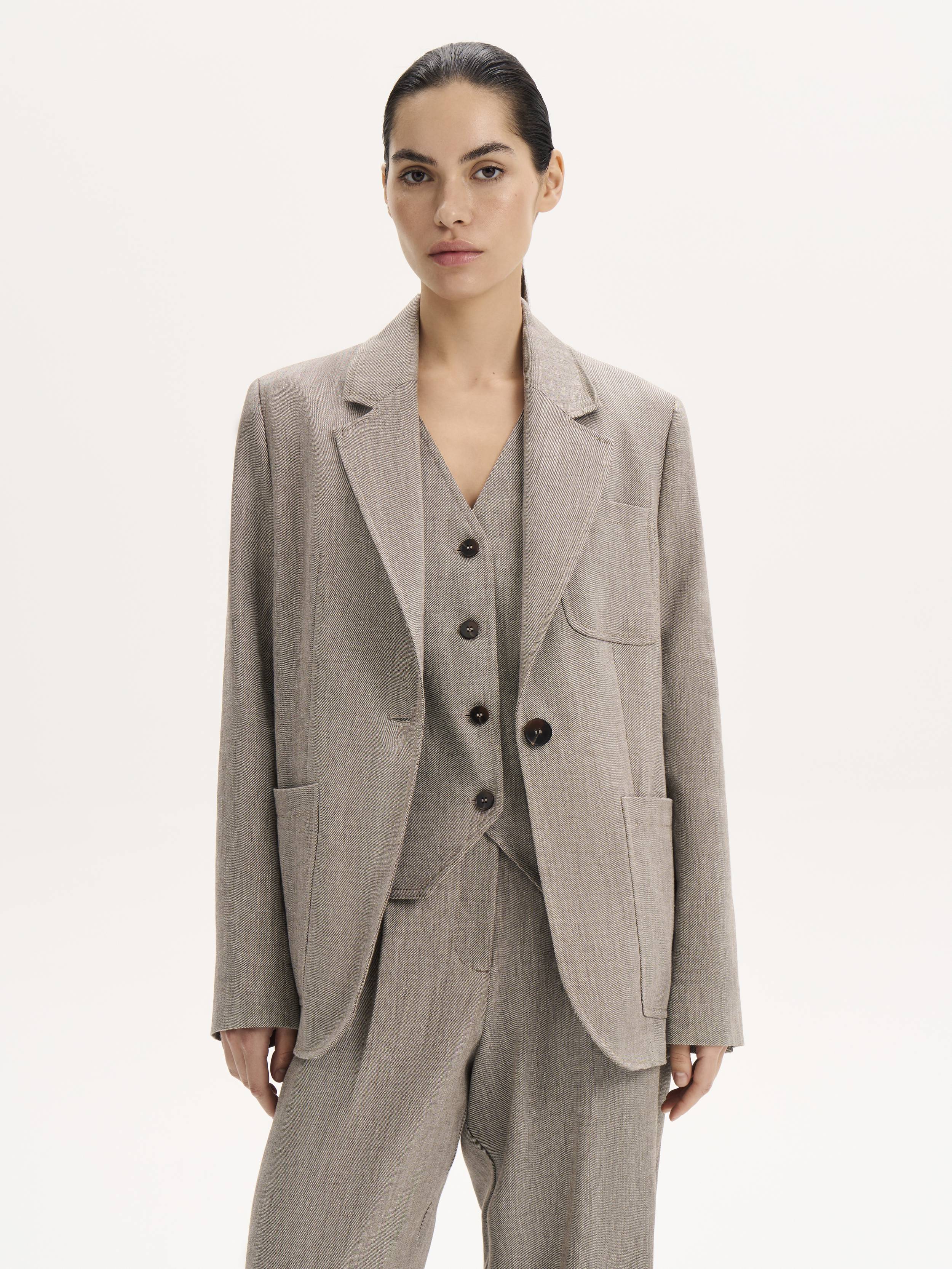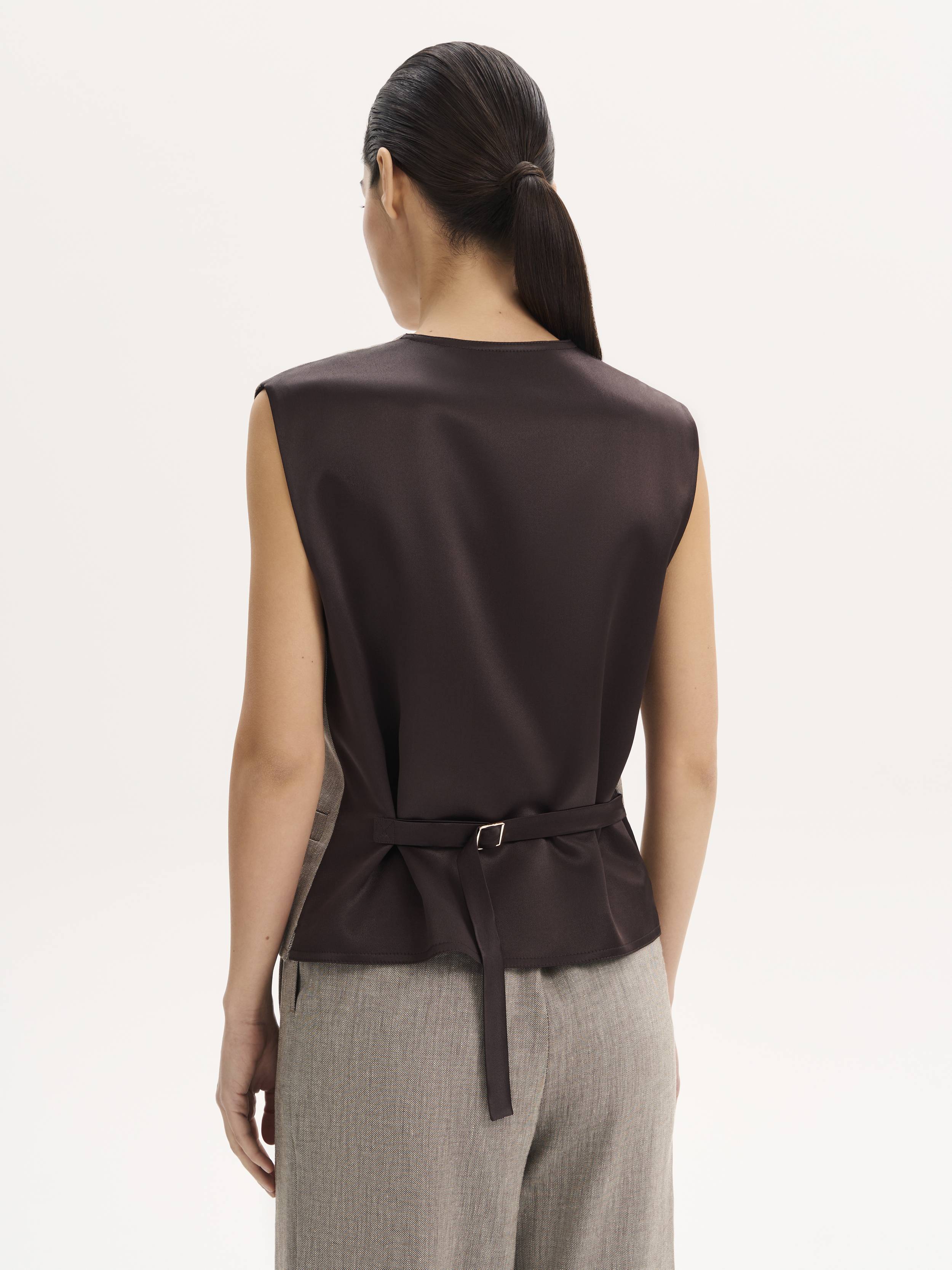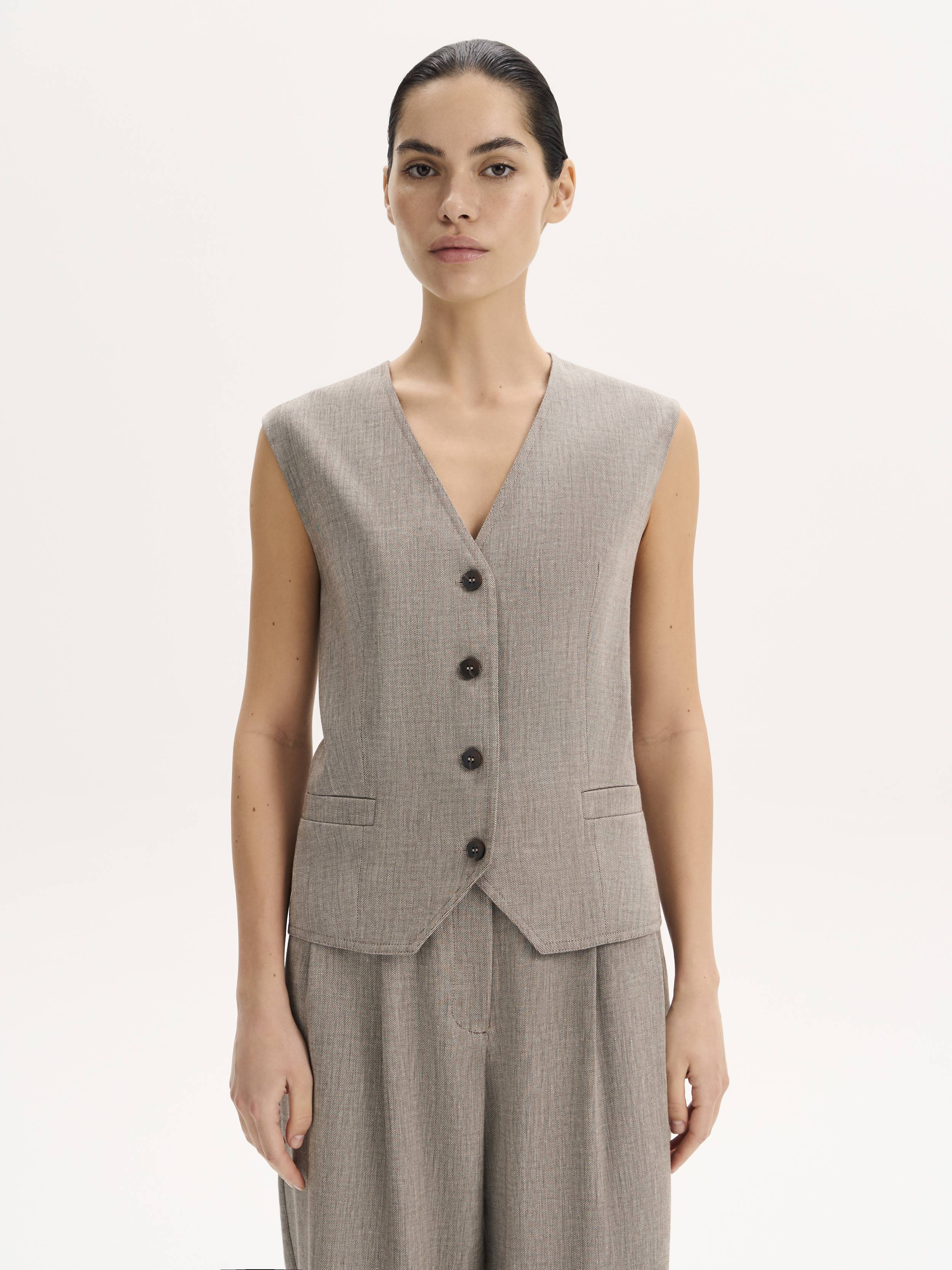 Современная альтернатива классическому пиджаку — жилетка из льна и шерсти с приталенным силуэтом. V-образный вырез, фигурный низ и застежка на пуговицы придают модели архитектурность и точность линий. Ткань с добавлением льна дышит и сохраняет свежесть даже в теплую погоду, а шерсть в составе отвечает за мягкость и аккуратную посадку. Носите жилет соло или в комплекте с жакетом — он легко адаптируется к деловому и повседневному стилю, добавляя образу структуру и утонченность.